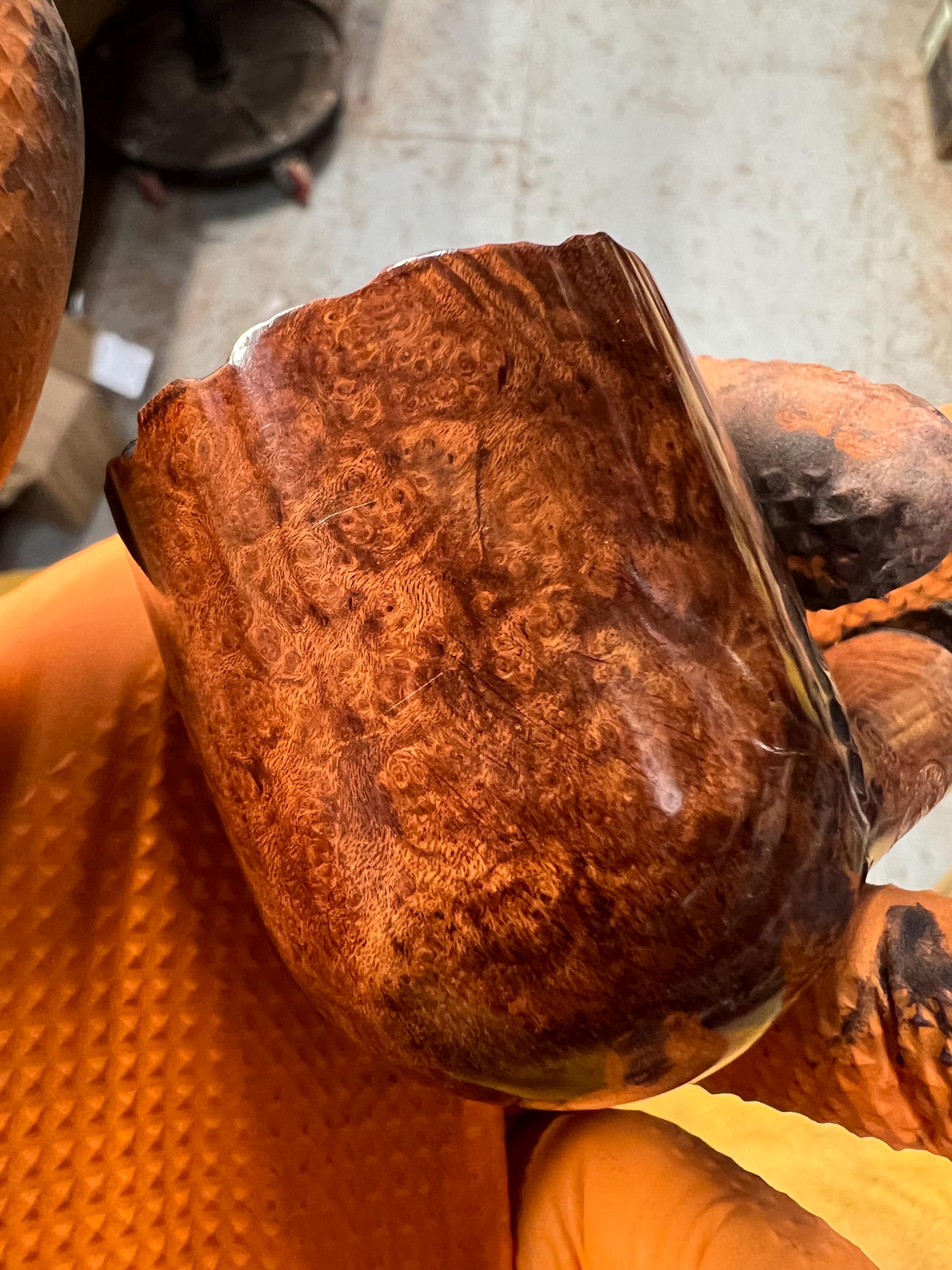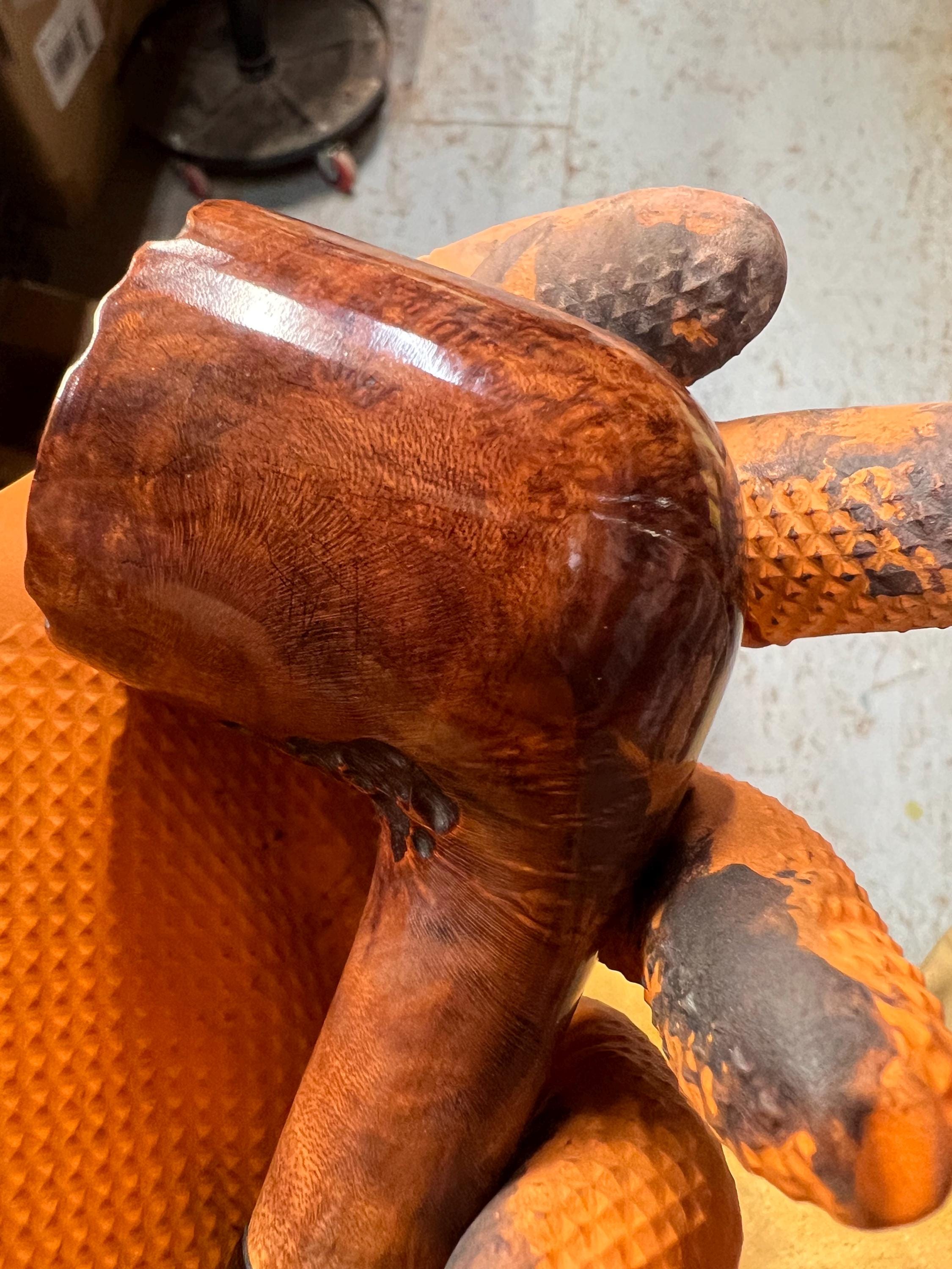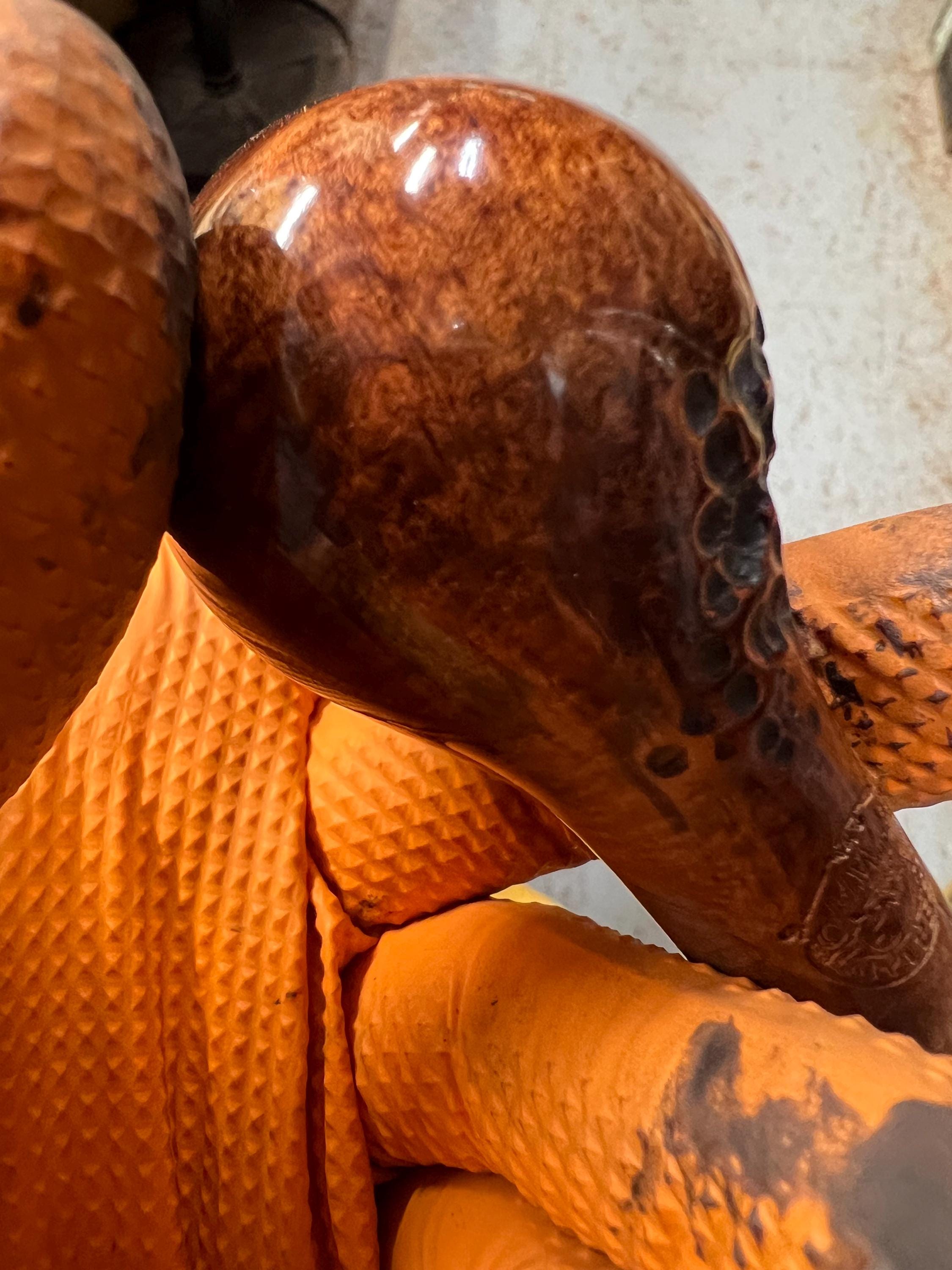 This is a handmade briar pipe that has been meticulously carved and polished. Vulcanite custom made stem. This one is non filtered. A very nice daily smoker.
