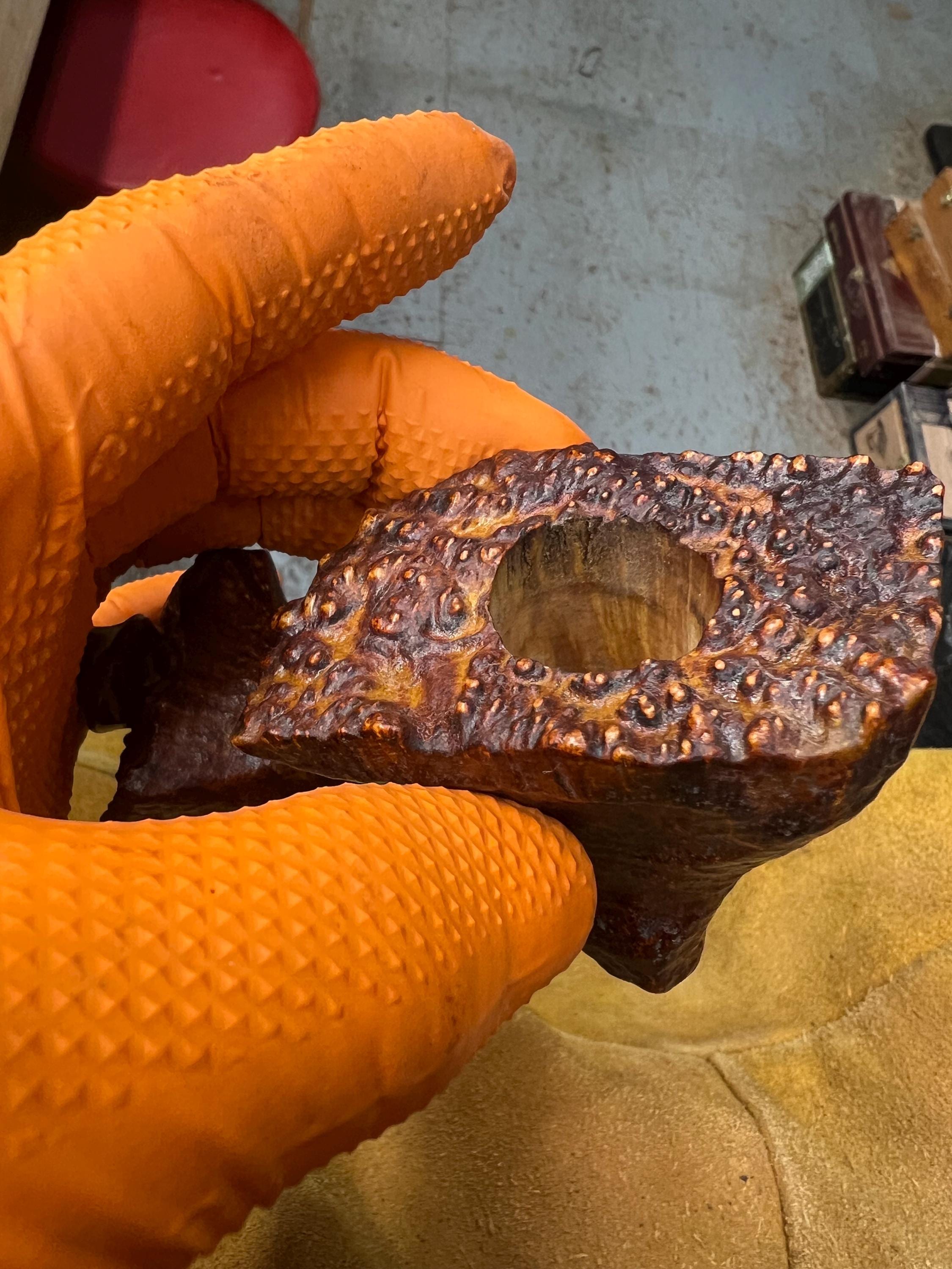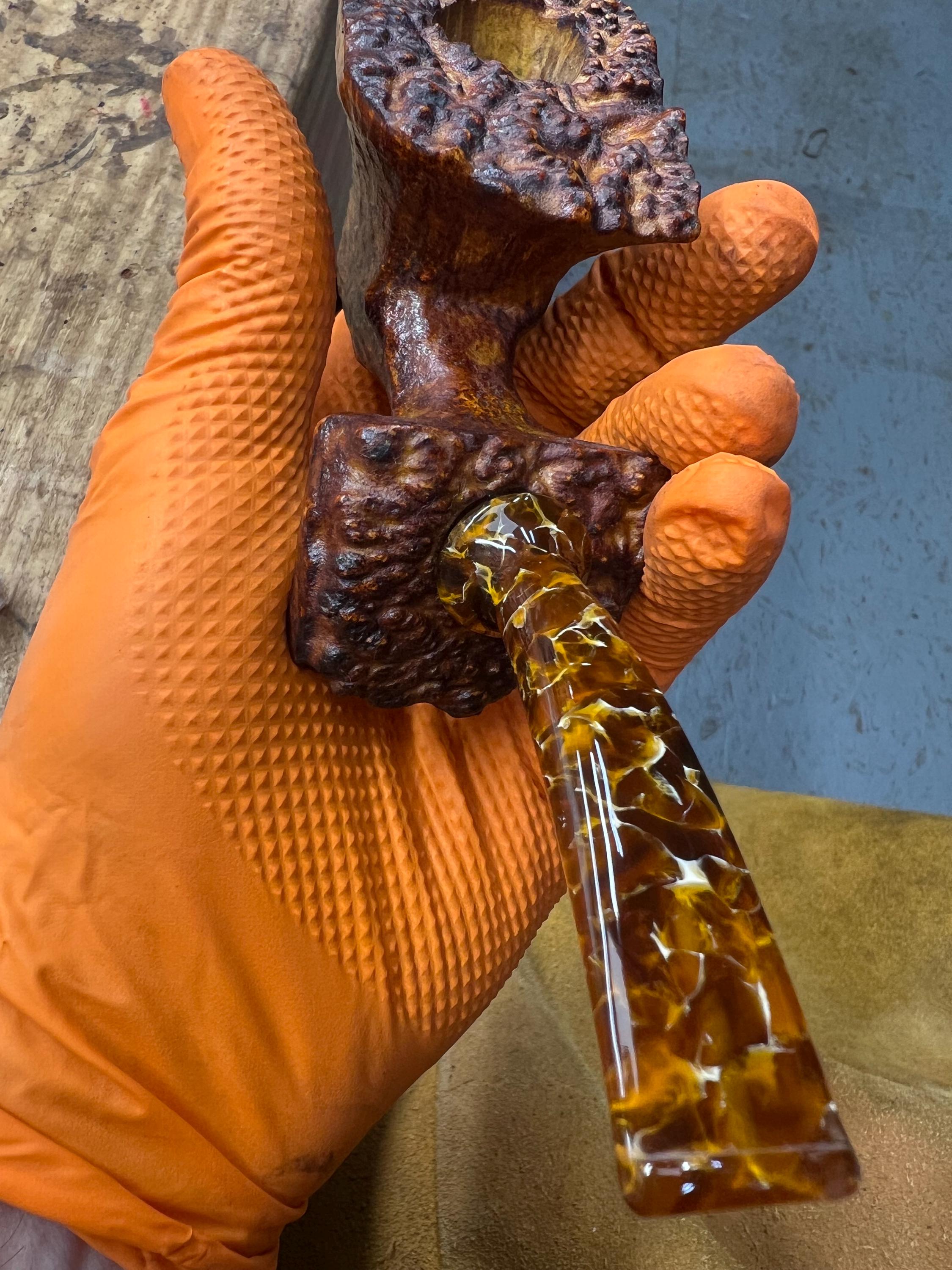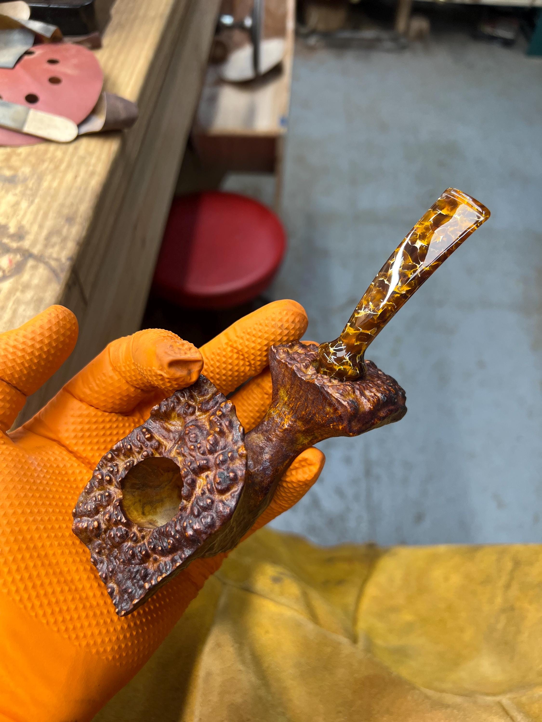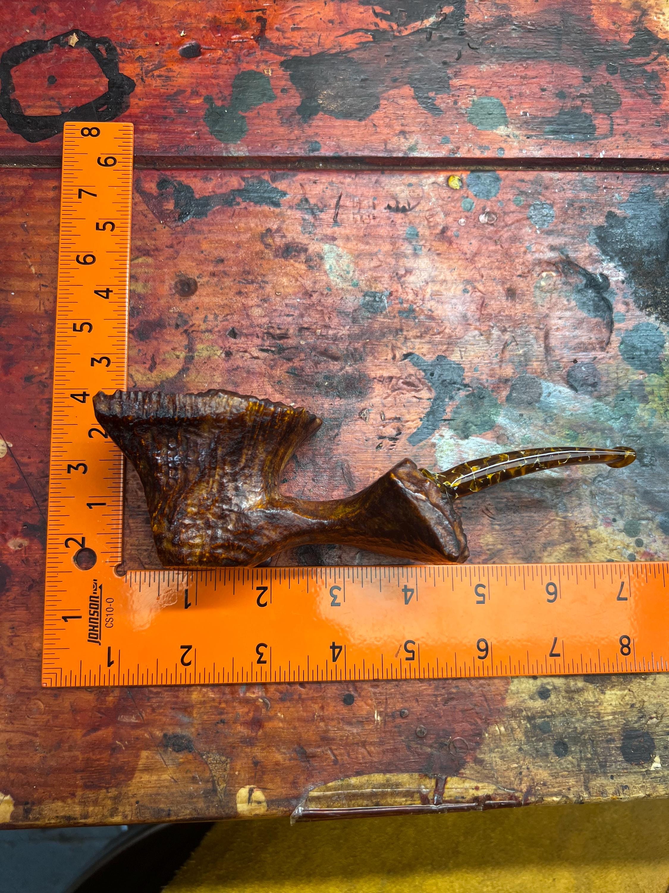 This is a handmade briar pipe that has been freehand carved and polished. A nice custom acrylic stem that’s slightly bent. These are built to be beautiful but also for every day smoking. This one is a medium to large pipe. 7/8 x1.5 deep bowl. mimmo briar