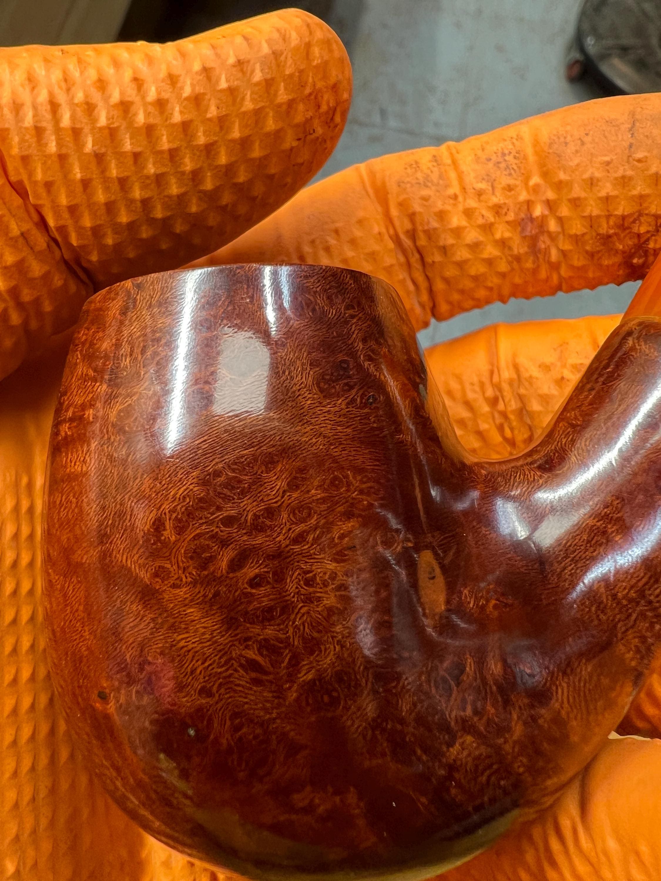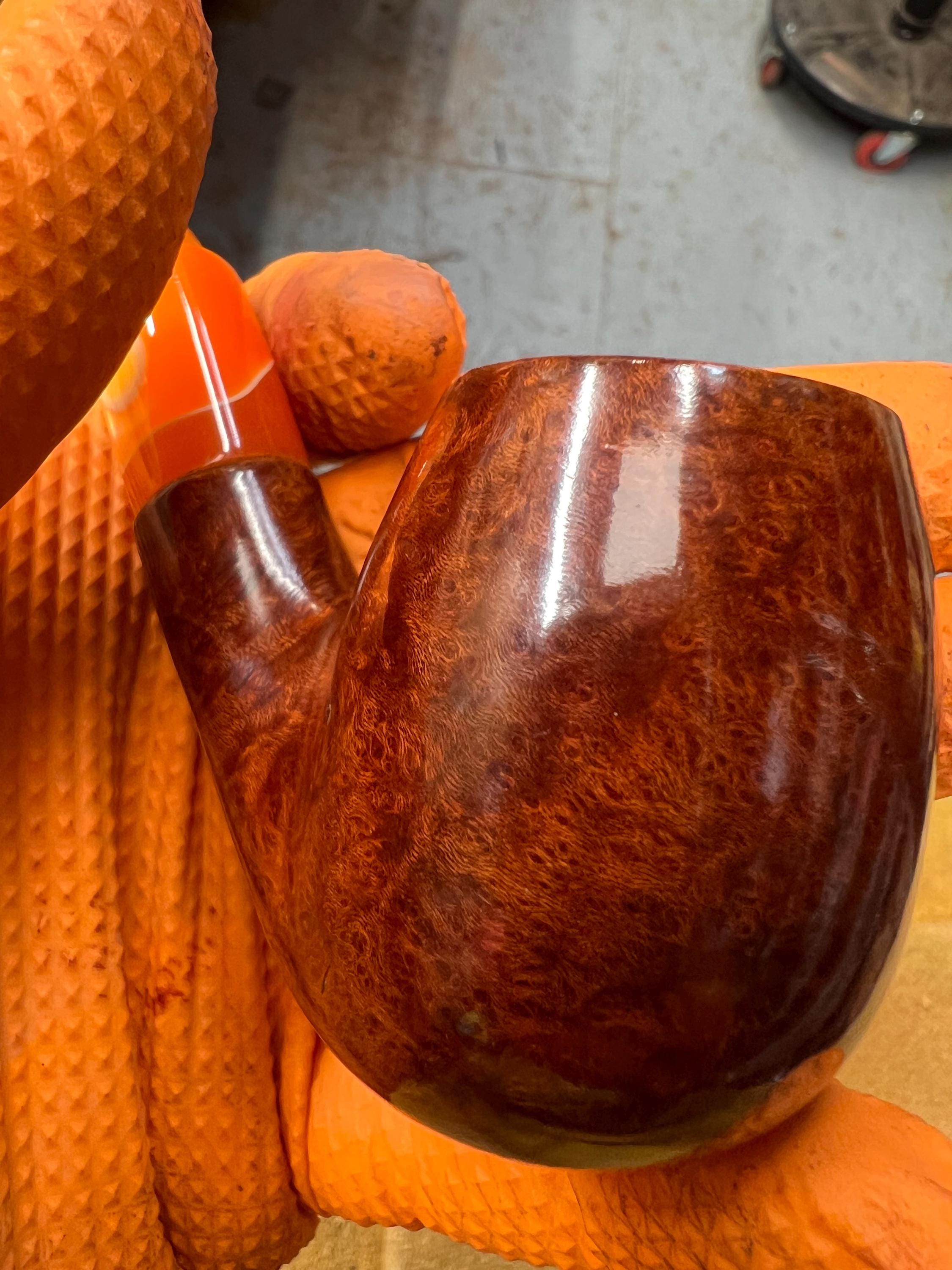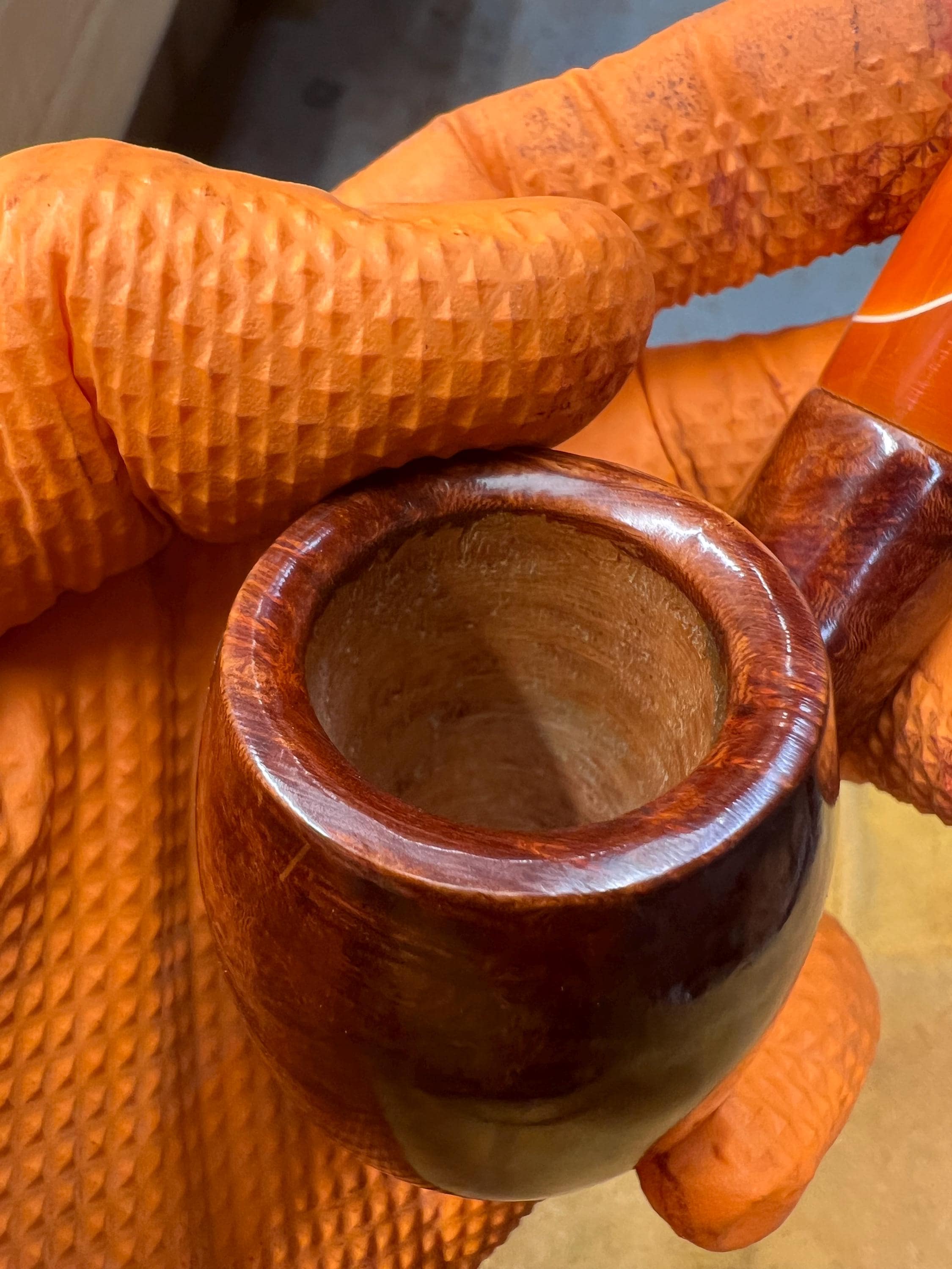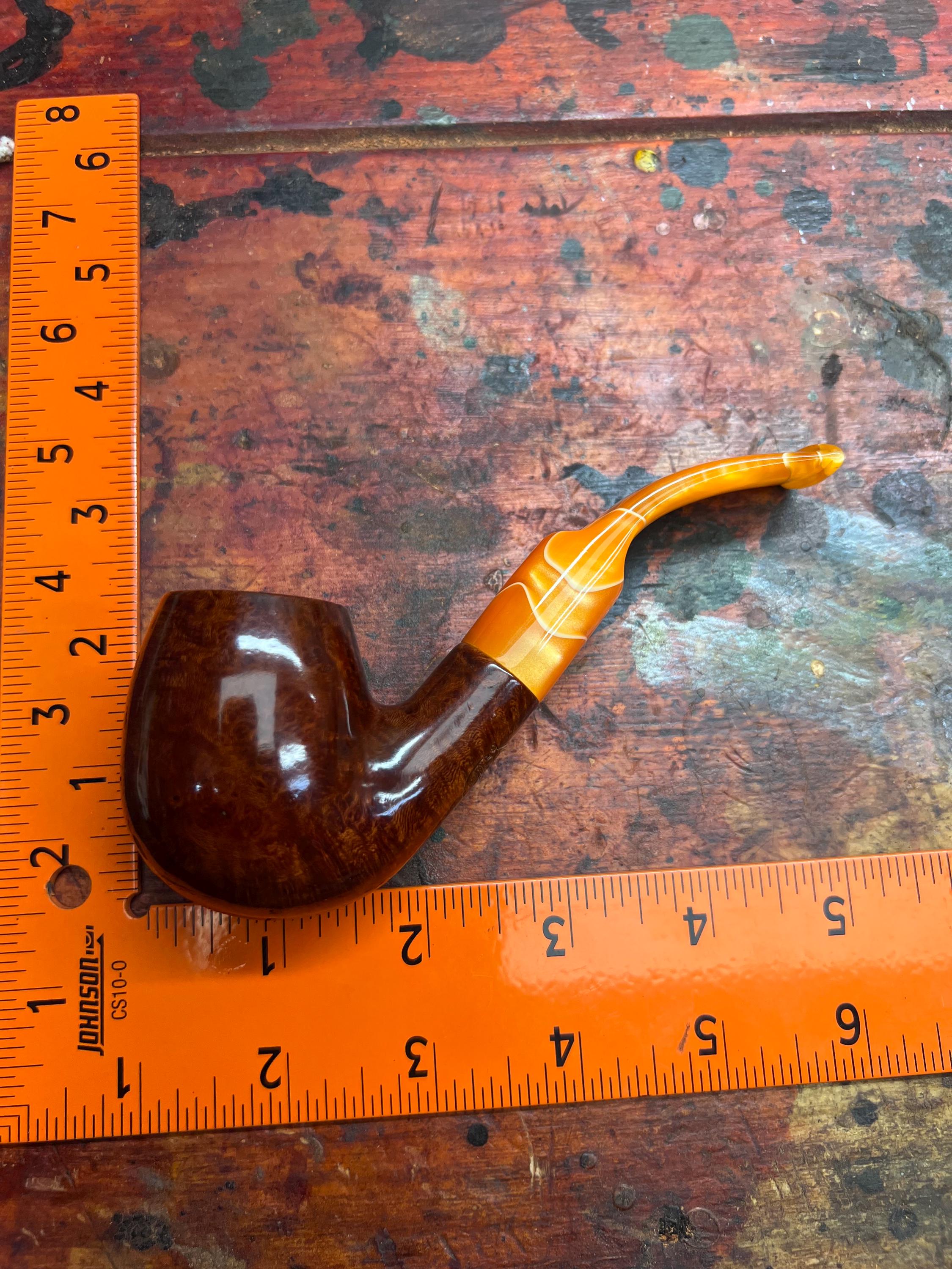 This is a handmade briar pipe that has been meticulously carved and sanded for hours by hand . Acrylic custom made stem. Non filtered. A very nice daily smoker.