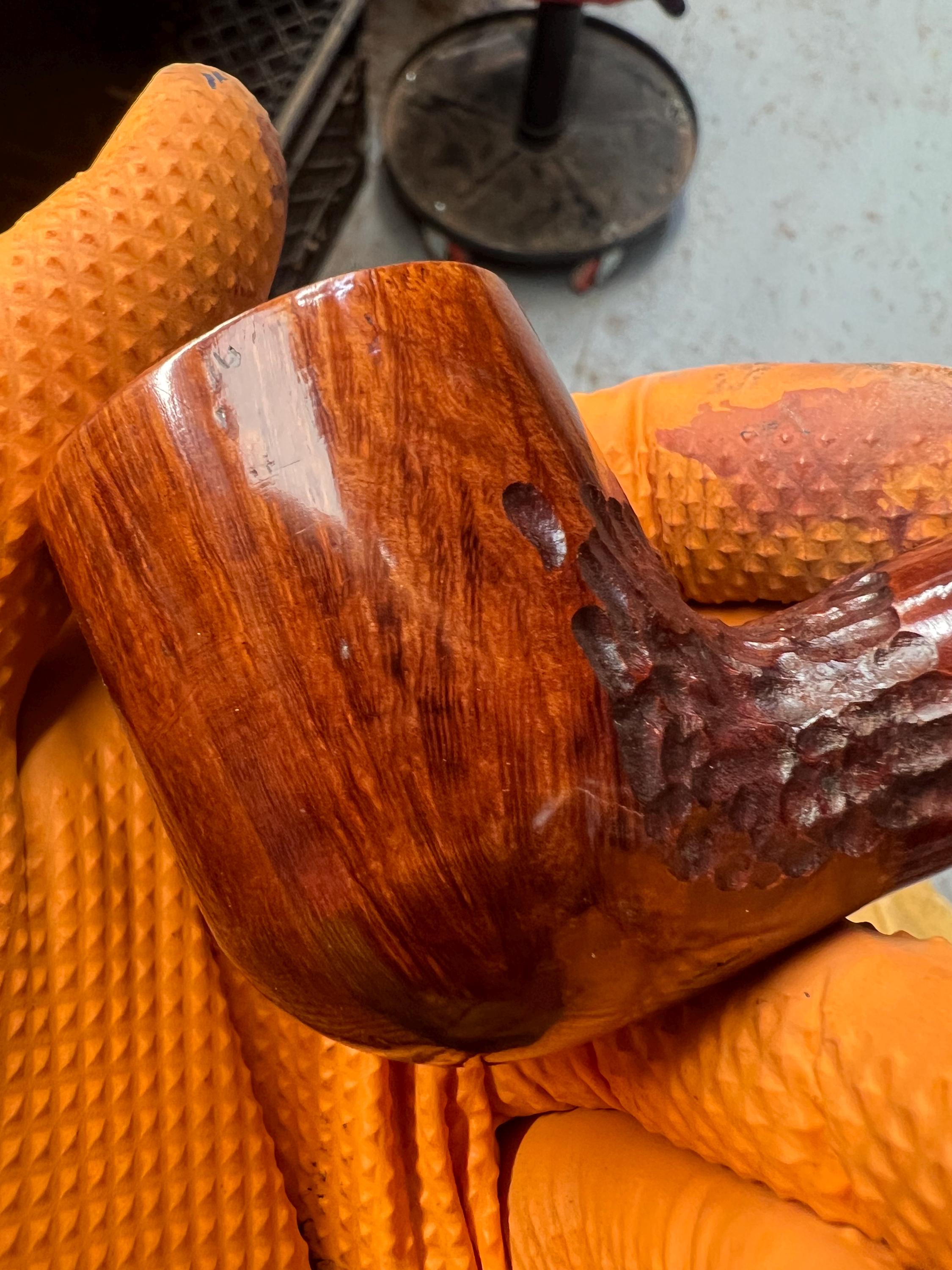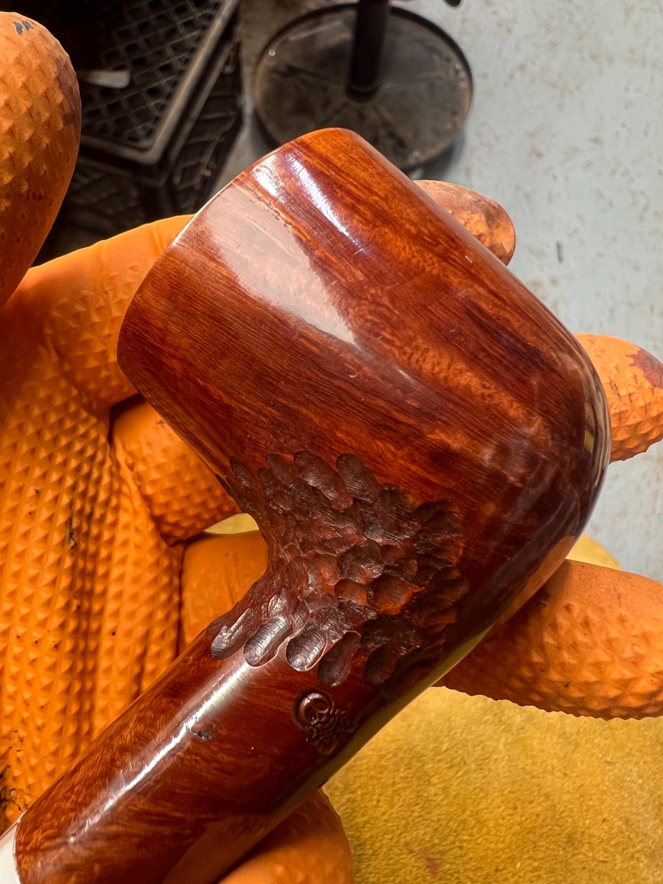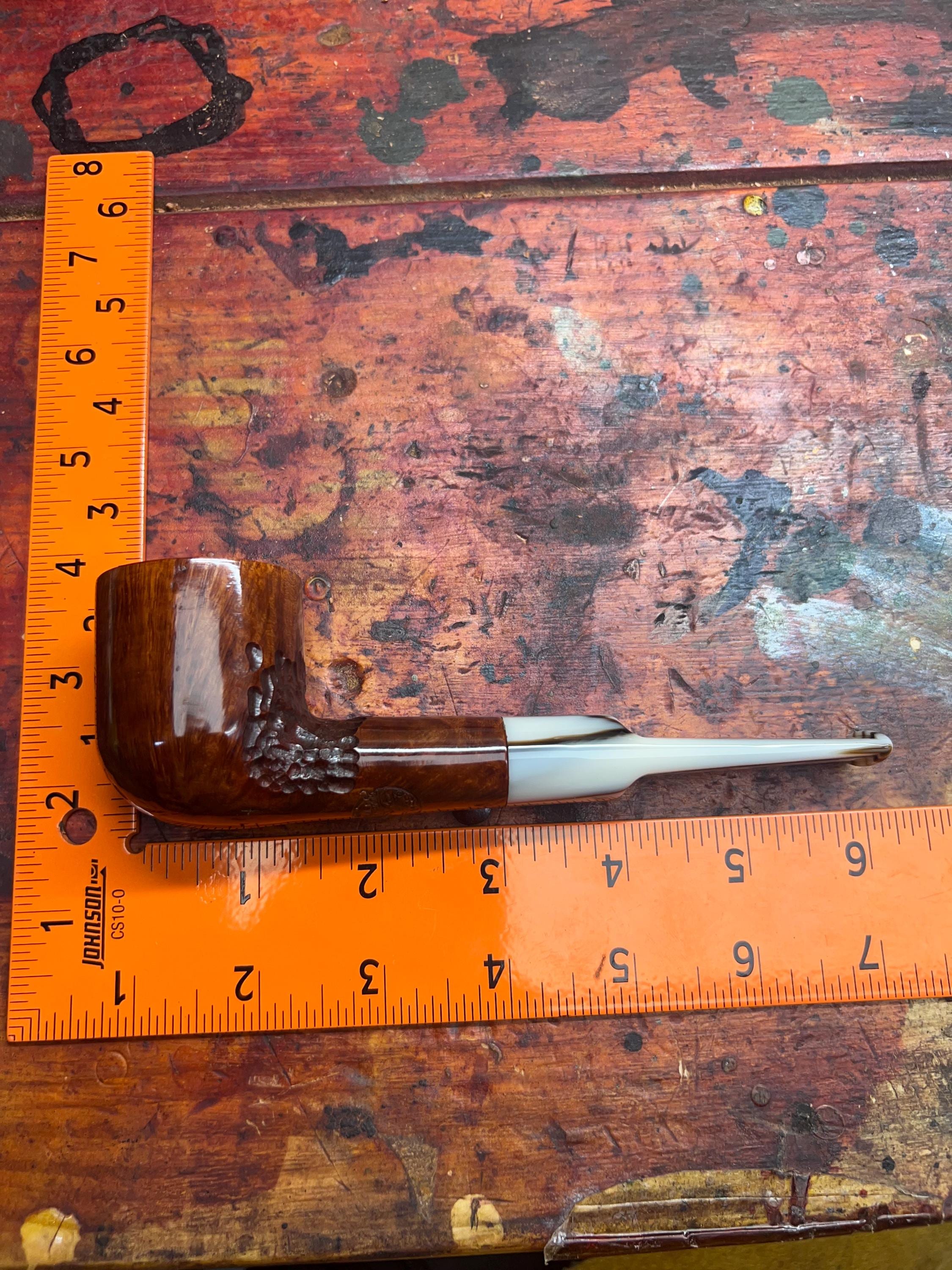 This is a handmade briar pipe that has been meticulously carved and polished/ partially rusticated . Acrylic custom made stem. Non filtered. A very nice daily smoker.