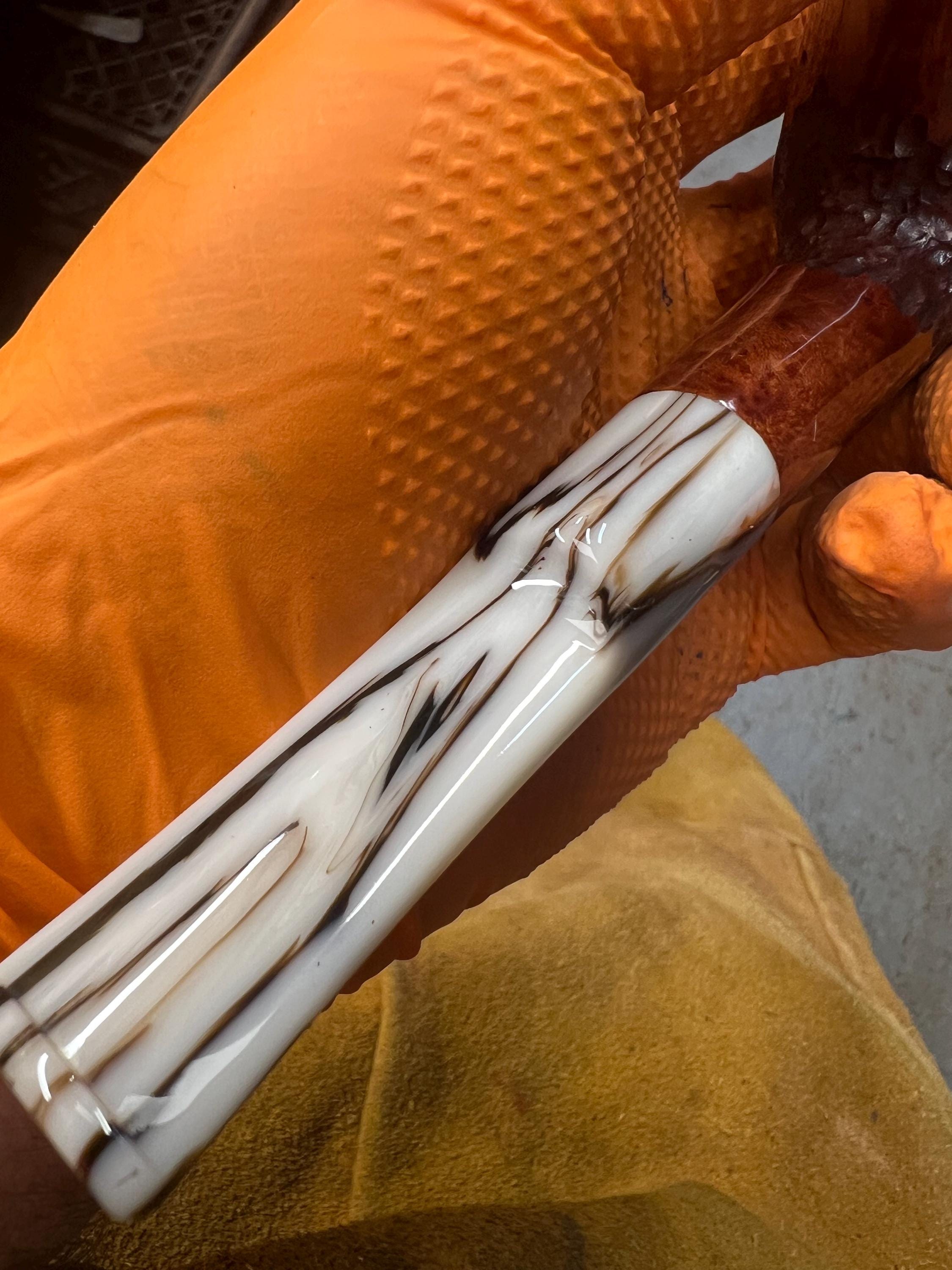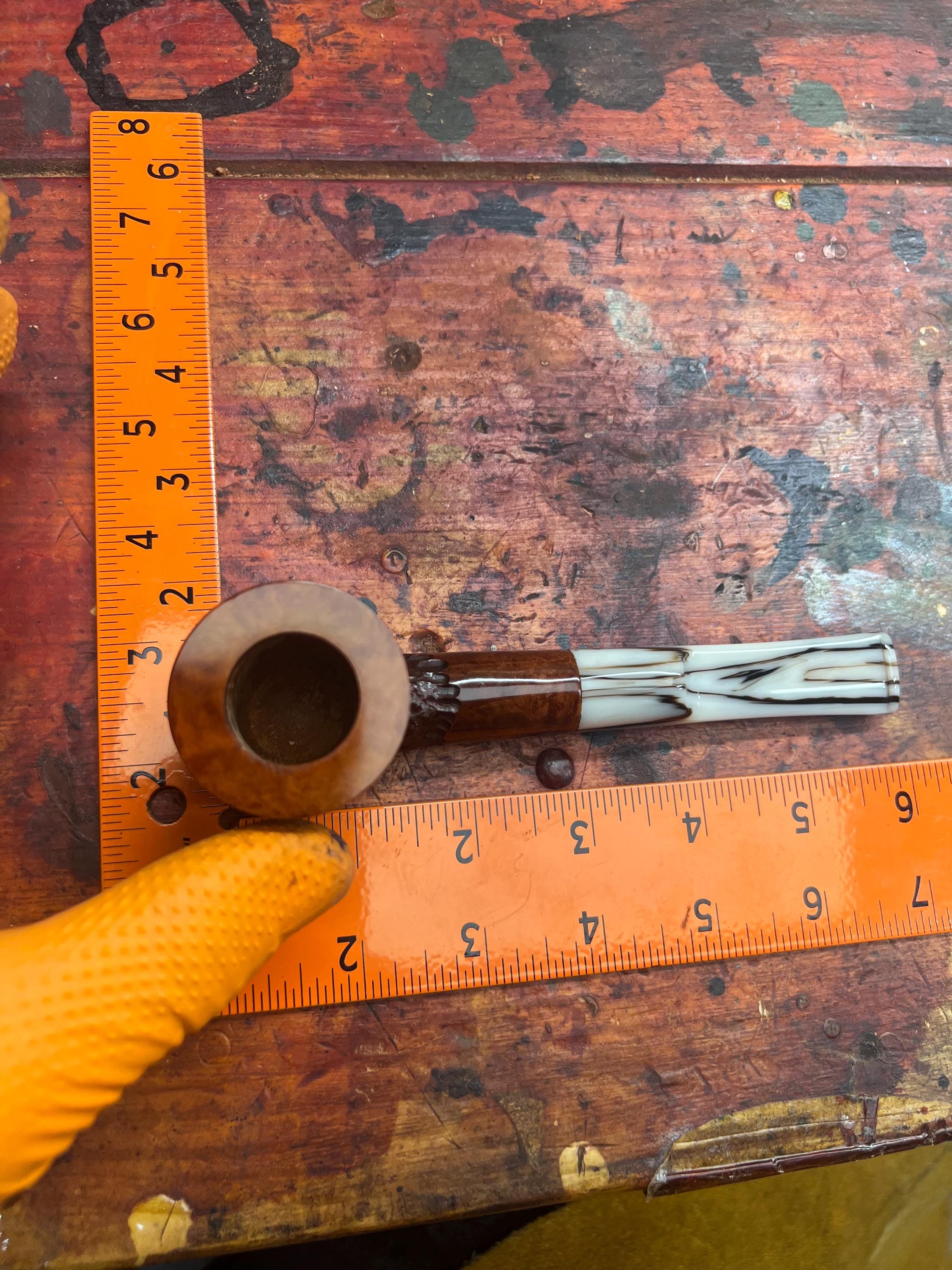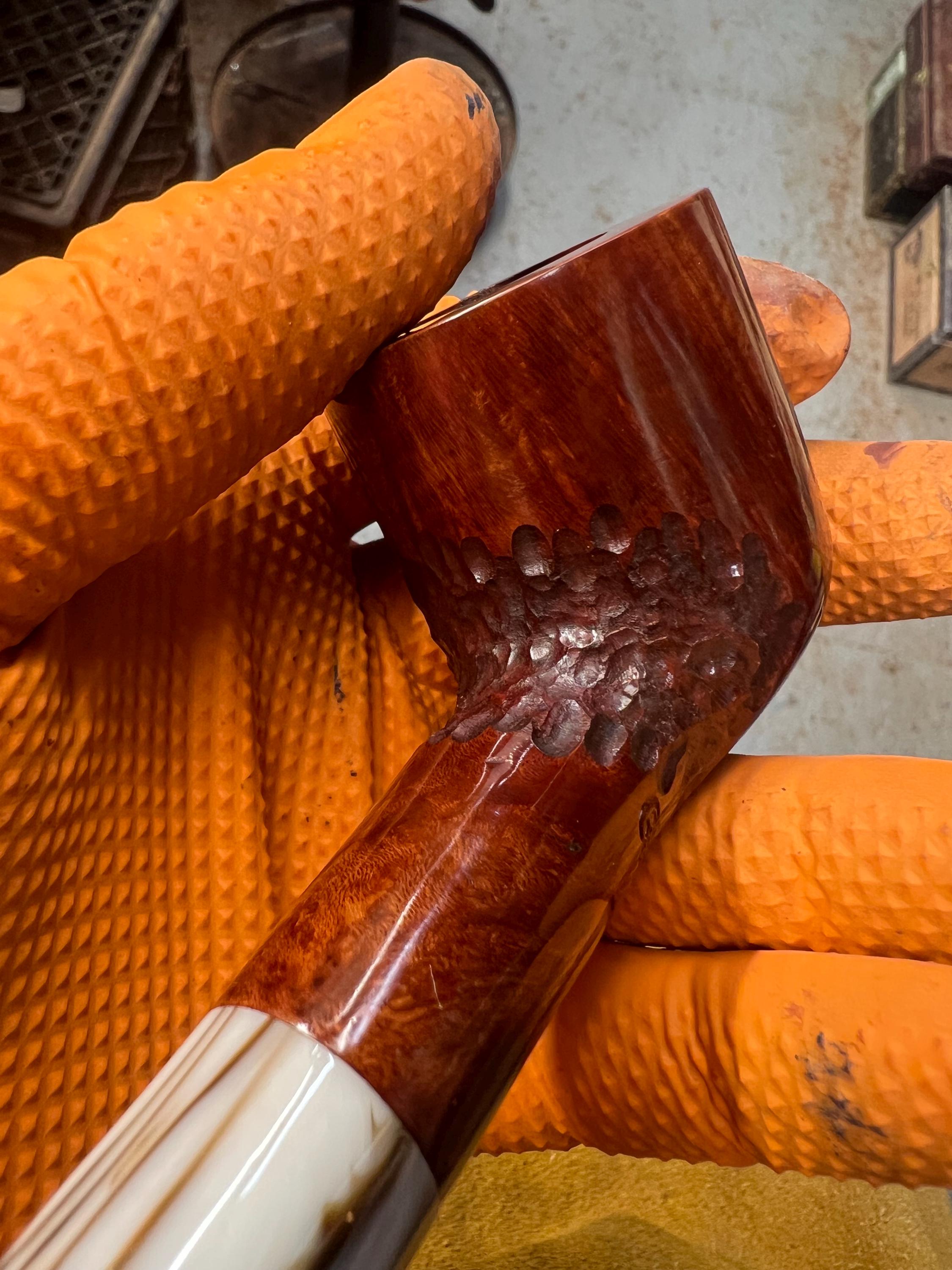 This is a handmade briar pipe that has been meticulously carved and polished/ partially rusticated . Acrylic custom made stem. Non filtered. A very nice daily smoker.
