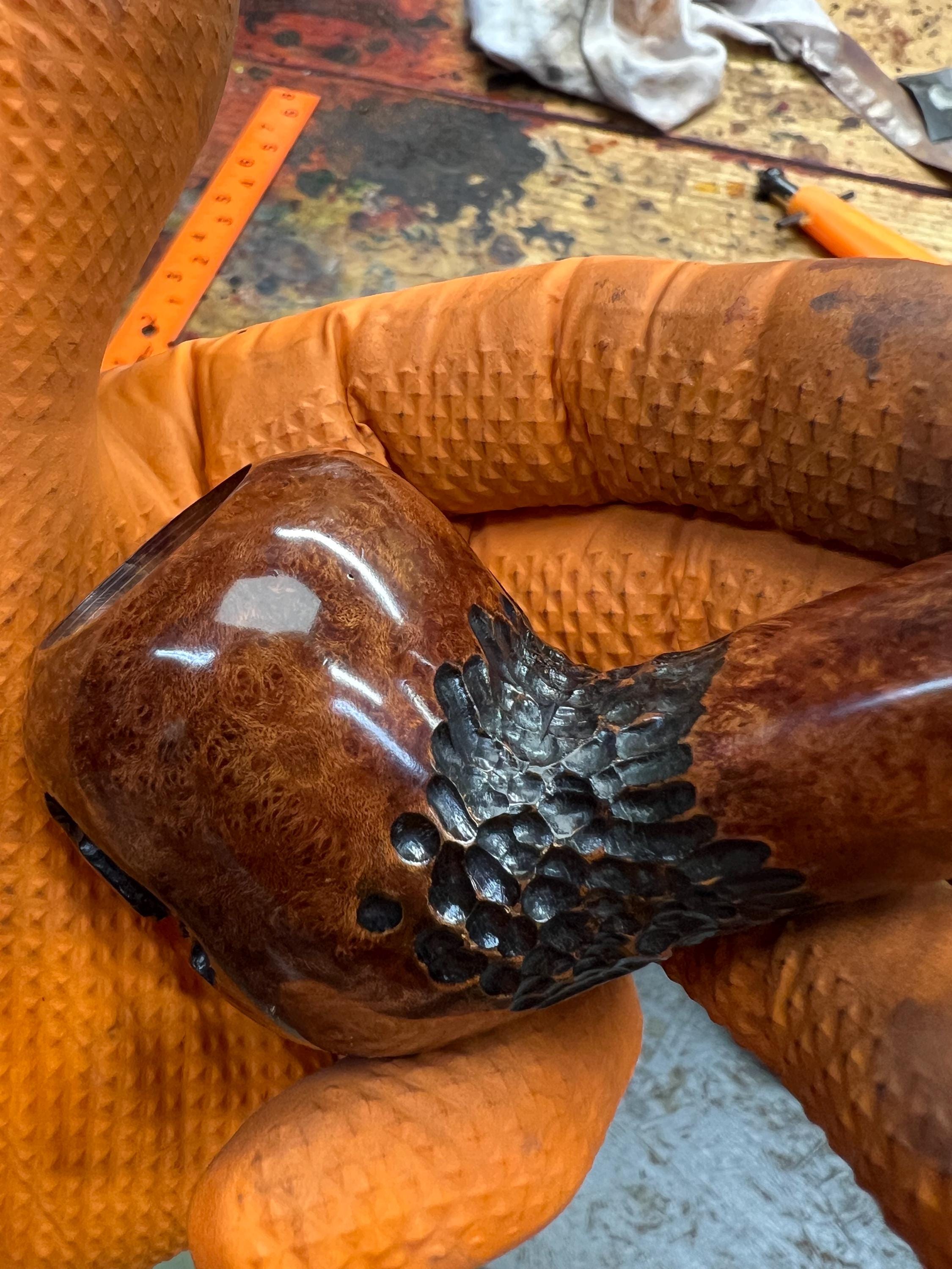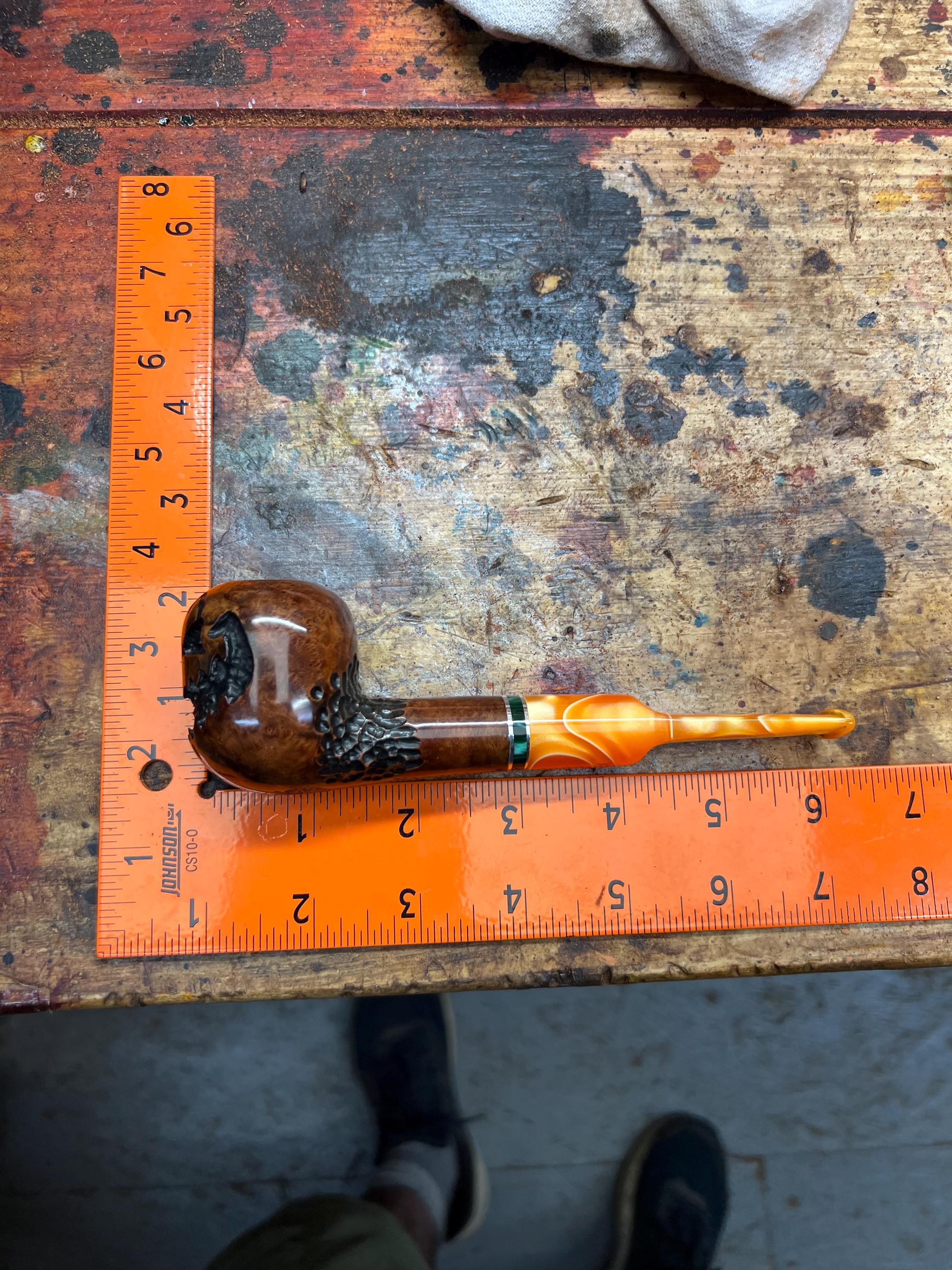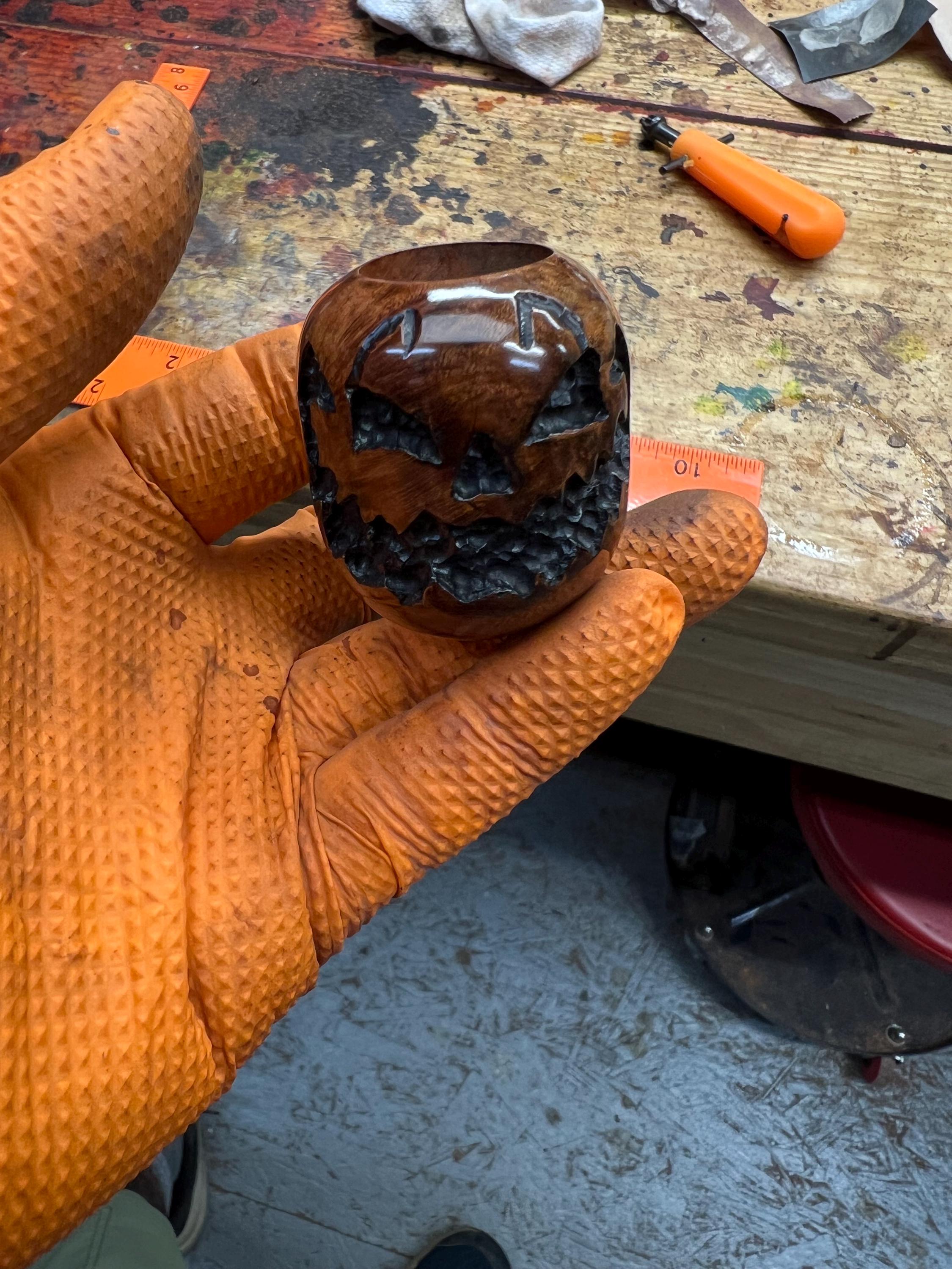 This is a handmade briar pipe that has been freehand carved and polished. A nice custom acrylic stem. These are built to be beautiful but also for every day smoking. Say happy Halloween with this awesome jack o lantern pipe!