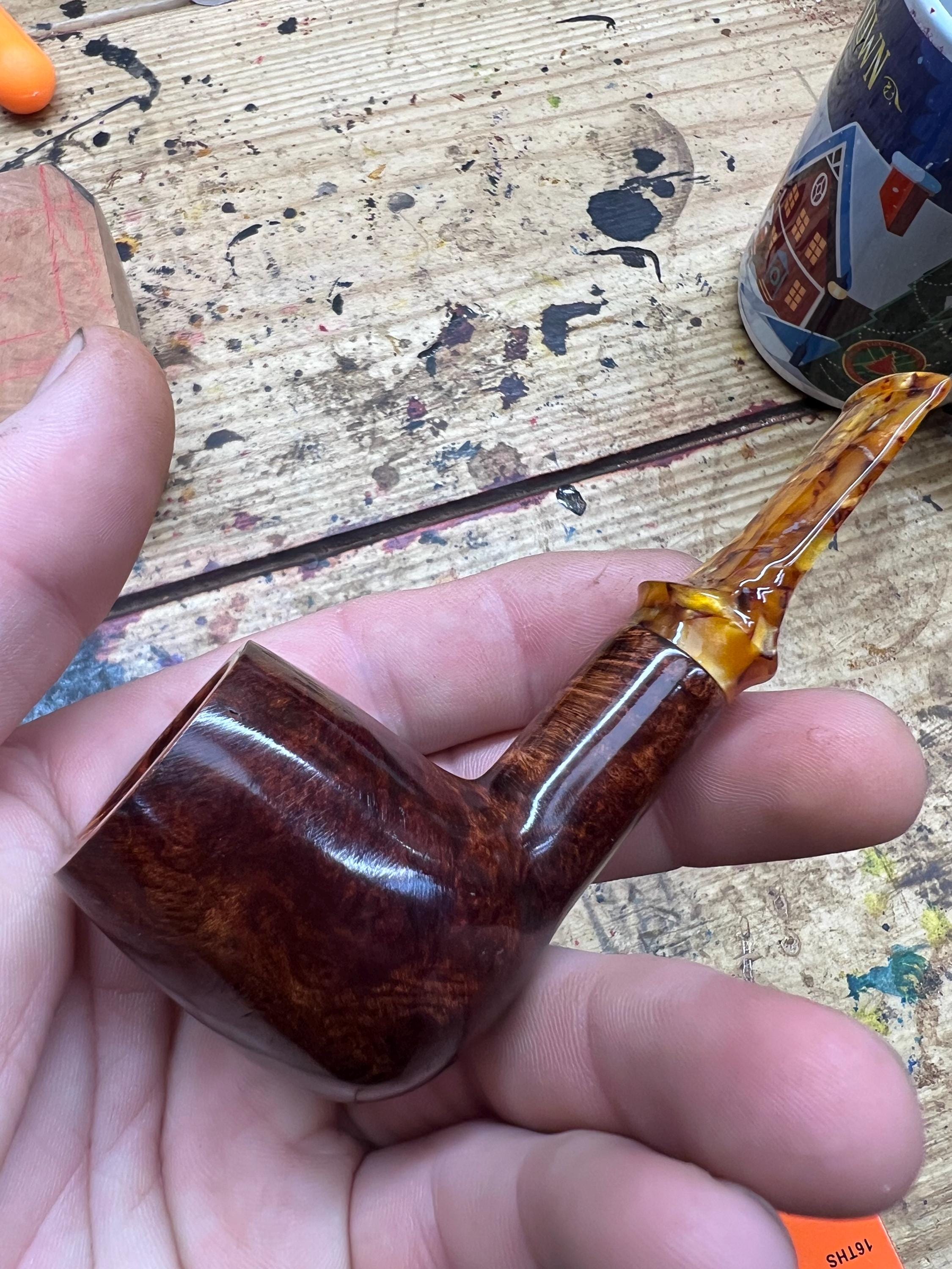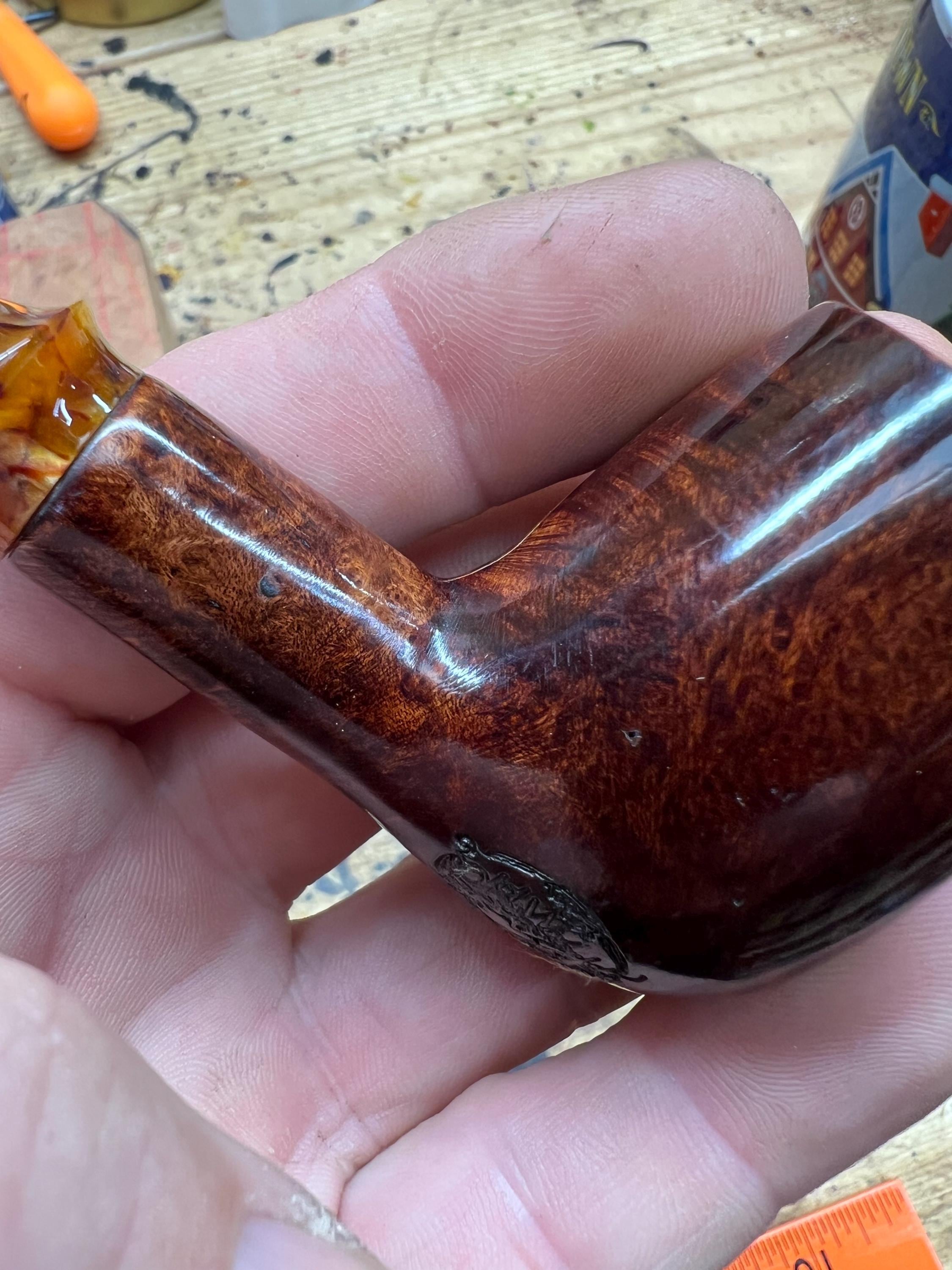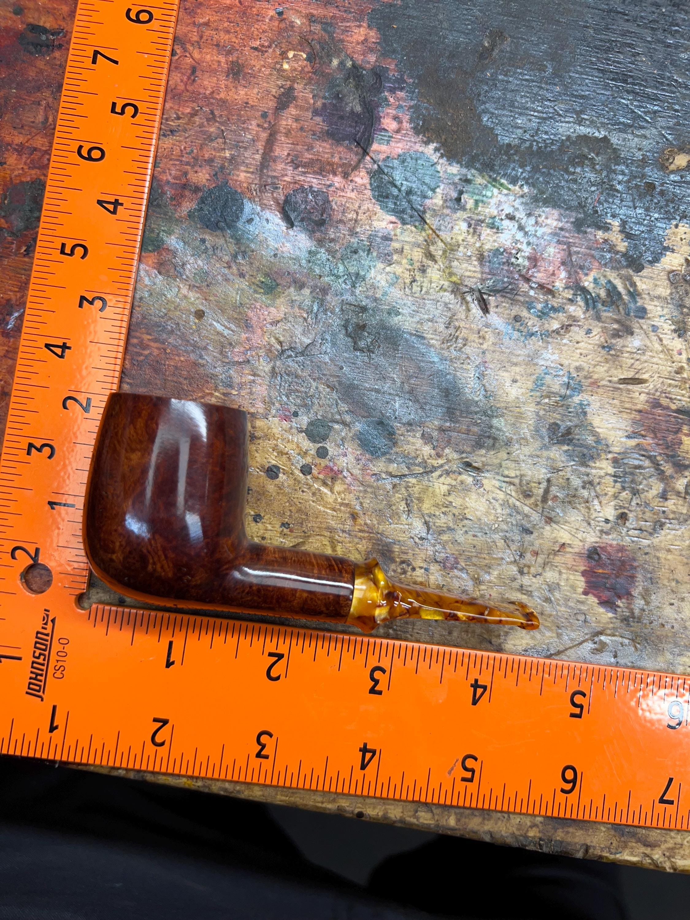 This is a handmade briar pipe that has been meticulously carved and polished . Acrylic custom made stem. Non filtered. A very nice daily smoker. Short! Stem had some low spots in it but overall still works and pretty! reduced price.
