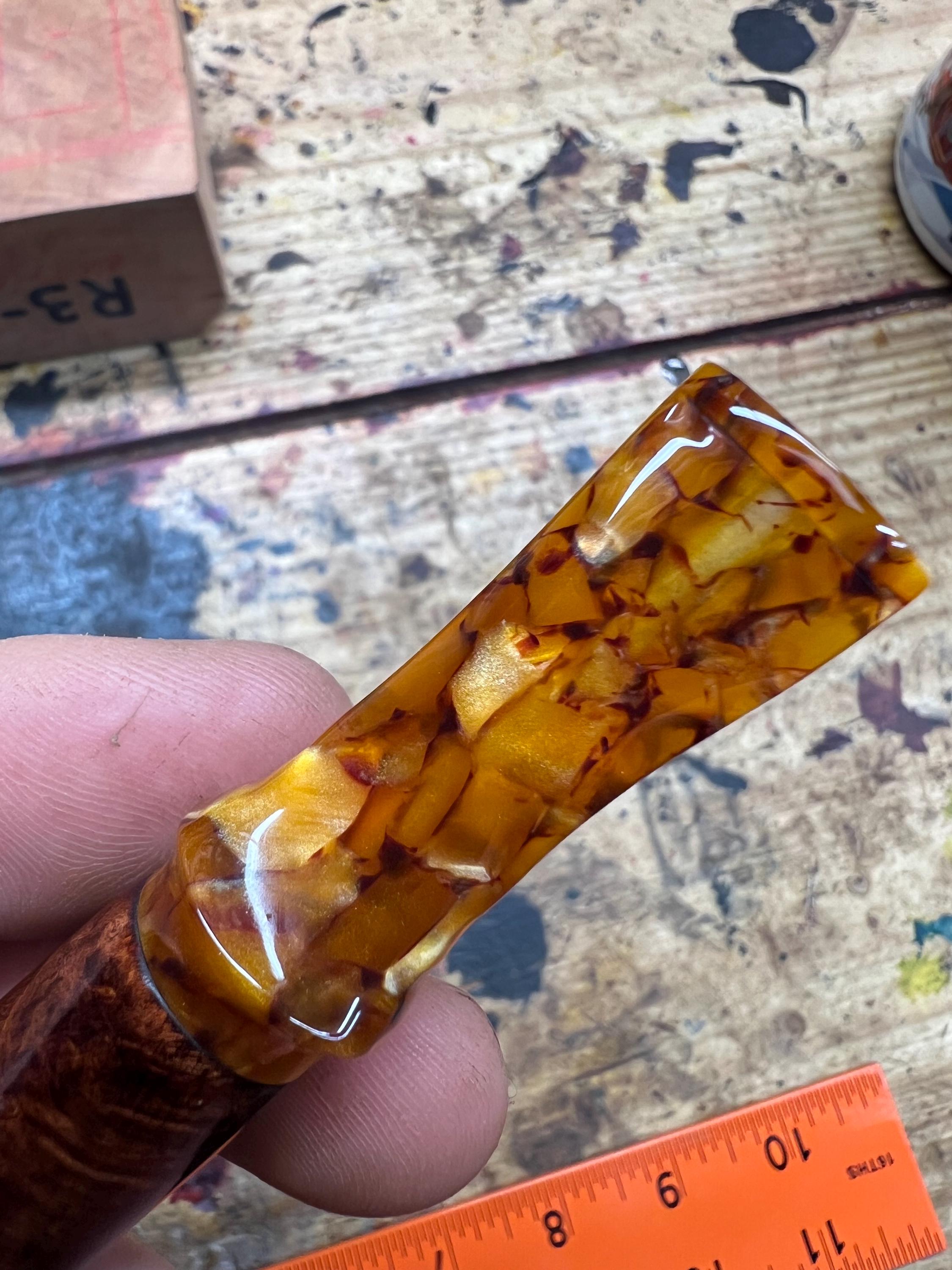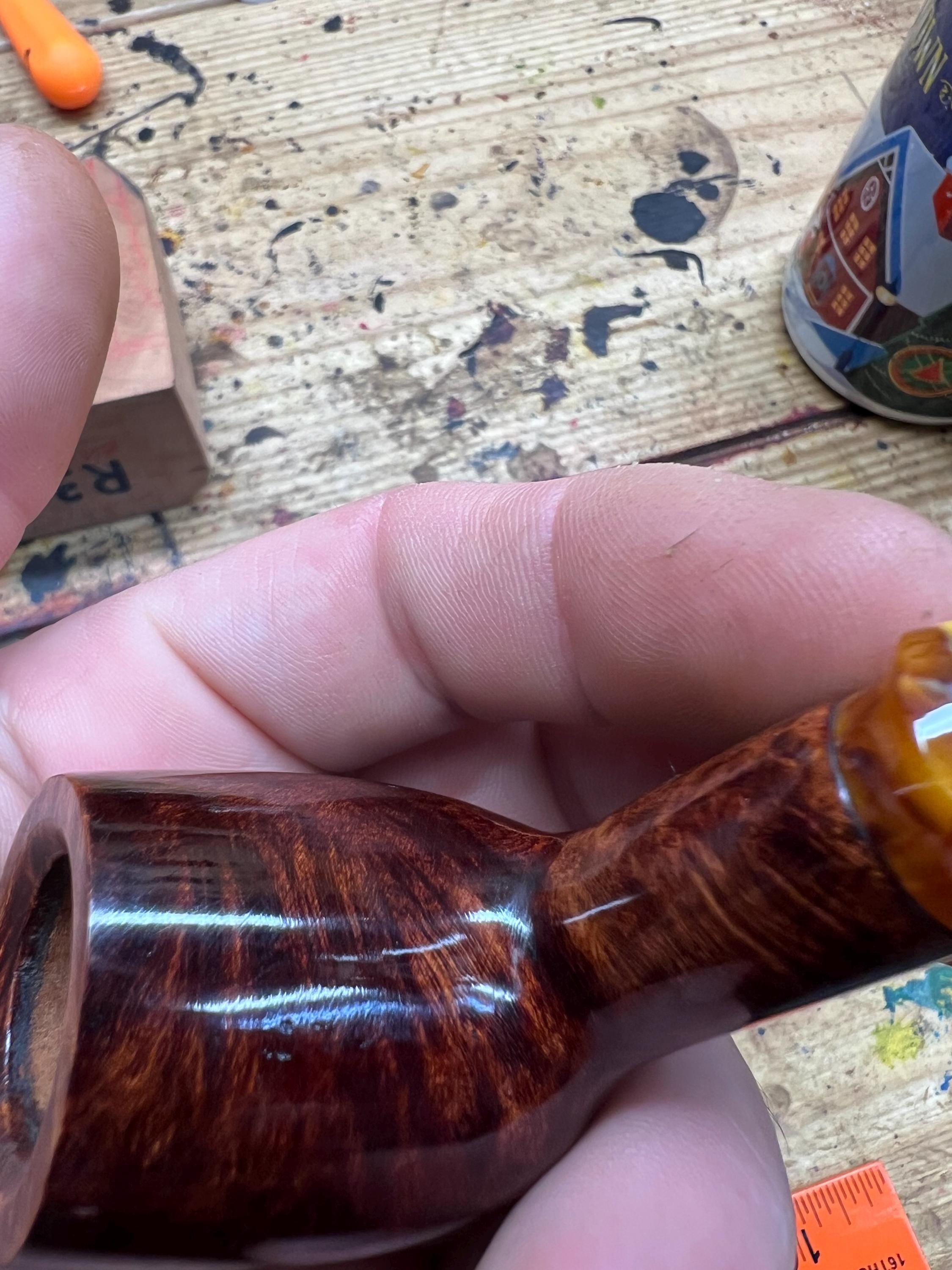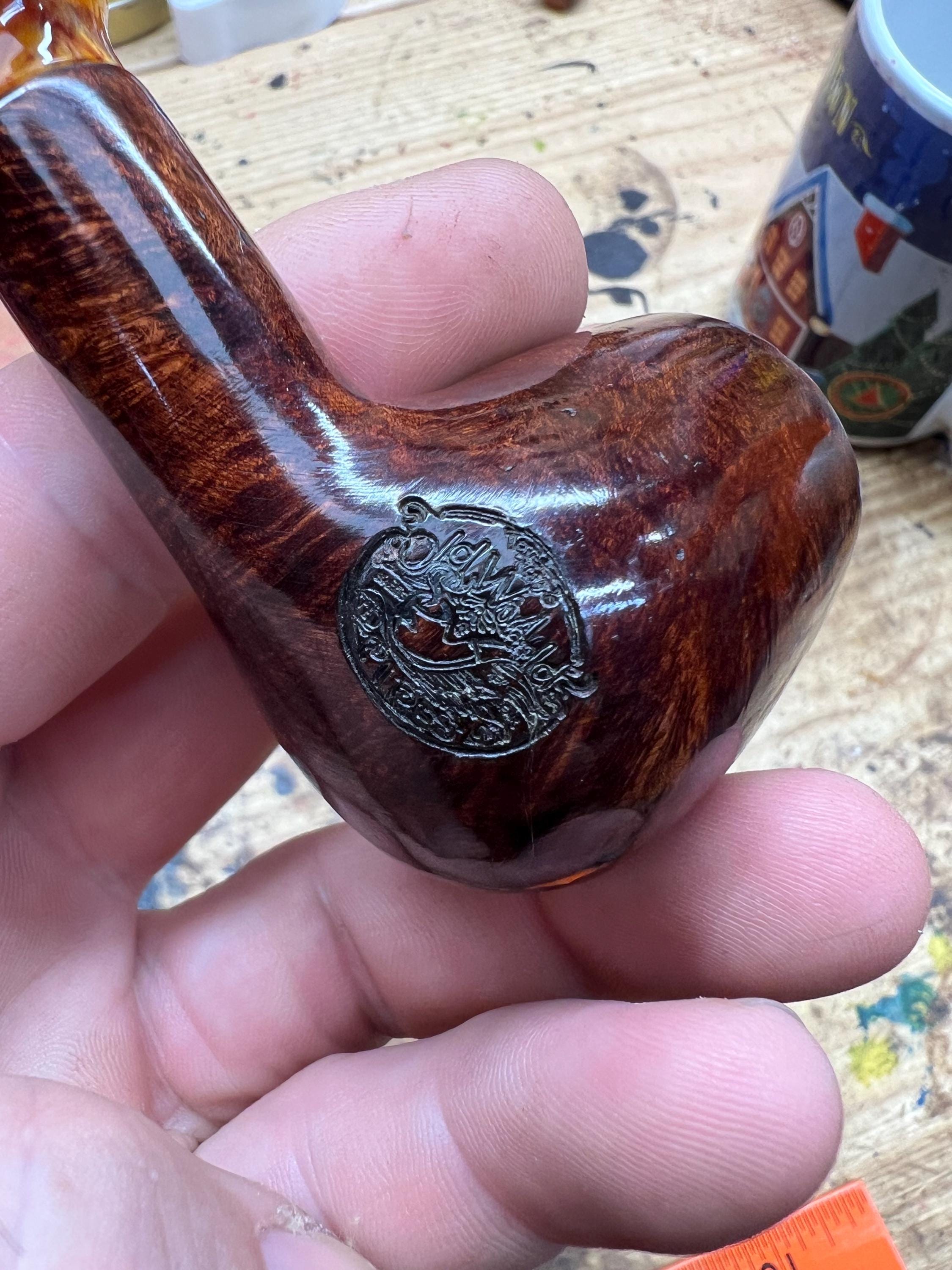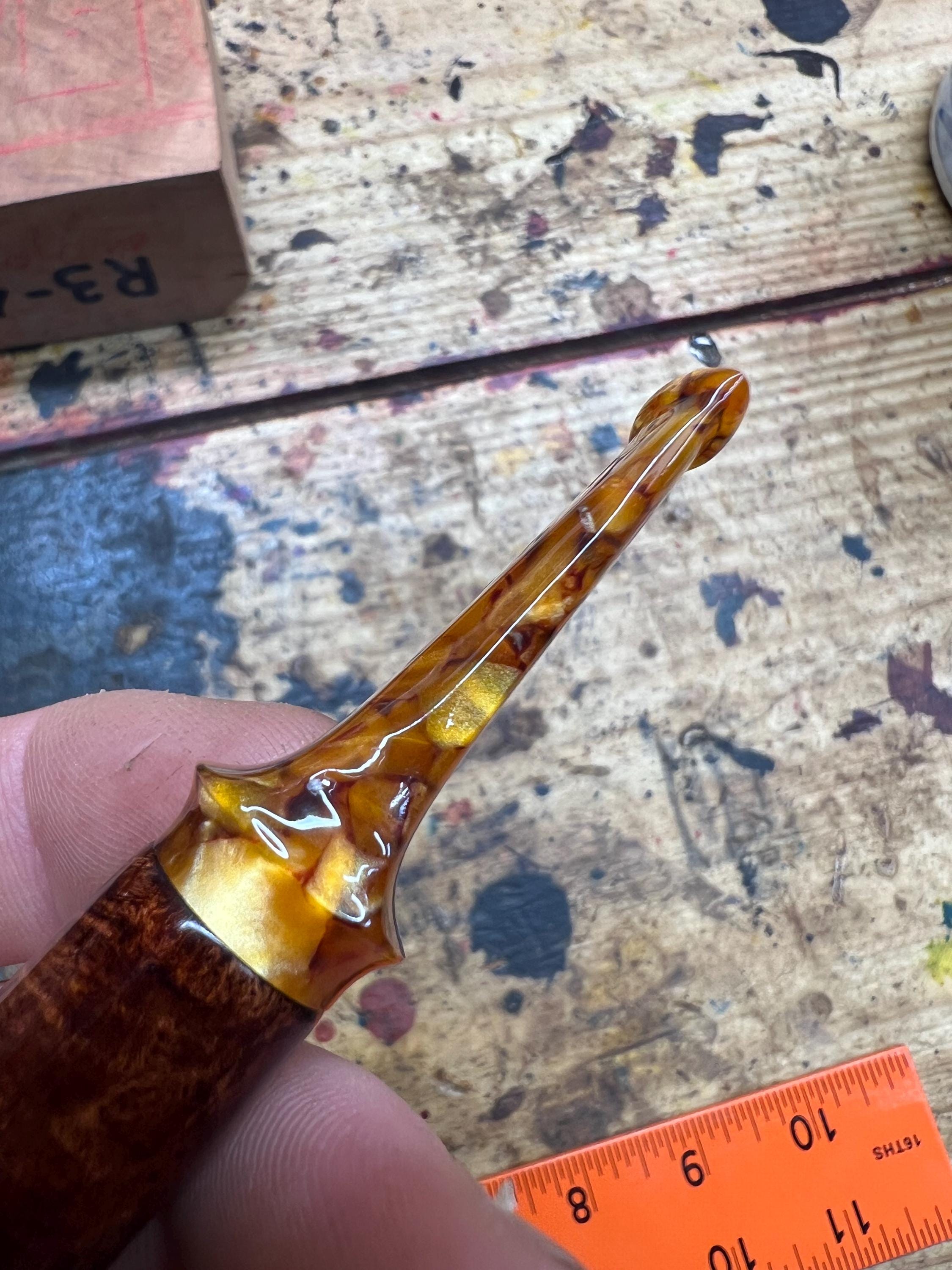 This is a handmade briar pipe that has been meticulously carved and polished . Acrylic custom made stem. Non filtered. A very nice daily smoker. Short! Stem had some low spots in it but overall still works and pretty! reduced price.