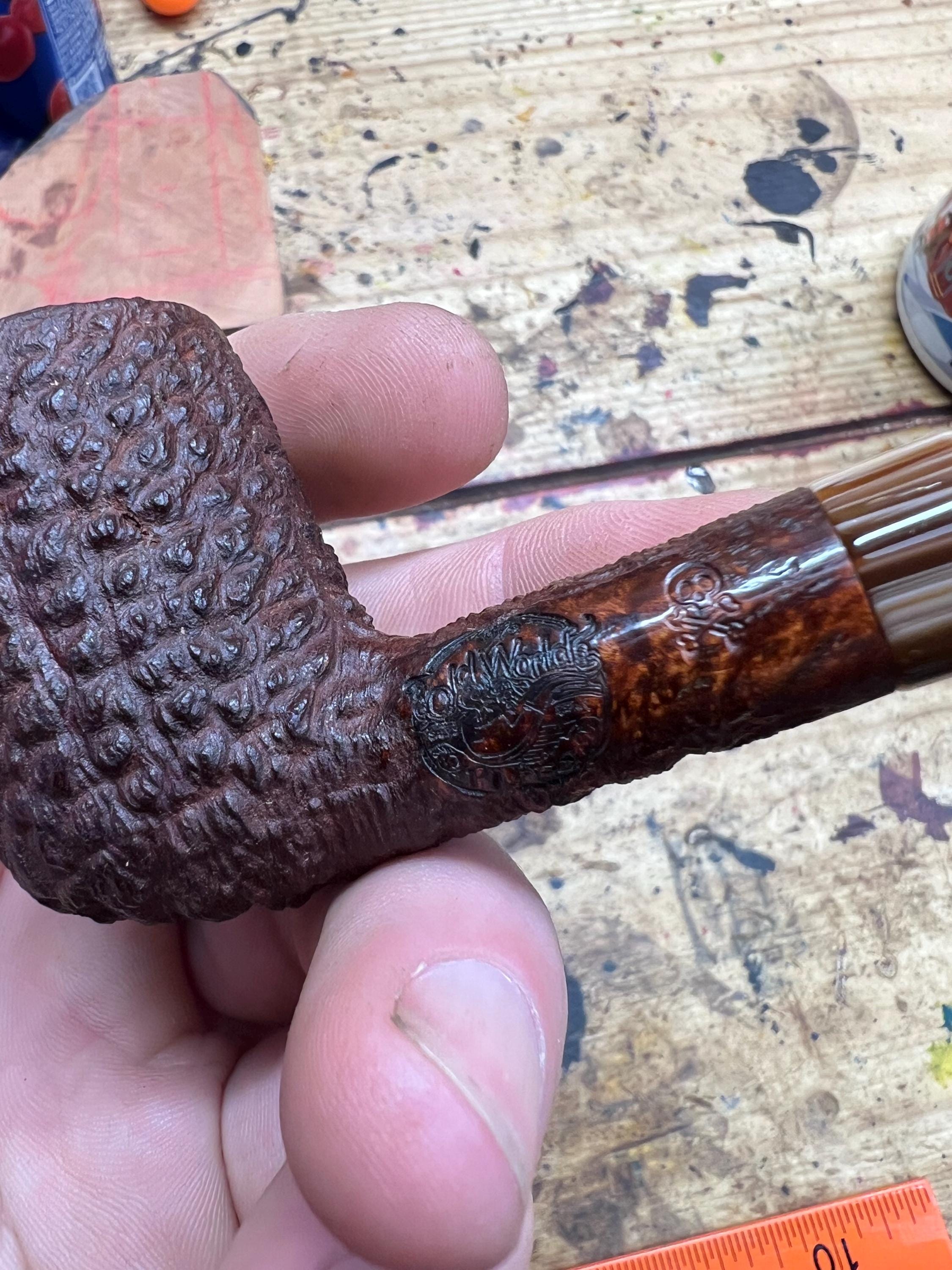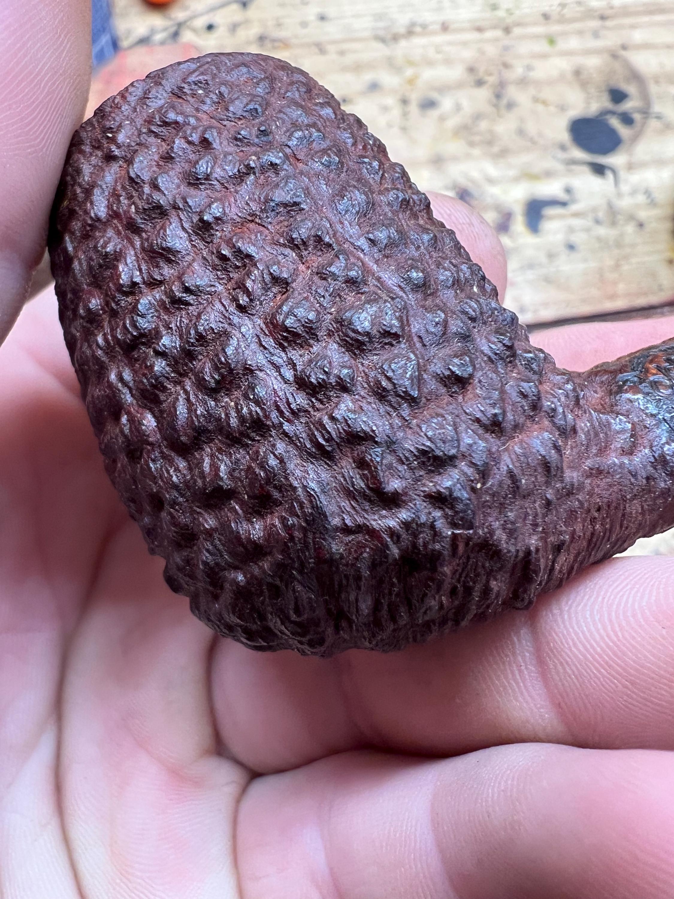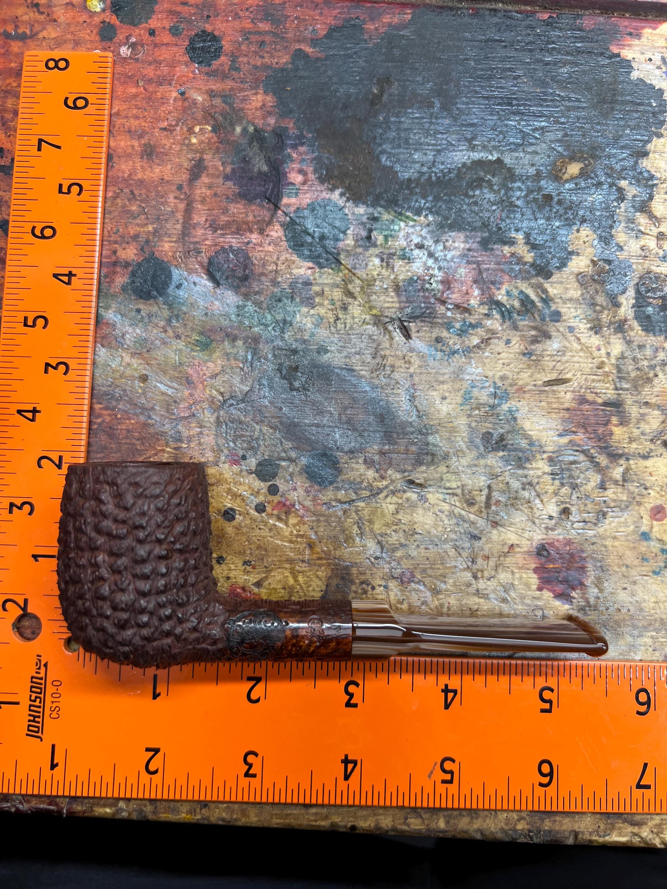 This is a handmade briar pipe that has been meticulously carved and rusticated . Acrylic custom made stem. Non filtered. A very nice daily smoker. medium size for your pocket!