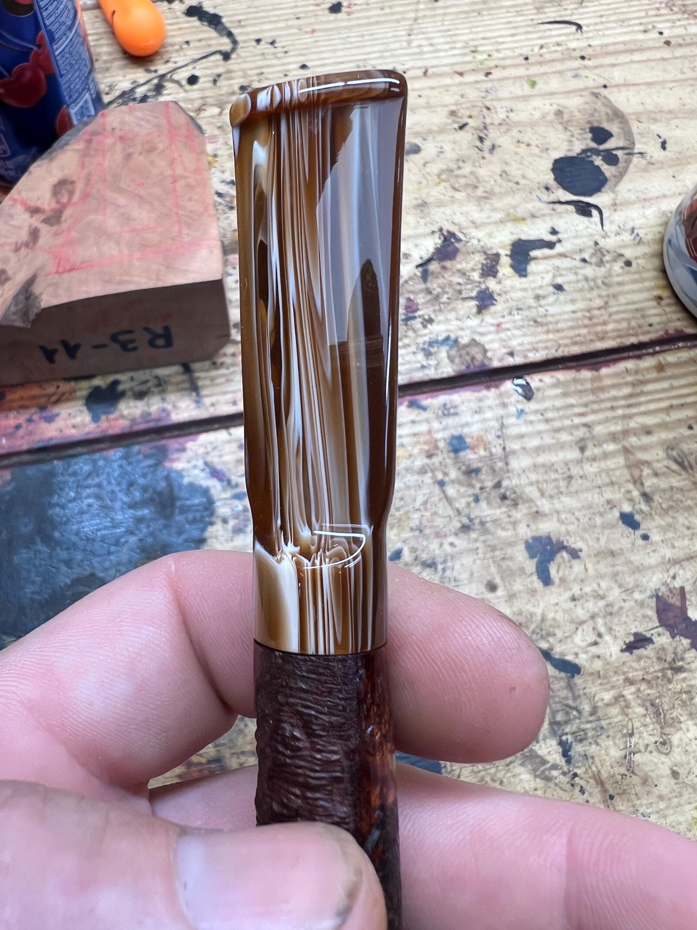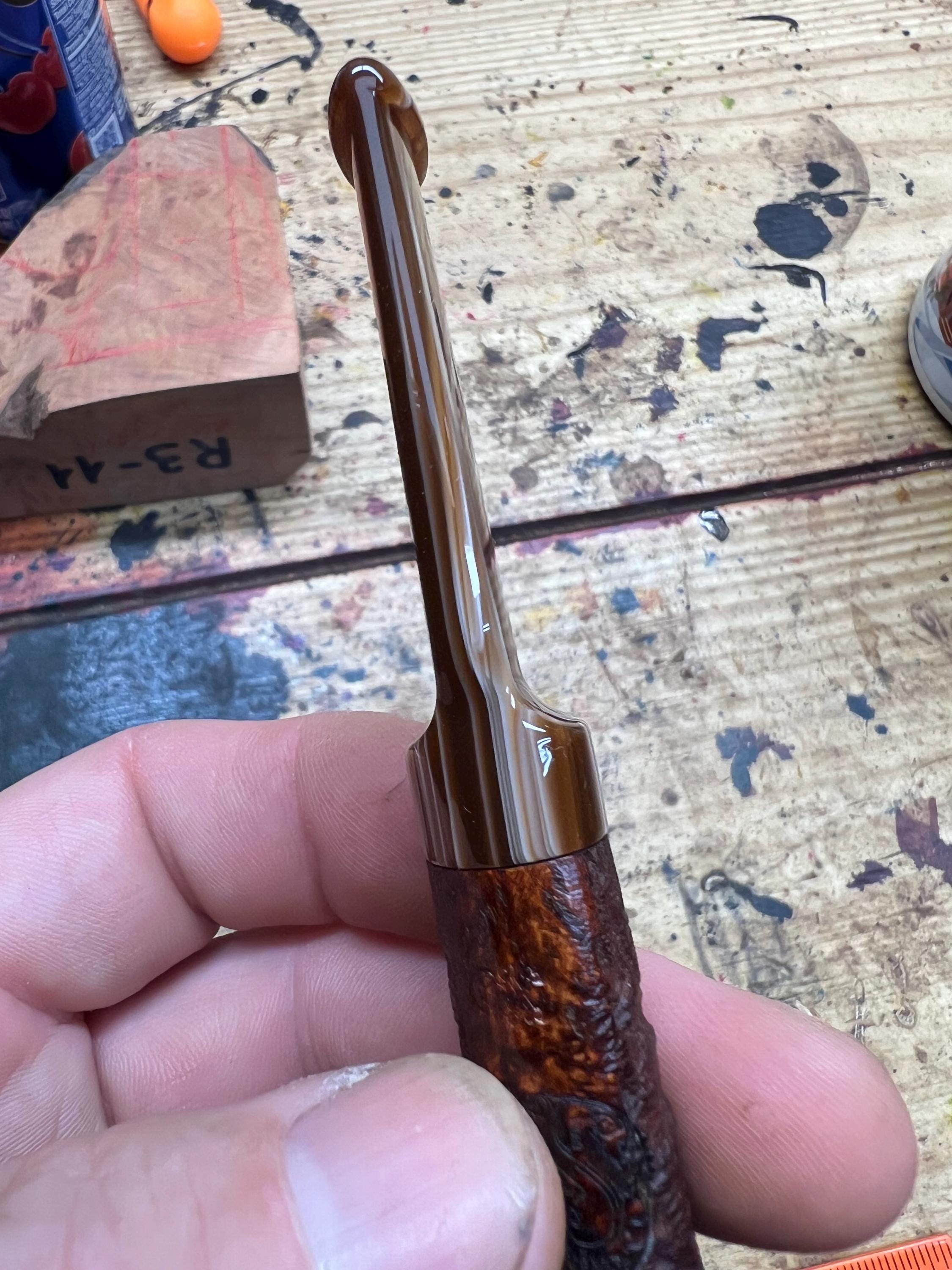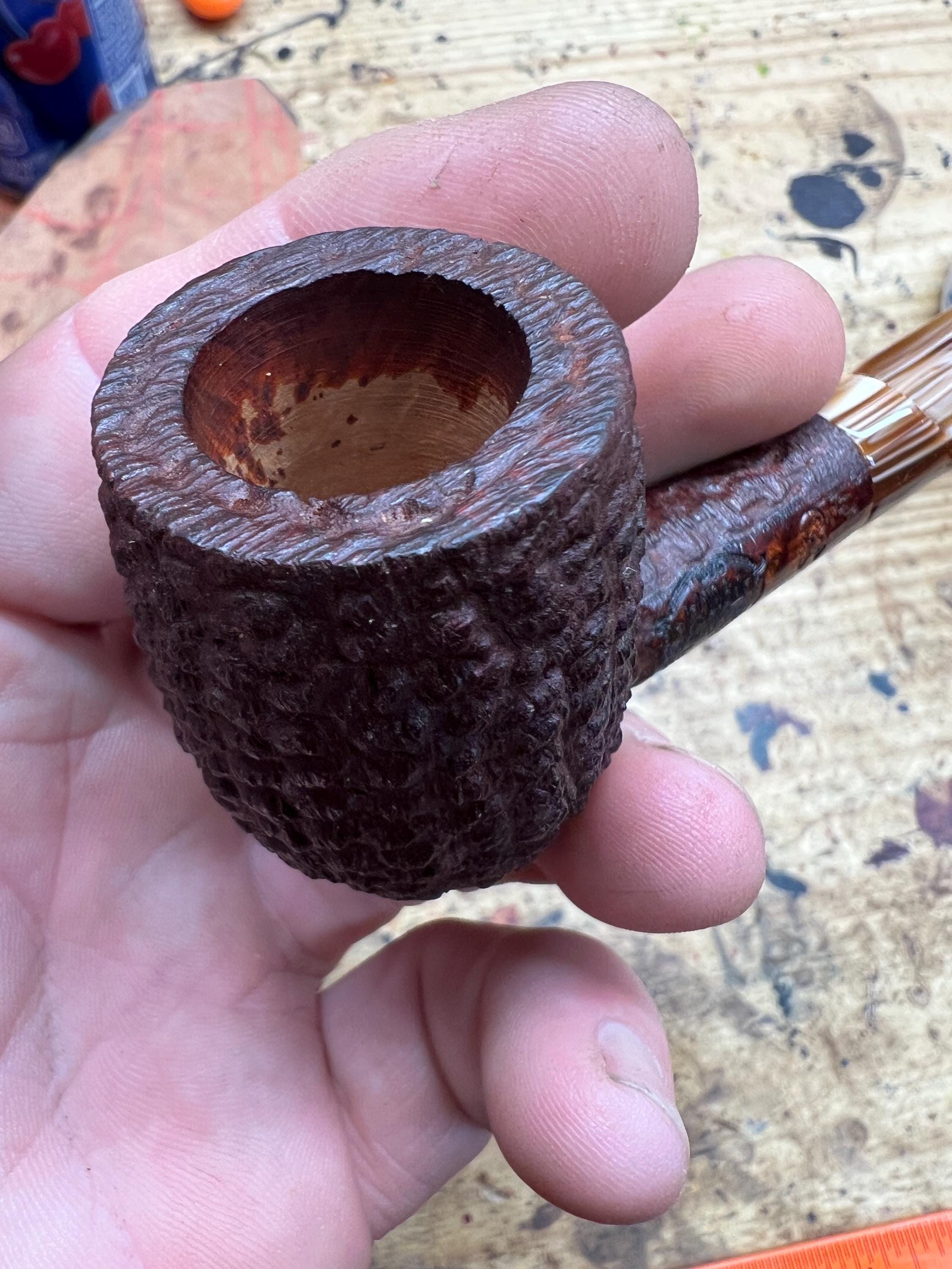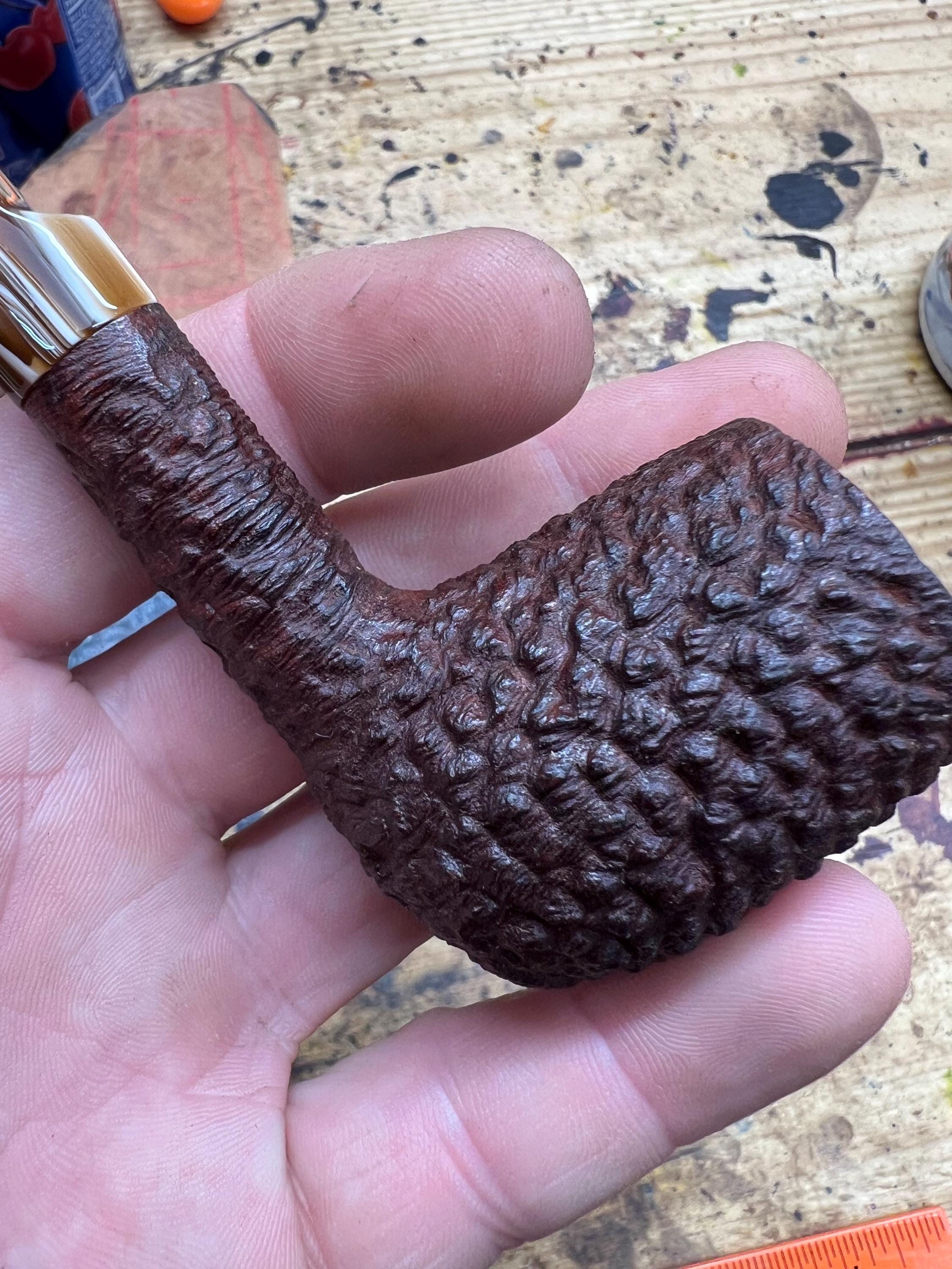 This is a handmade briar pipe that has been meticulously carved and rusticated . Acrylic custom made stem. Non filtered. A very nice daily smoker. medium size for your pocket!