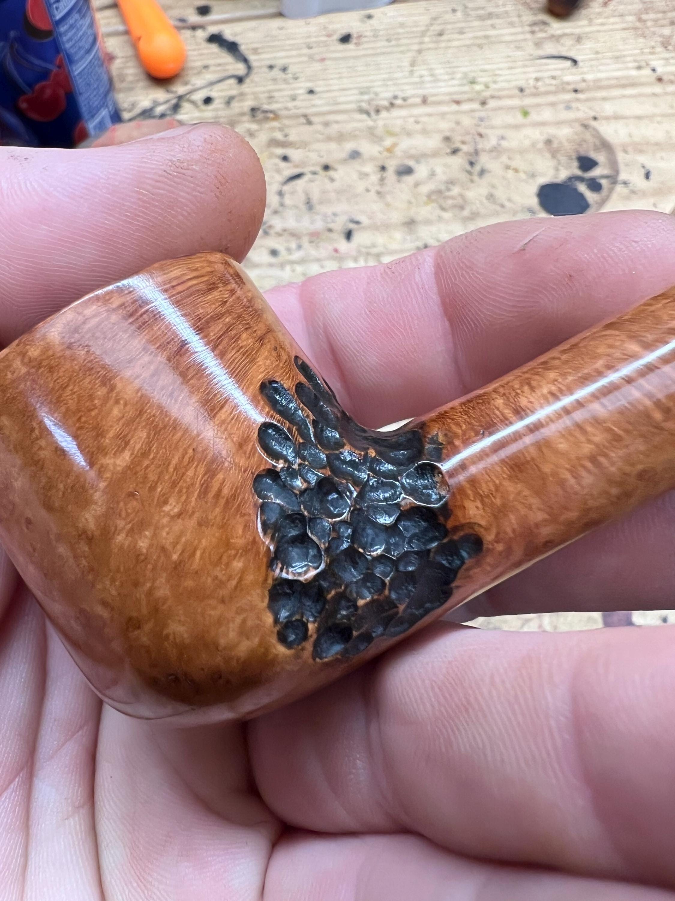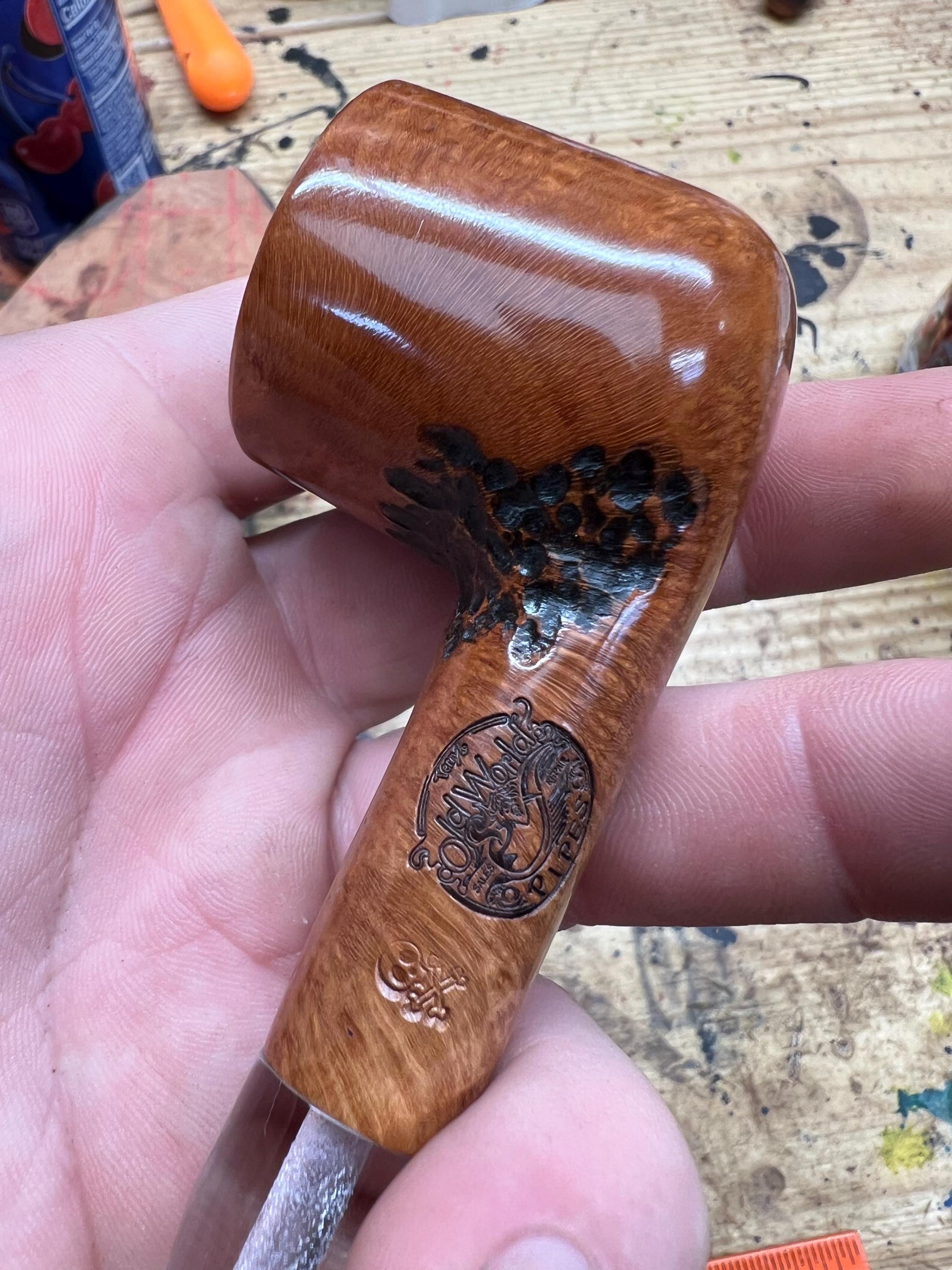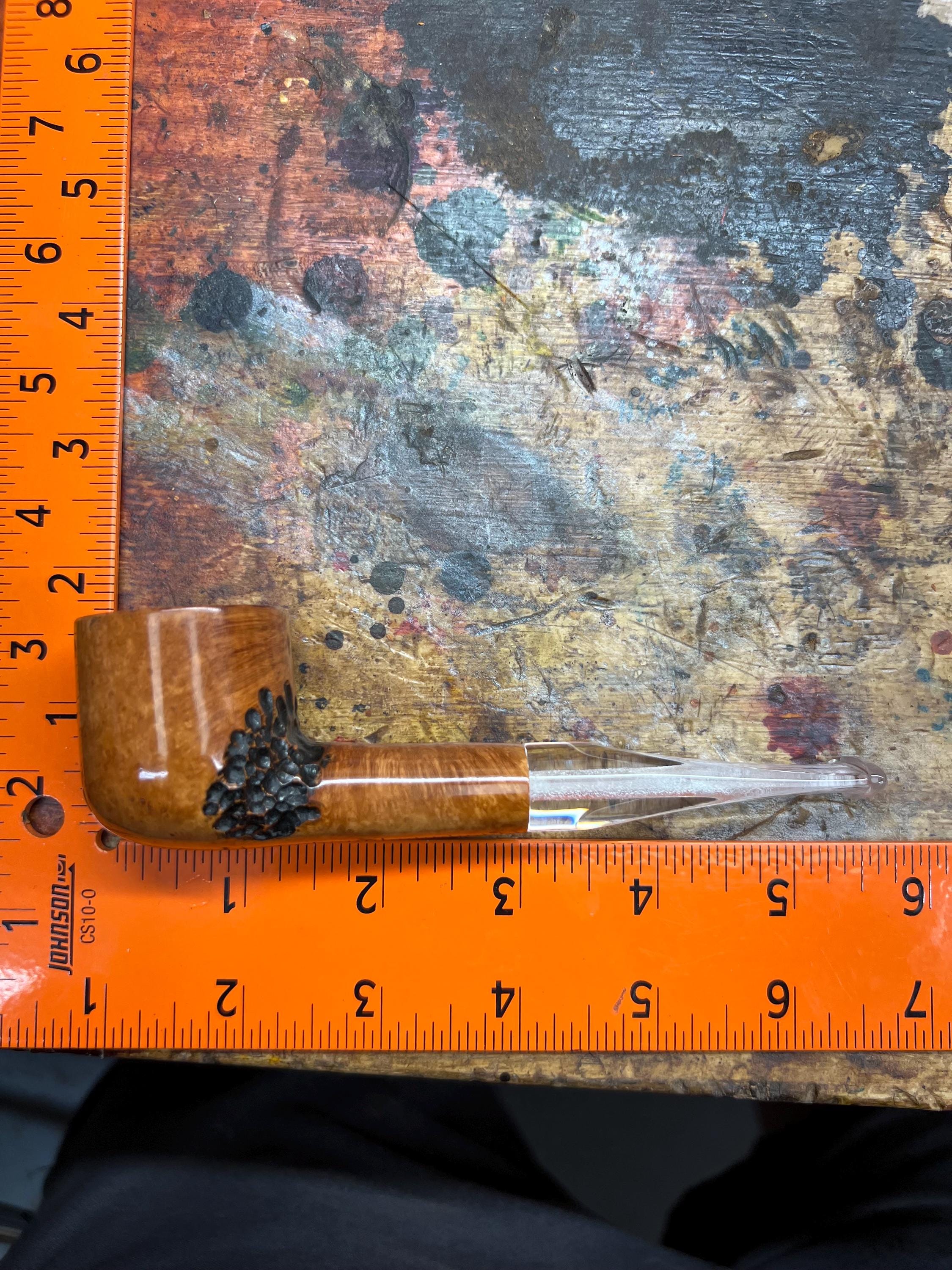 This is a handmade briar pipe that has been meticulously carved and polished/ partially rusticated . Acrylic custom made stem. Non filtered. A very nice daily smoker. Medium size pipe. A smaller version of our main sellers