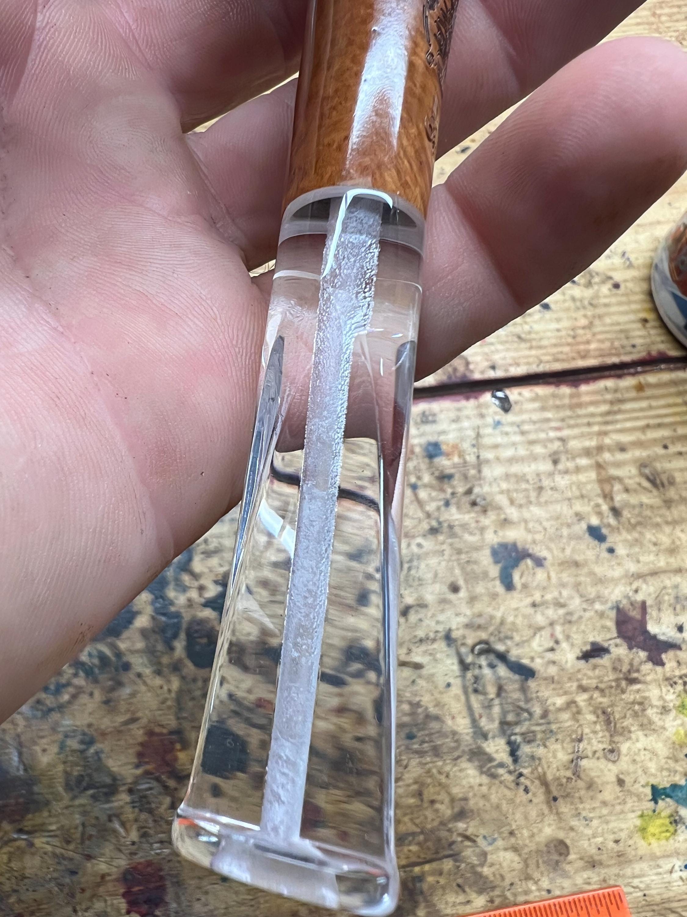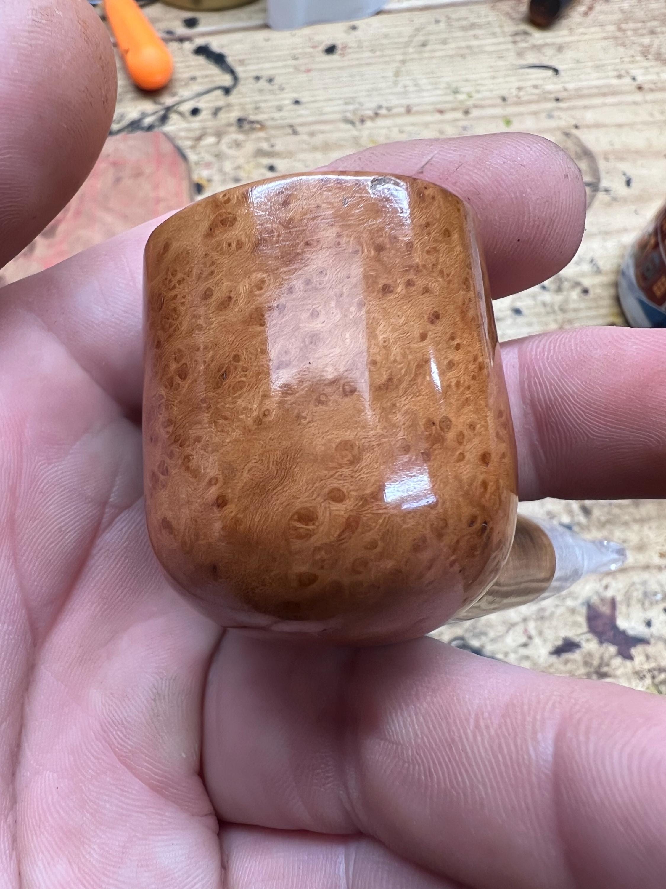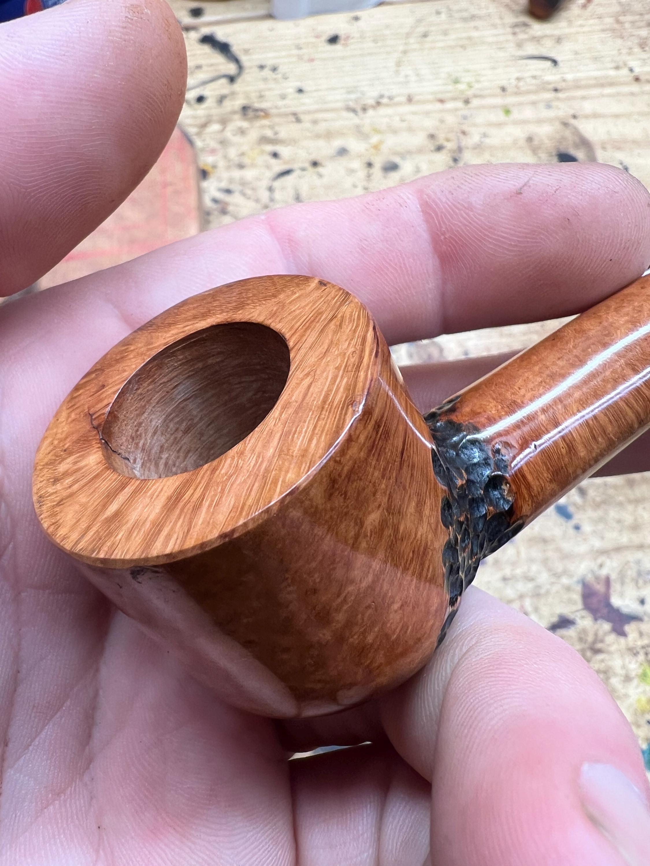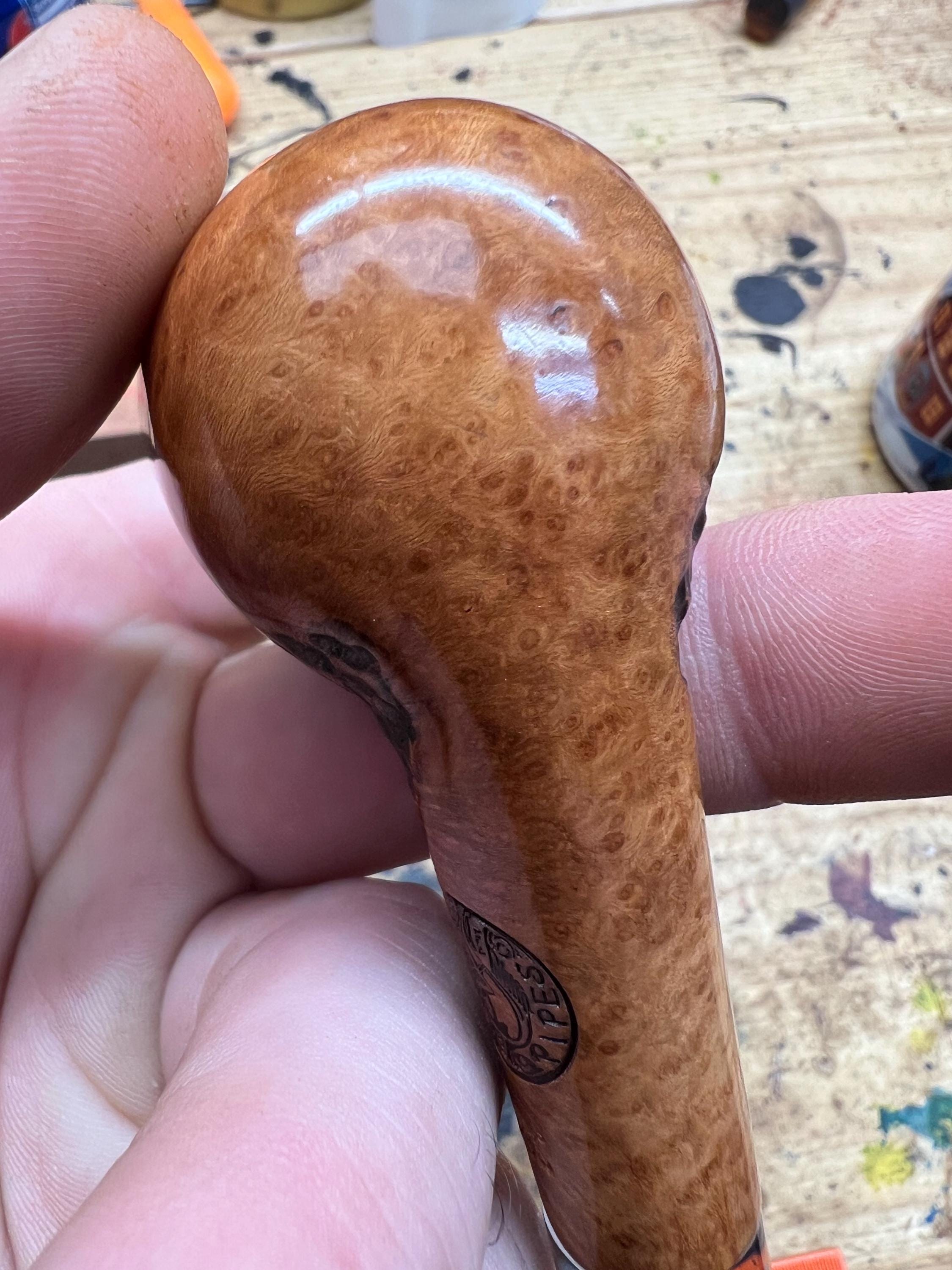 This is a handmade briar pipe that has been meticulously carved and polished/ partially rusticated . Acrylic custom made stem. Non filtered. A very nice daily smoker. Medium size pipe. A smaller version of our main sellers