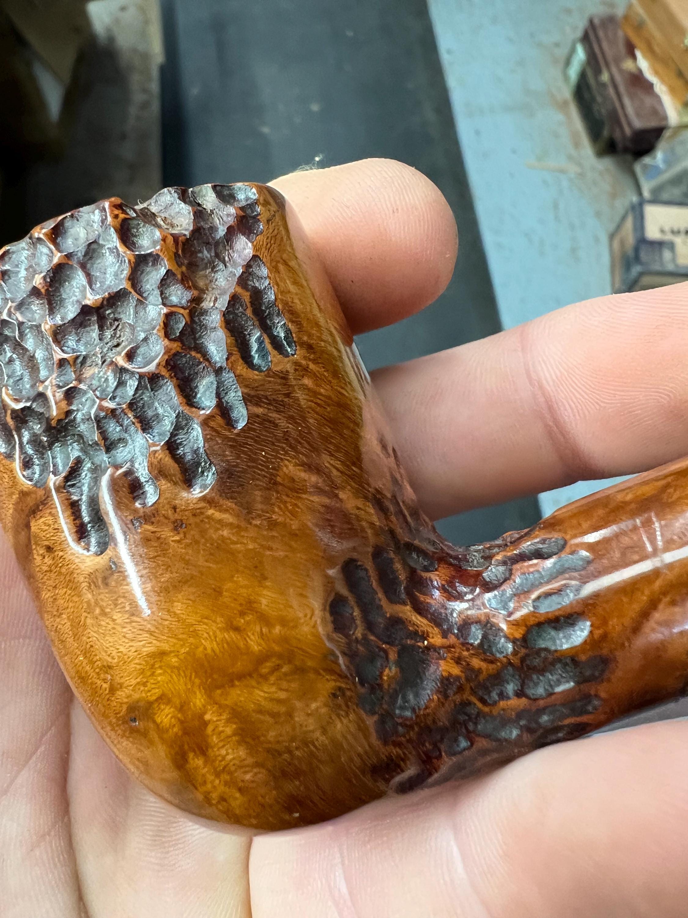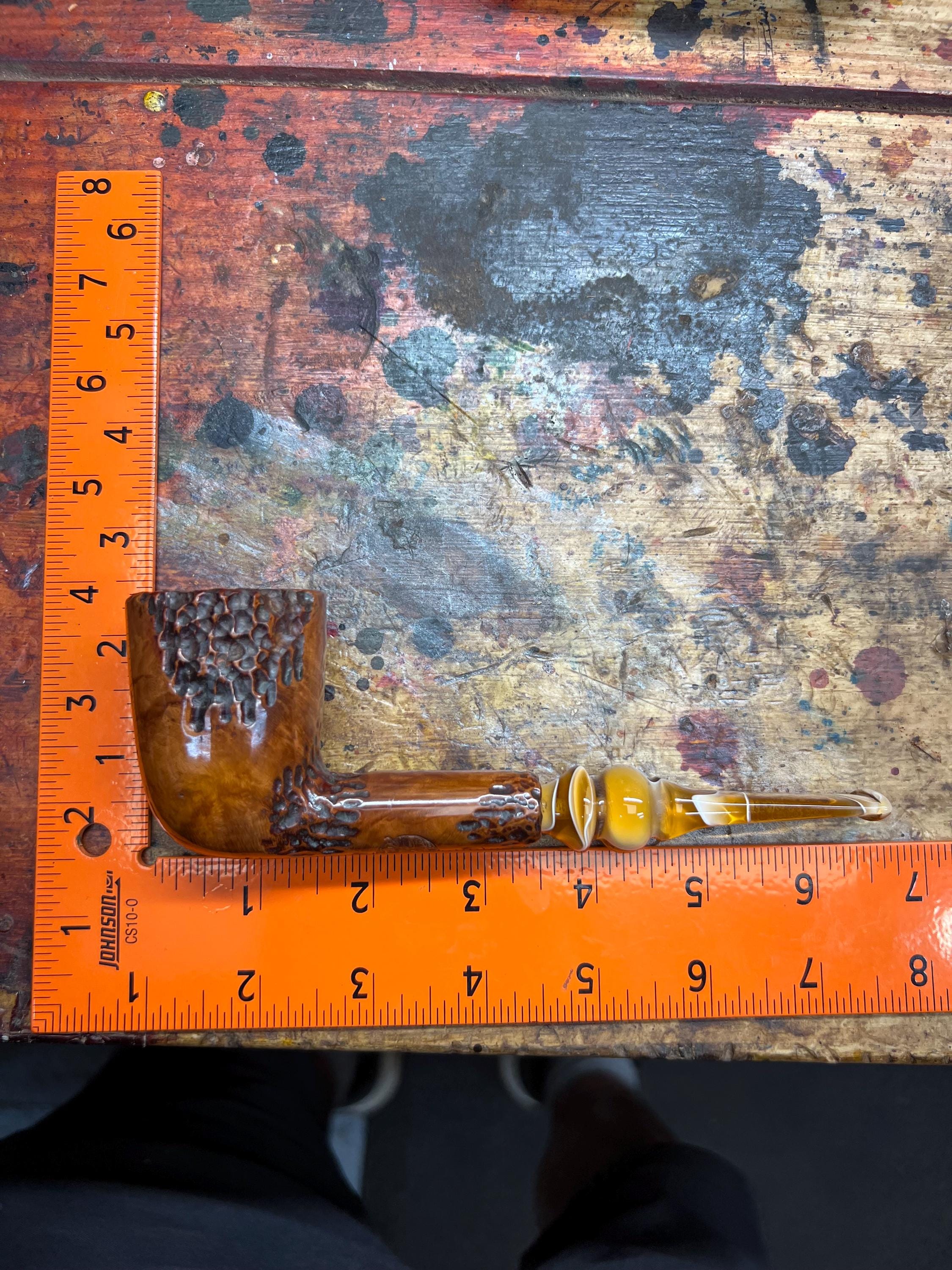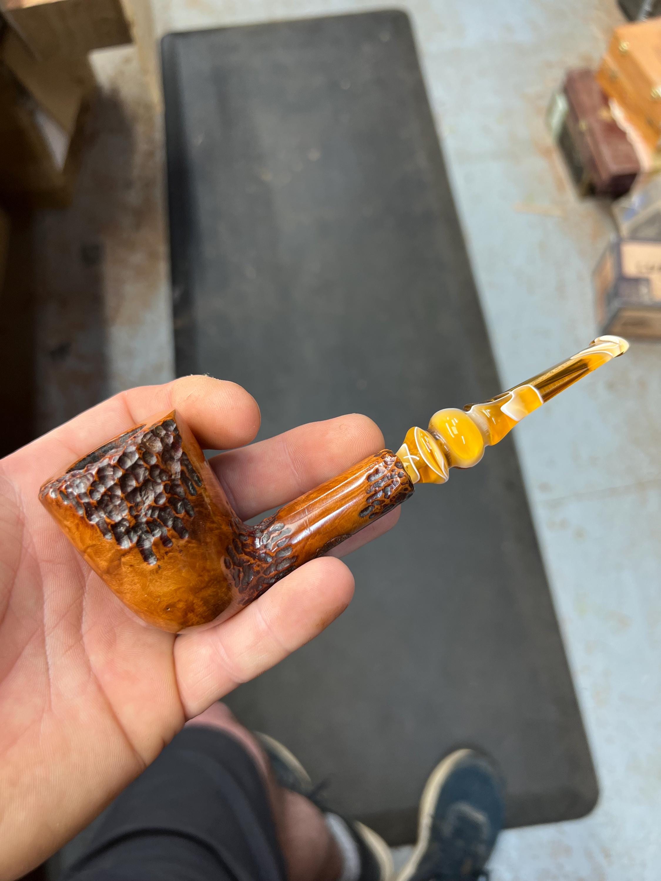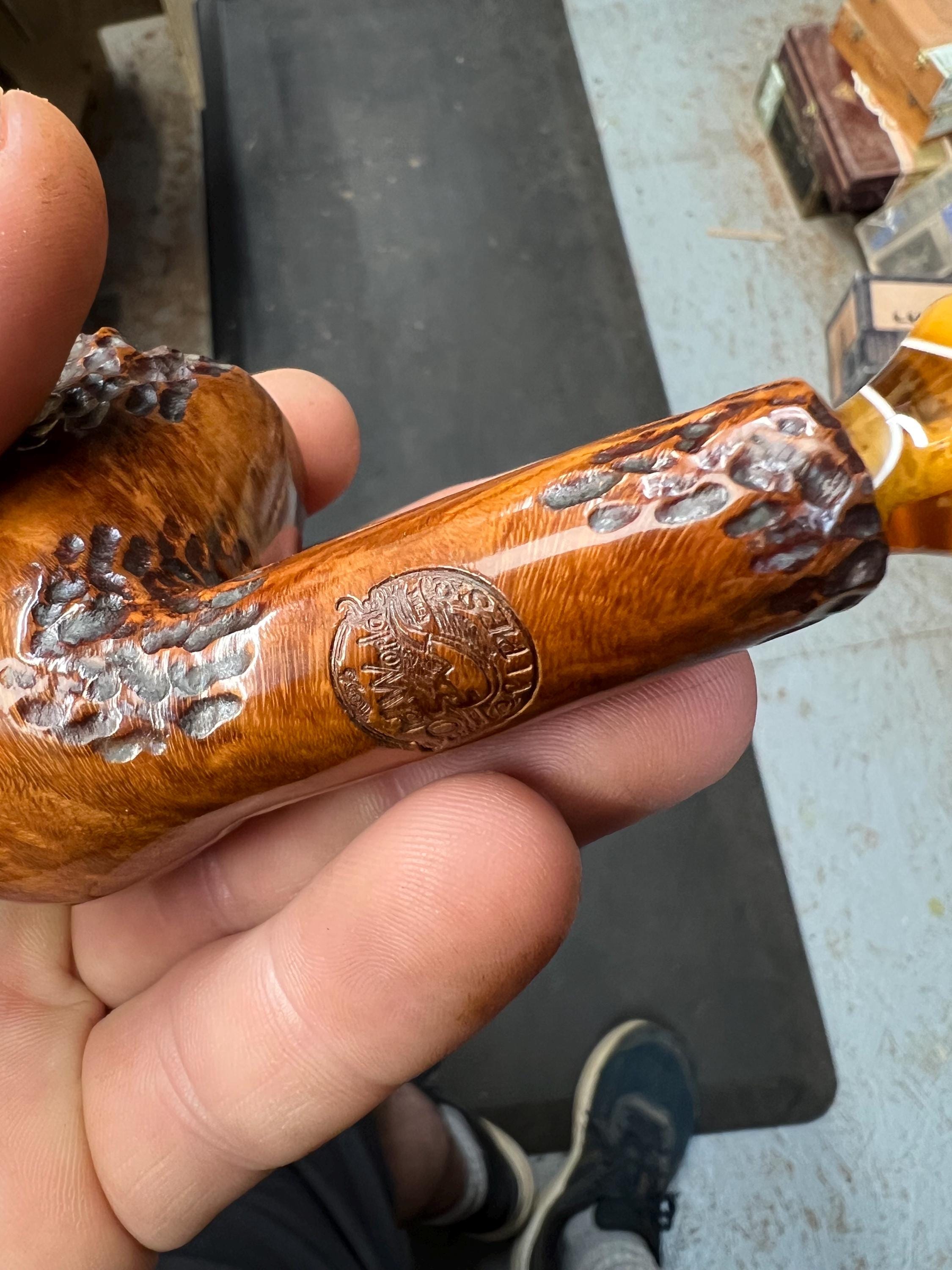 This is a handmade briar pipe that has been meticulously carved and polished/ partially rusticated . Acrylic custom made stem. Non filtered. A very nice daily smoker.