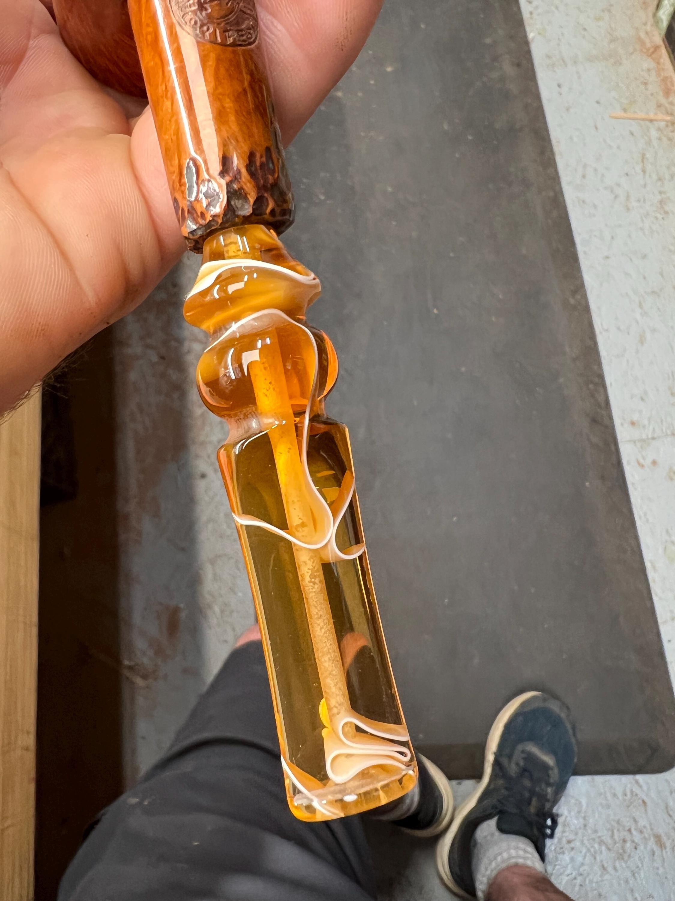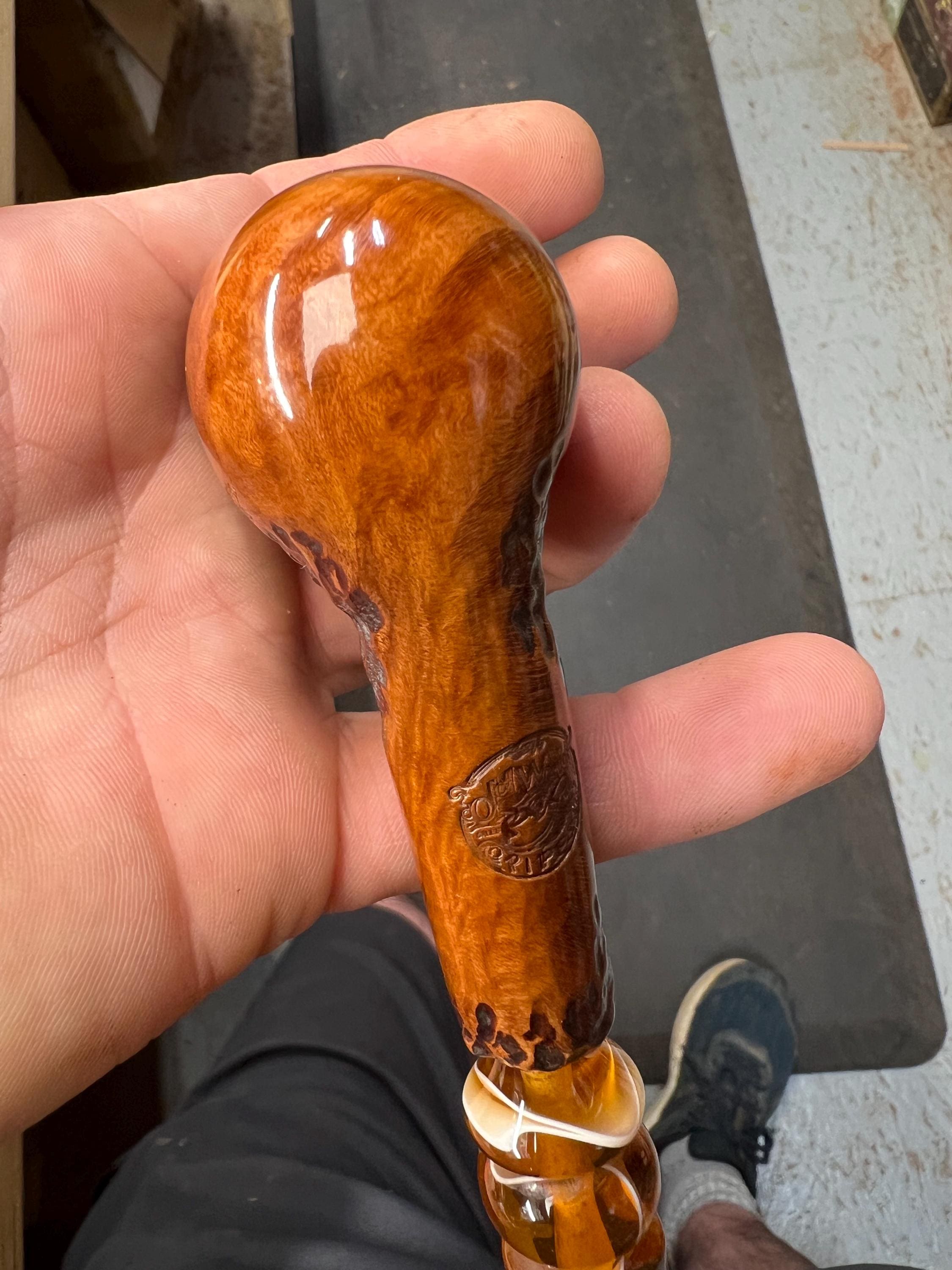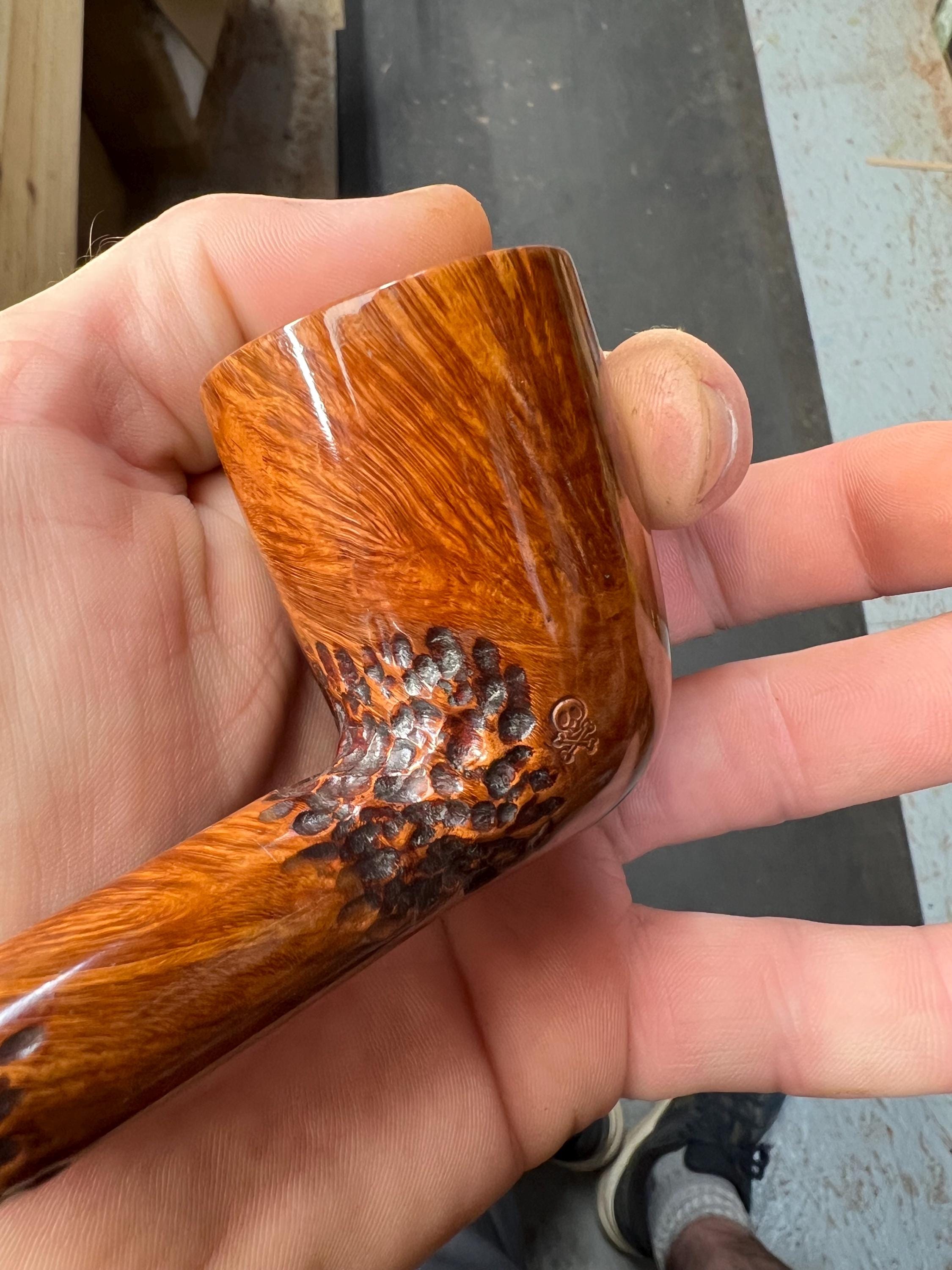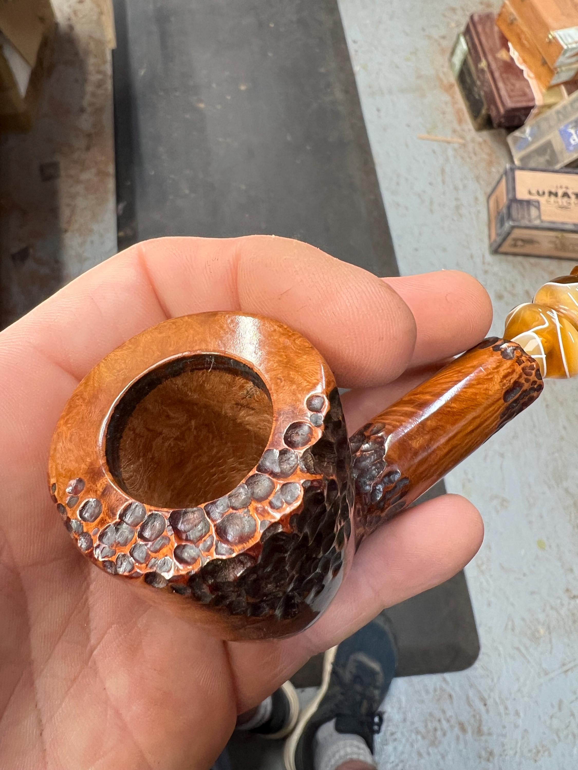 This is a handmade briar pipe that has been meticulously carved and polished/ partially rusticated . Acrylic custom made stem. Non filtered. A very nice daily smoker.