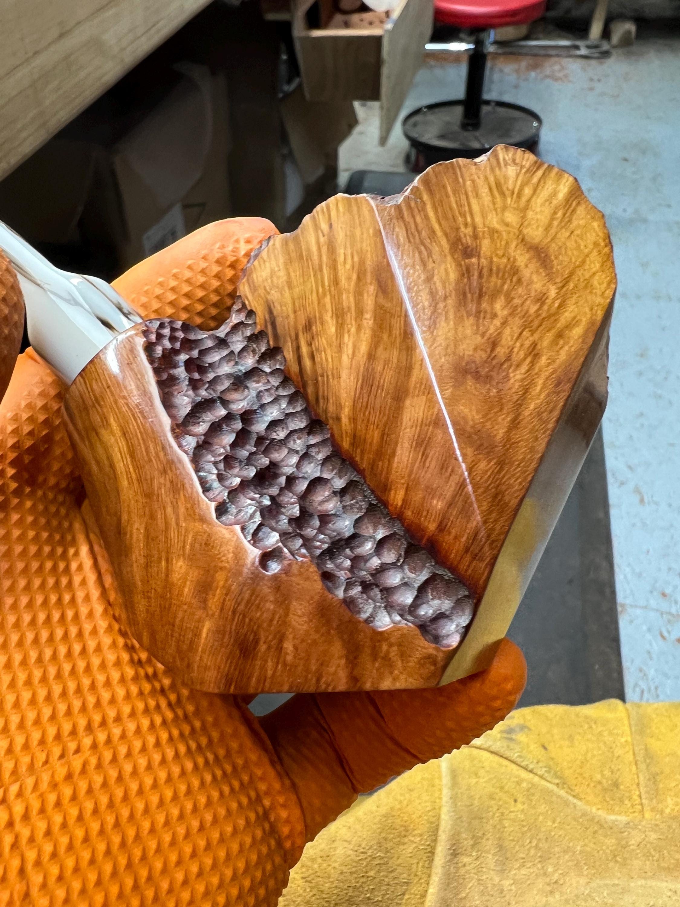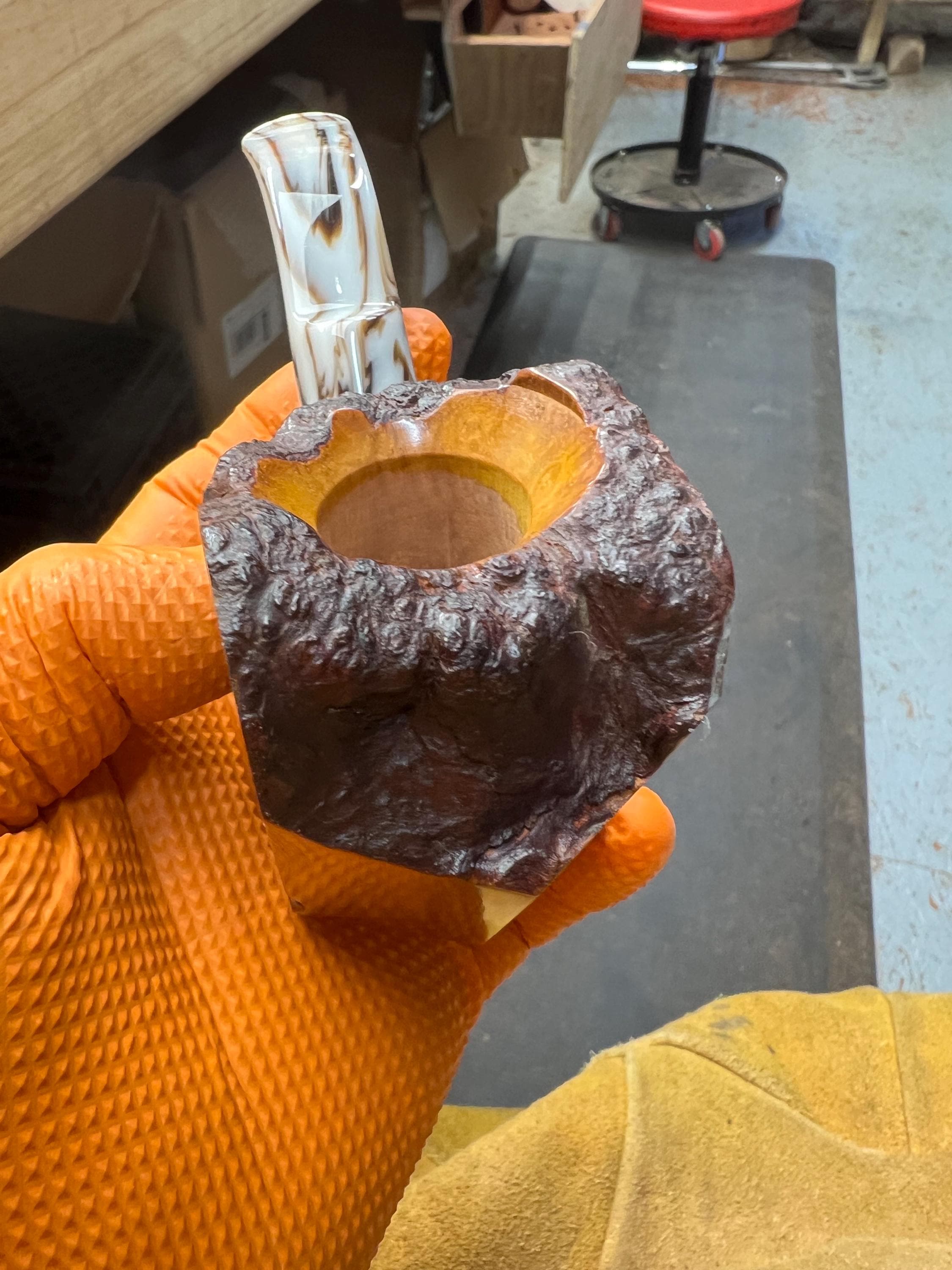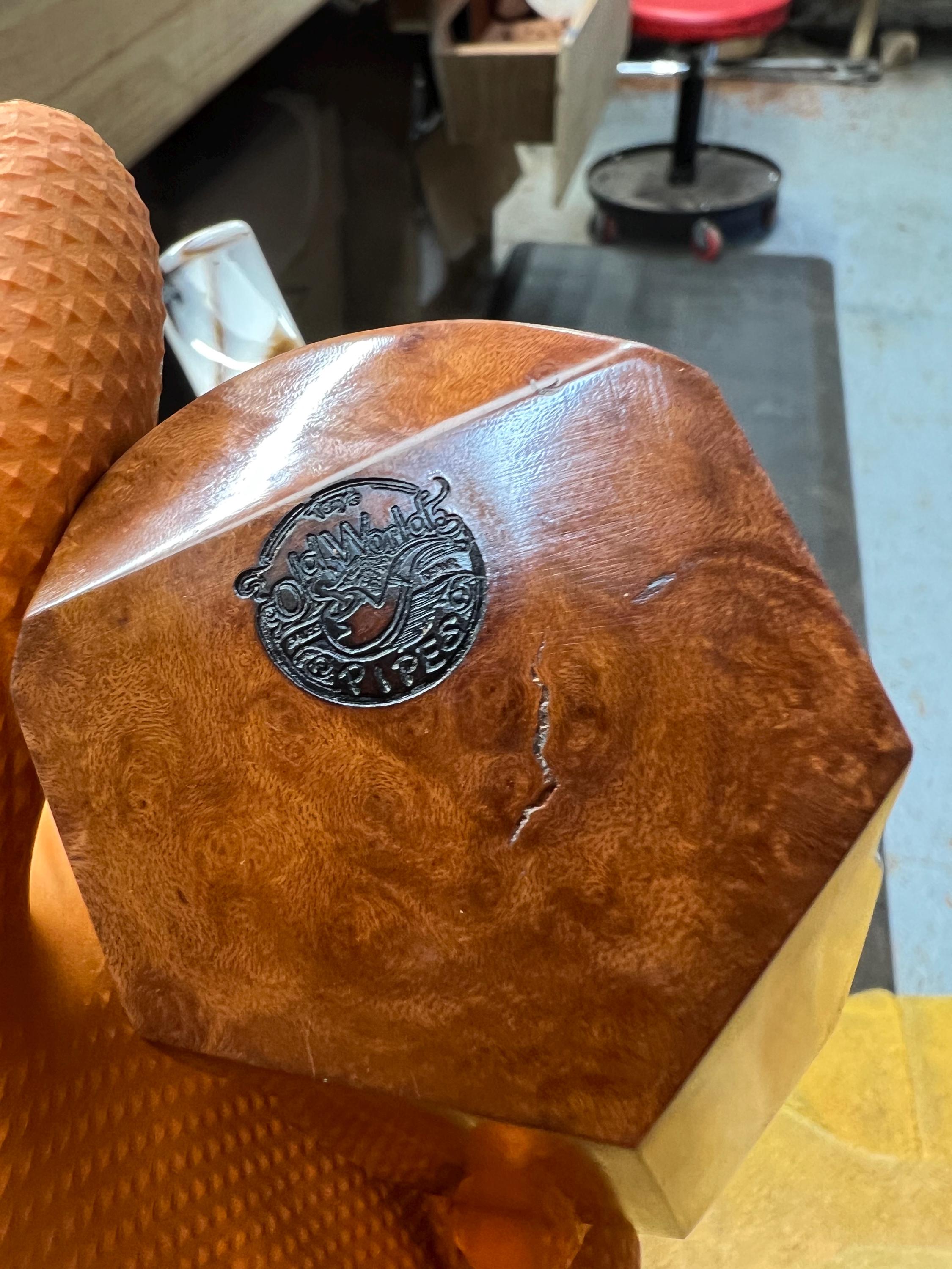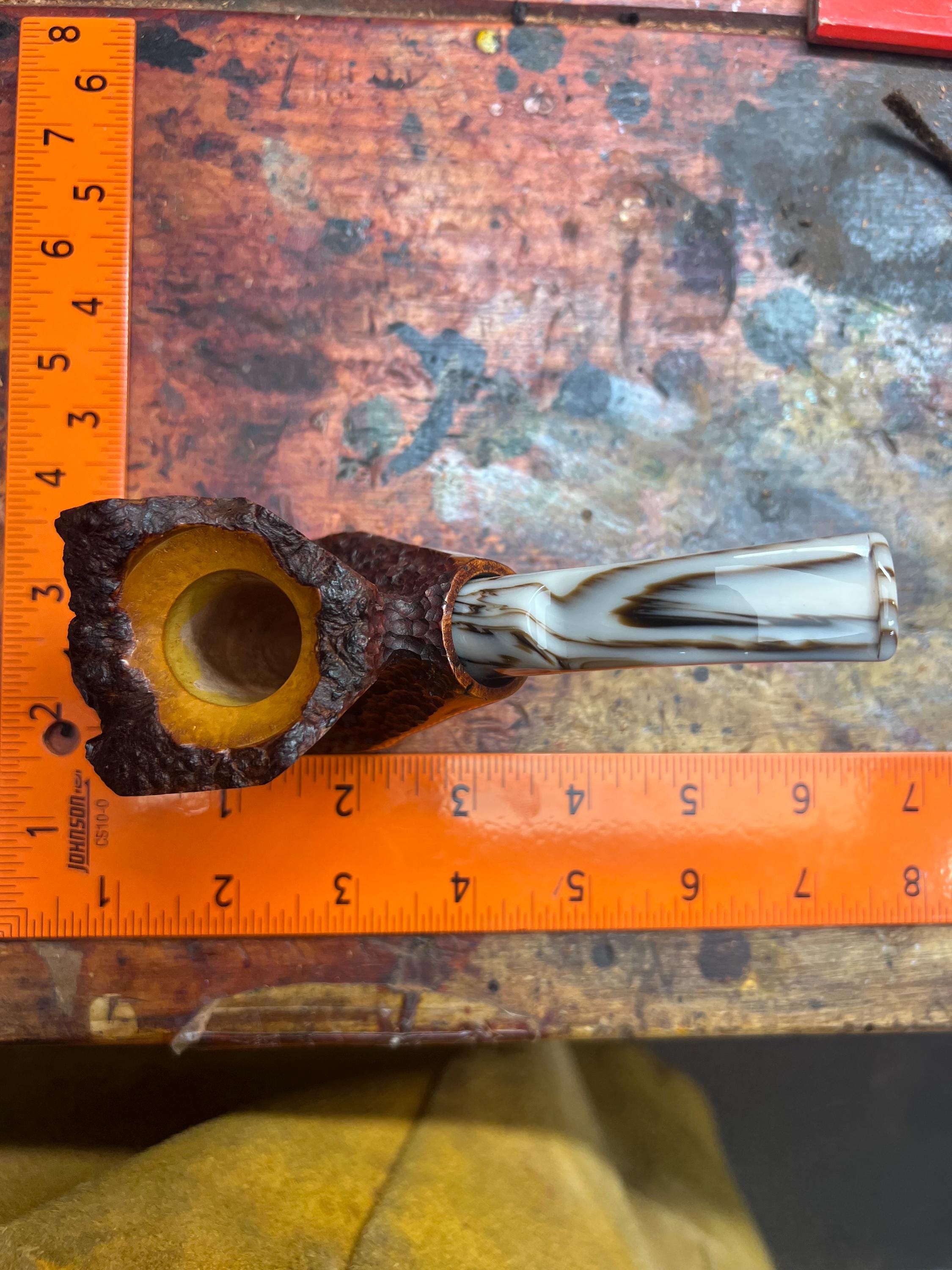 This is a handmade briar pipe that has been freehand carved and polished. A nice custom acrylic stem that’s slightly bent. These are built to be beautiful but also for every day smoking. This one is a medium to large pipe. 7/8 x1.5 deep bowl. Grecian briar