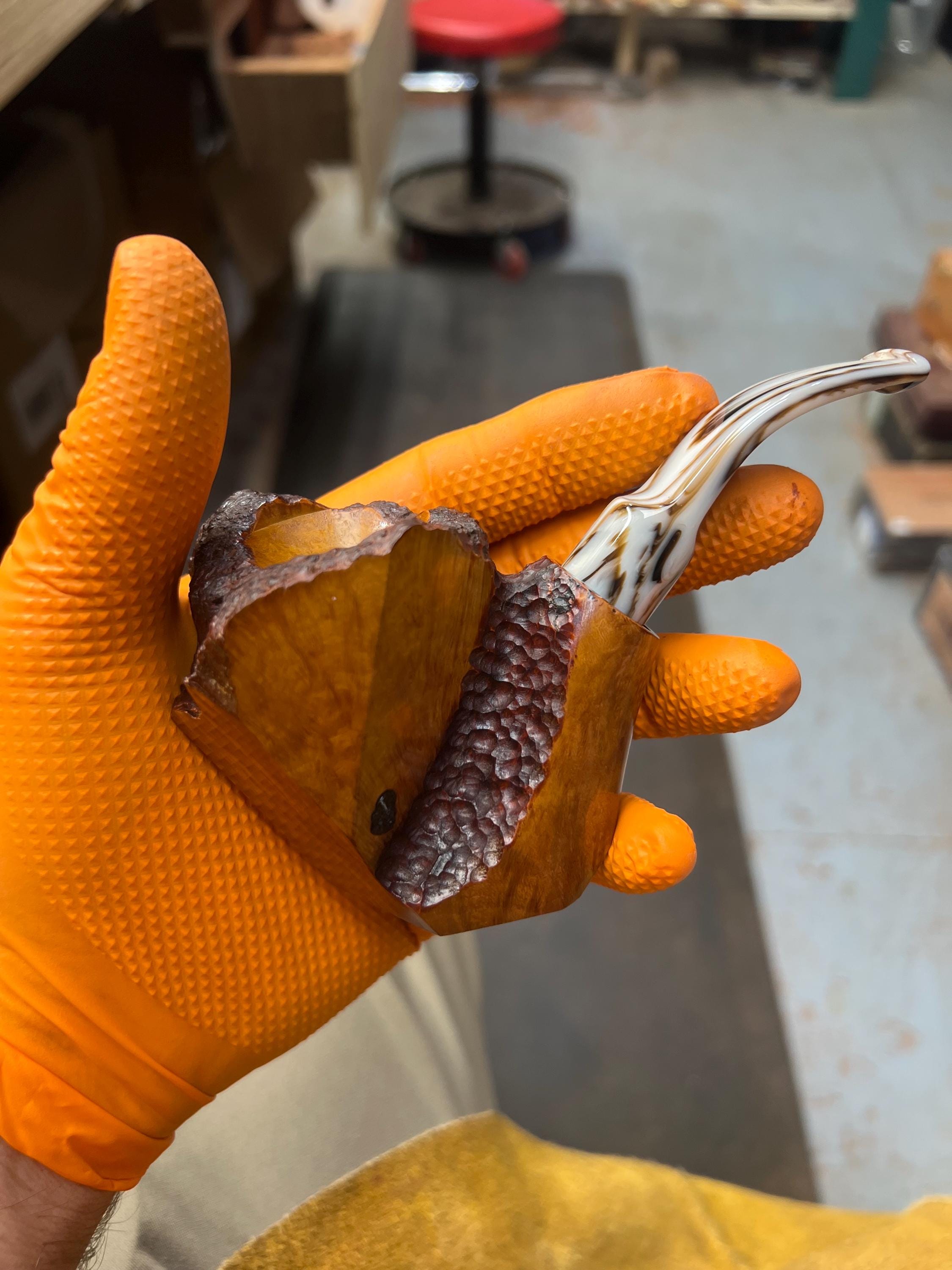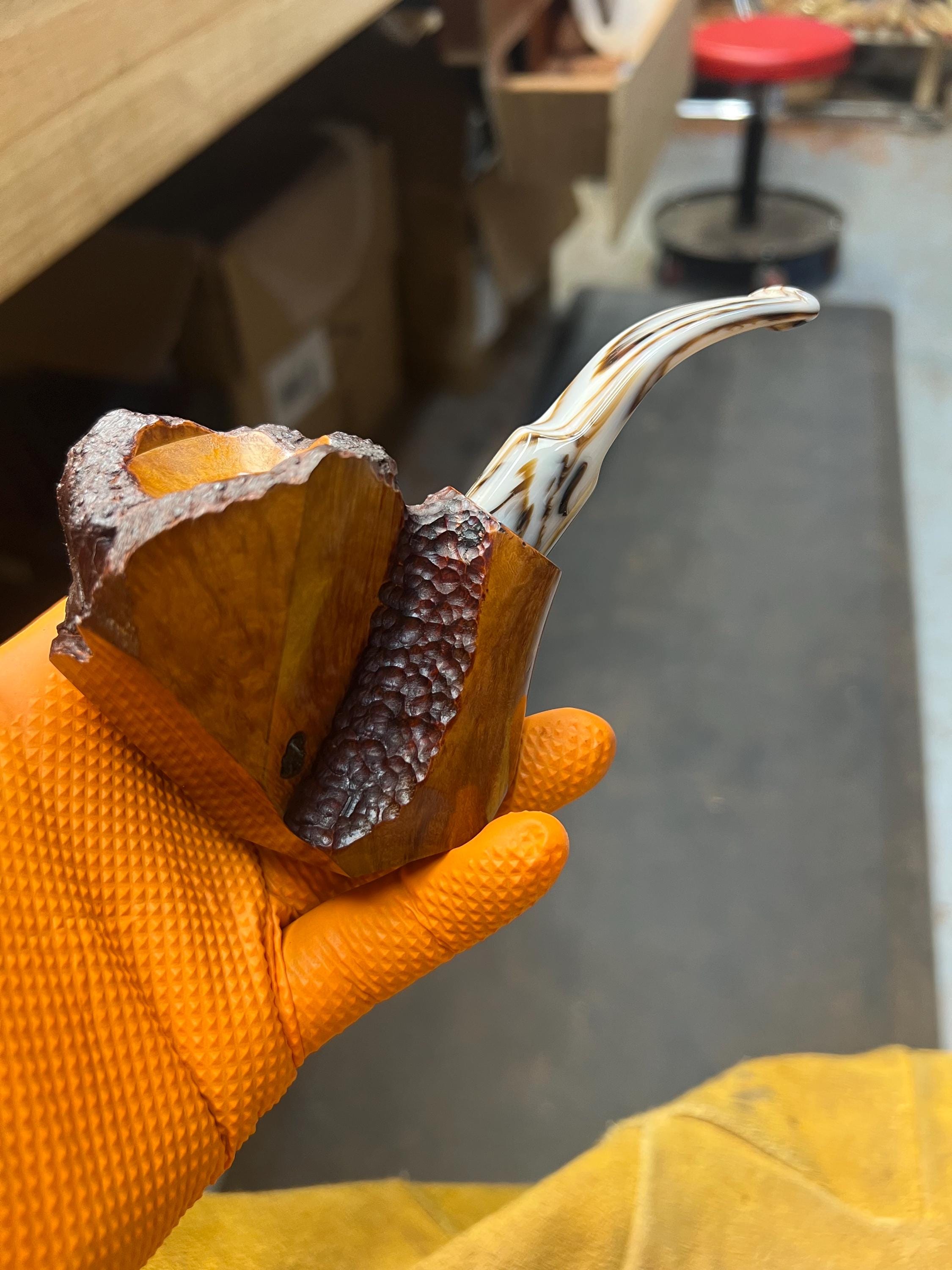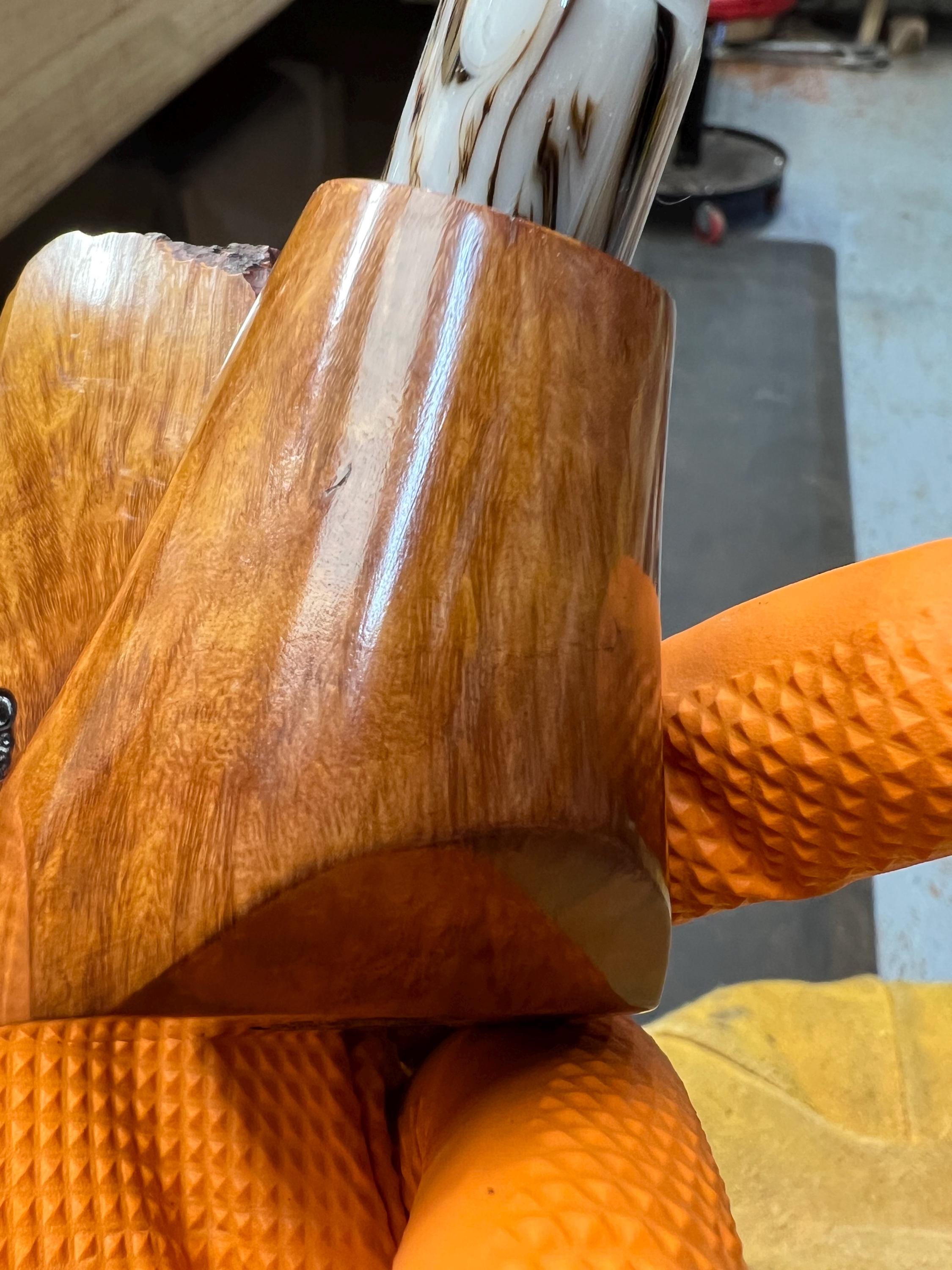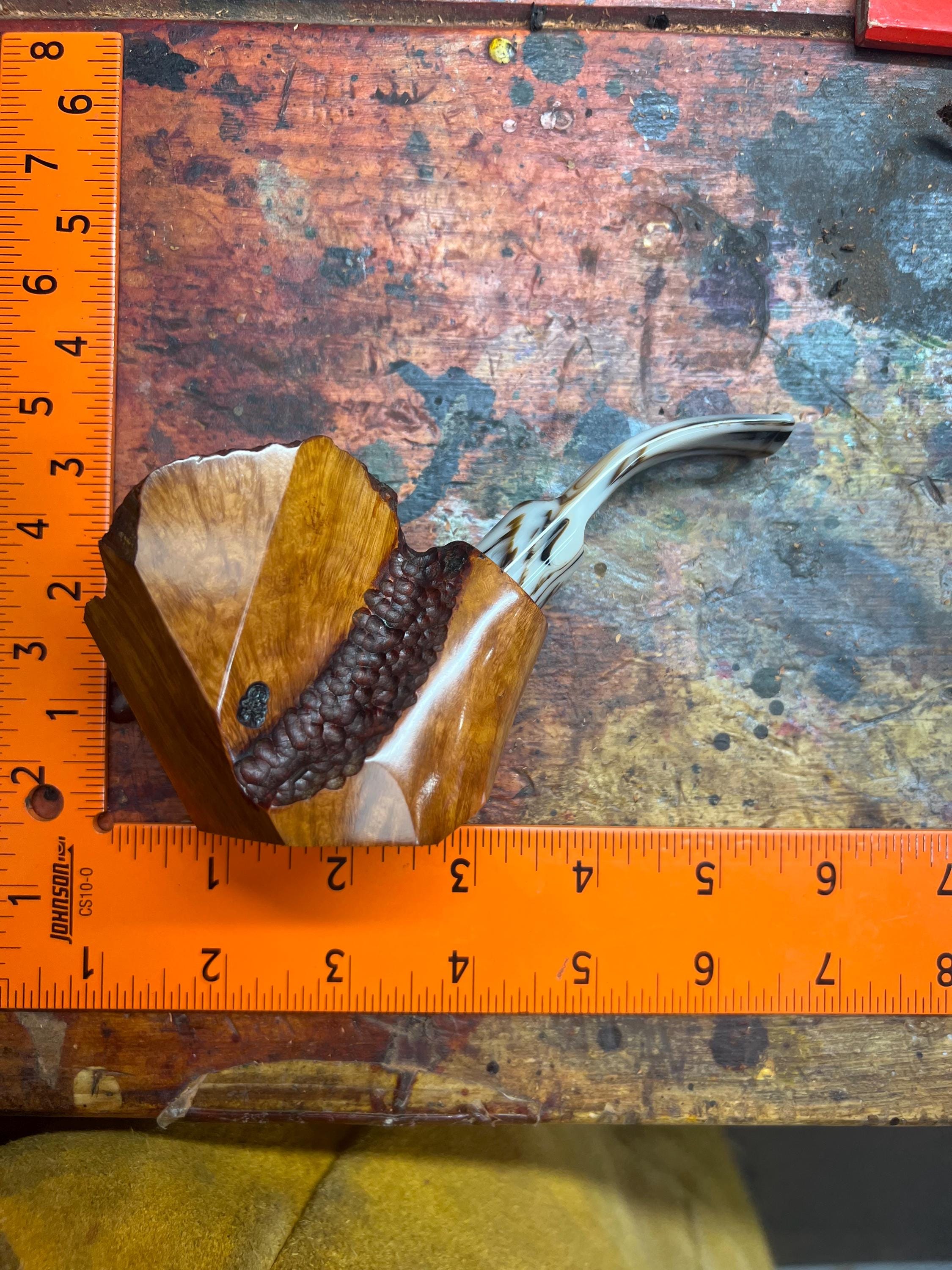 This is a handmade briar pipe that has been freehand carved and polished. A nice custom acrylic stem that’s slightly bent. These are built to be beautiful but also for every day smoking. This one is a medium to large pipe. 7/8 x1.5 deep bowl. Grecian briar
