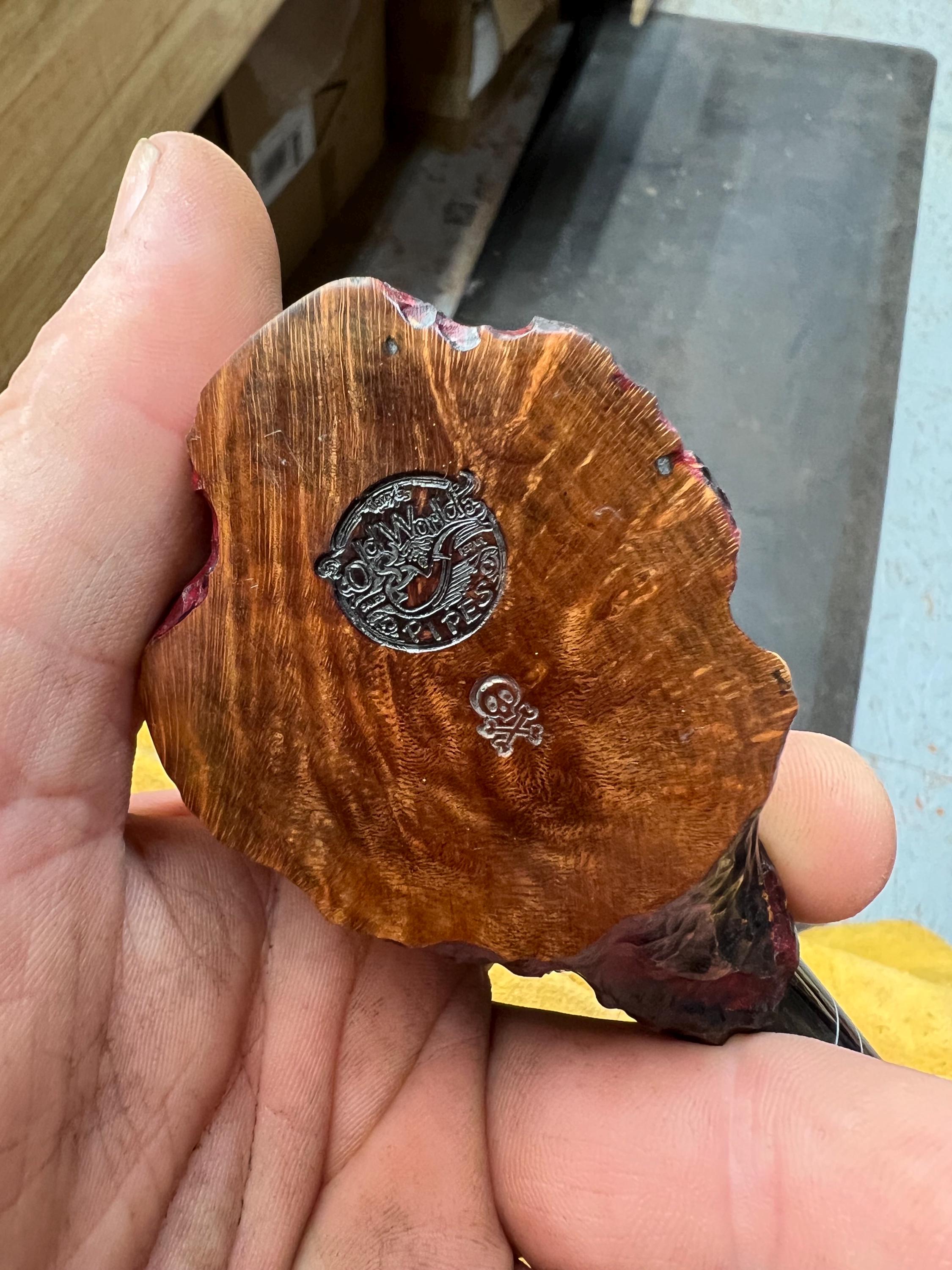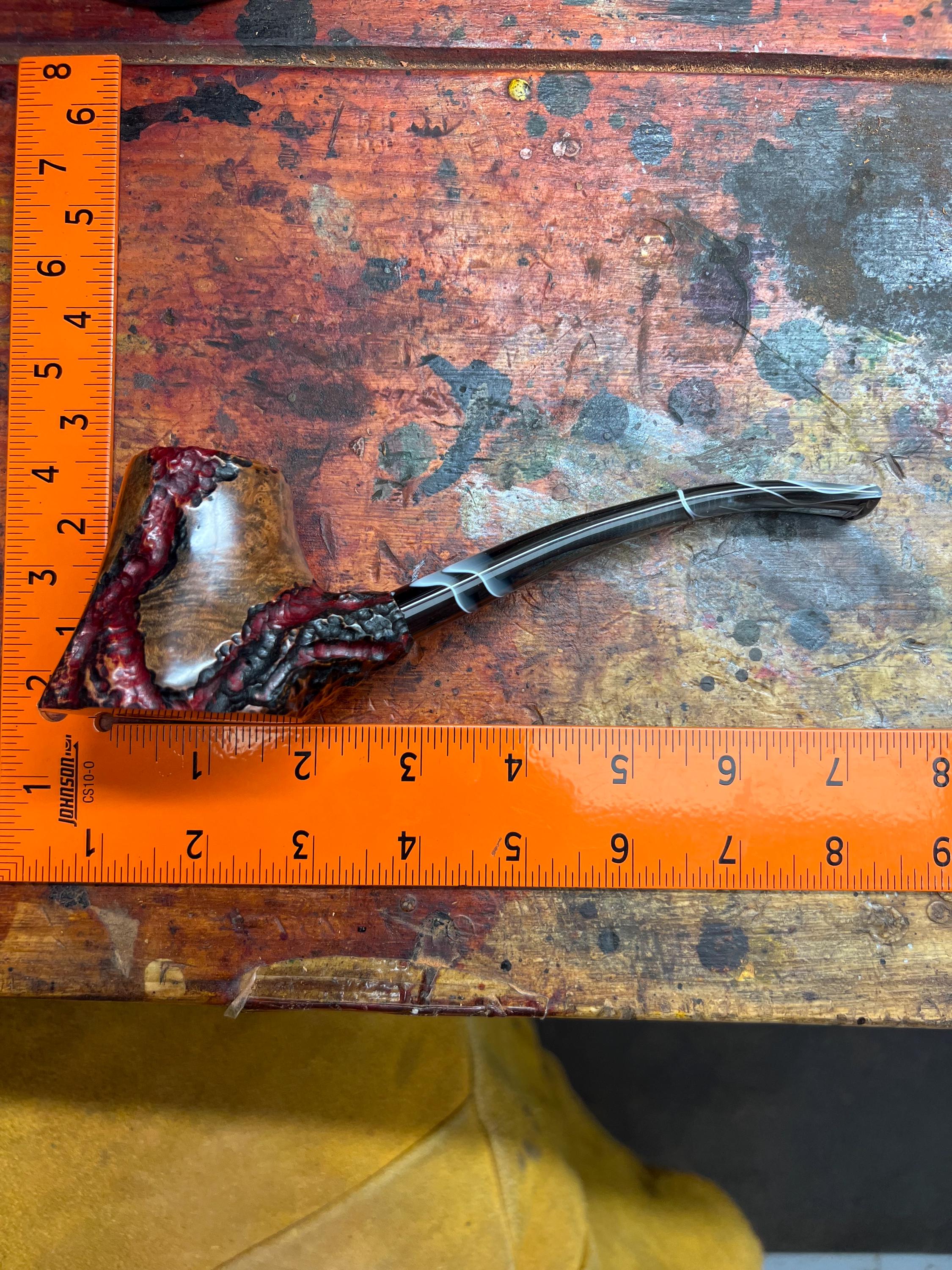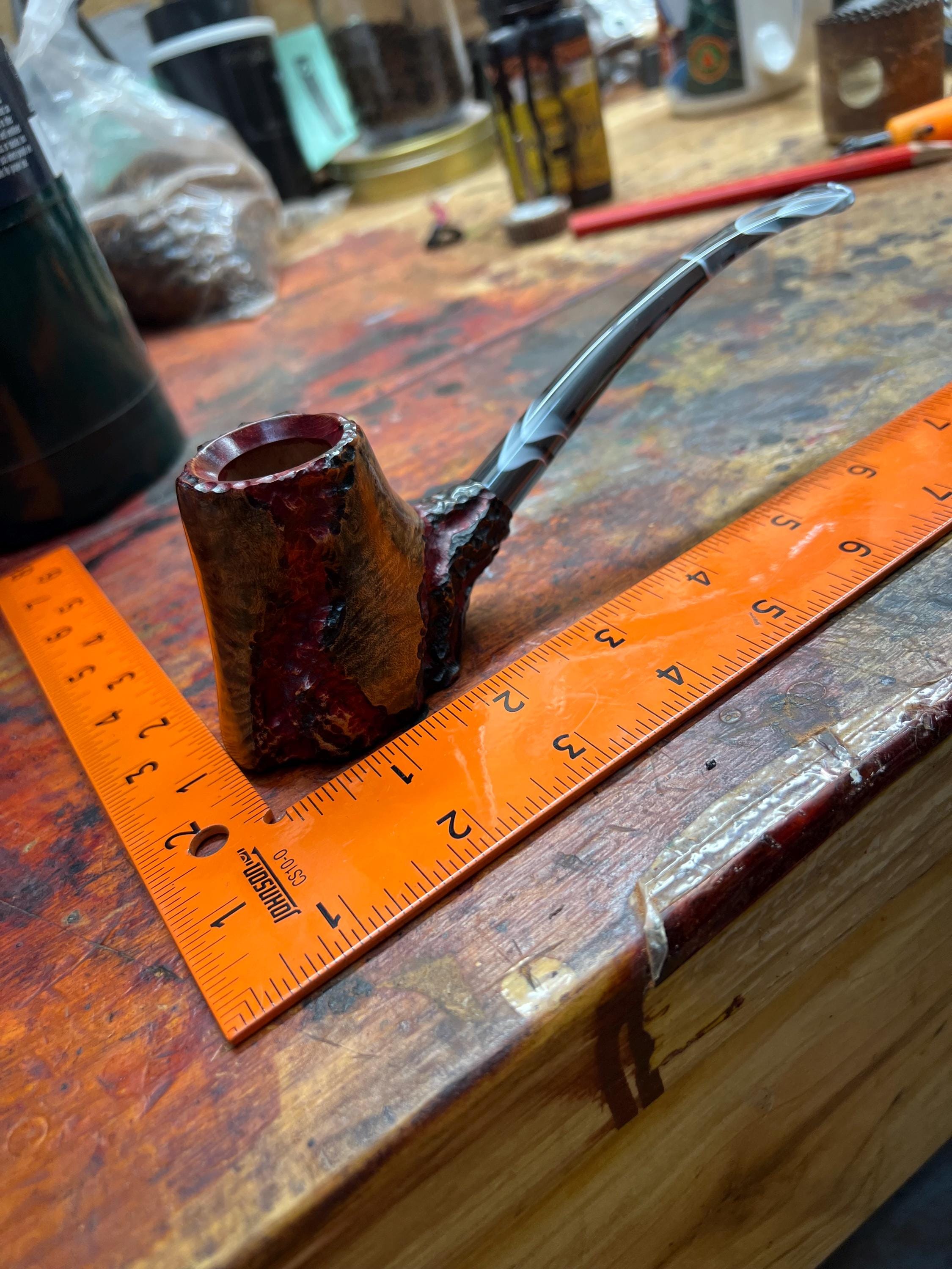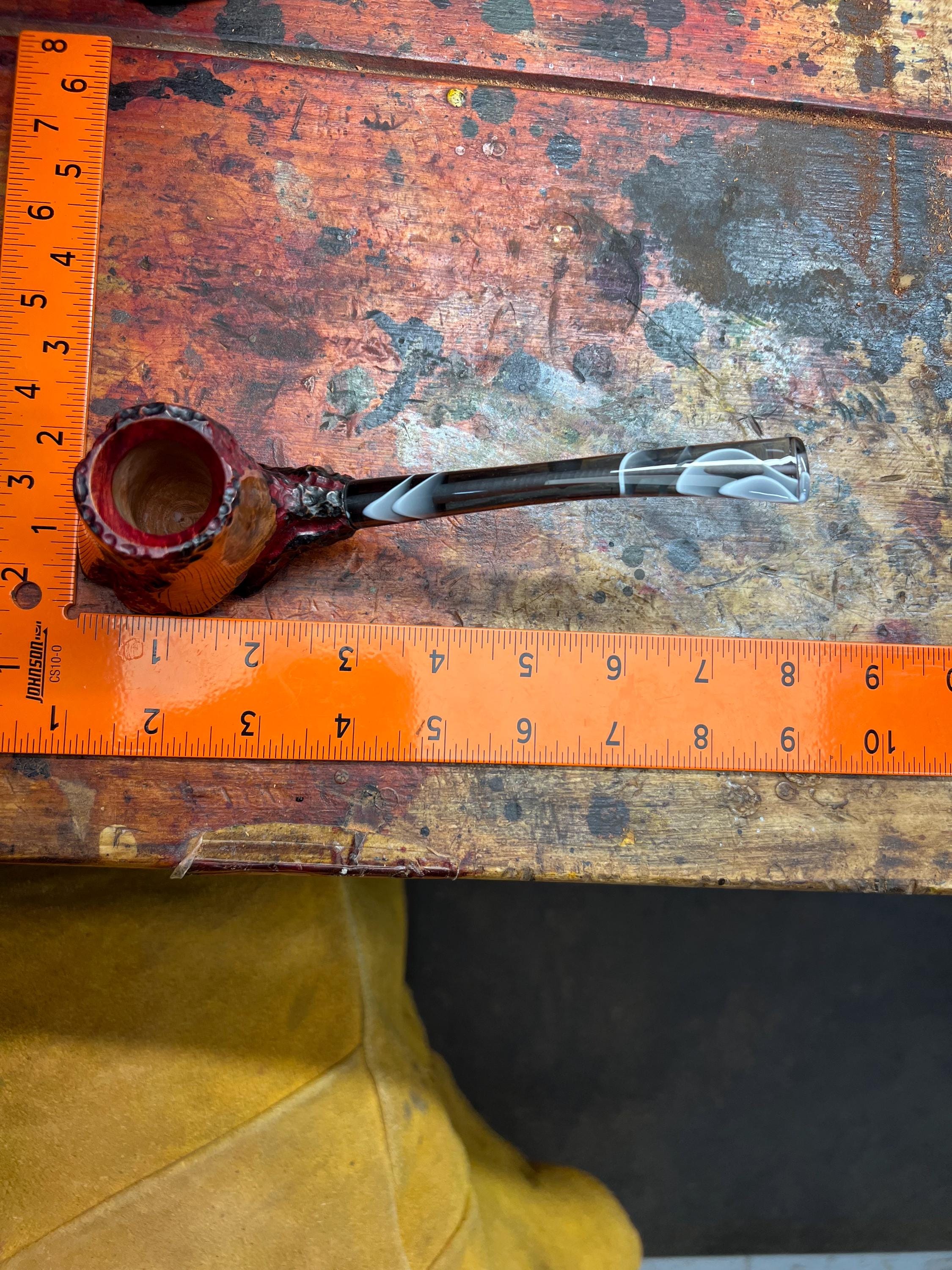 This is a handmade briar pipe that has been freehand carved and polished. A nice custom acrylic stem that’s slightly bent. These are built to be beautiful but also for every day smoking. This one is a medium to large pipe. 7/8 x1.5 deep bowl. Grecian briar