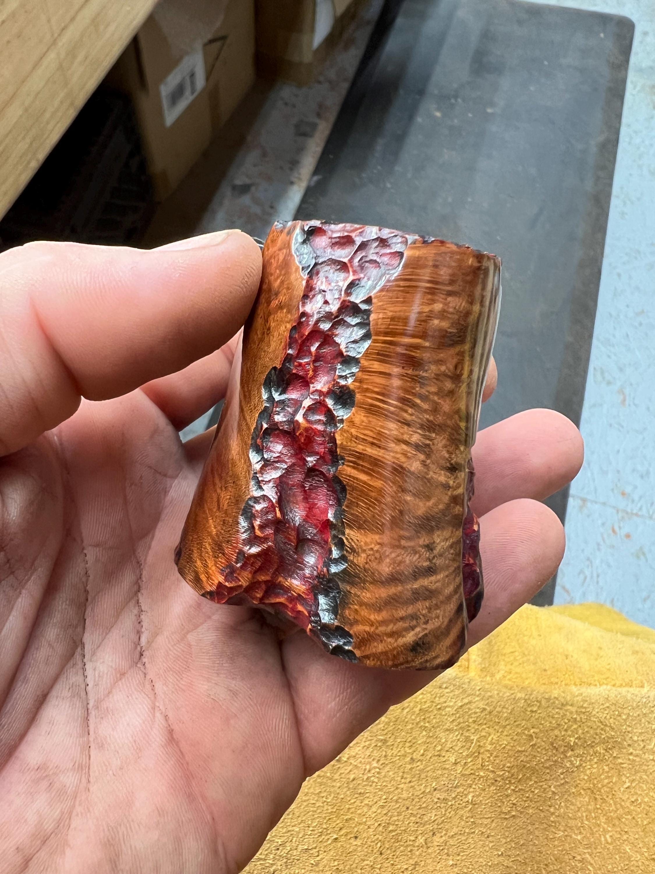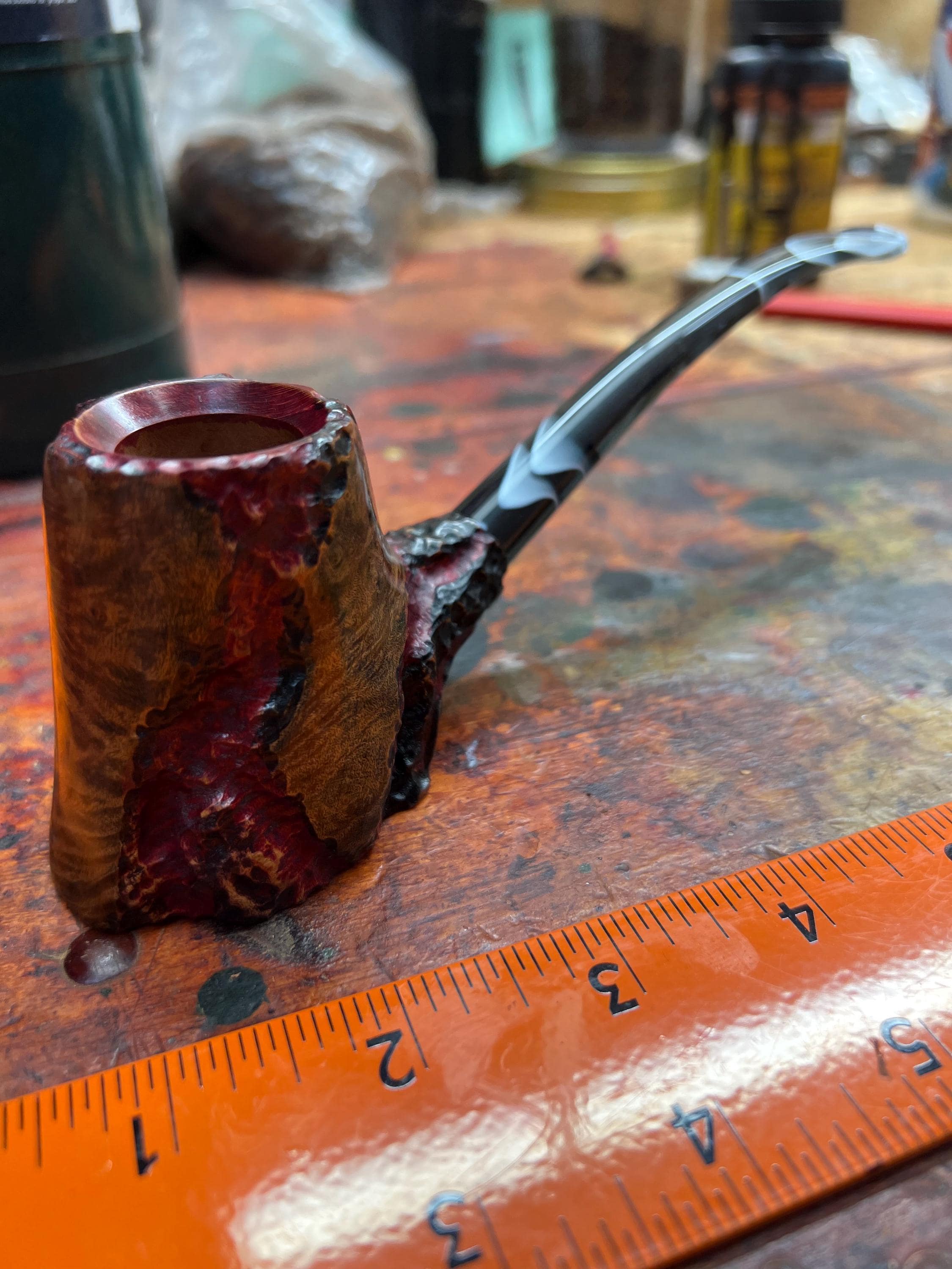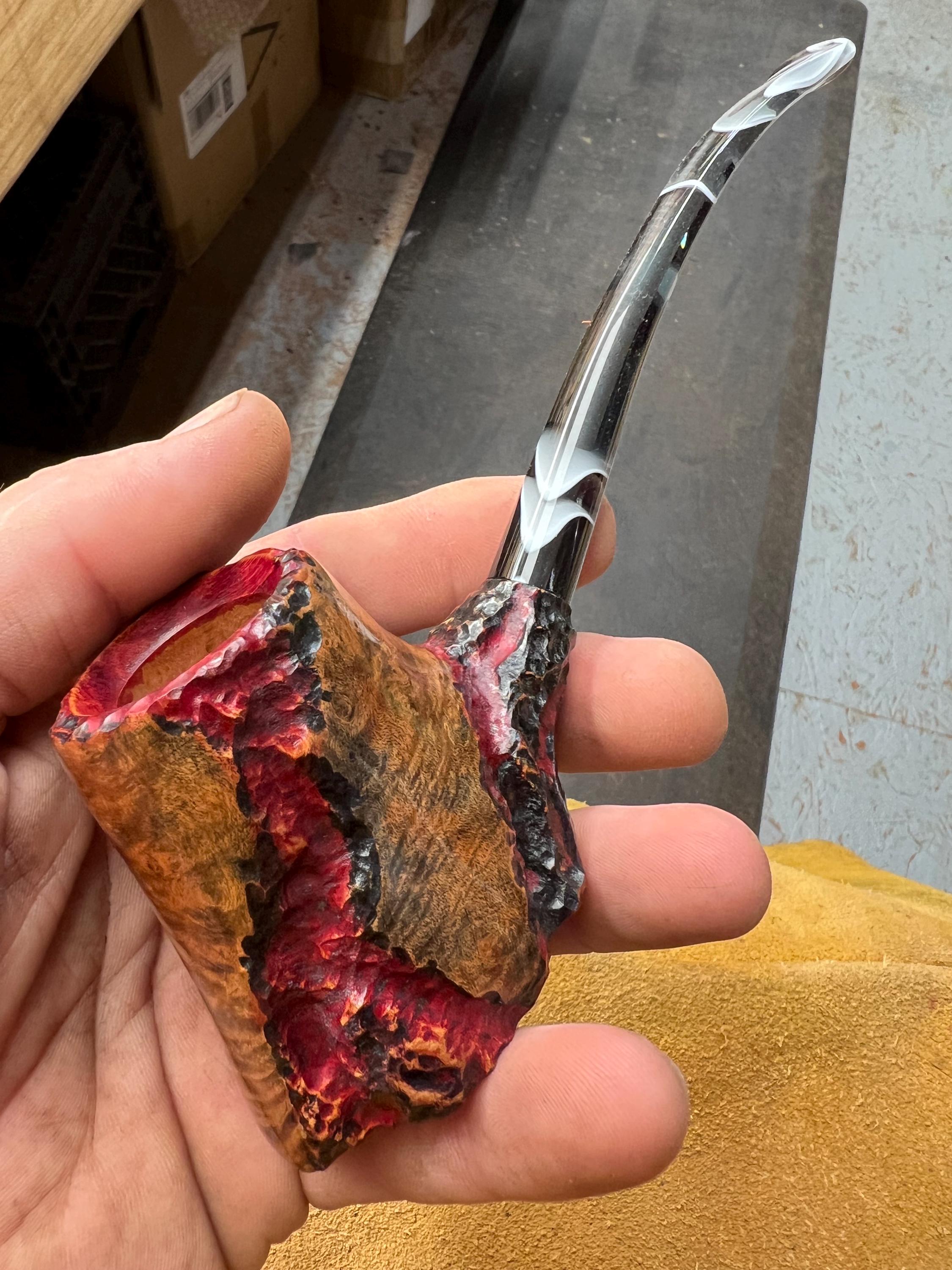This is a handmade briar pipe that has been freehand carved and polished. A nice custom acrylic stem that’s slightly bent. These are built to be beautiful but also for every day smoking. This one is a medium to large pipe. 7/8 x1.5 deep bowl. Grecian briar
