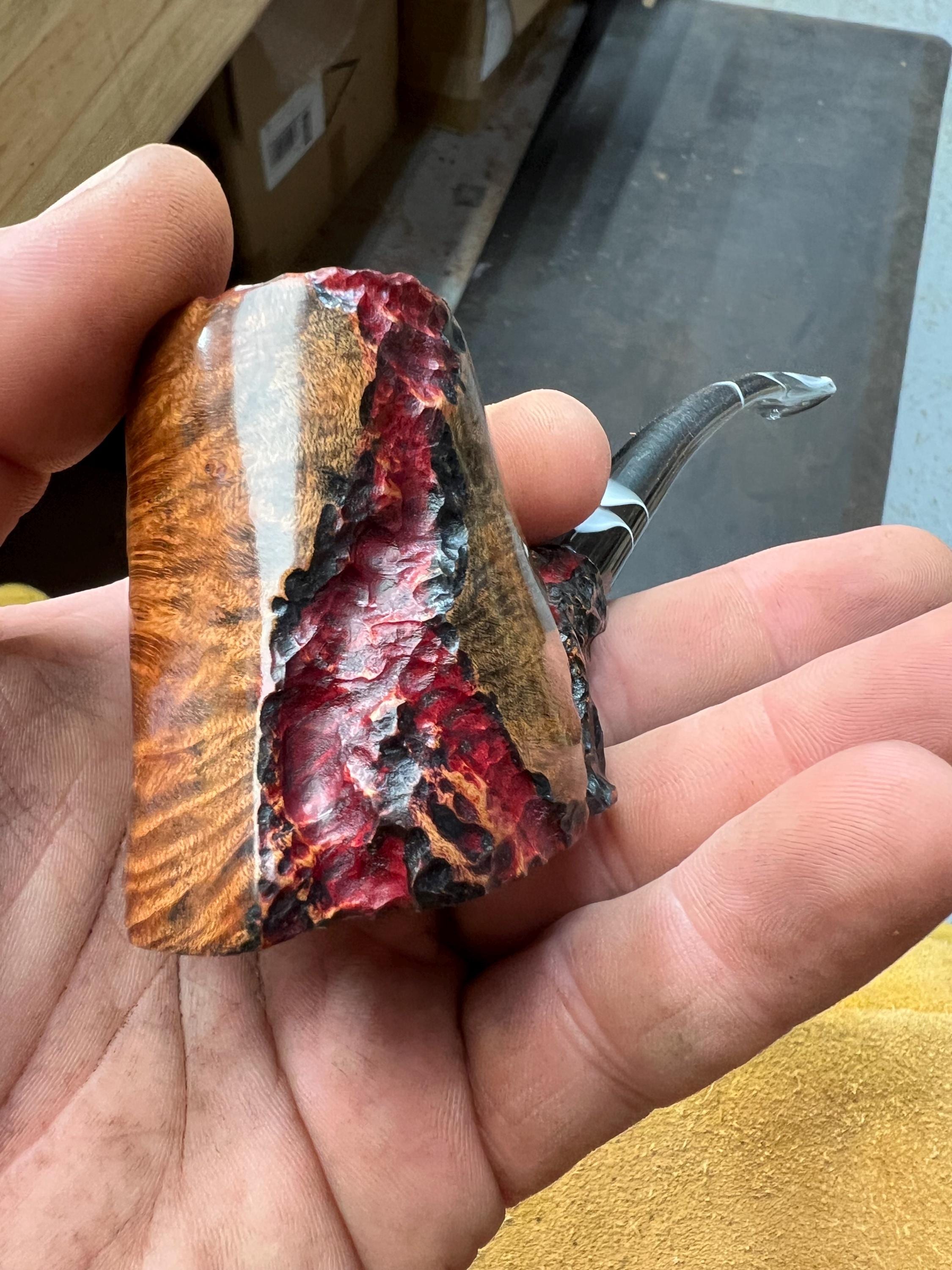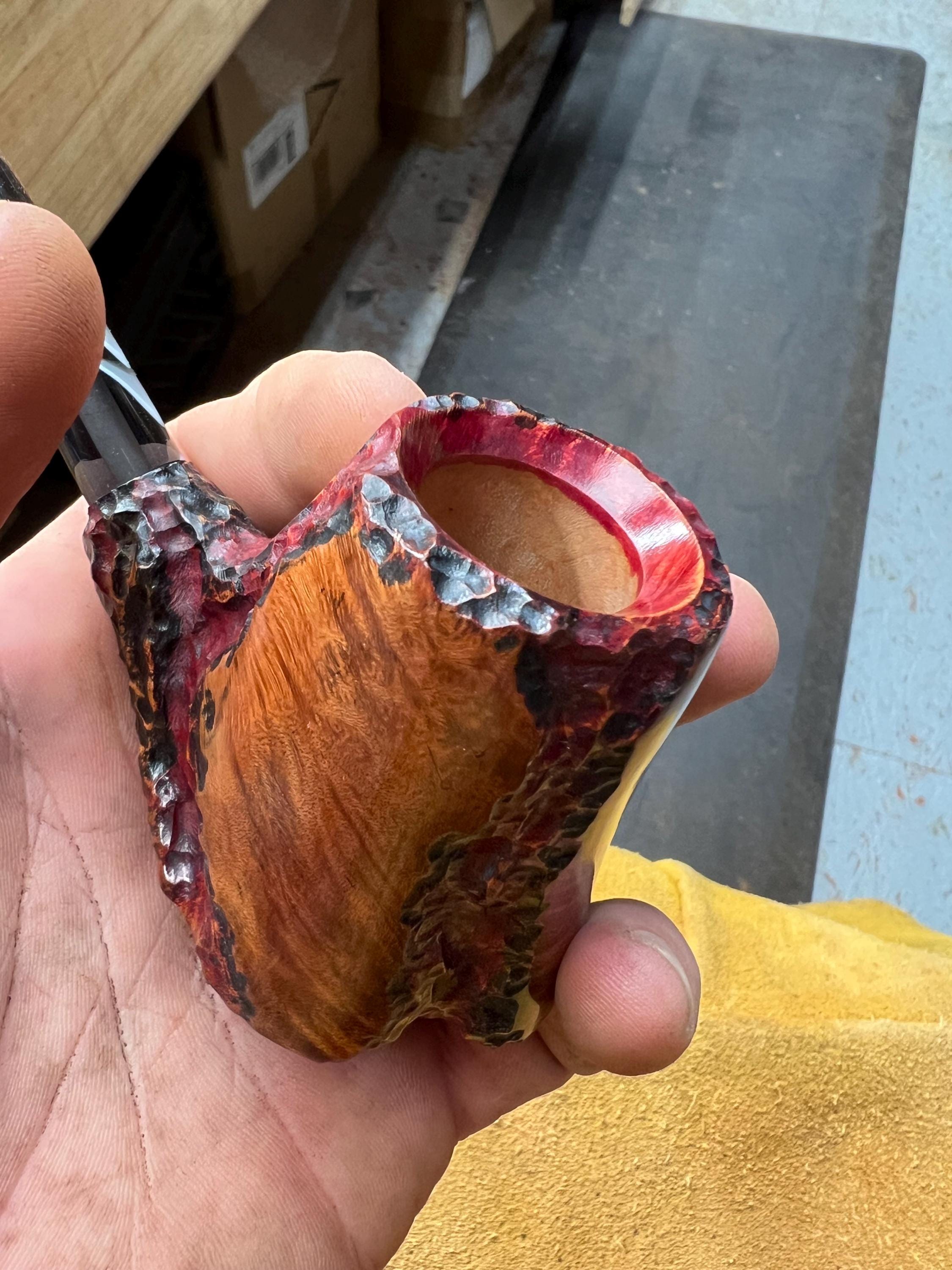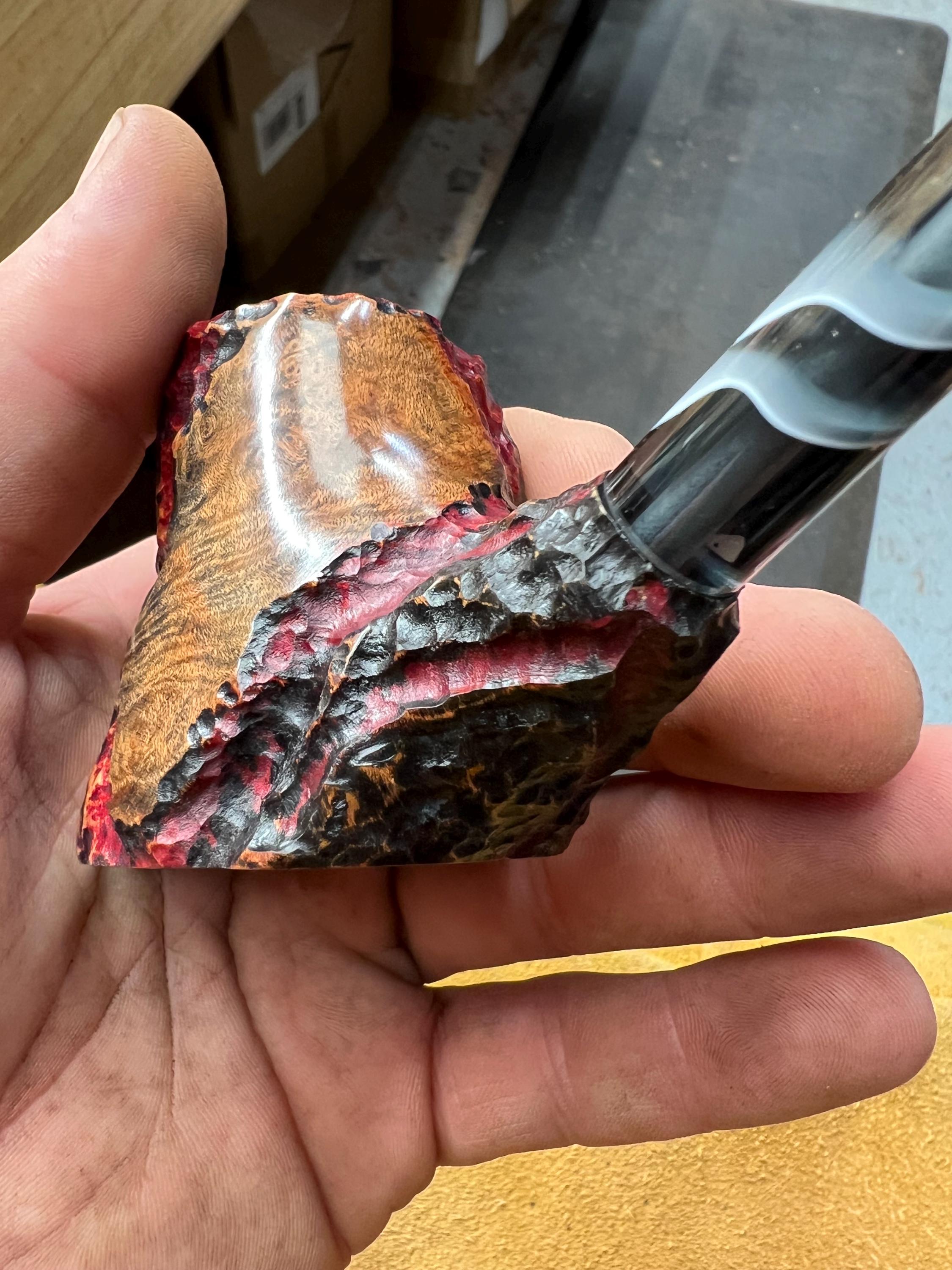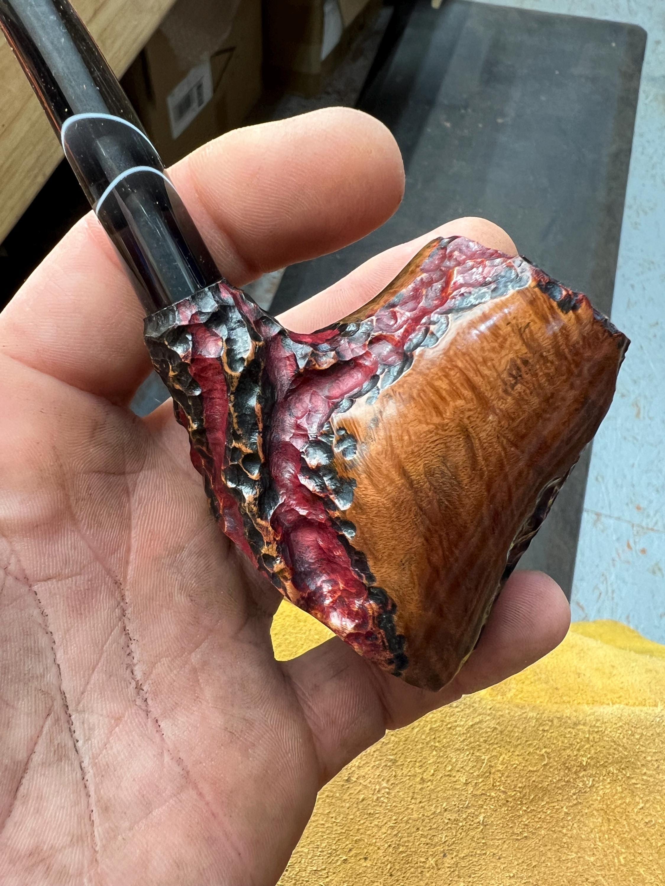 This is a handmade briar pipe that has been freehand carved and polished. A nice custom acrylic stem that’s slightly bent. These are built to be beautiful but also for every day smoking. This one is a medium to large pipe. 7/8 x1.5 deep bowl. Grecian briar