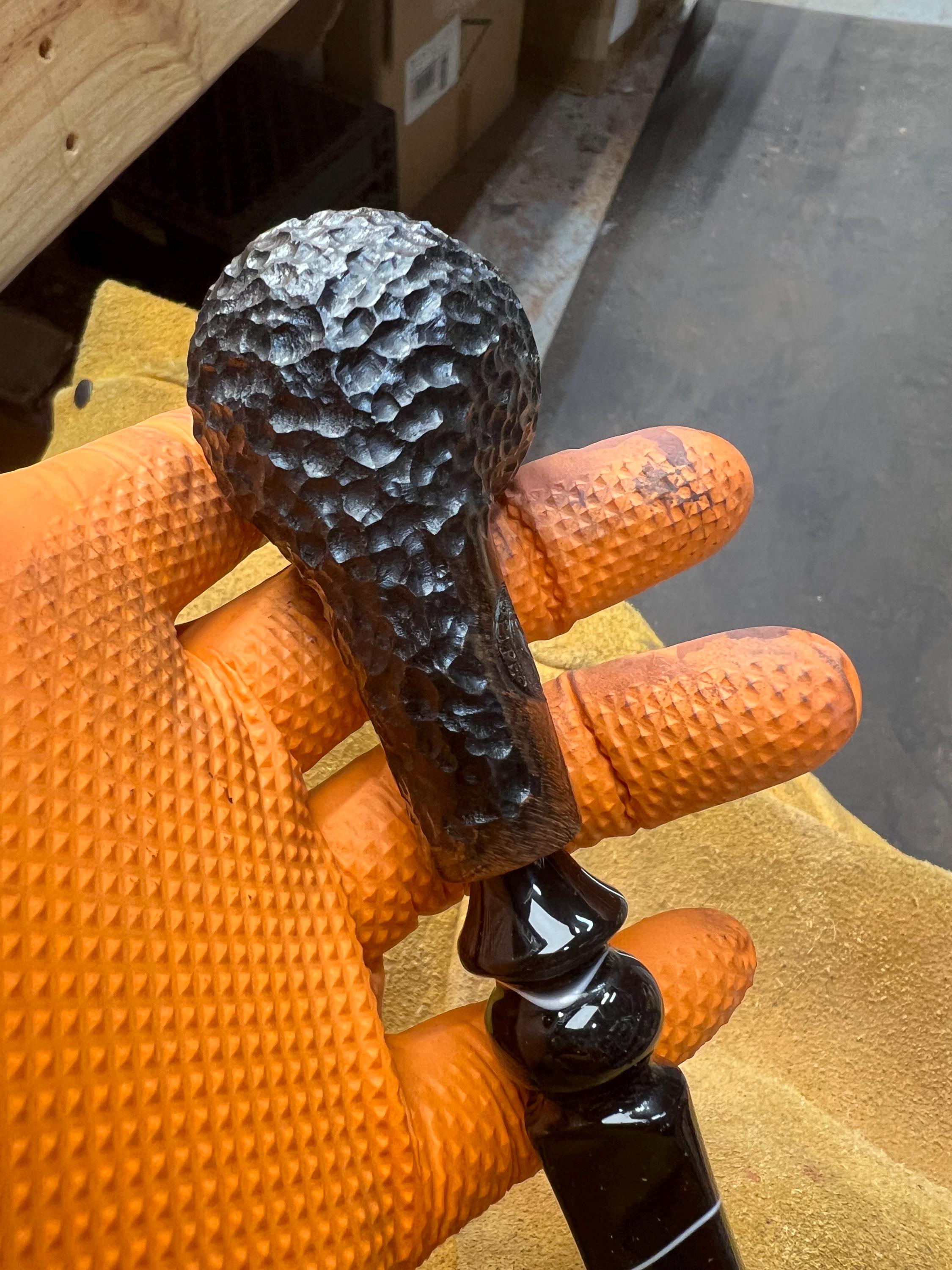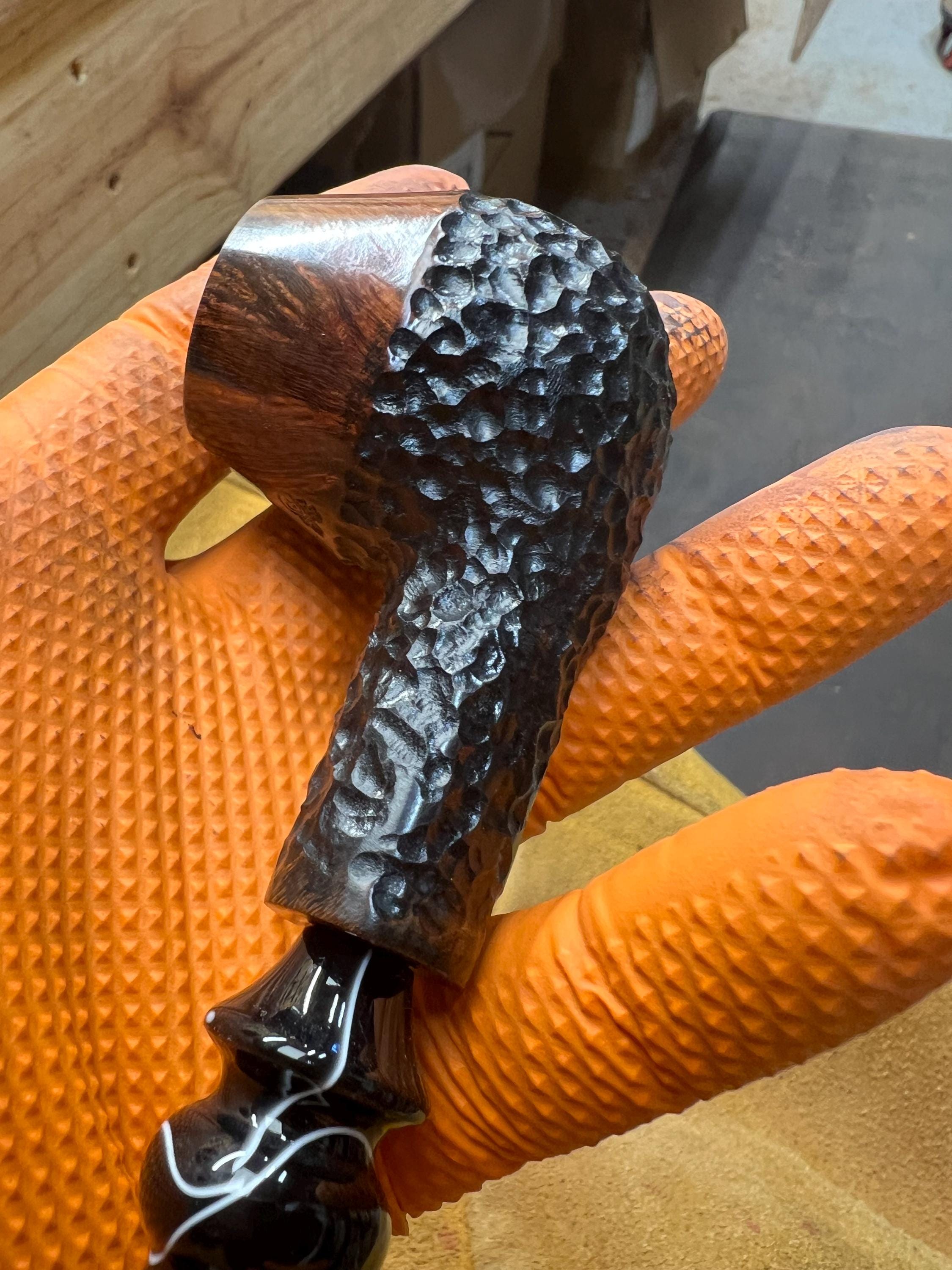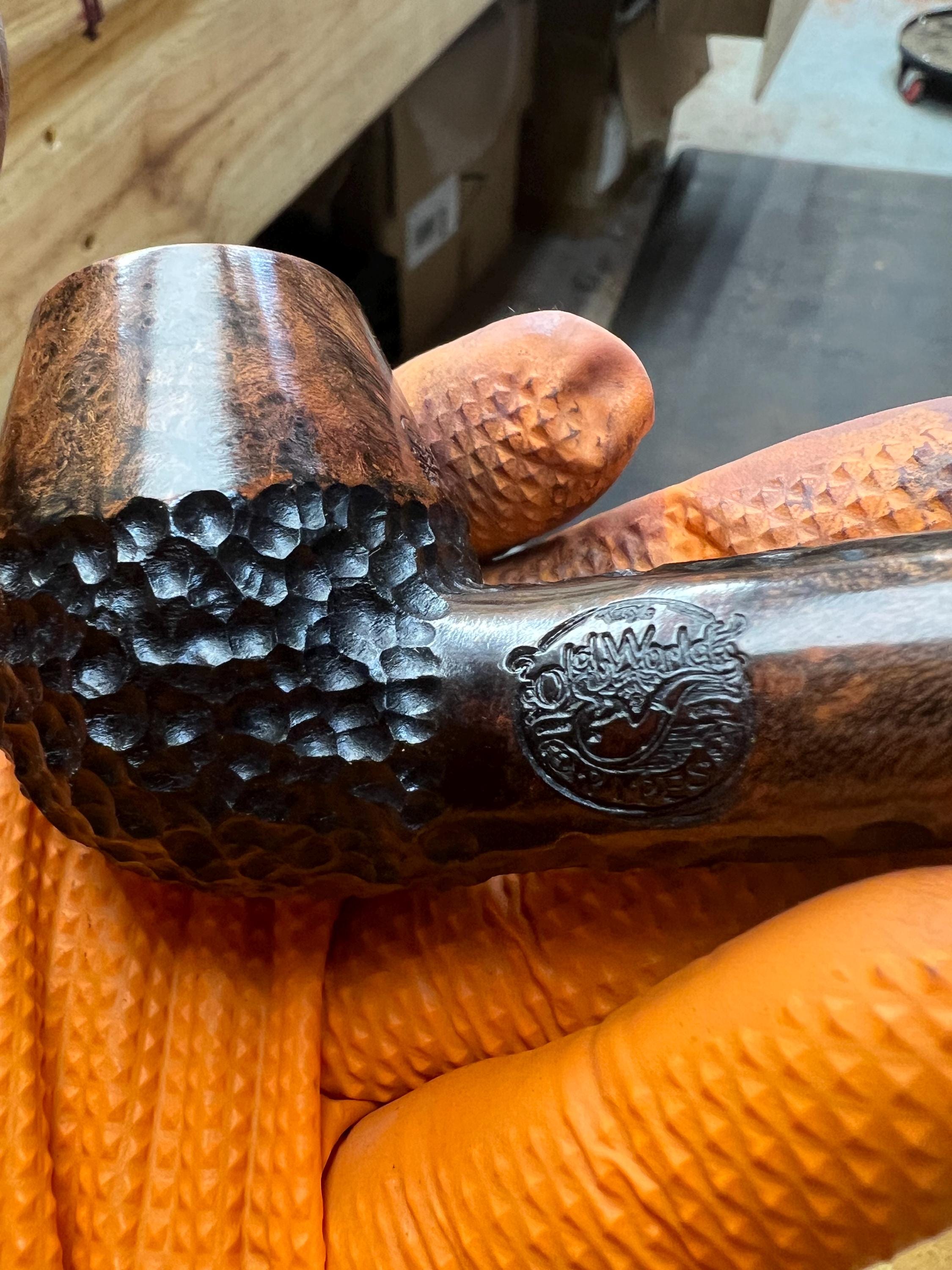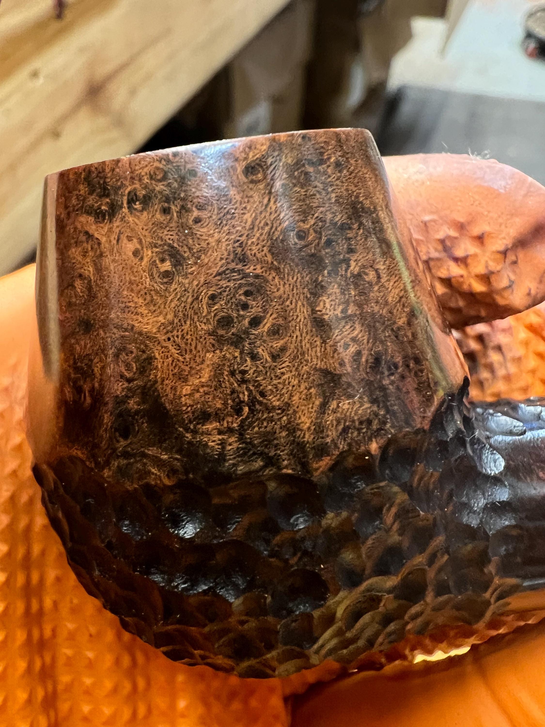 This is a handmade briar pipe that has been meticulously carved and sandblasted. Acrylic custom made stem. Non filtered. A very nice daily smoker.