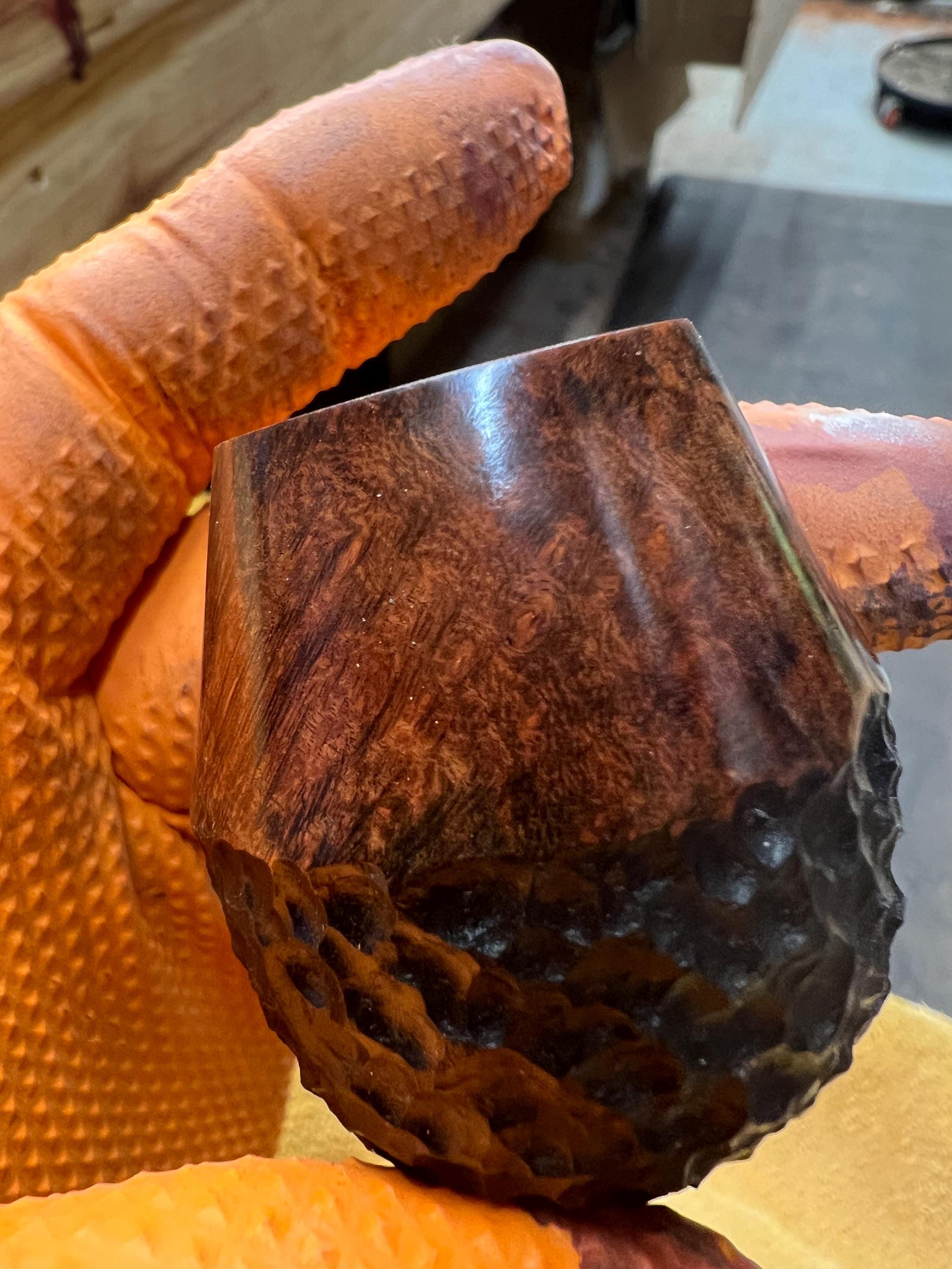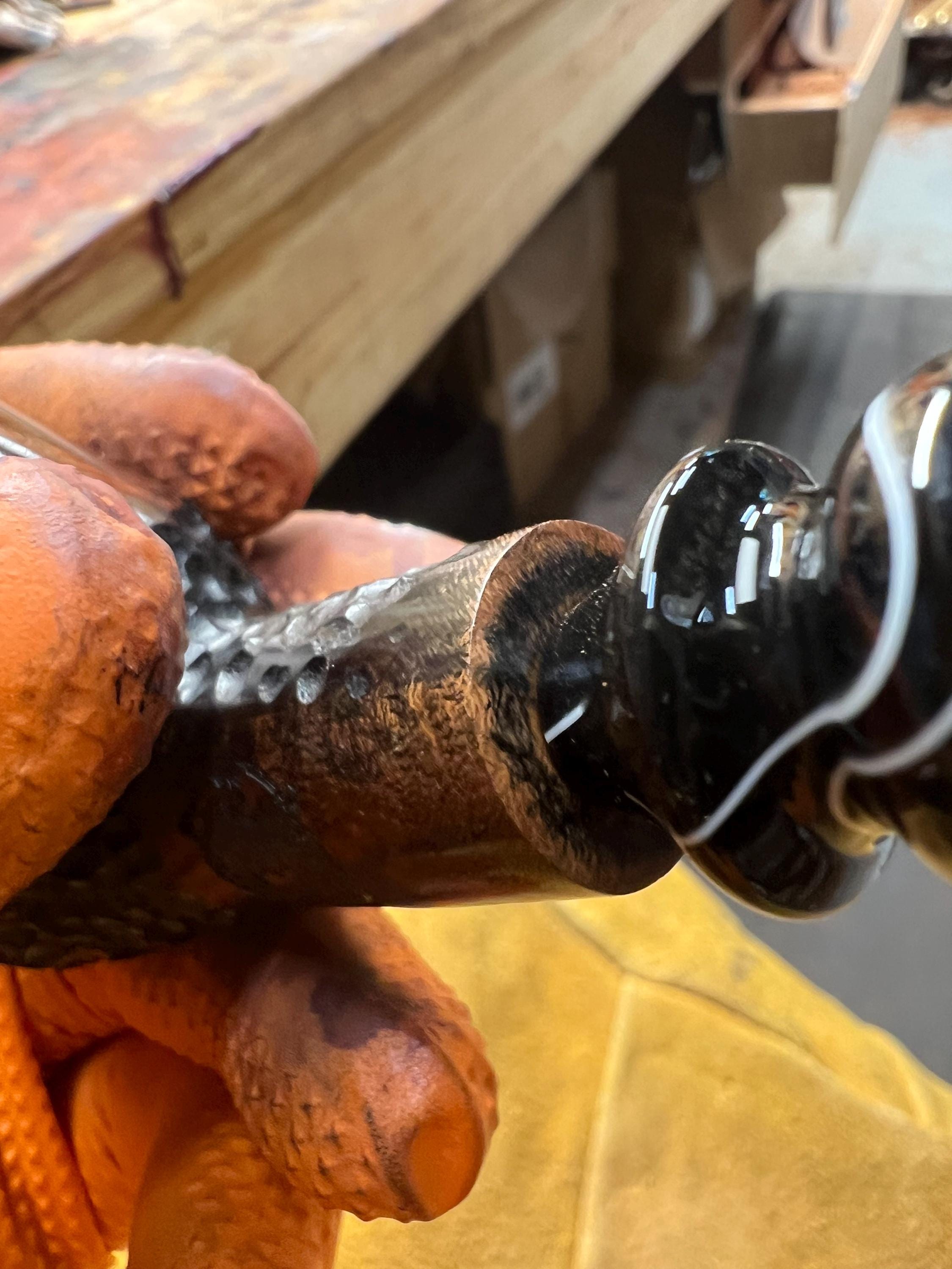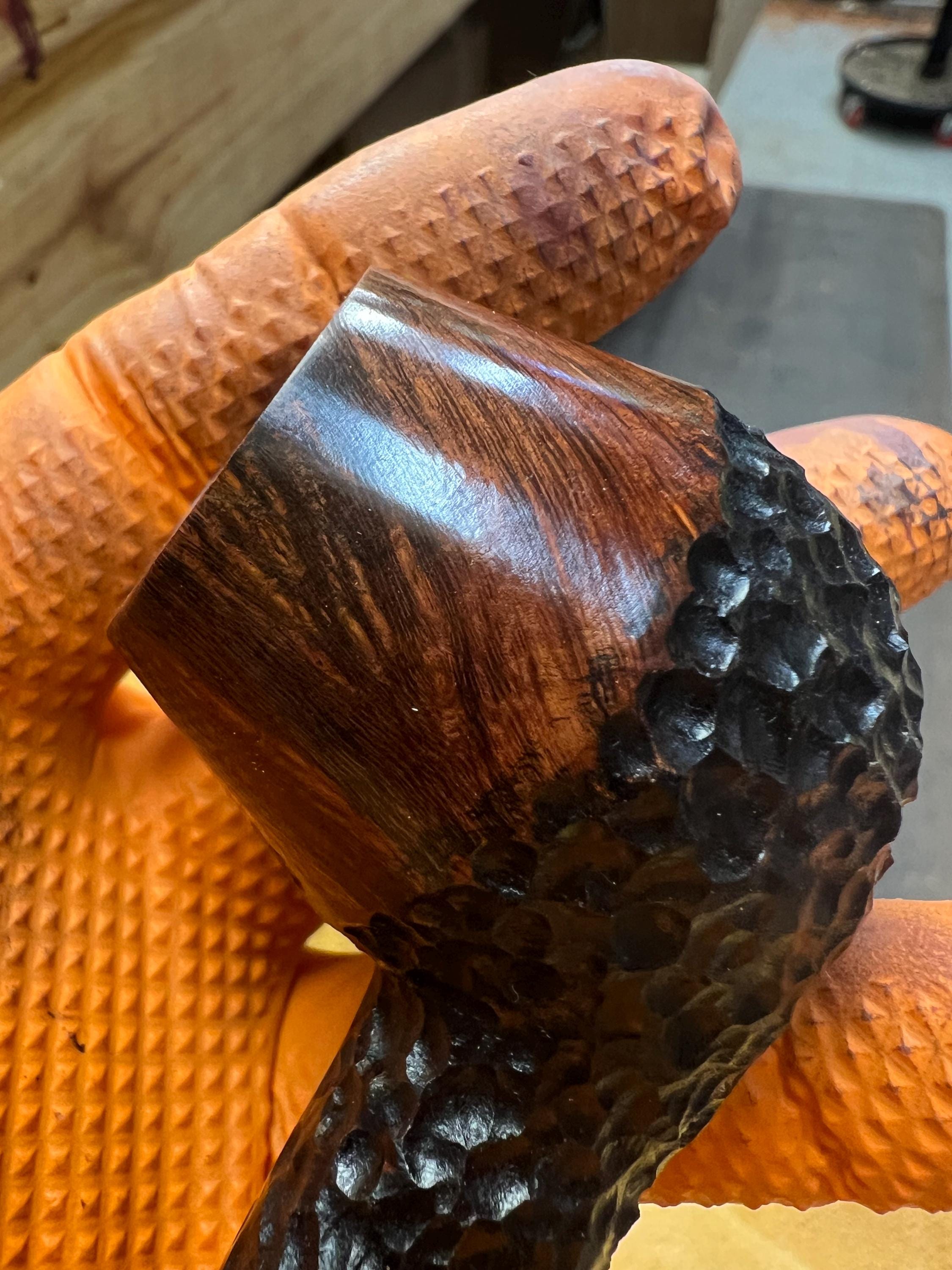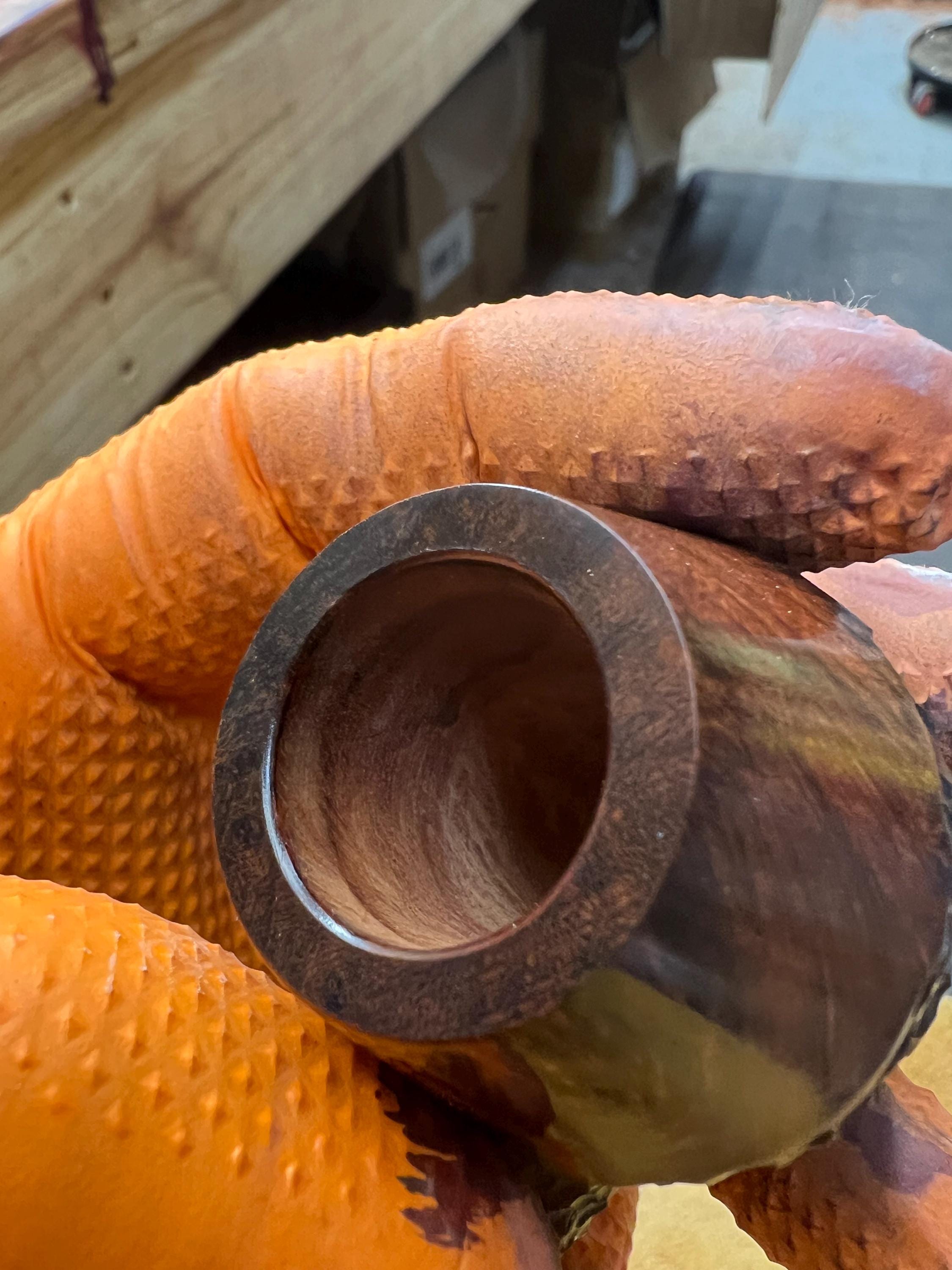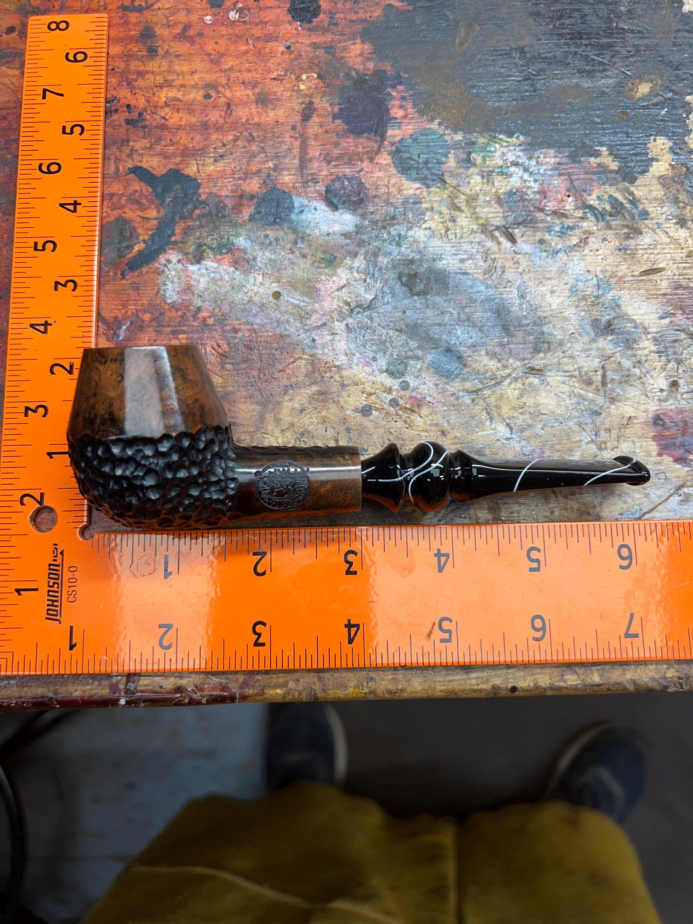 This is a handmade briar pipe that has been meticulously carved and sandblasted. Acrylic custom made stem. Non filtered. A very nice daily smoker.