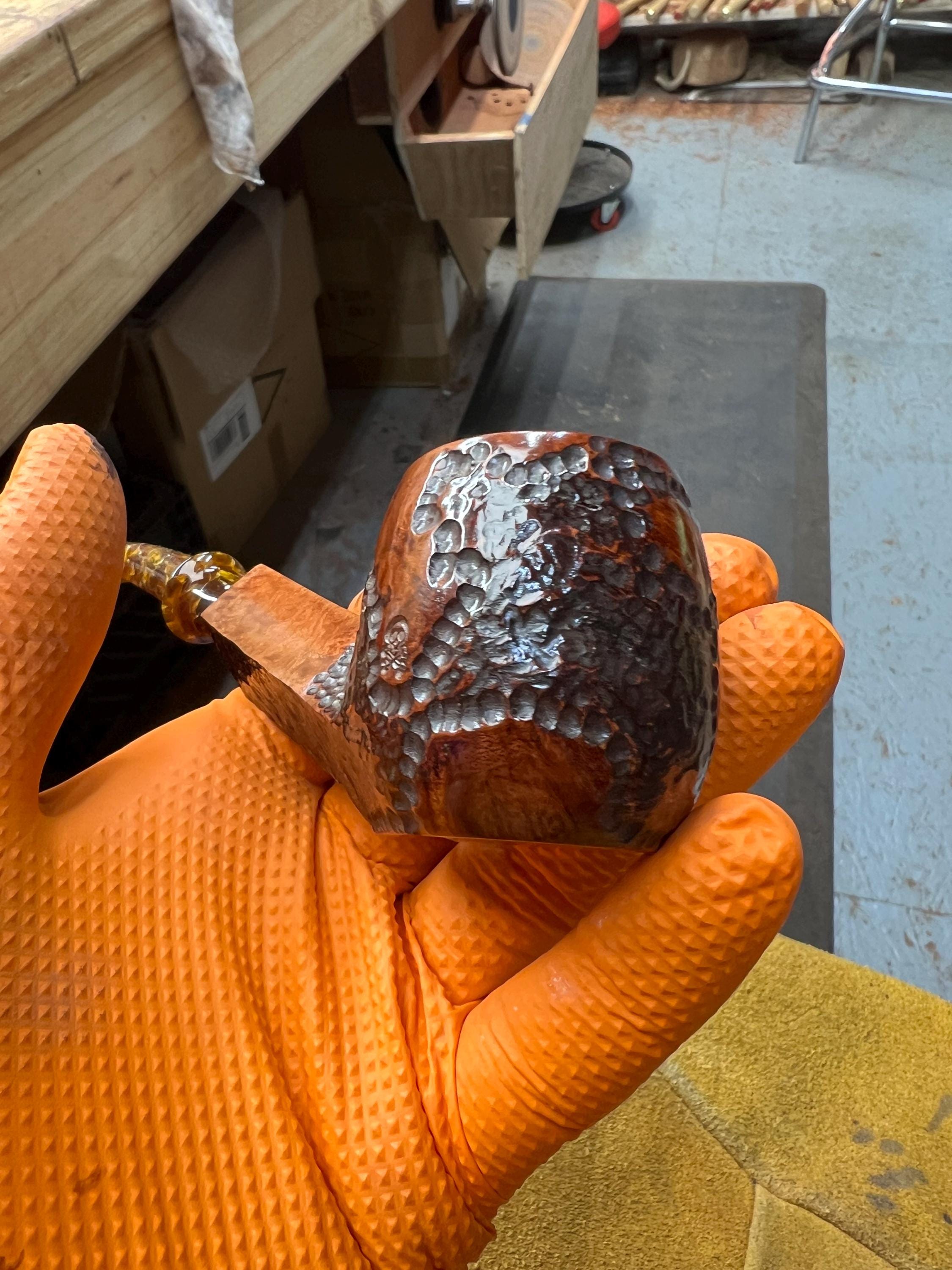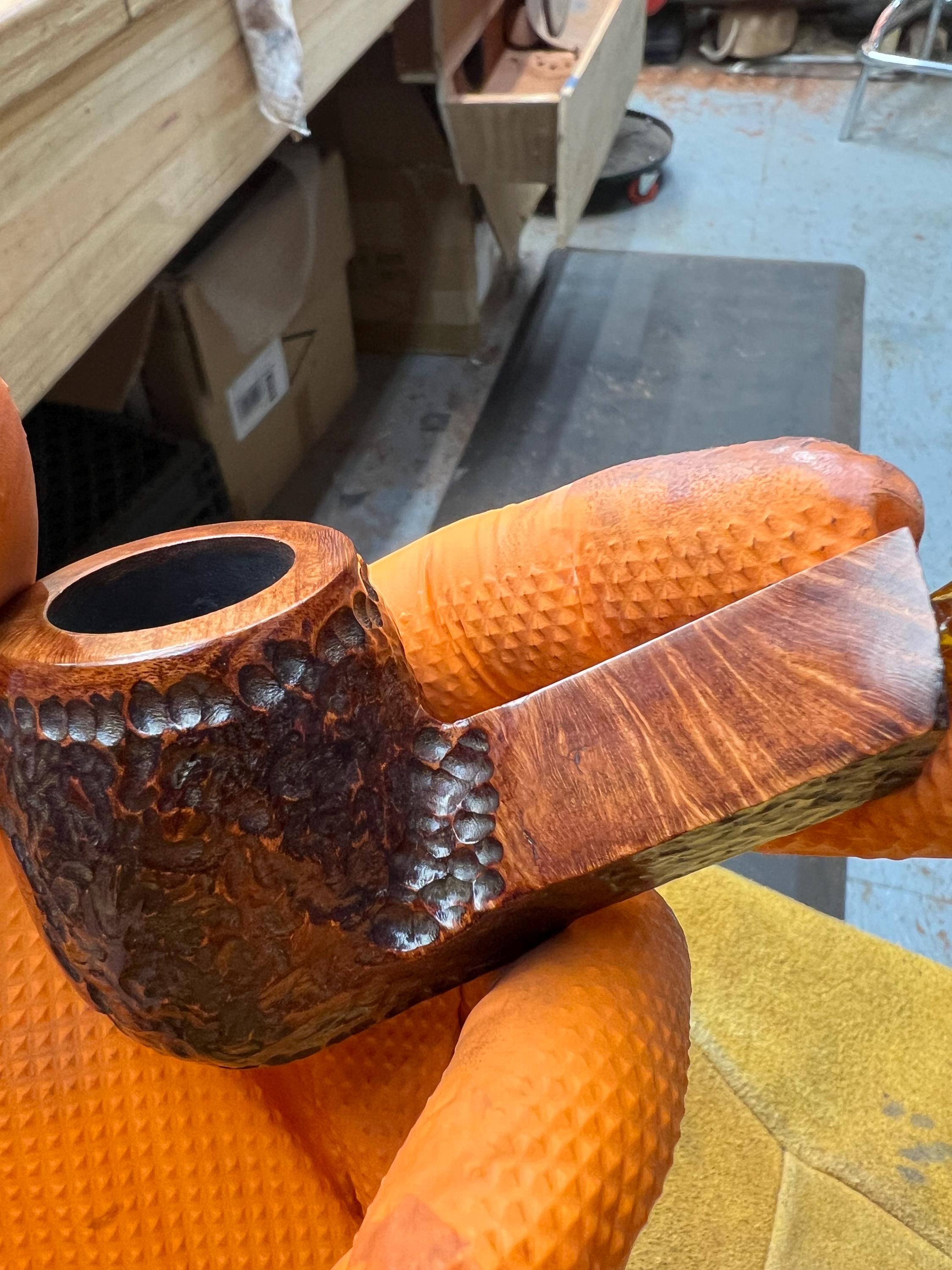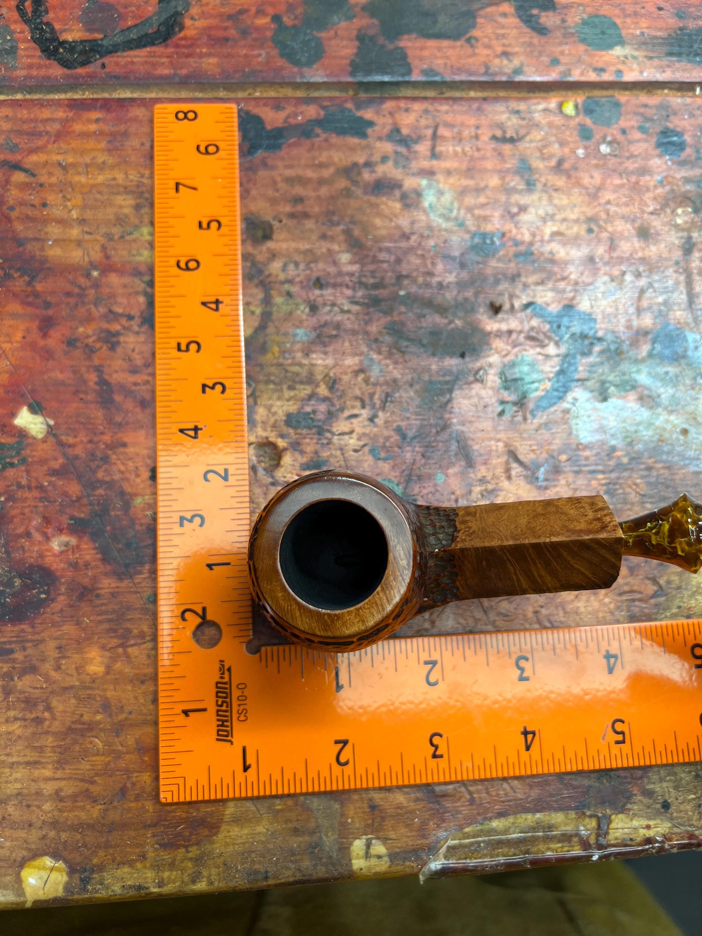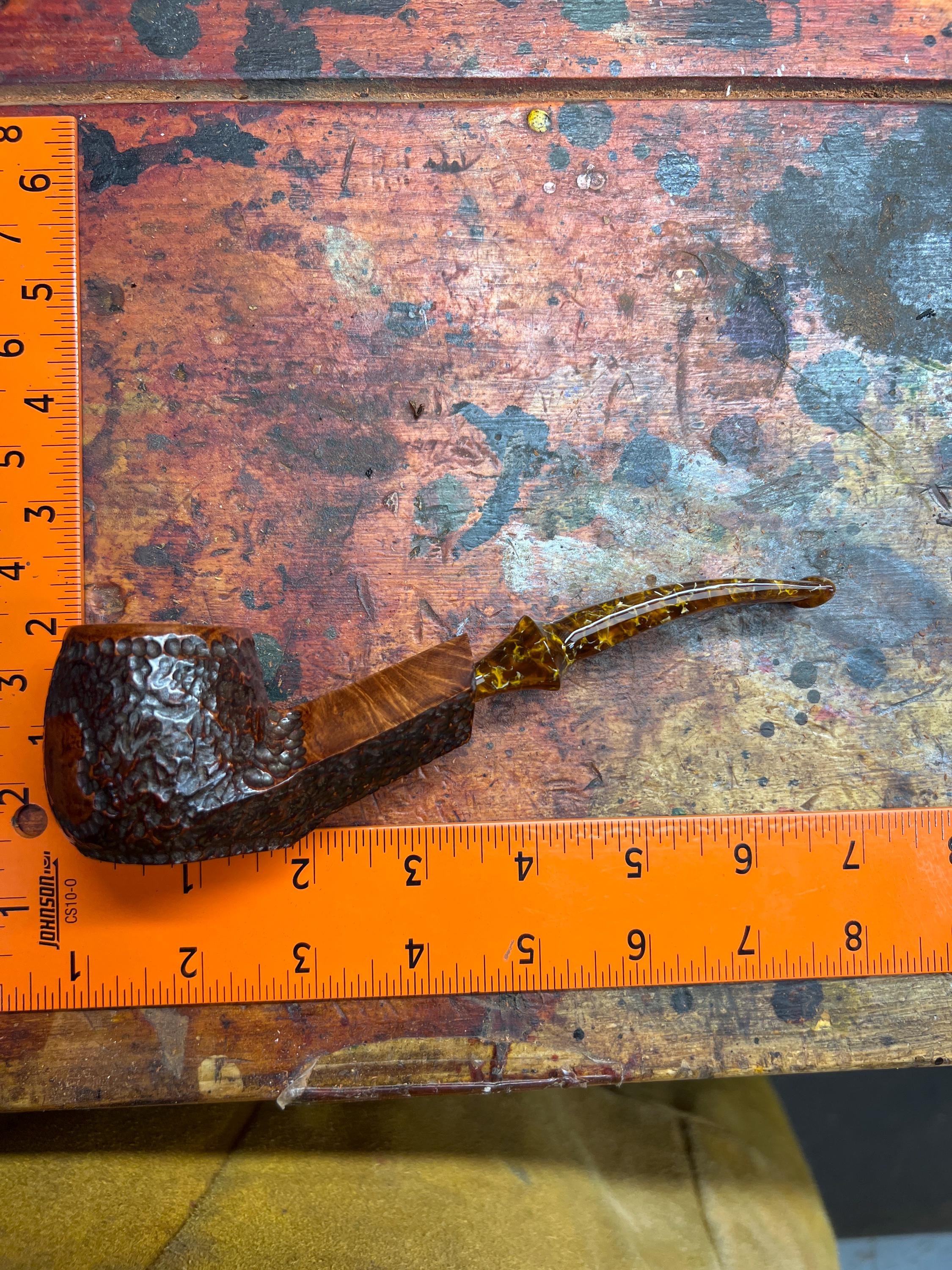 This is a handmade briar pipe that has been meticulously carved and polished . Acrylic custom made stem. Non filtered. A very nice daily smoker. Larger bowl 15/16x1.5”