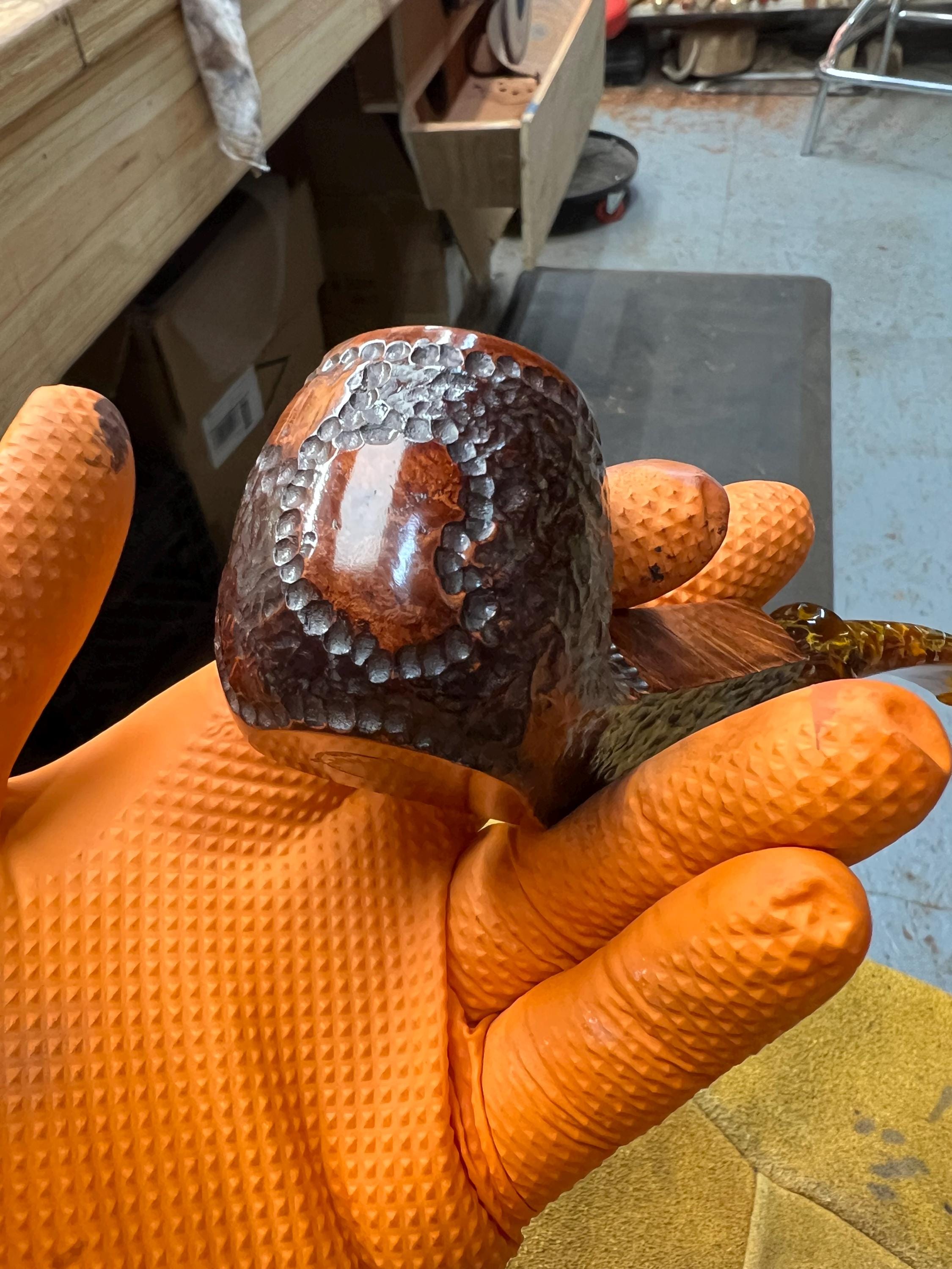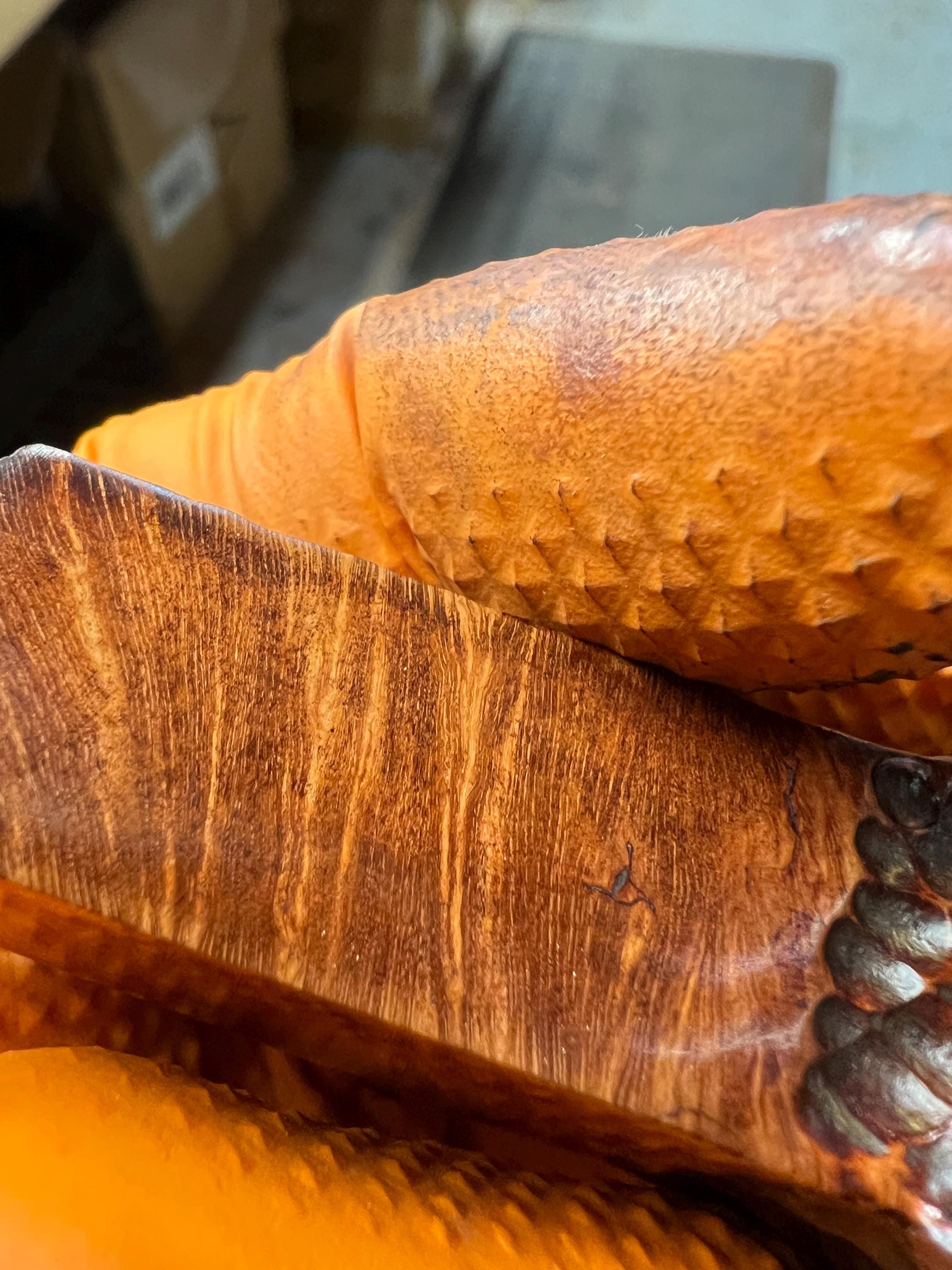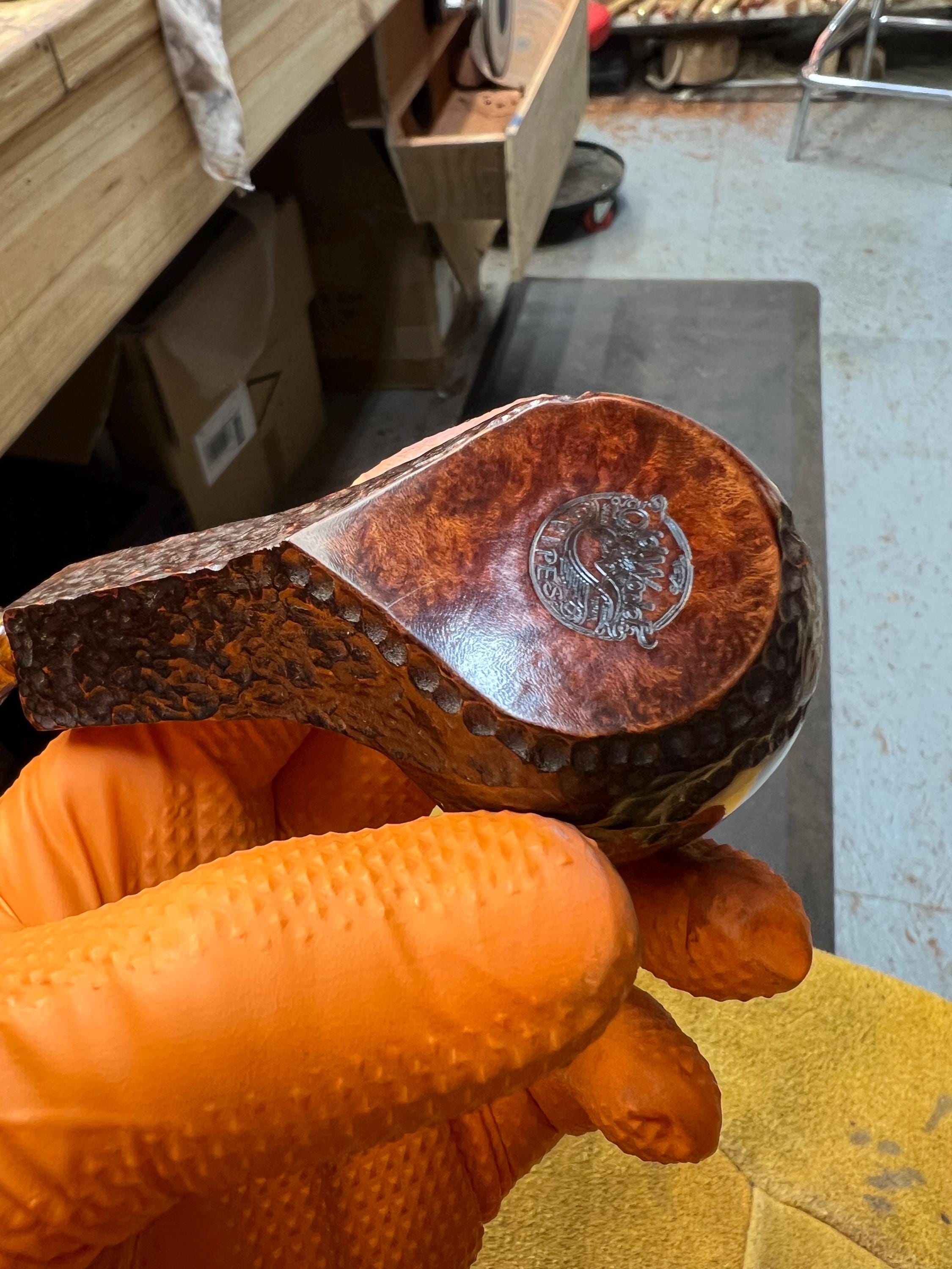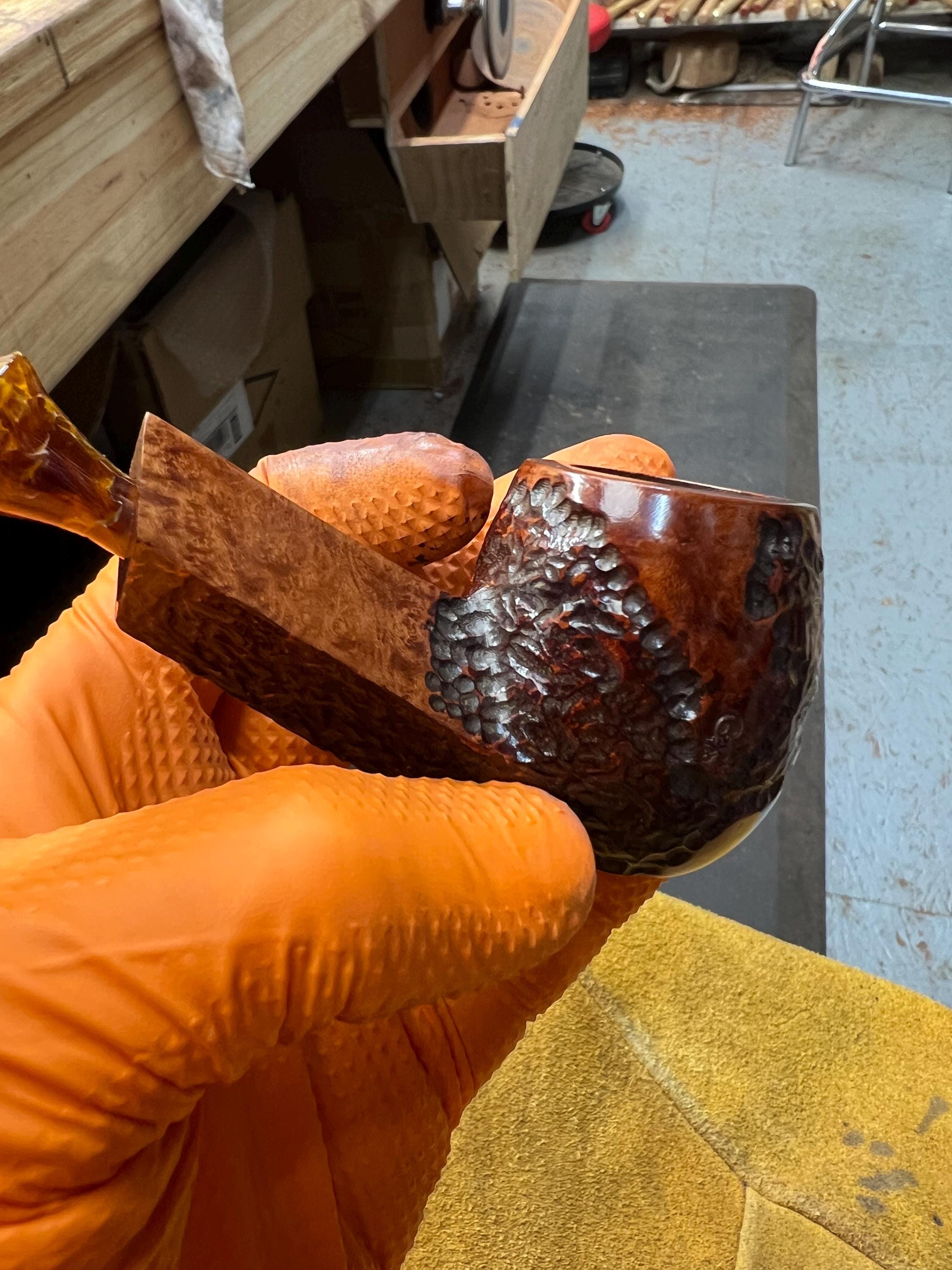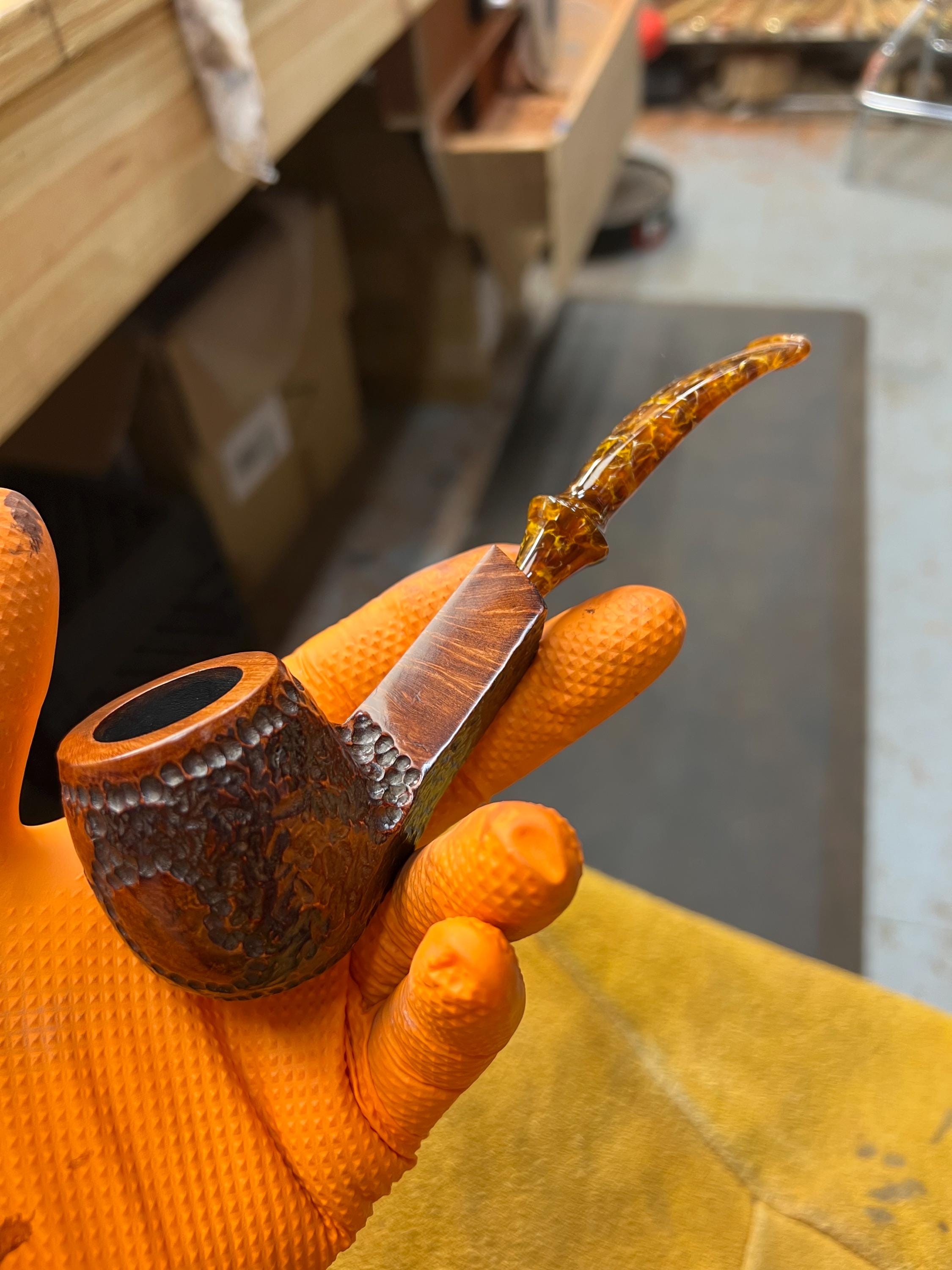 This is a handmade briar pipe that has been meticulously carved and polished . Acrylic custom made stem. Non filtered. A very nice daily smoker. Larger bowl 15/16x1.5”