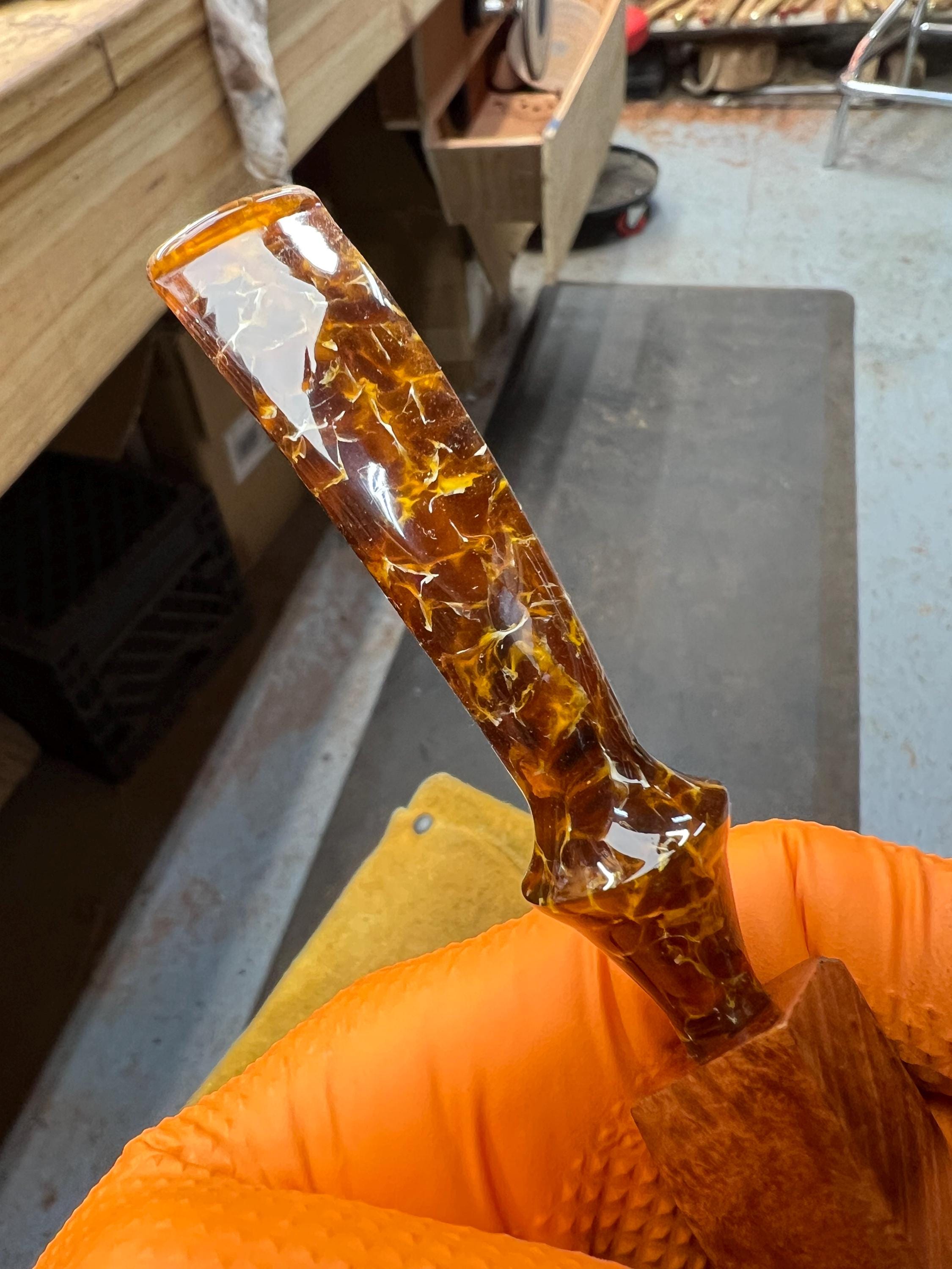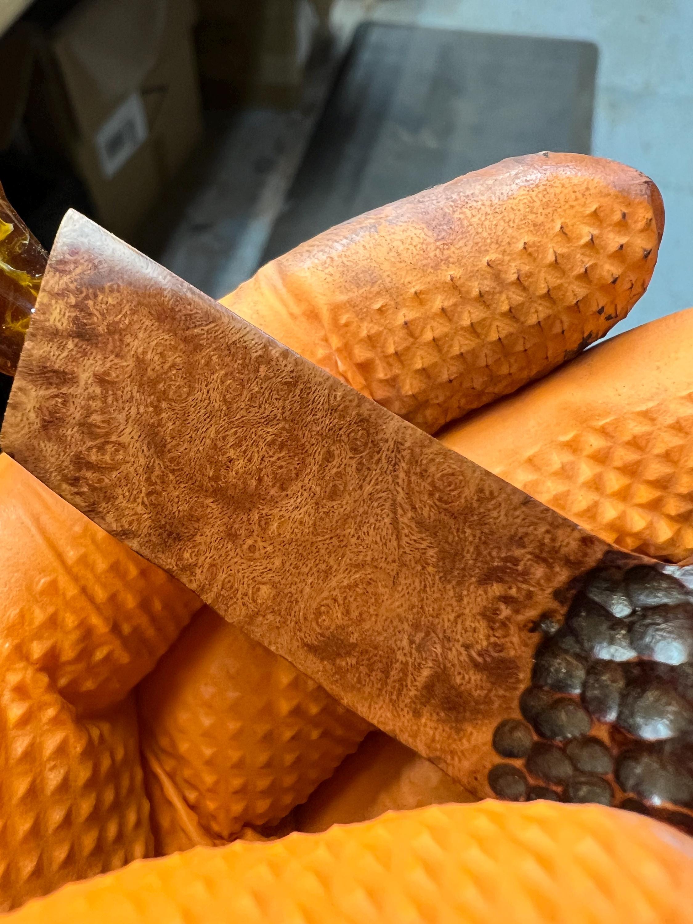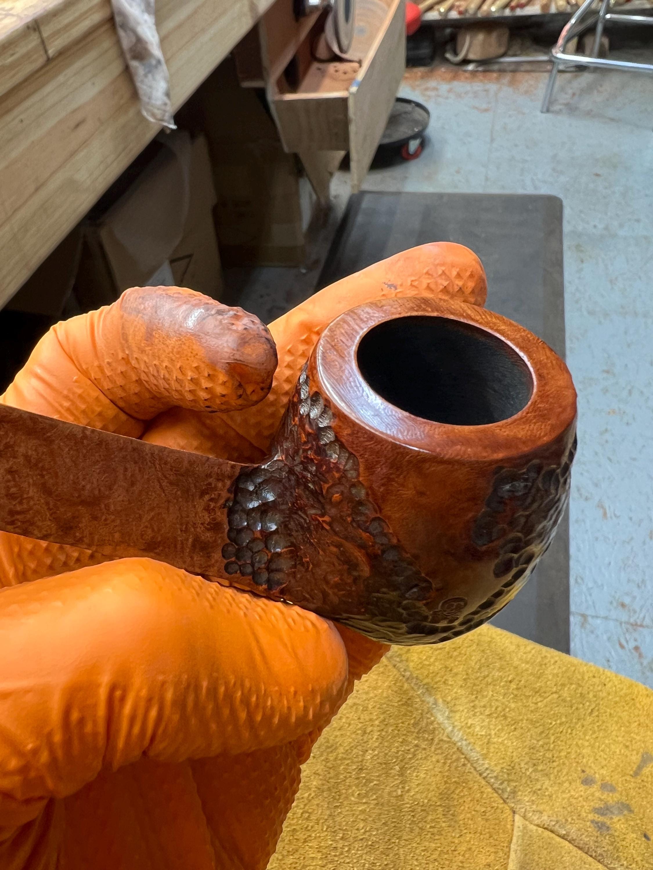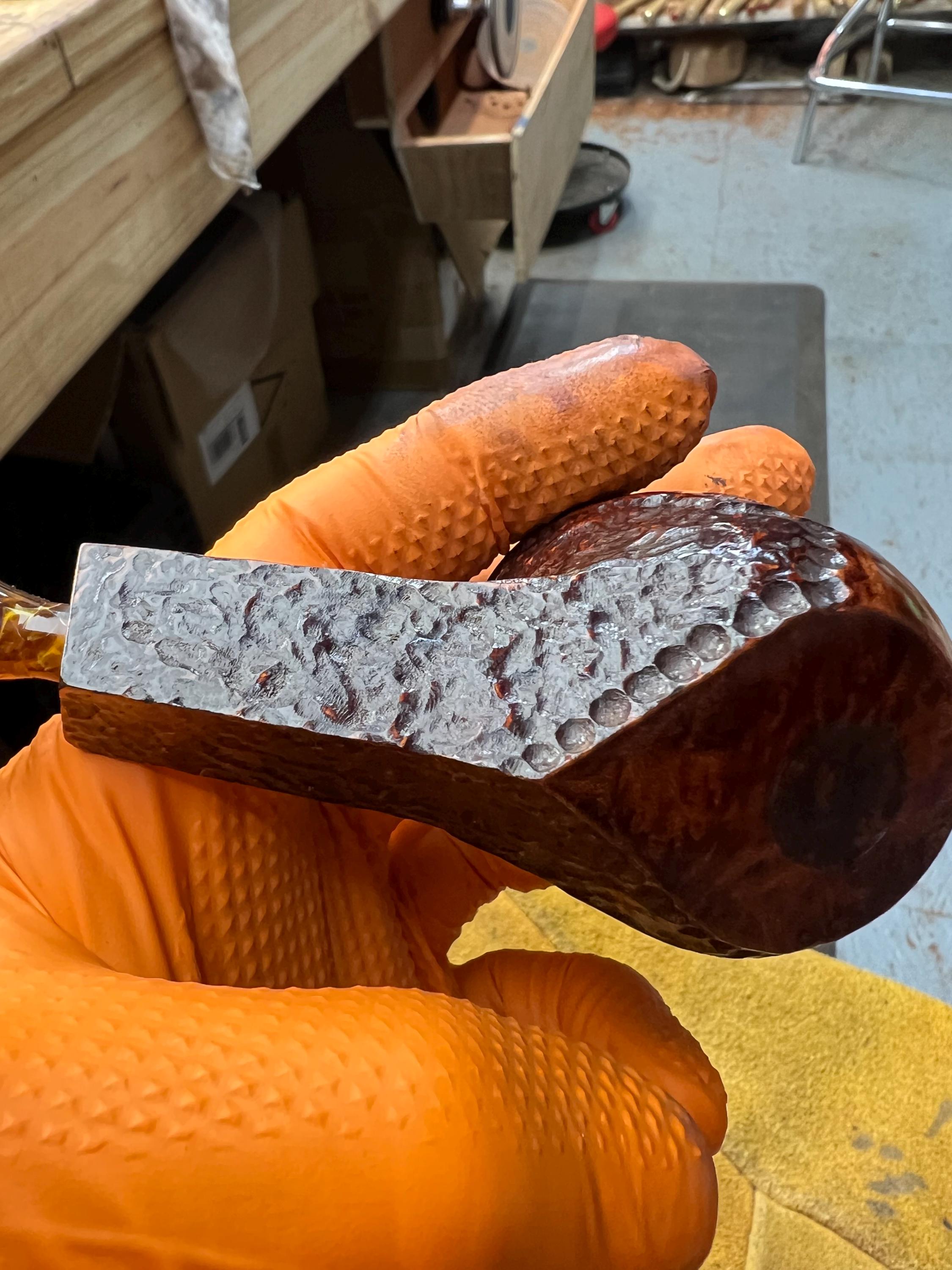 This is a handmade briar pipe that has been meticulously carved and polished . Acrylic custom made stem. Non filtered. A very nice daily smoker. Larger bowl 15/16x1.5”