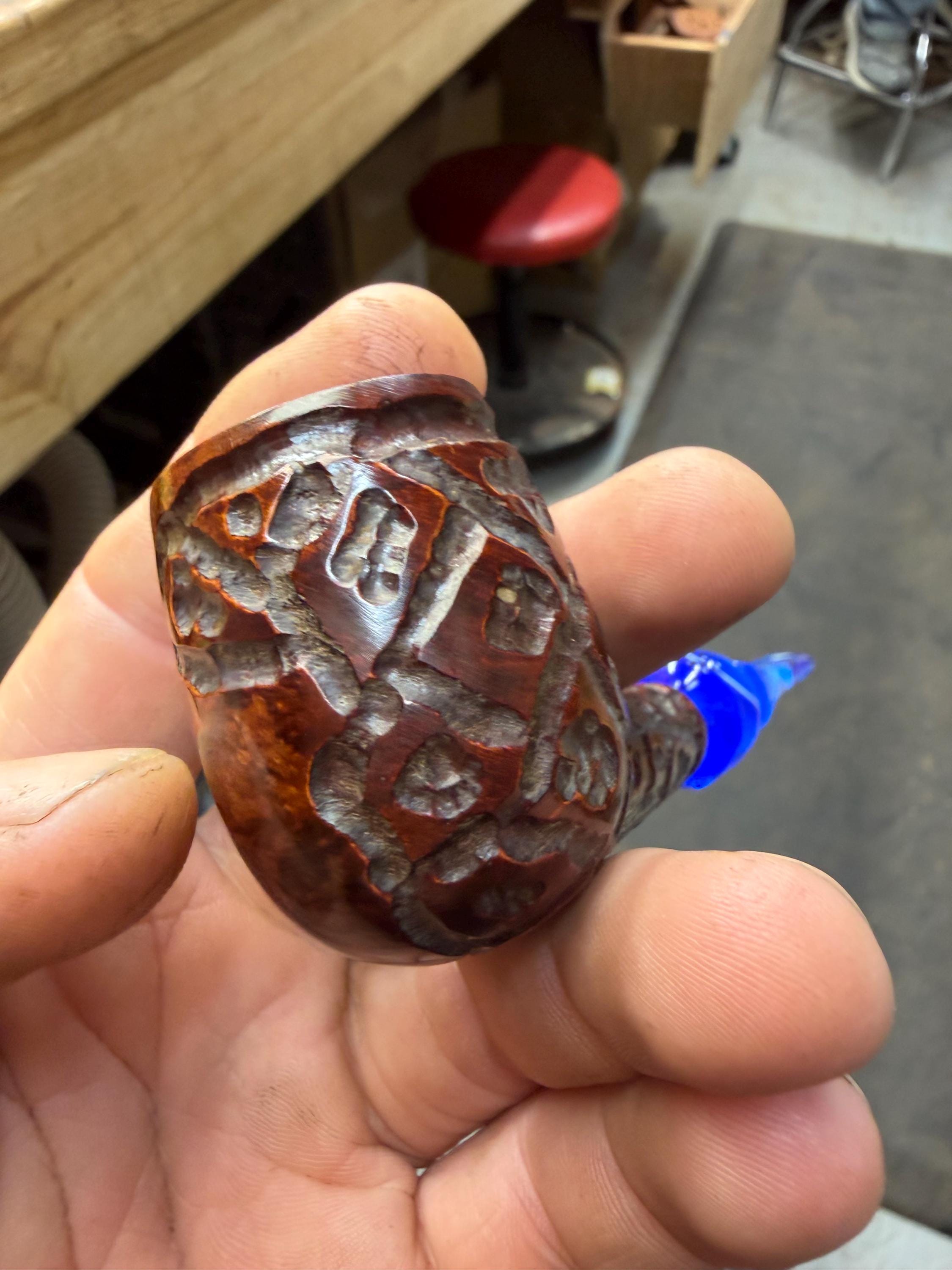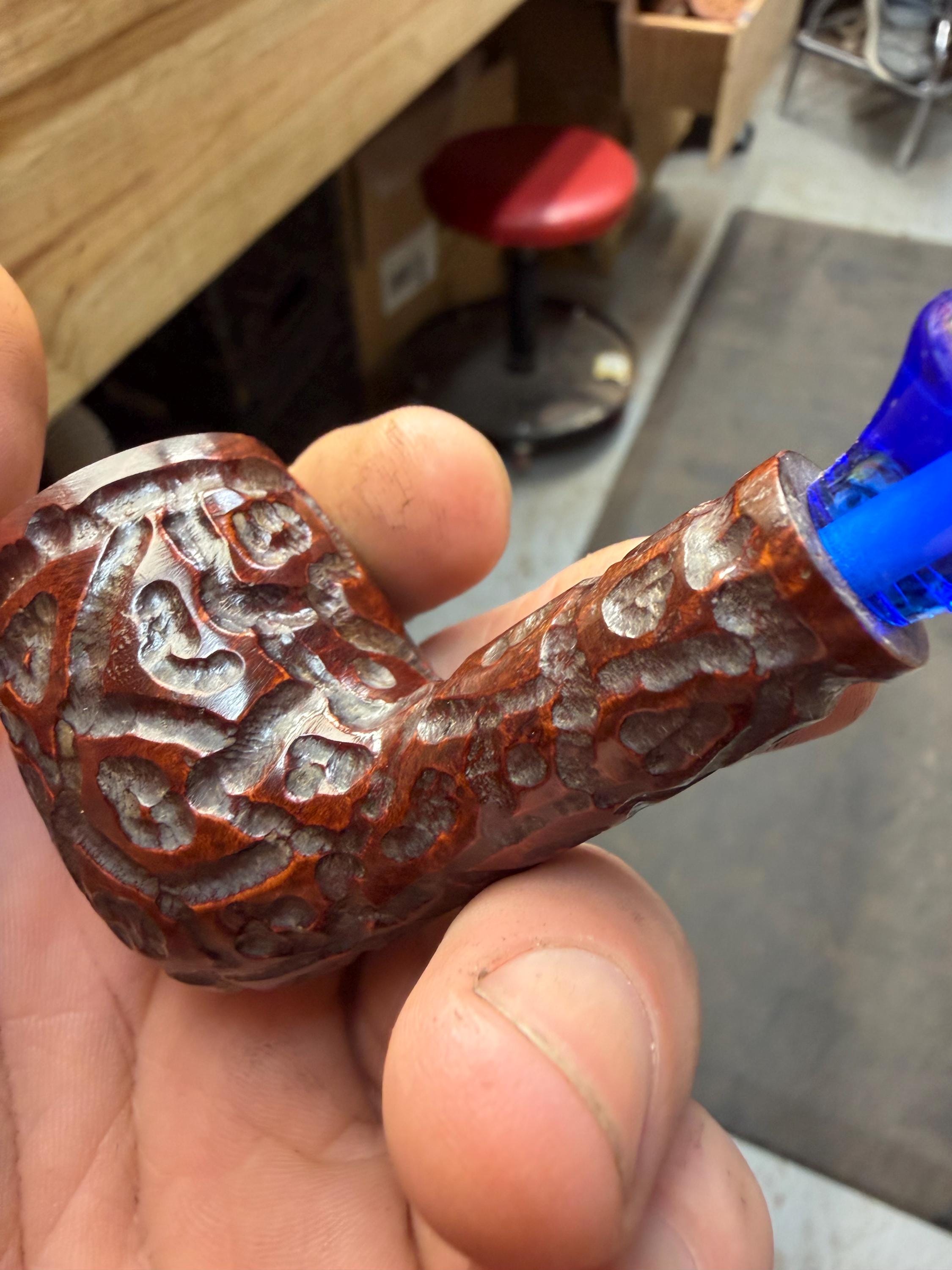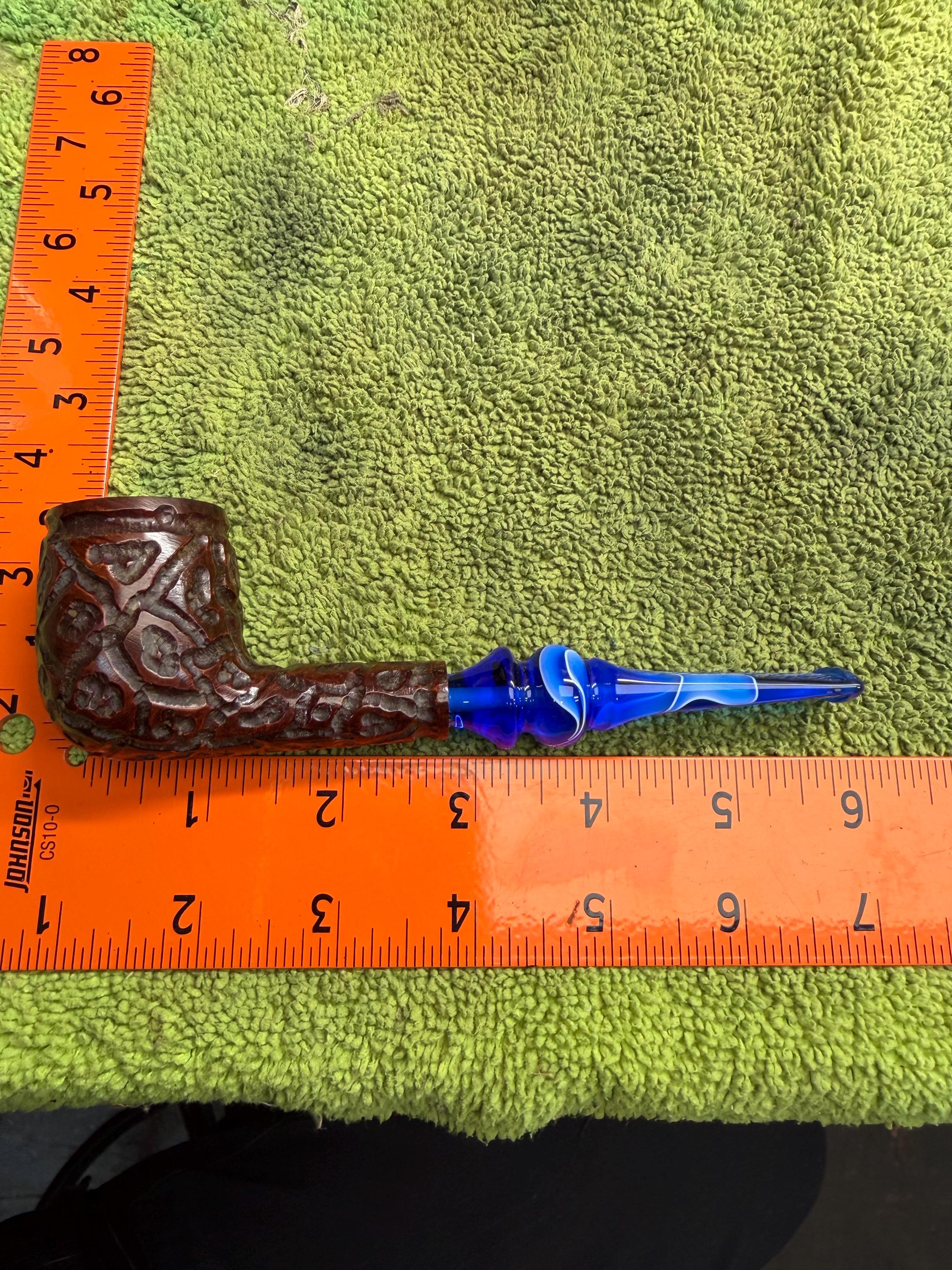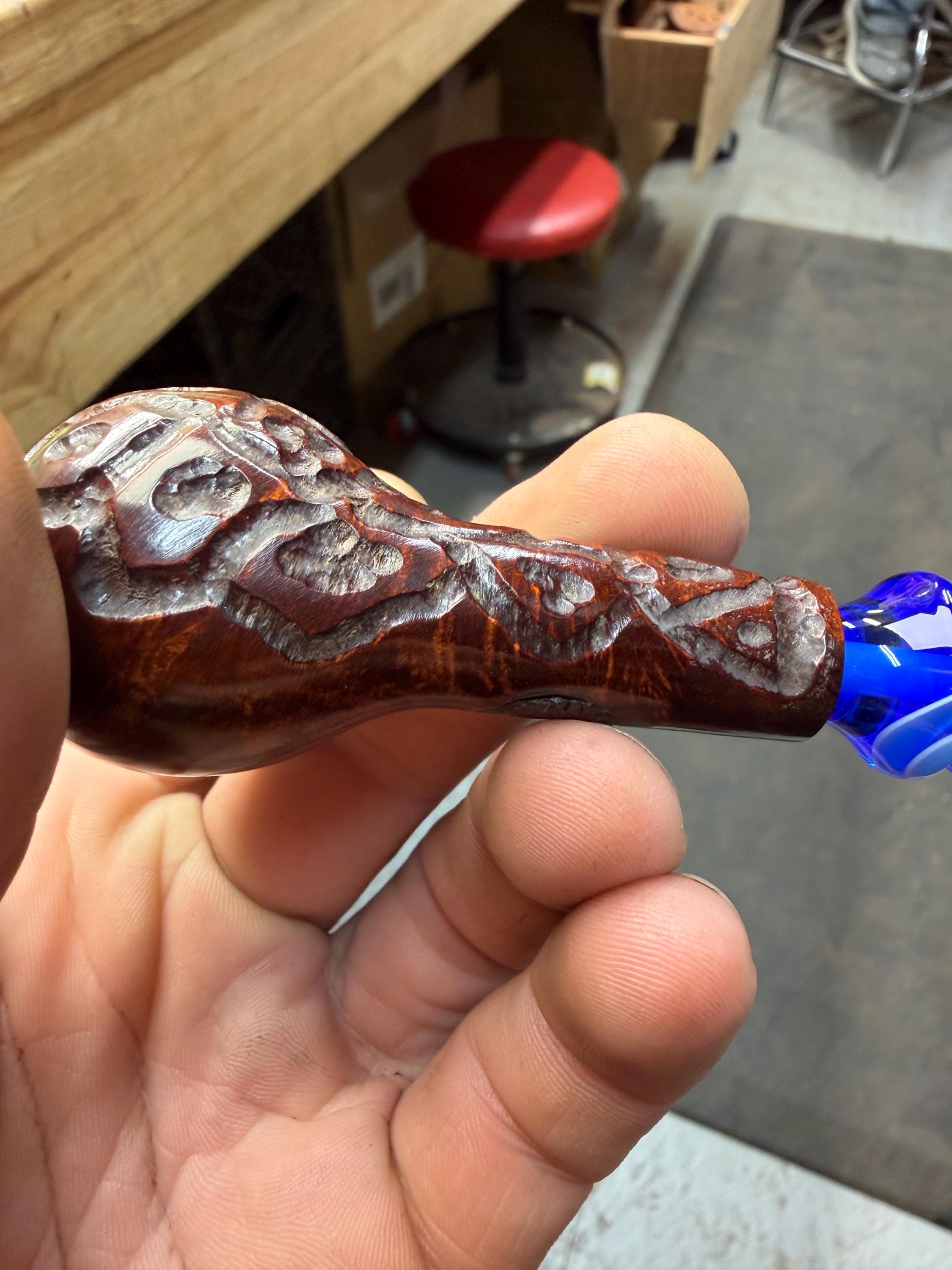 This is a handmade briar pipe that has been meticulously carved and polished/ partially rusticated . Acrylic custom made stem. Non filtered. A very nice daily smoker.