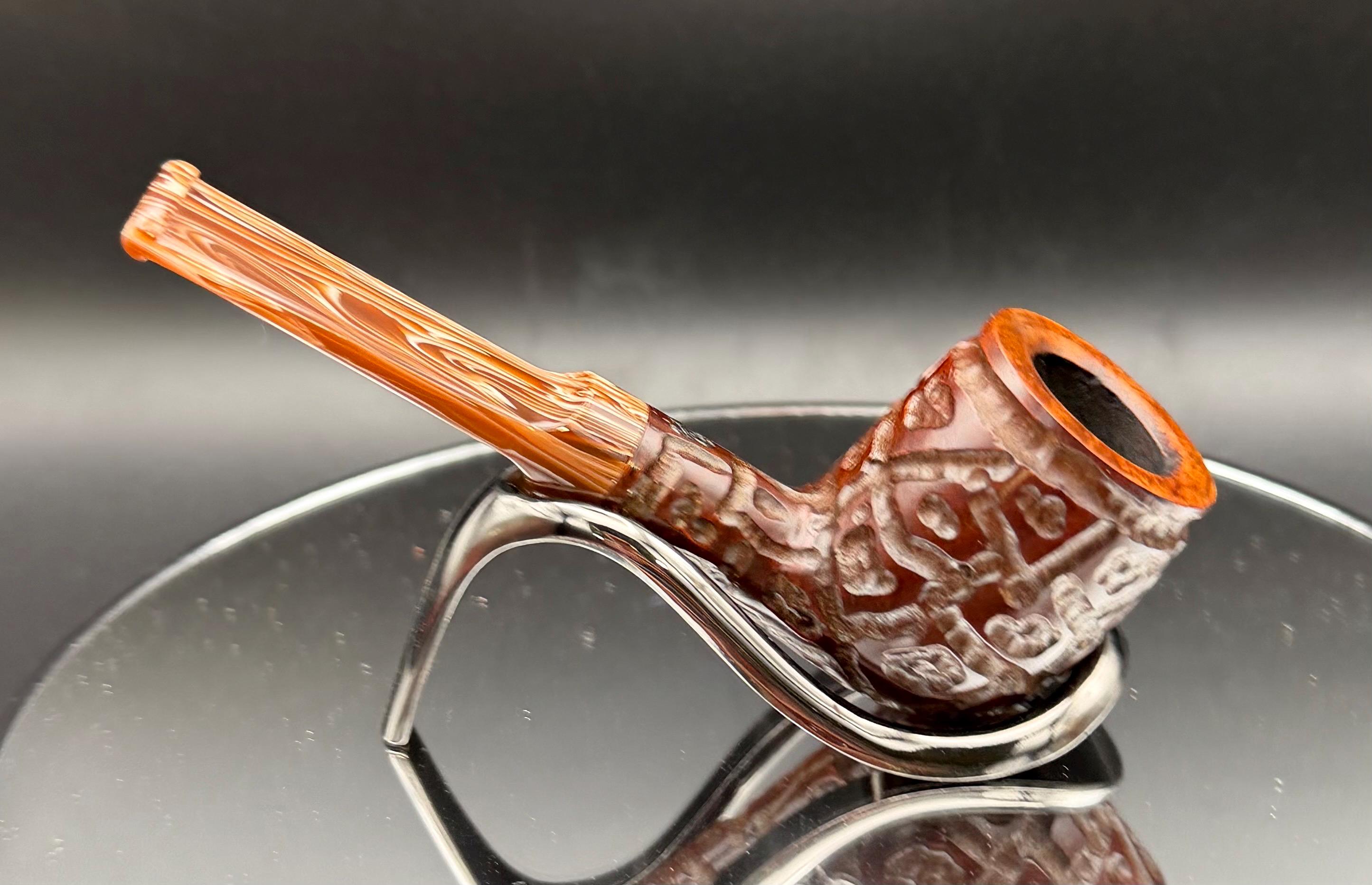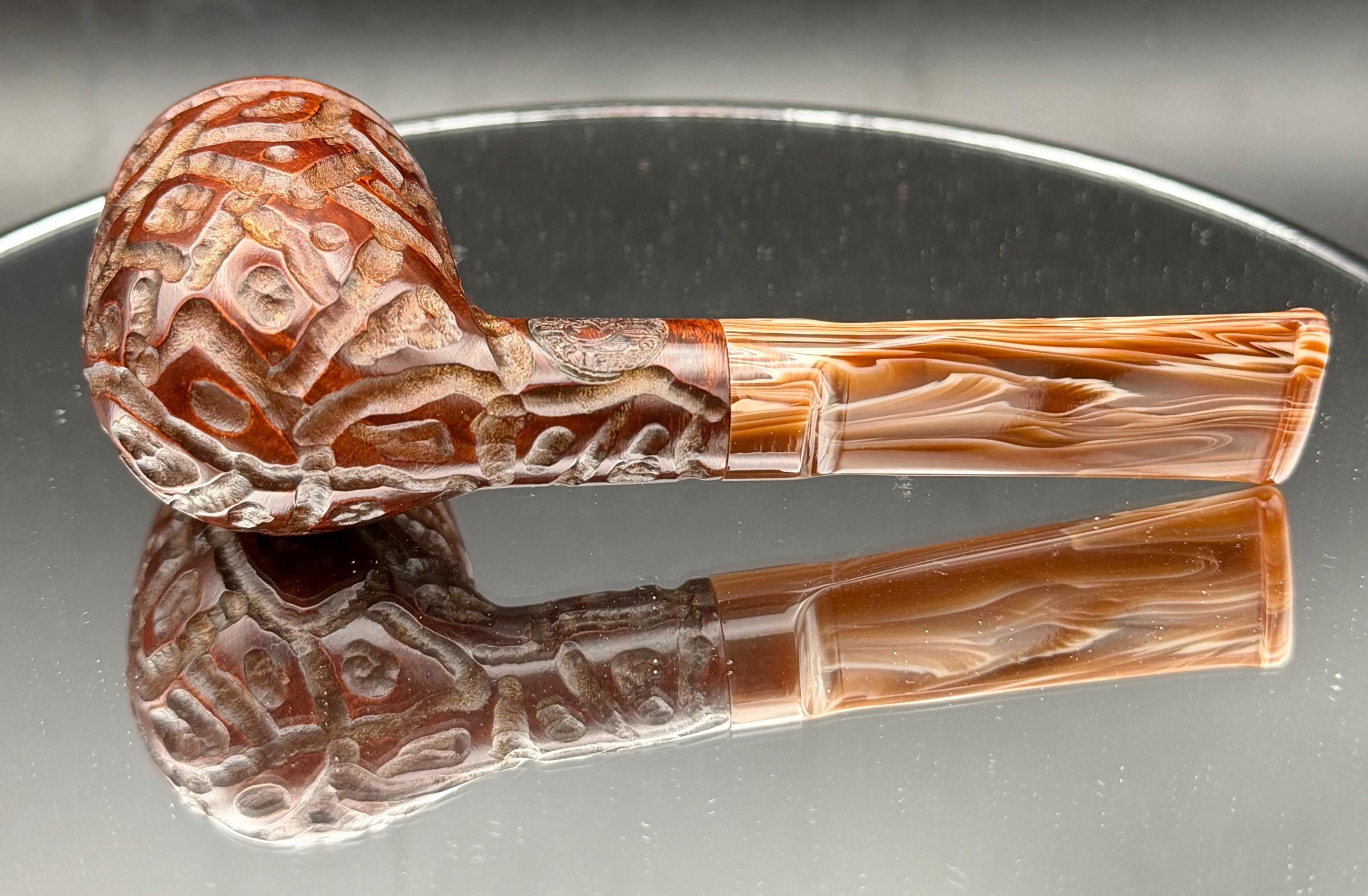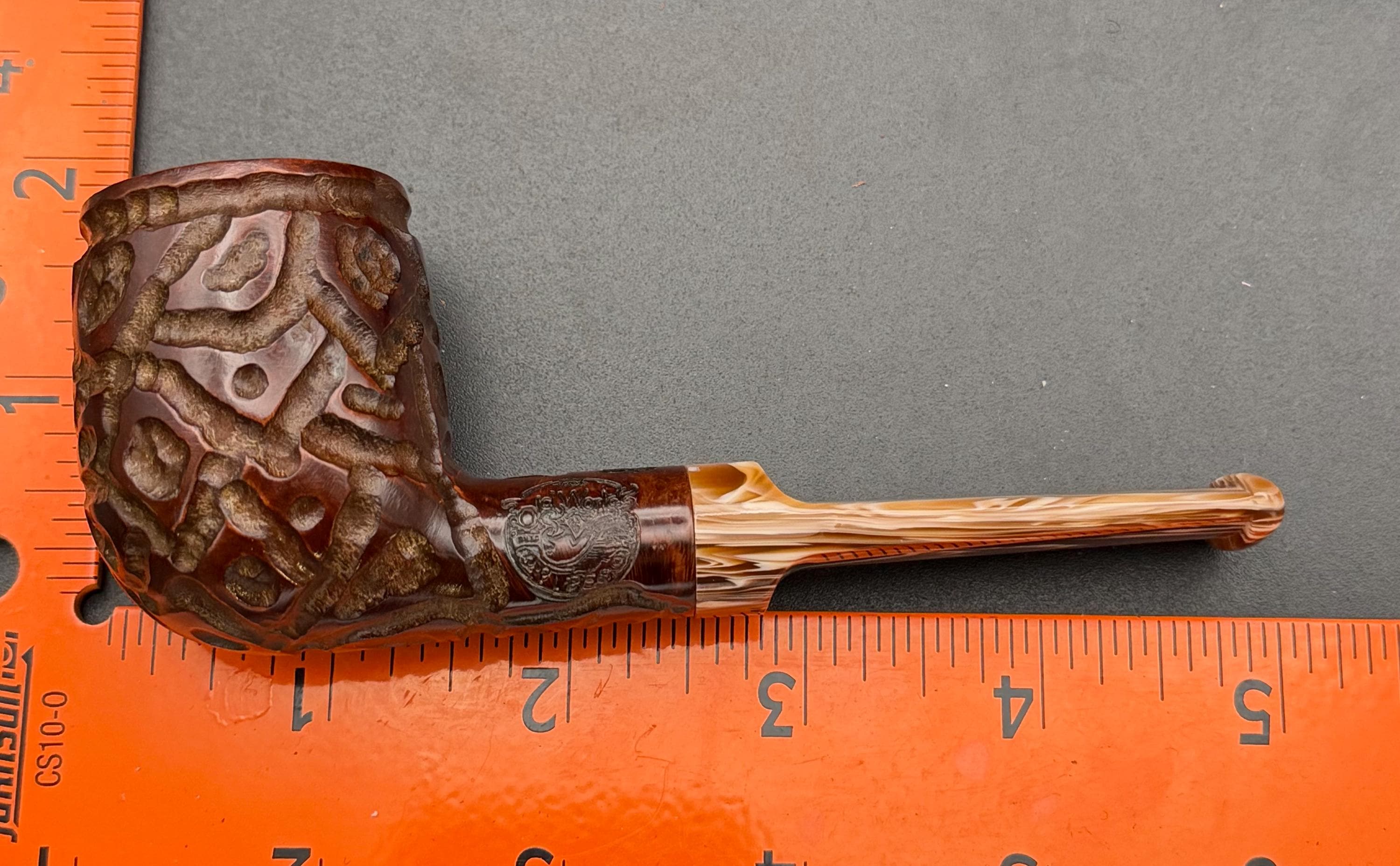 This is a handmade briar pipe that has been meticulously carved and polished/ partially rusticated . Acrylic custom made stem. Non filtered. A very nice daily smoker.A shorter pipe with a normal size bowl for a good smoke.