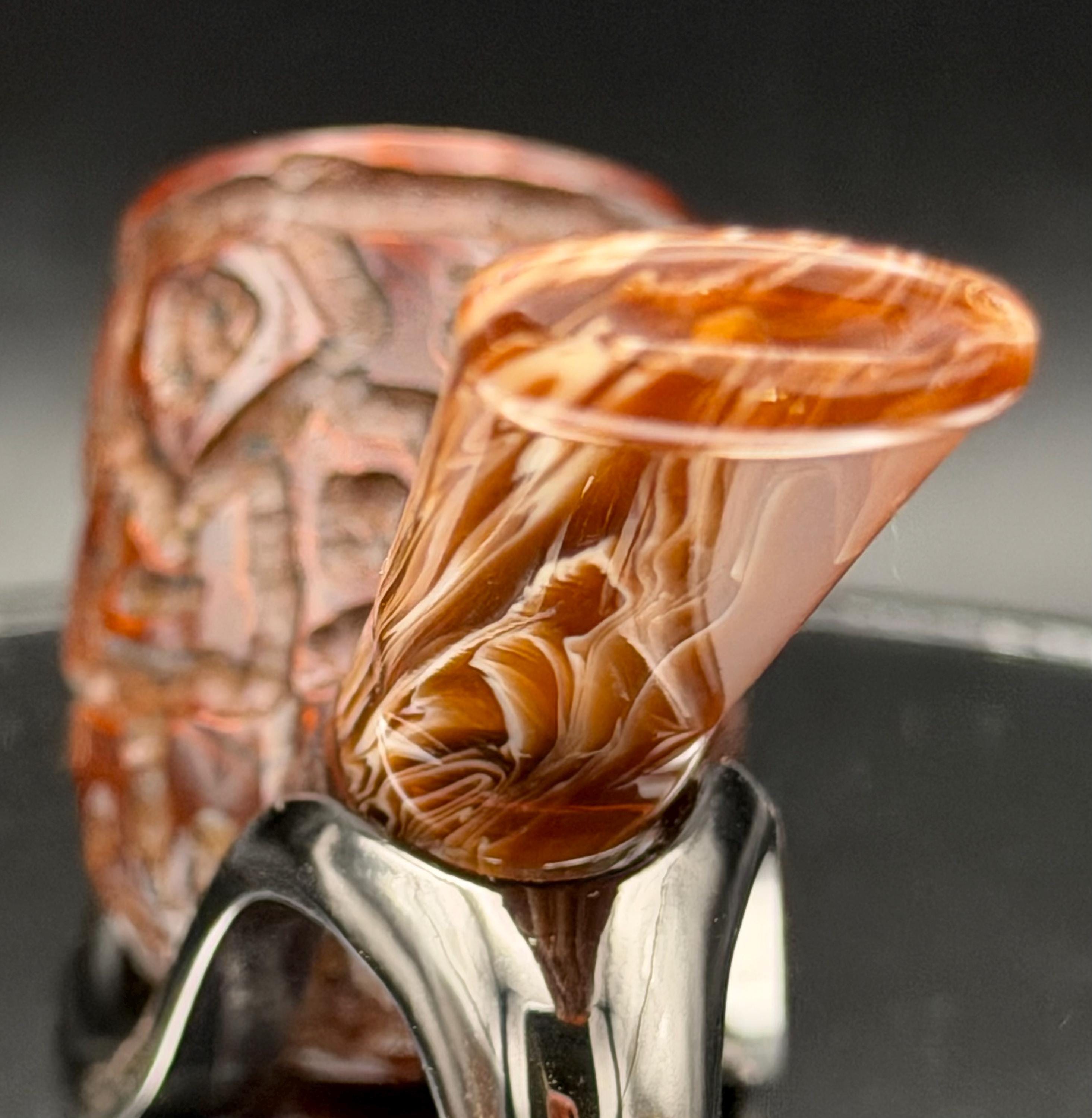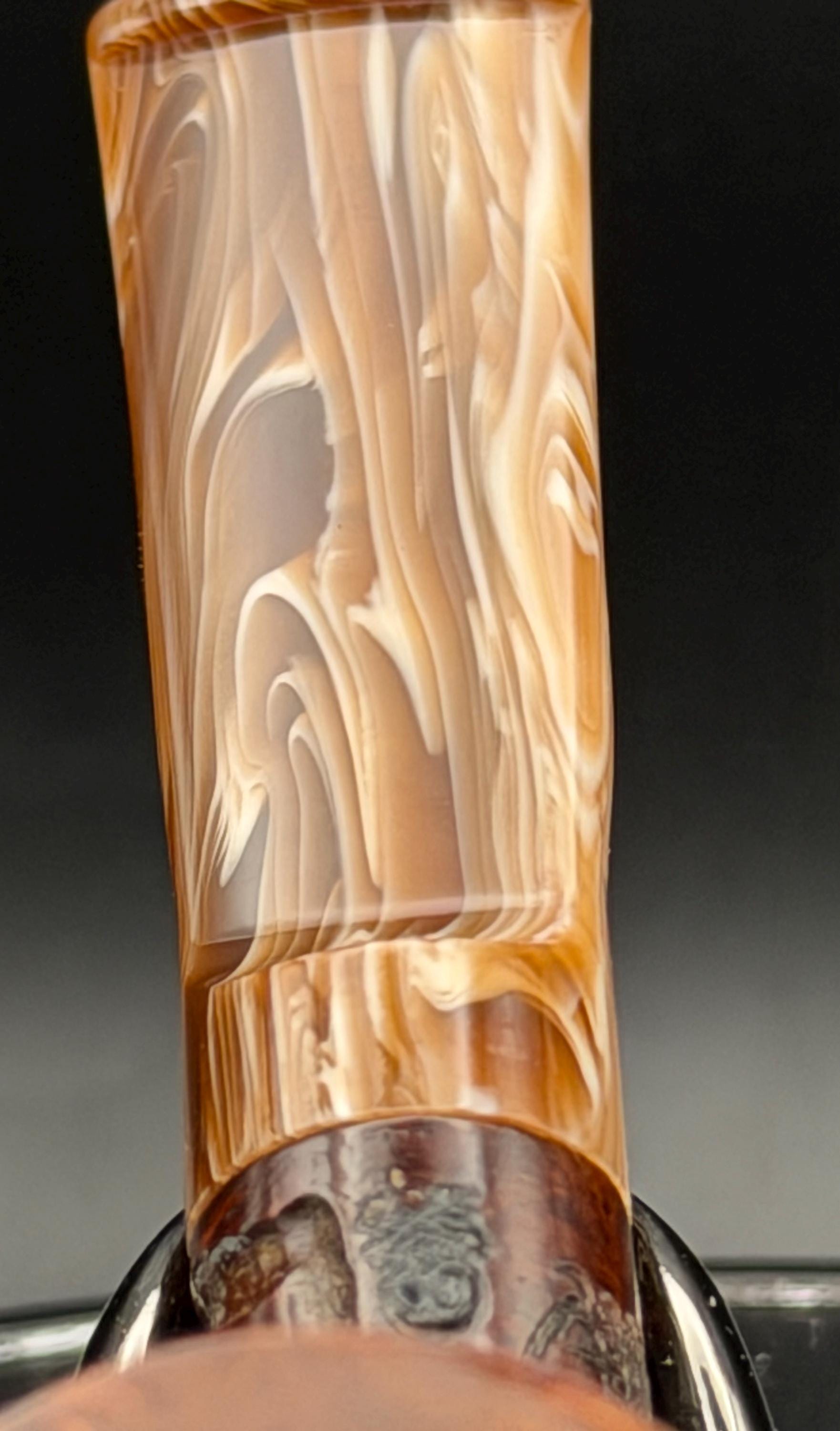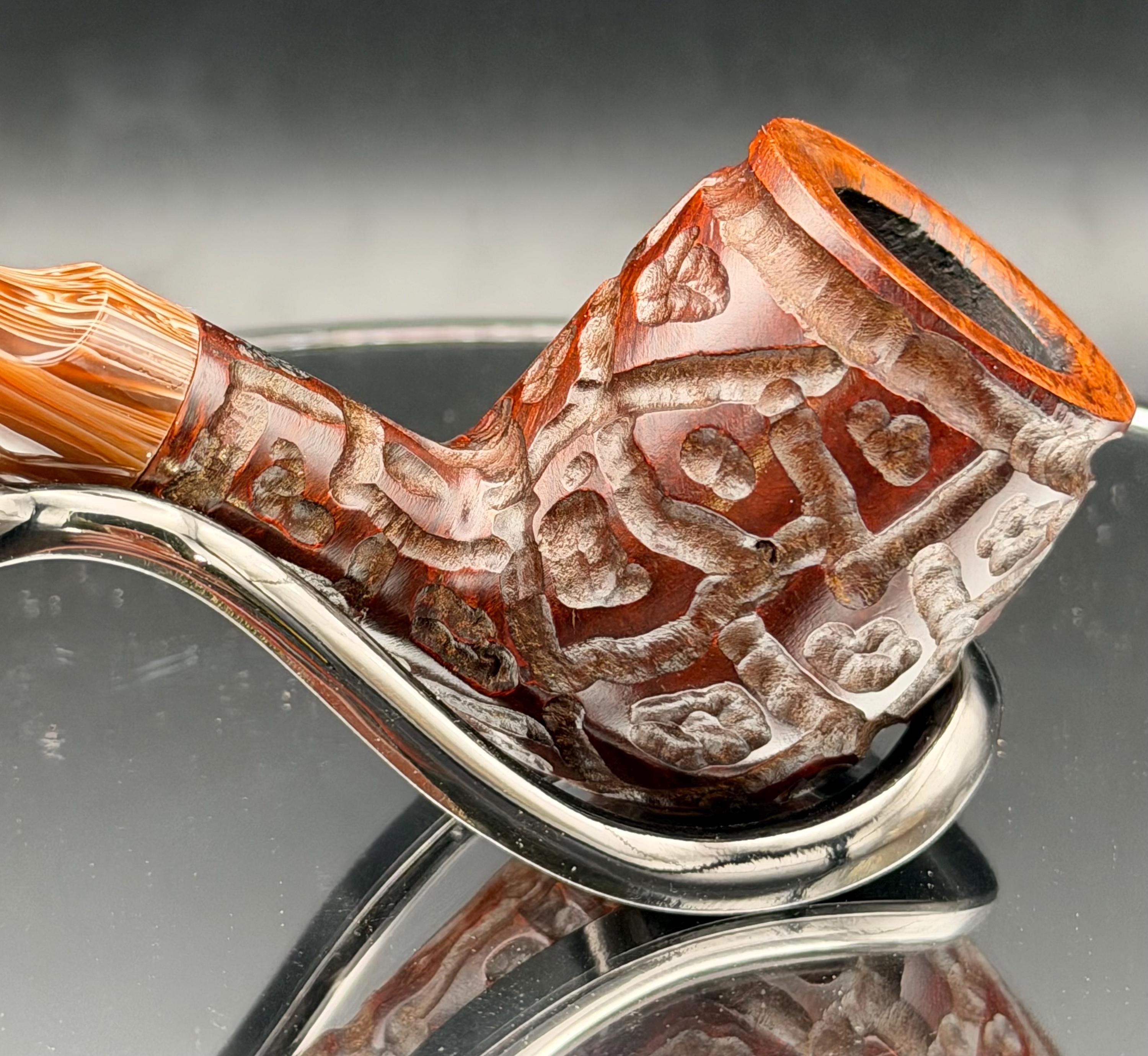 This is a handmade briar pipe that has been meticulously carved and polished/ partially rusticated . Acrylic custom made stem. Non filtered. A very nice daily smoker.A shorter pipe with a normal size bowl for a good smoke.