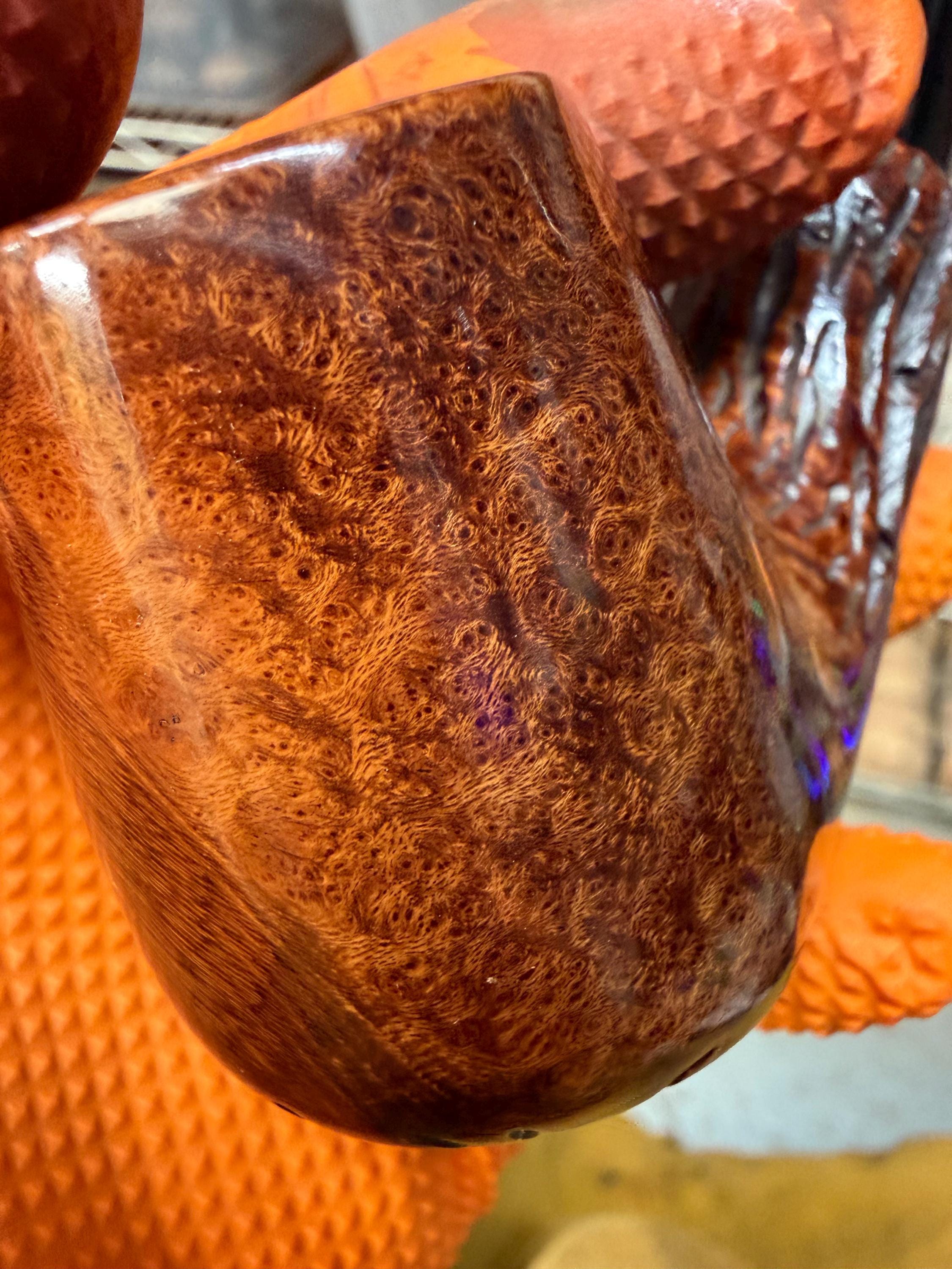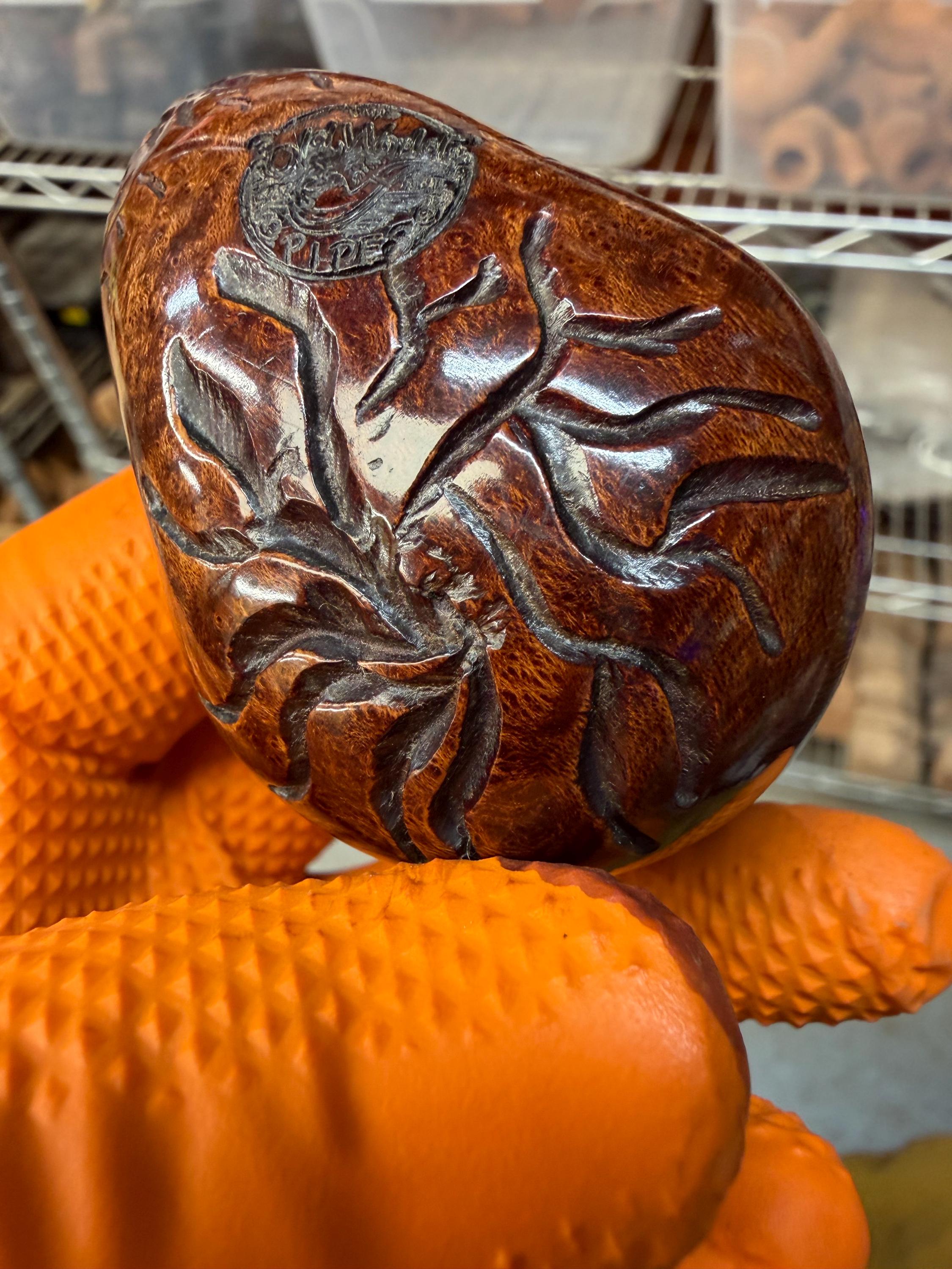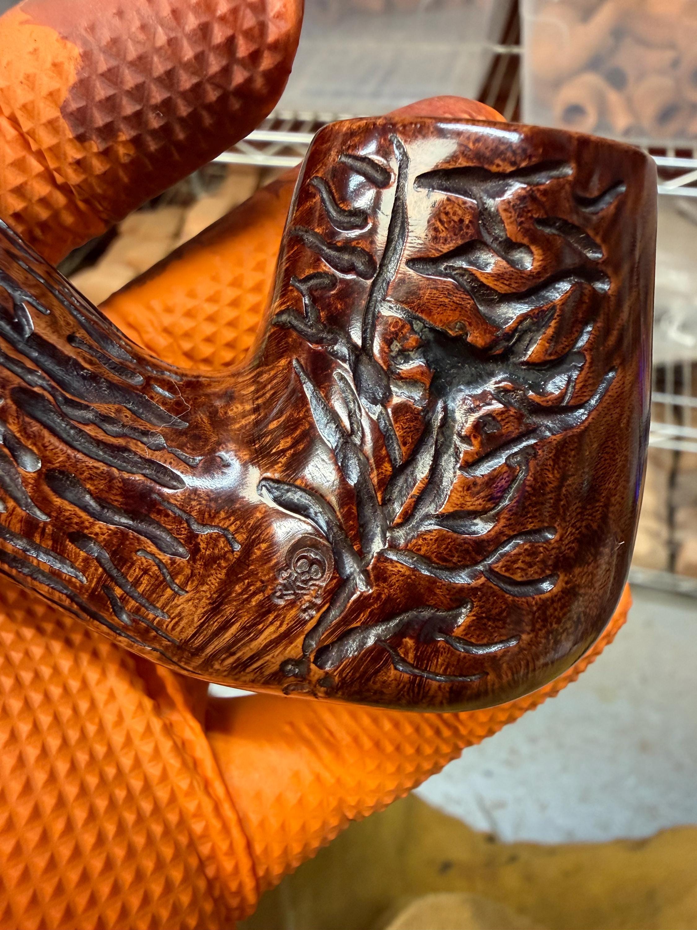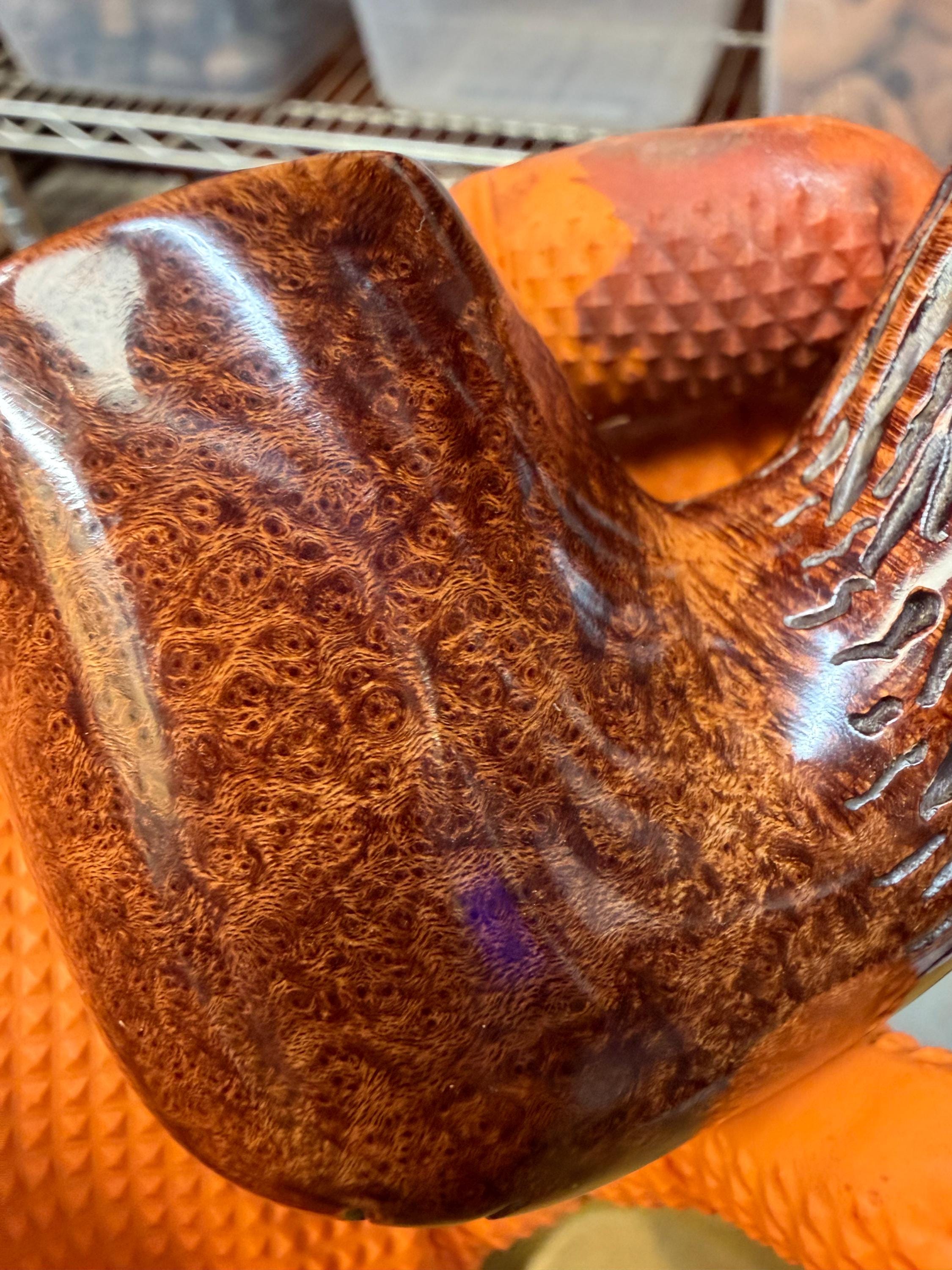 This is a handmade briar pipe that has been meticulously carved and polished/ partially rusticated . Acrylic custom made stem. Non filtered. A very nice daily smoker.Larger pipe