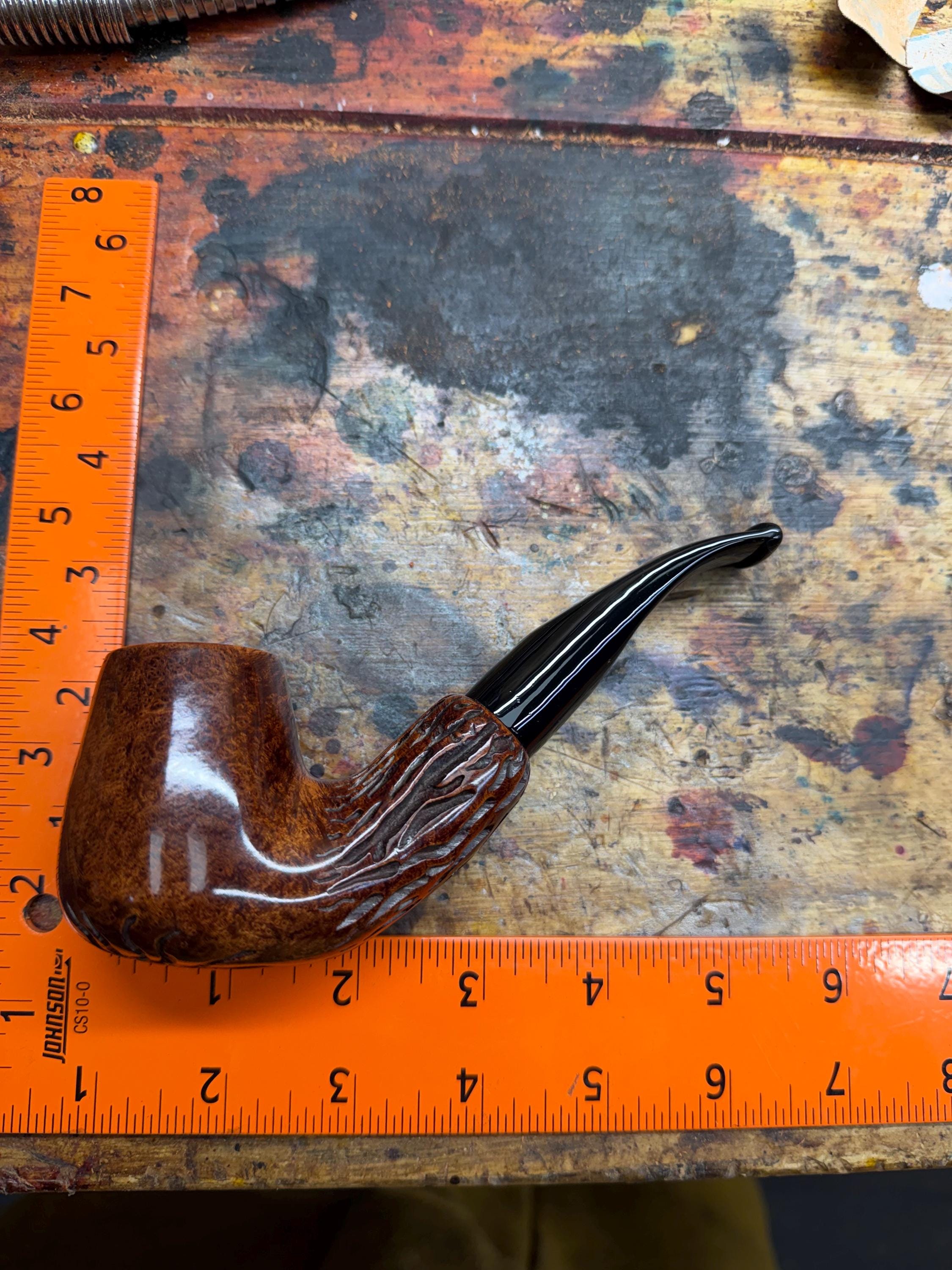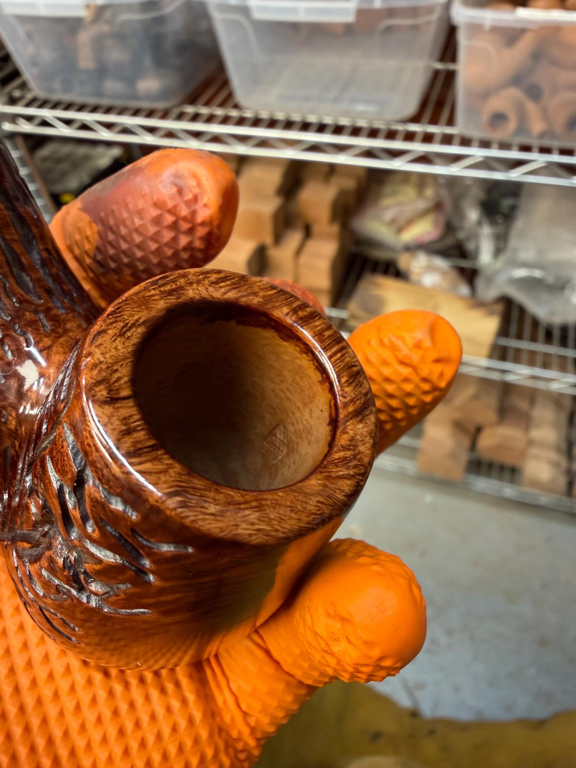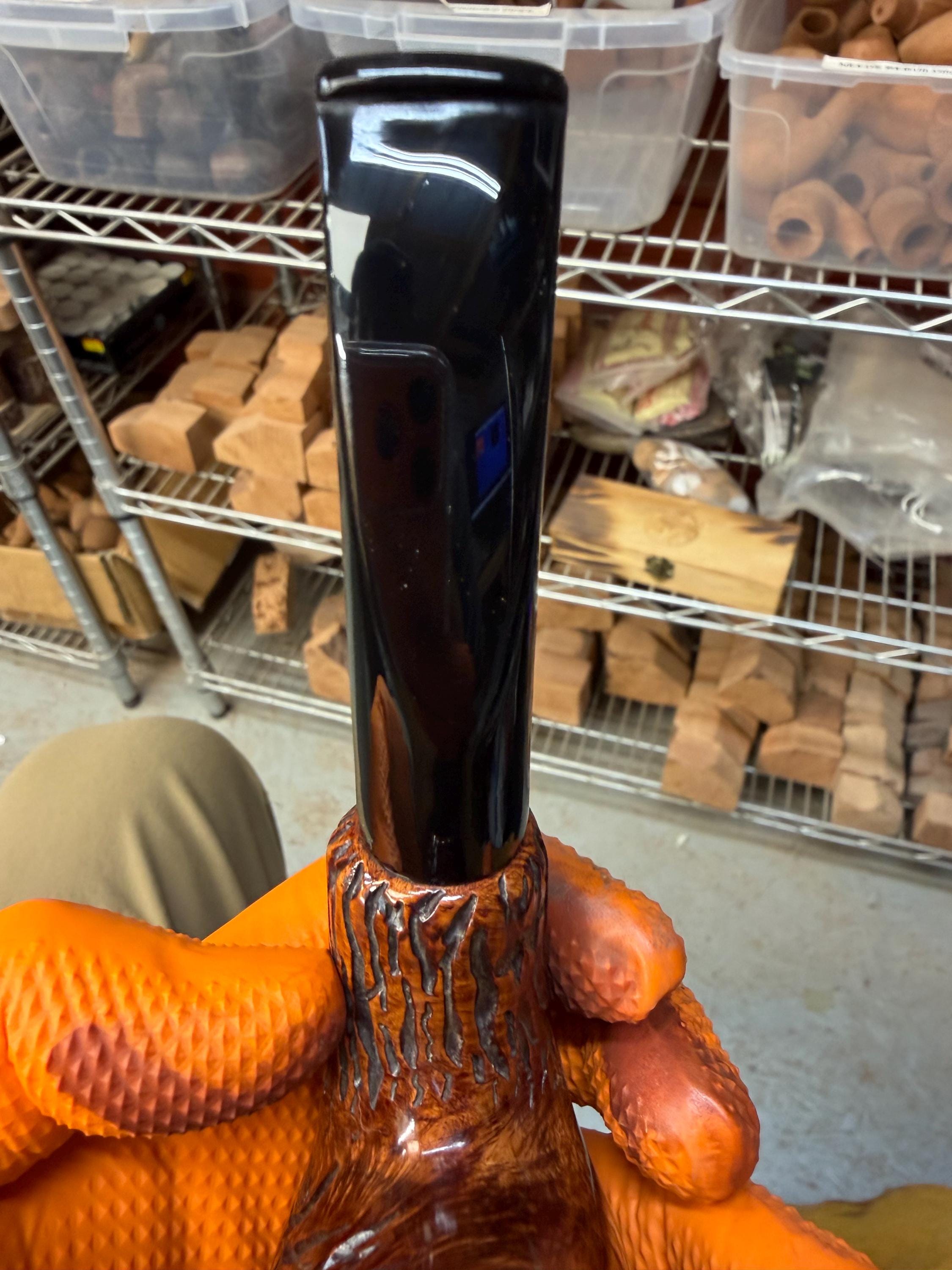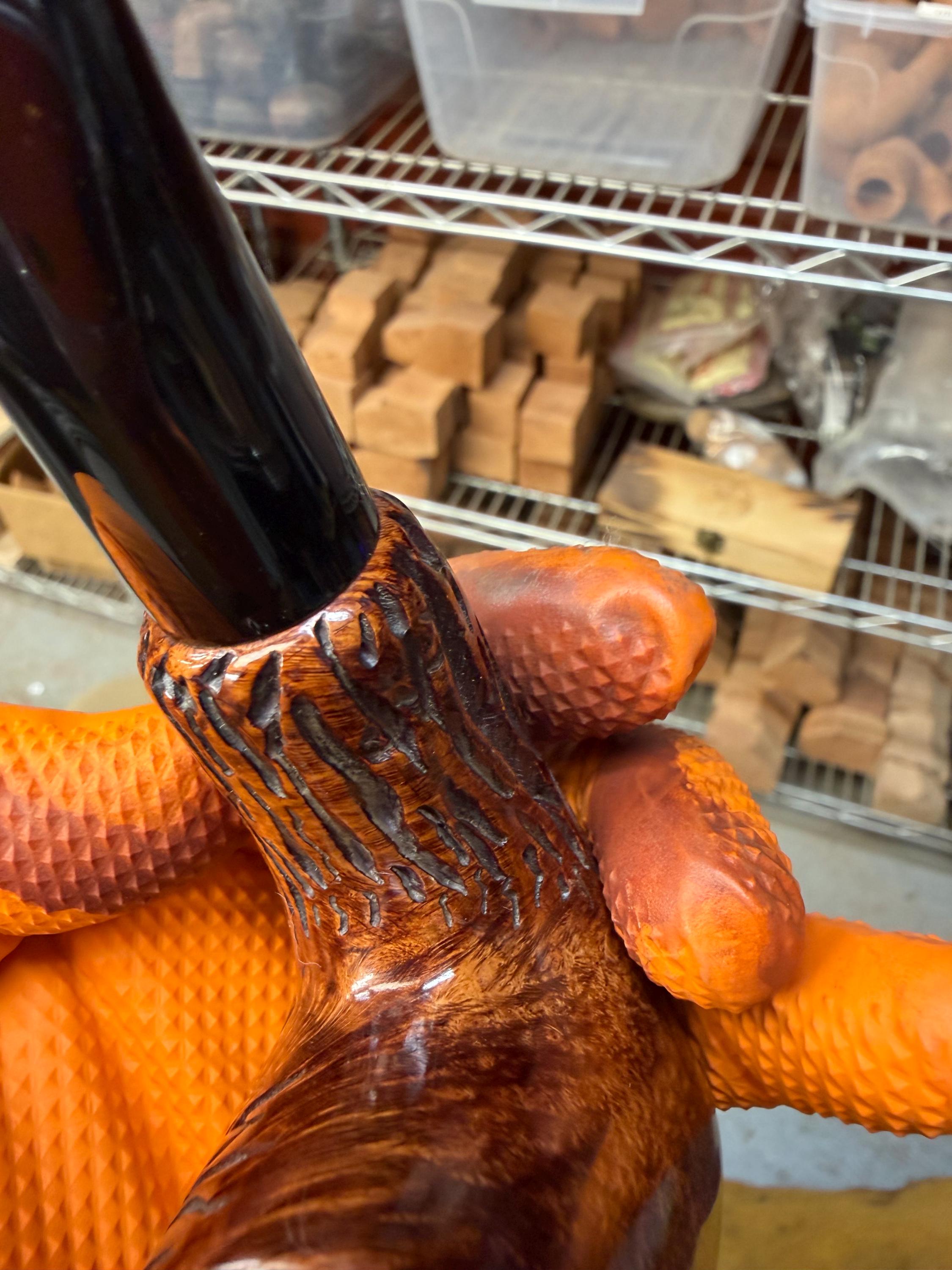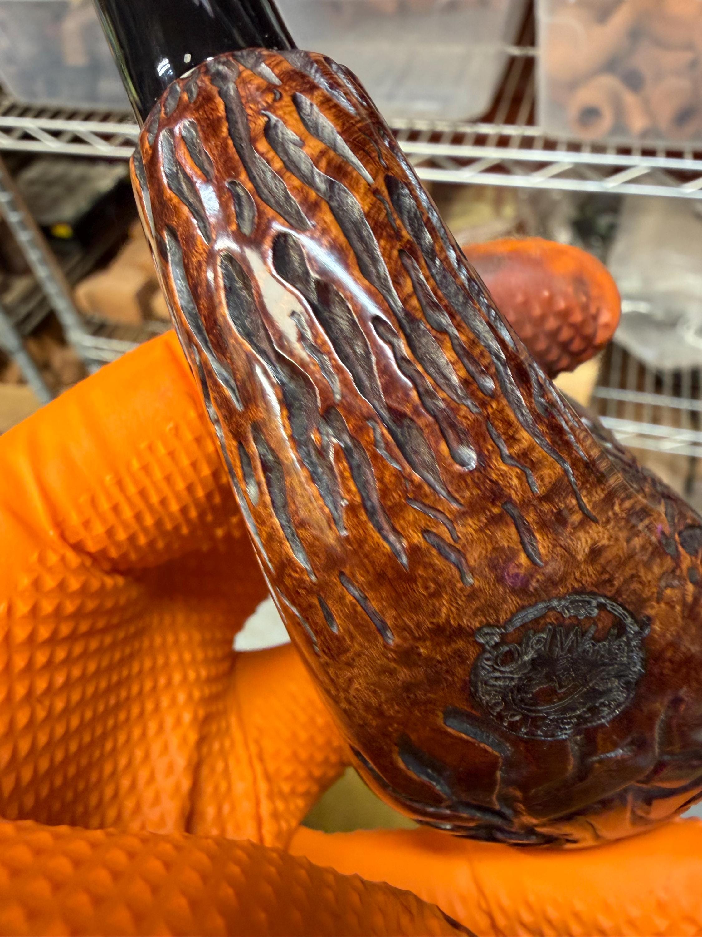 This is a handmade briar pipe that has been meticulously carved and polished/ partially rusticated . Acrylic custom made stem. Non filtered. A very nice daily smoker.Larger pipe
