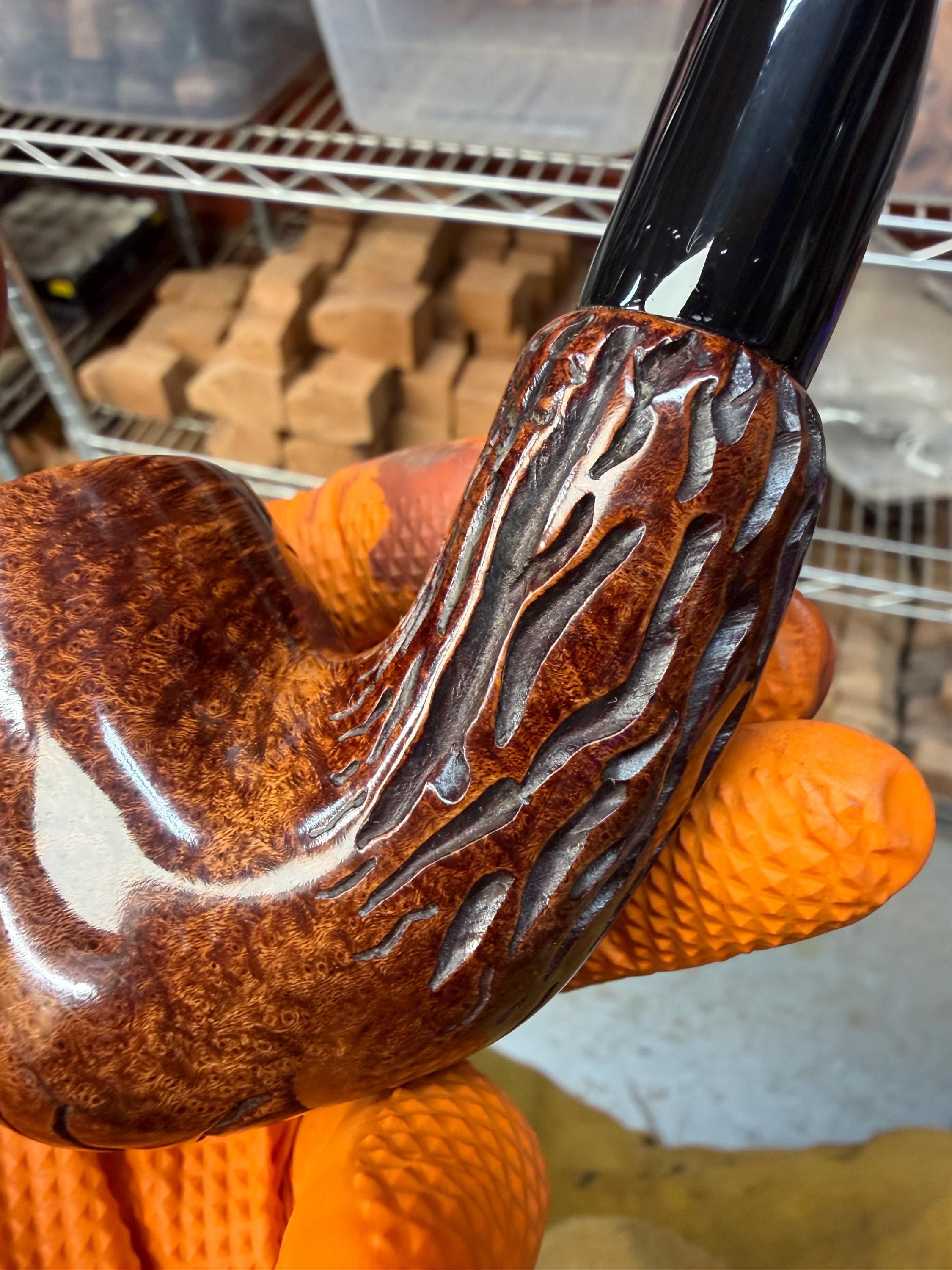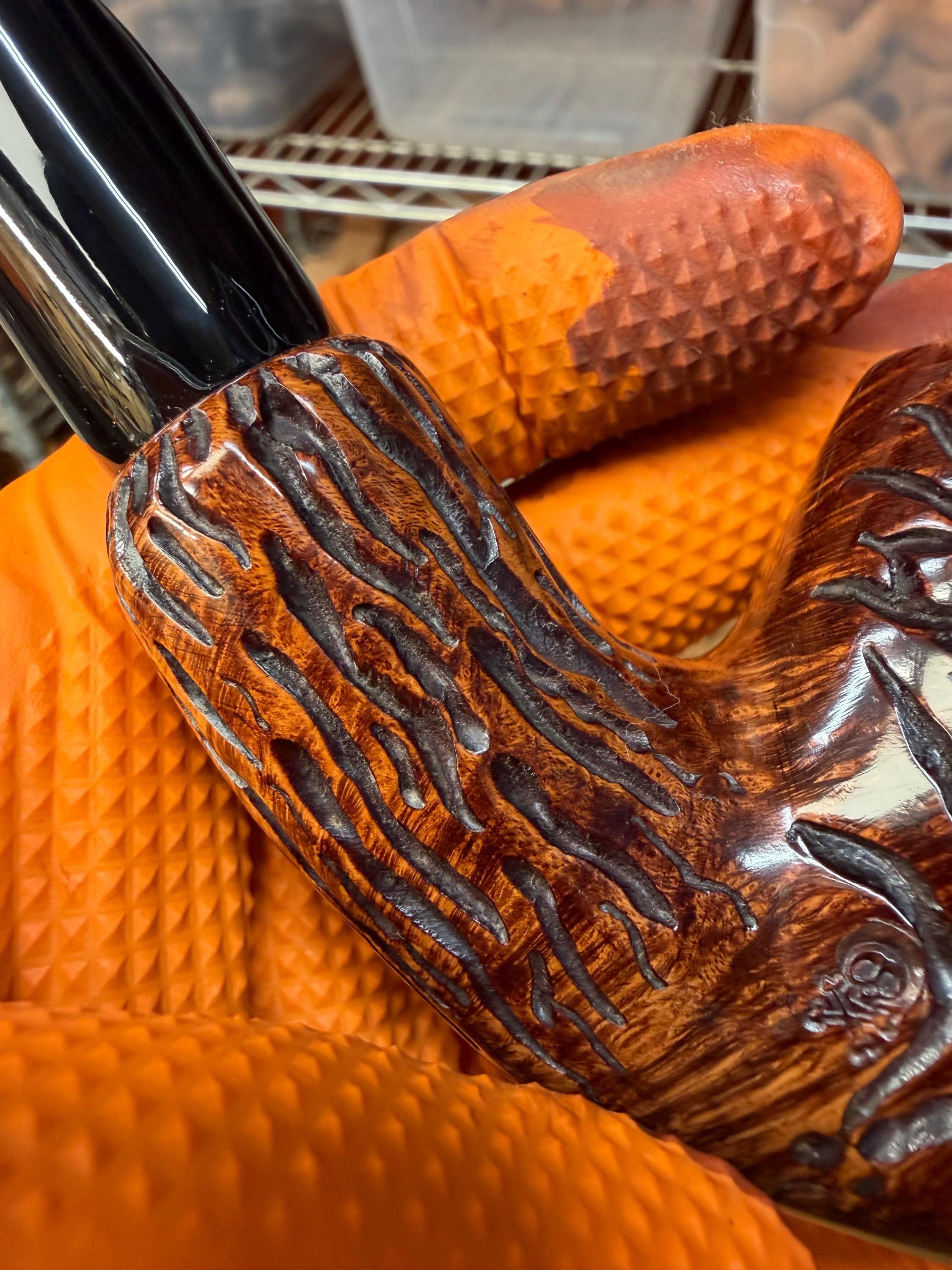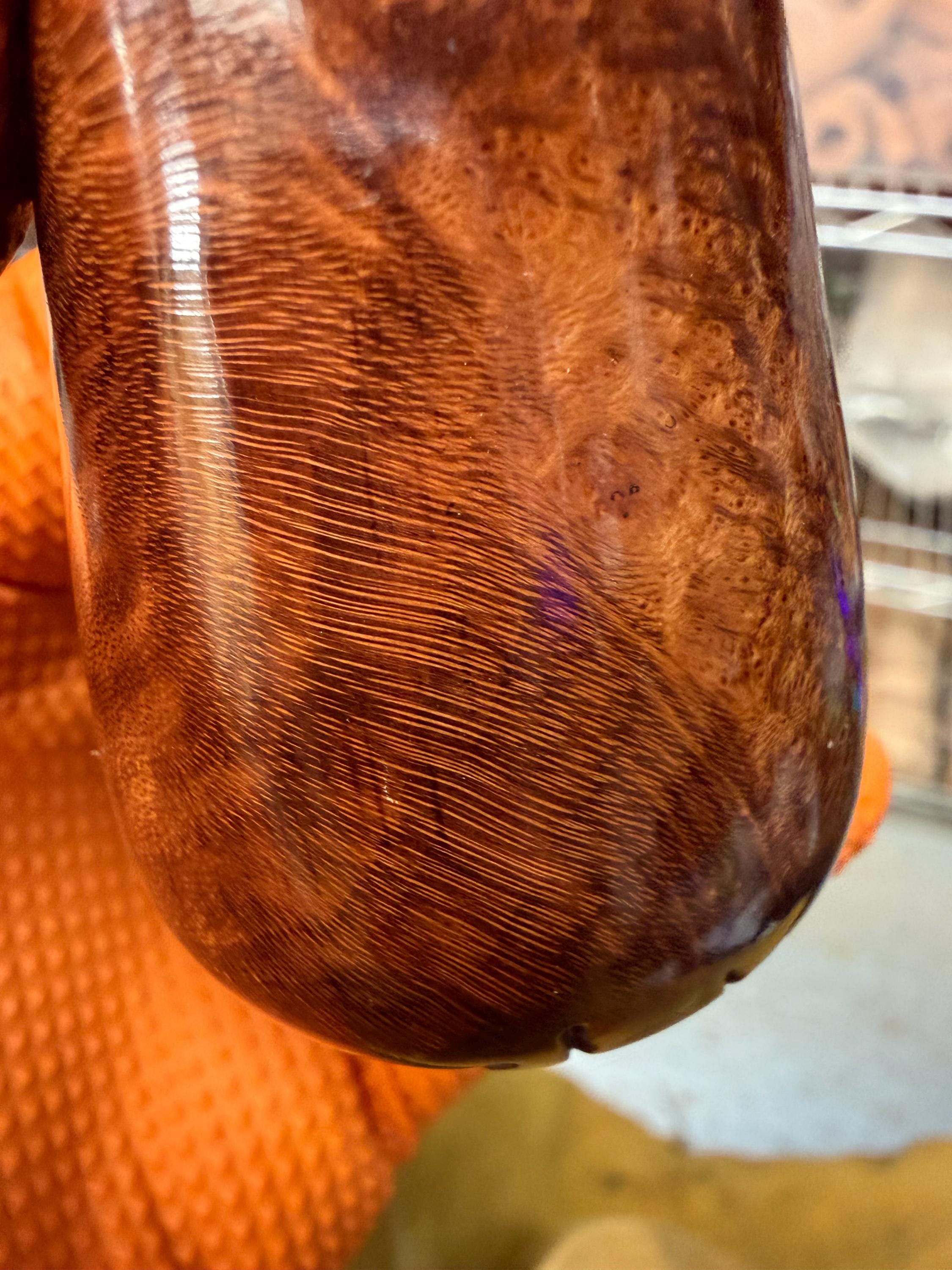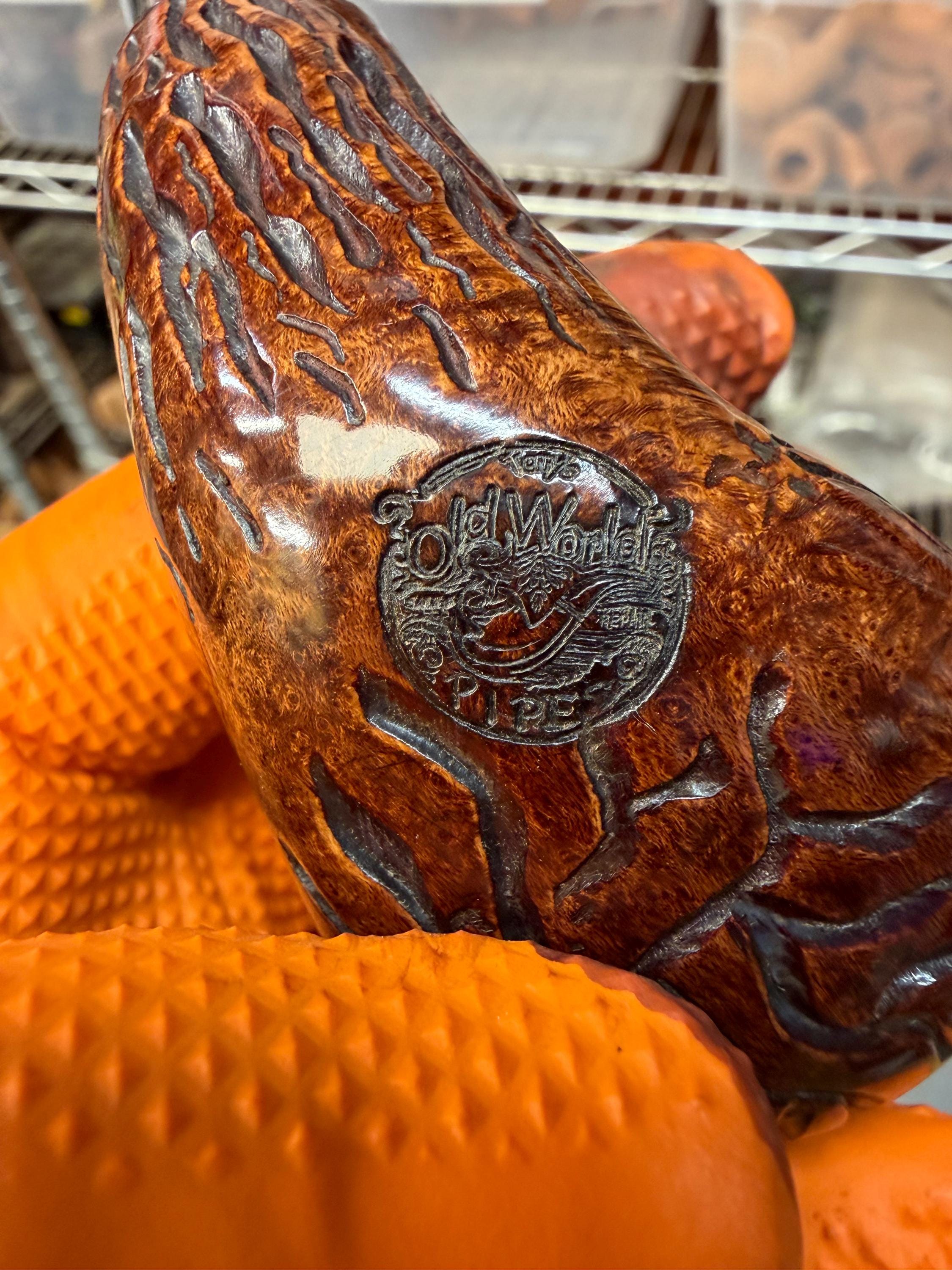This is a handmade briar pipe that has been meticulously carved and polished/ partially rusticated . Acrylic custom made stem. Non filtered. A very nice daily smoker.Larger pipe