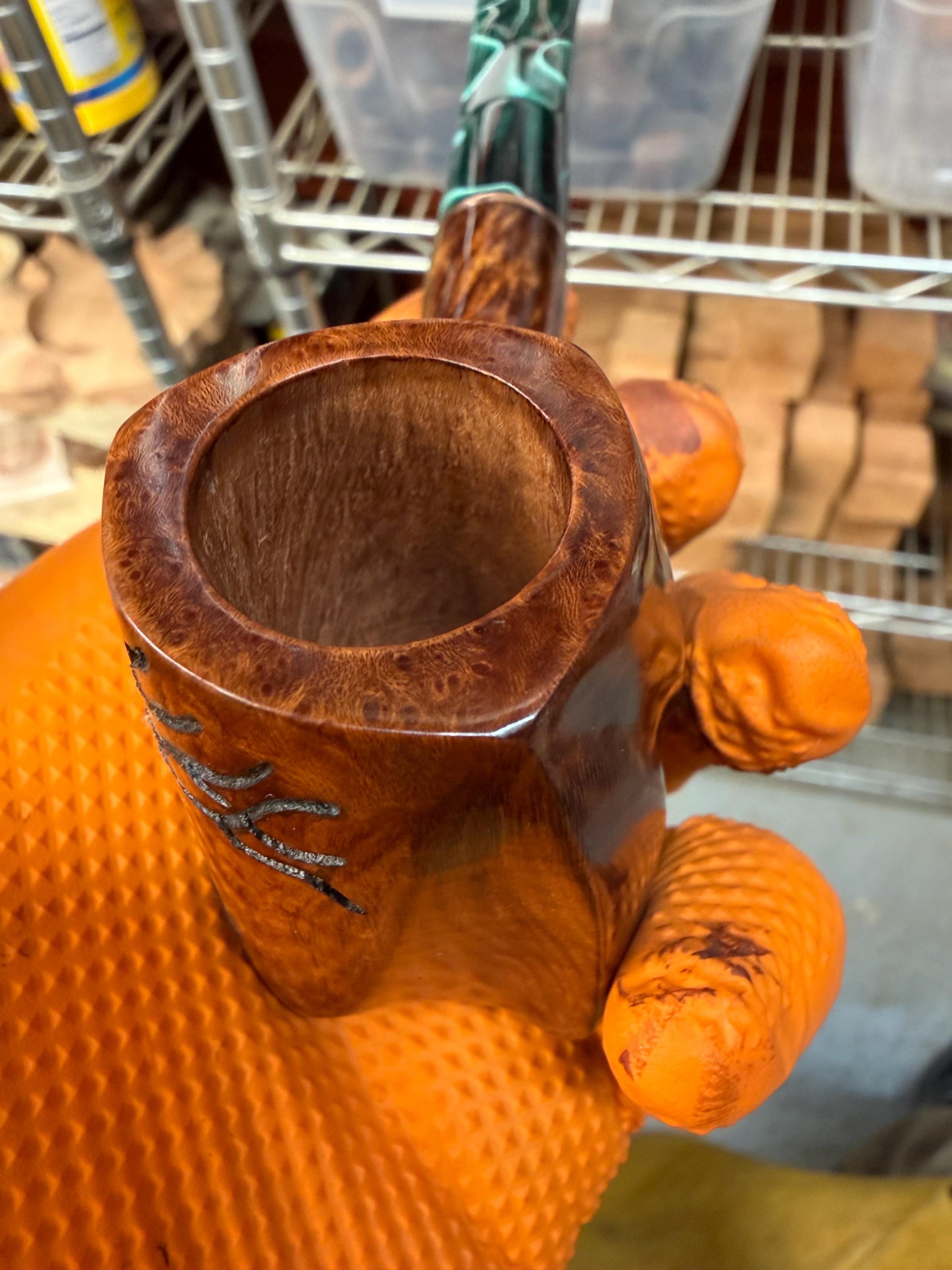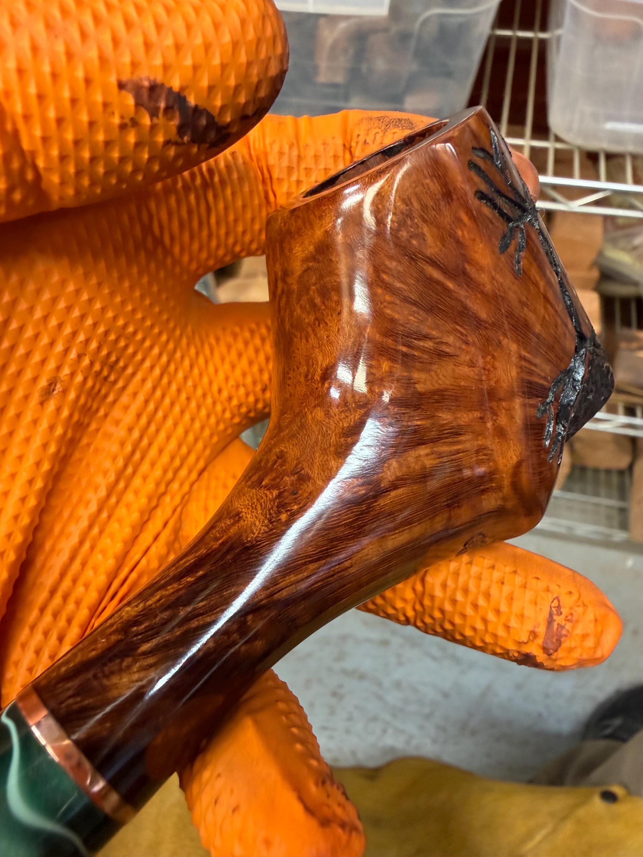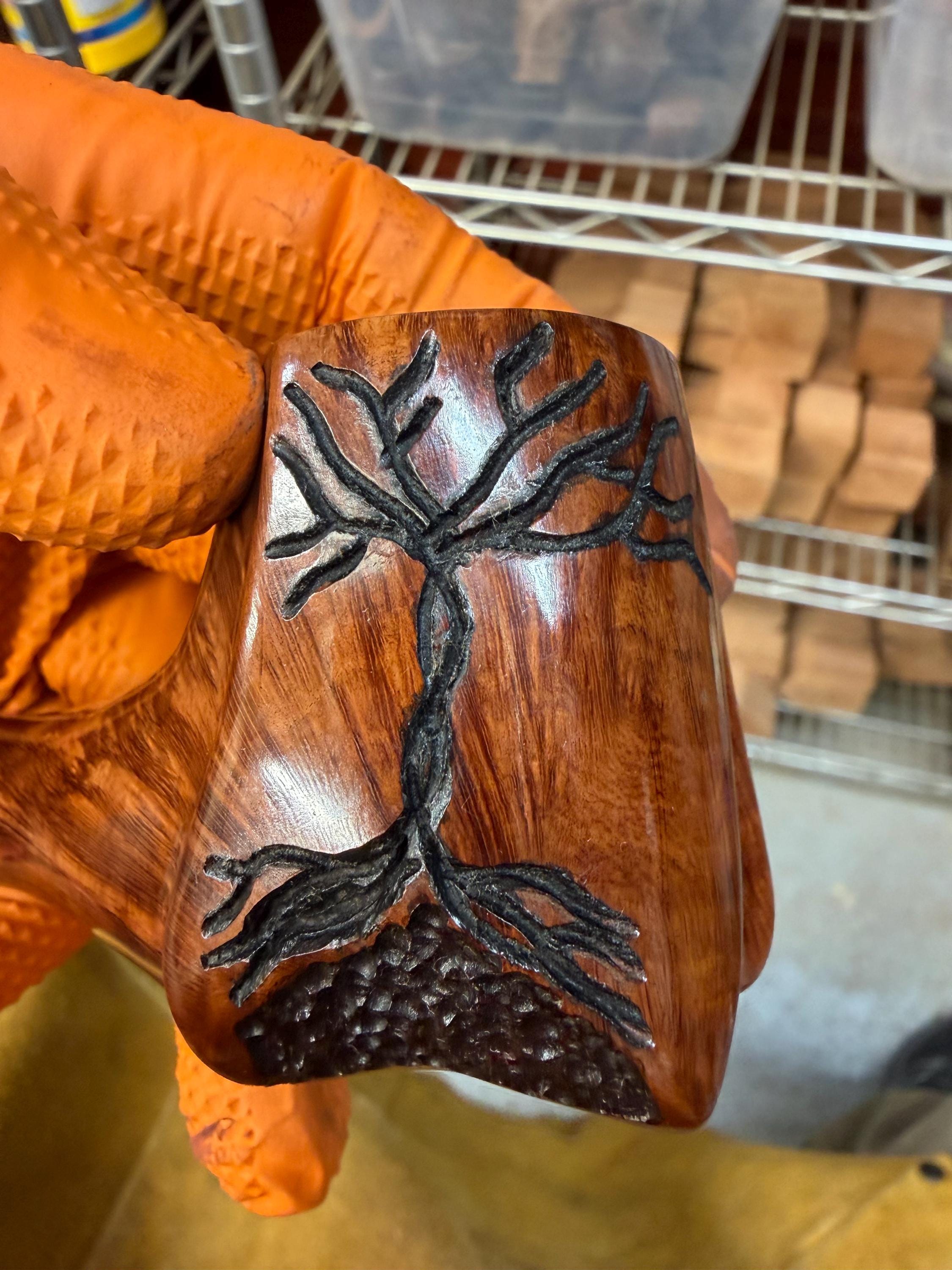 This is a handmade briar pipe that has been meticulously carved and polished . Acrylic custom made stem. Tree of life carving .Non filtered. A very nice daily smoker.