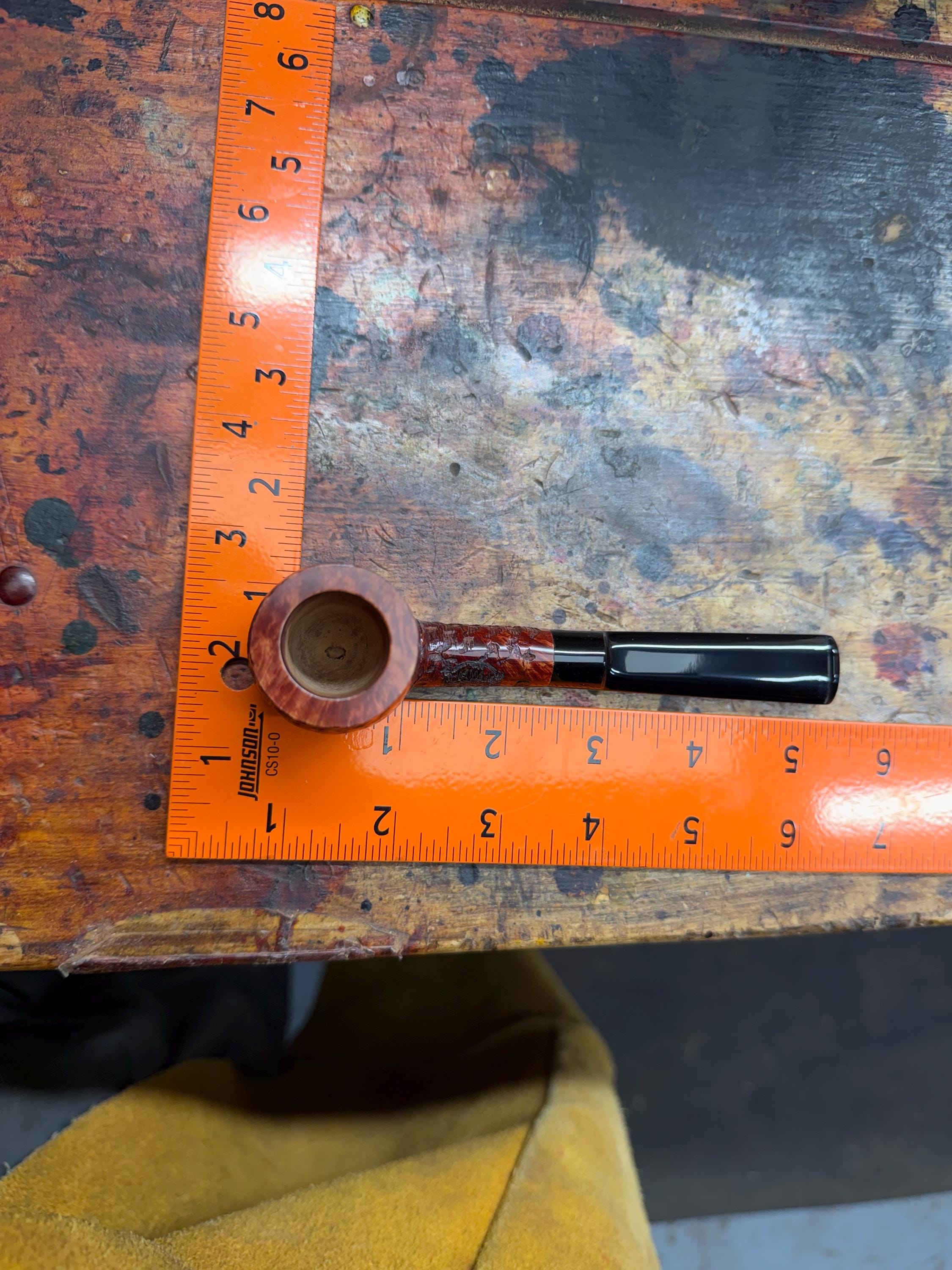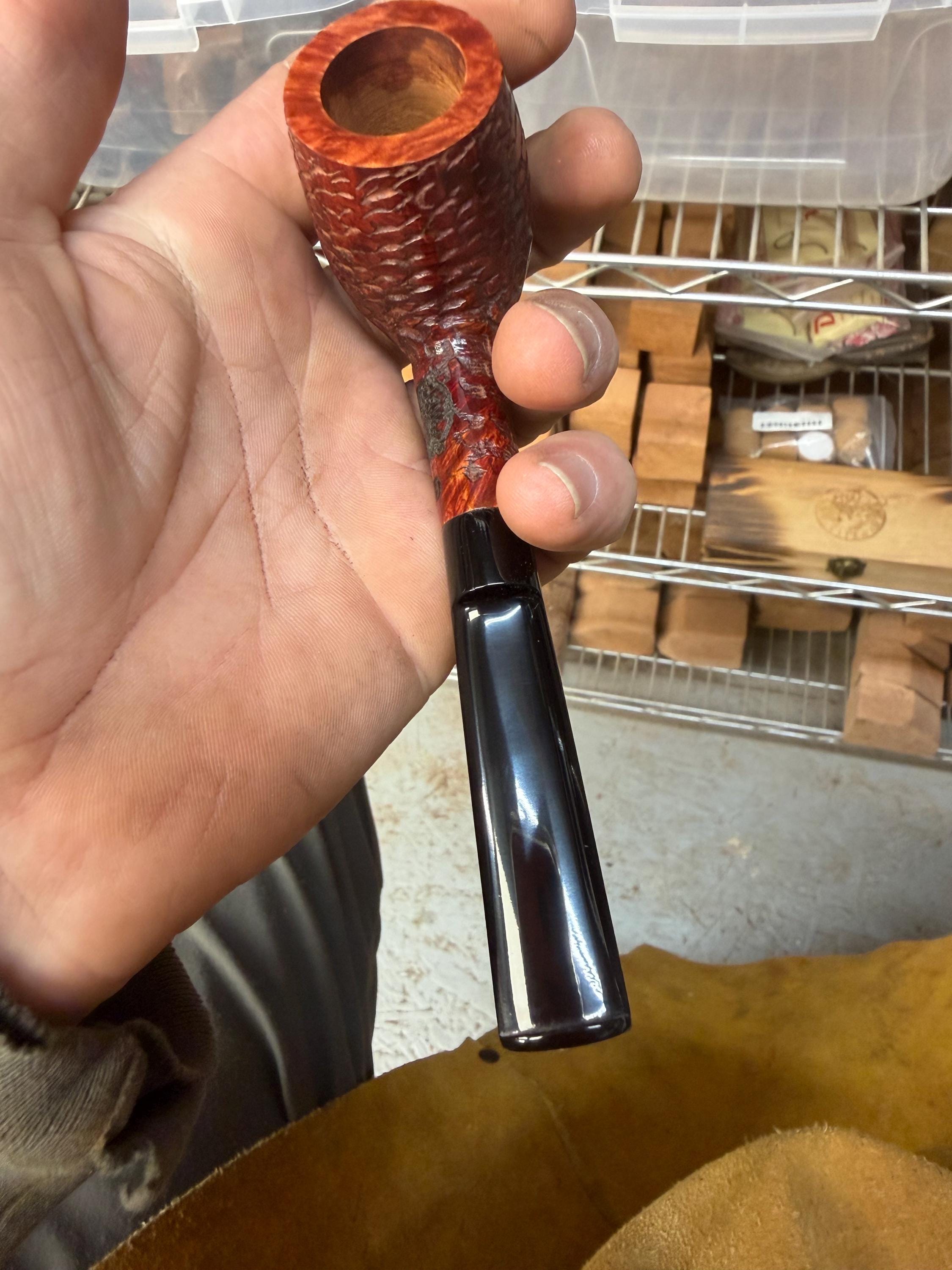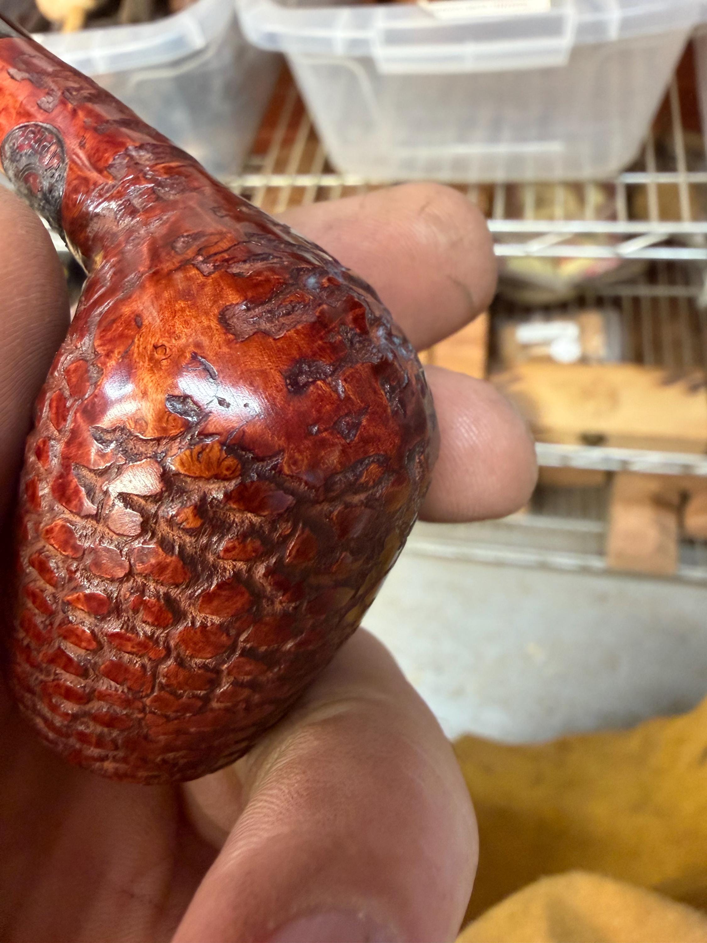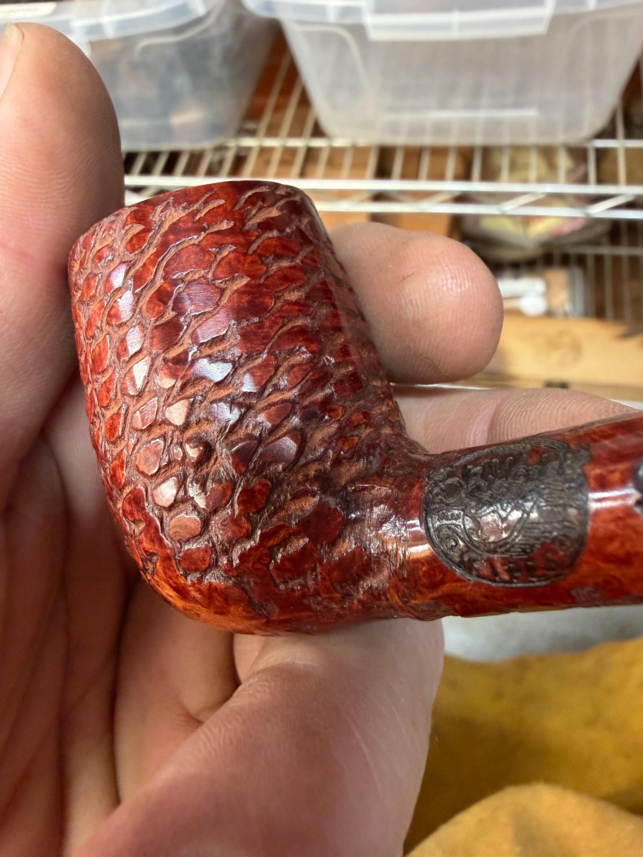 This is a handmade briar pipe that has been meticulously carved and rusticated . Vulcanite custom made stem. Non filtered. A very nice daily smoker. medium size for your pocket!