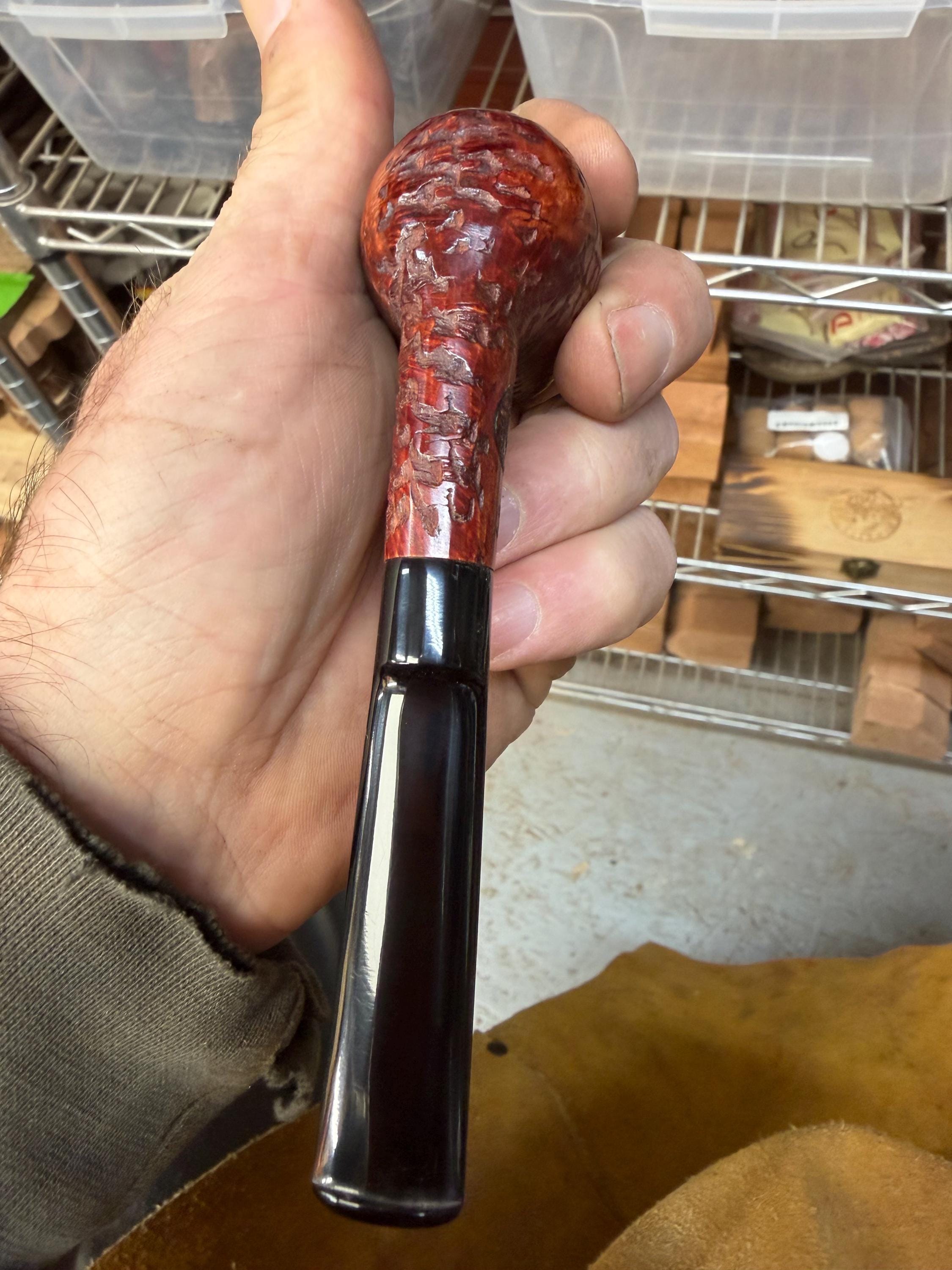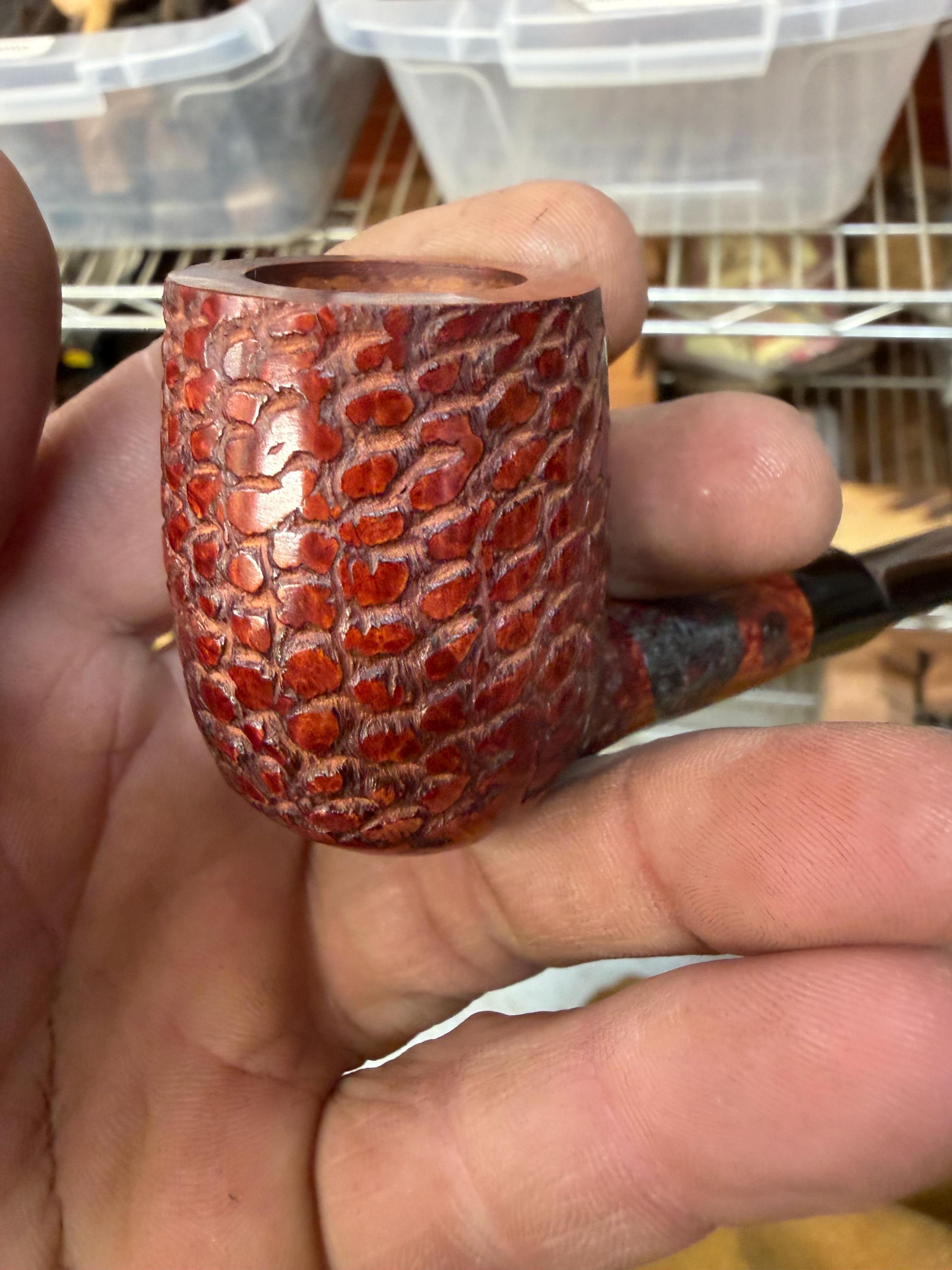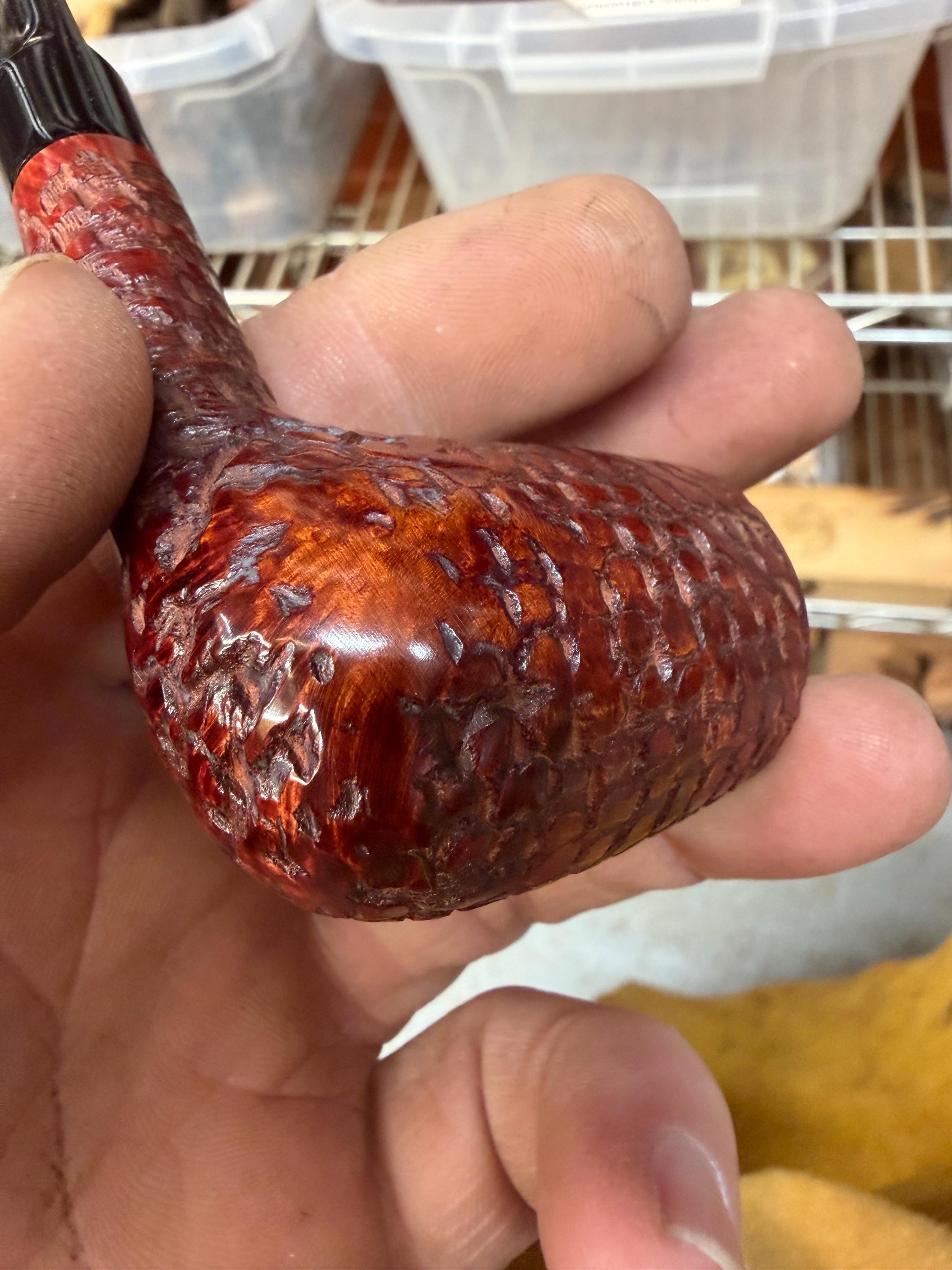 This is a handmade briar pipe that has been meticulously carved and rusticated . Vulcanite custom made stem. Non filtered. A very nice daily smoker. medium size for your pocket!