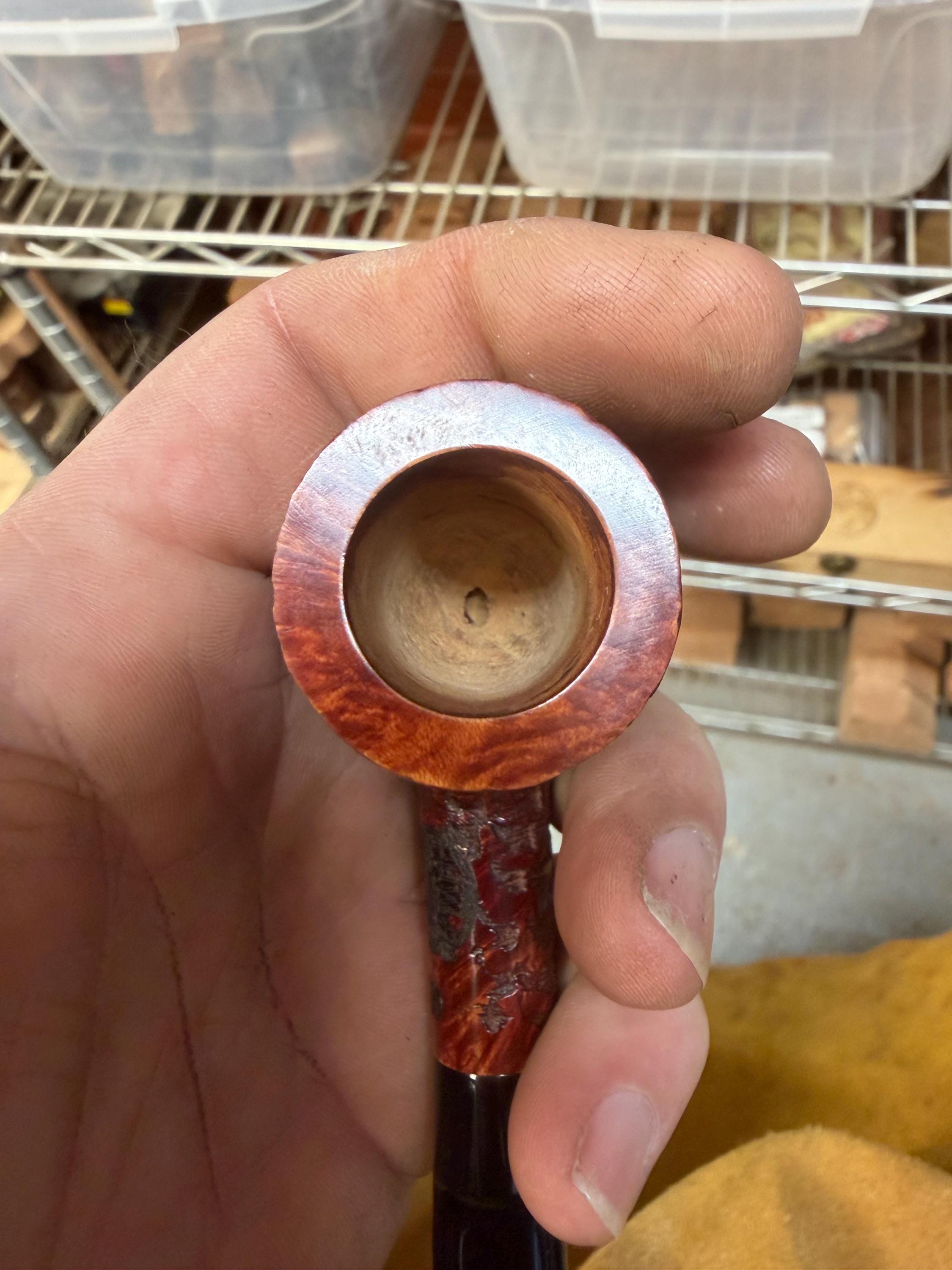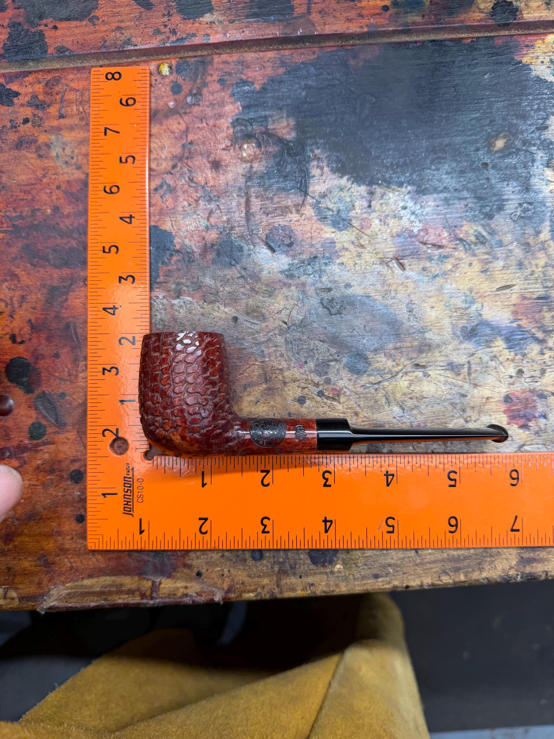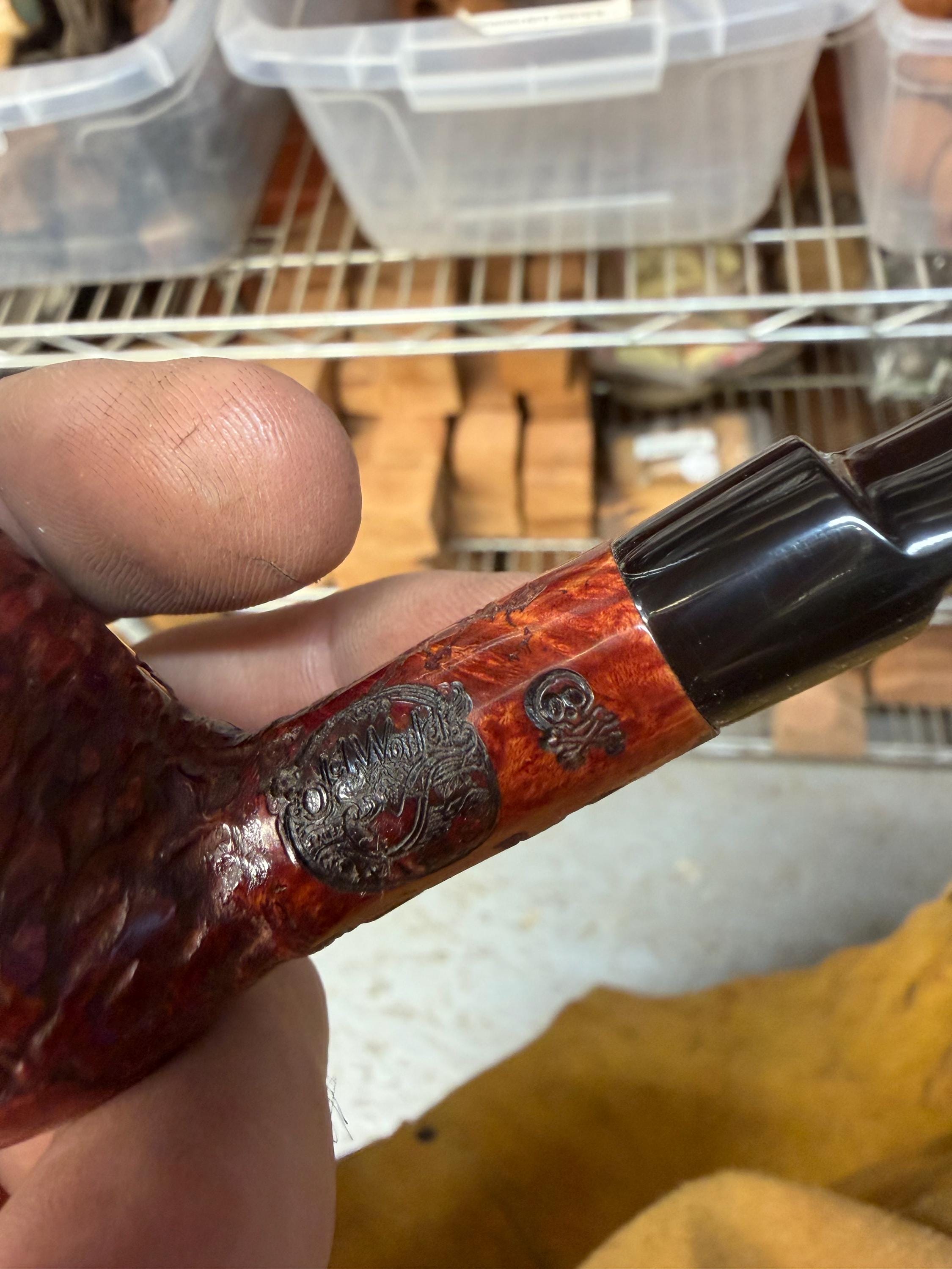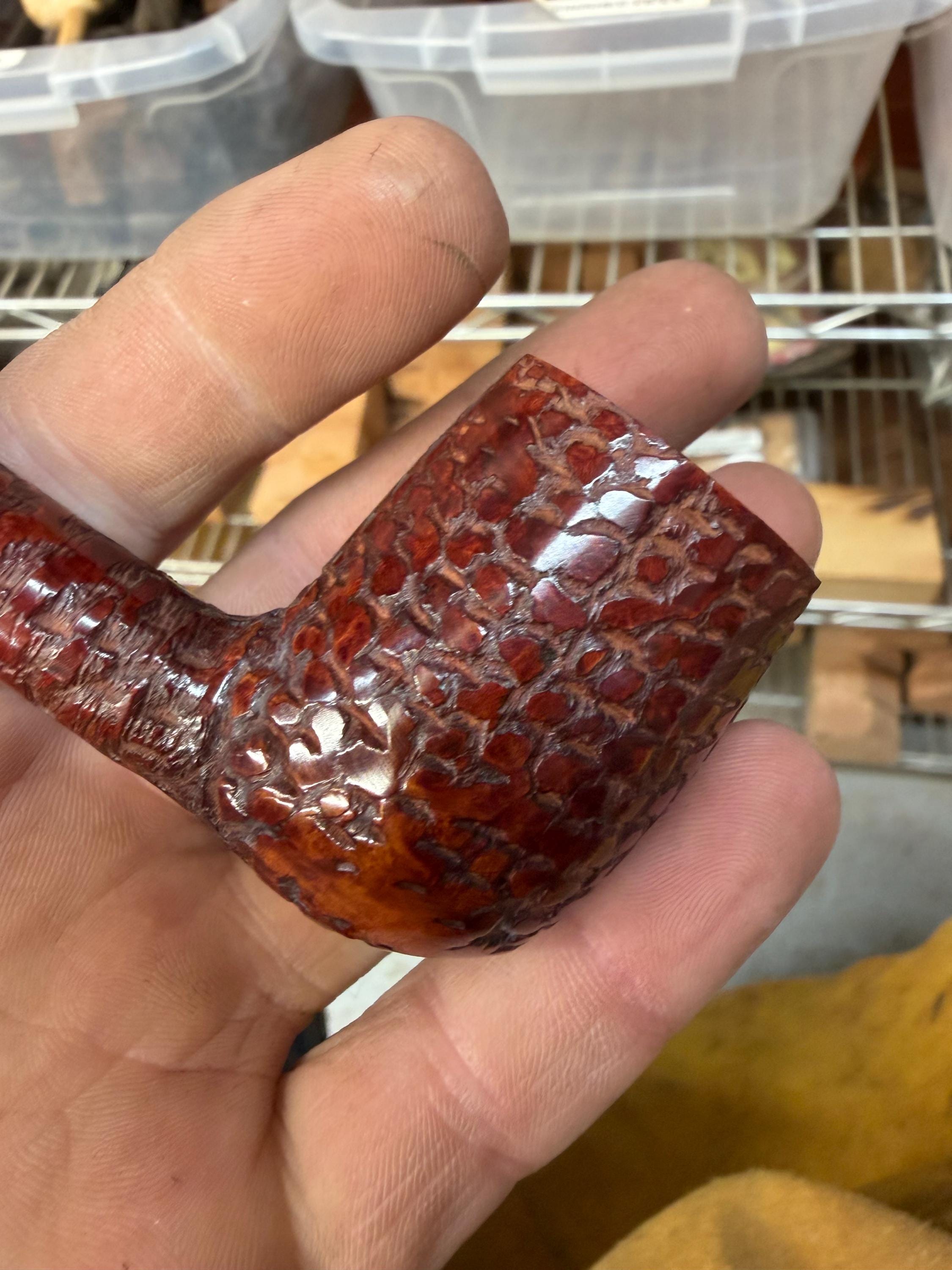 This is a handmade briar pipe that has been meticulously carved and rusticated . Vulcanite custom made stem. Non filtered. A very nice daily smoker. medium size for your pocket!