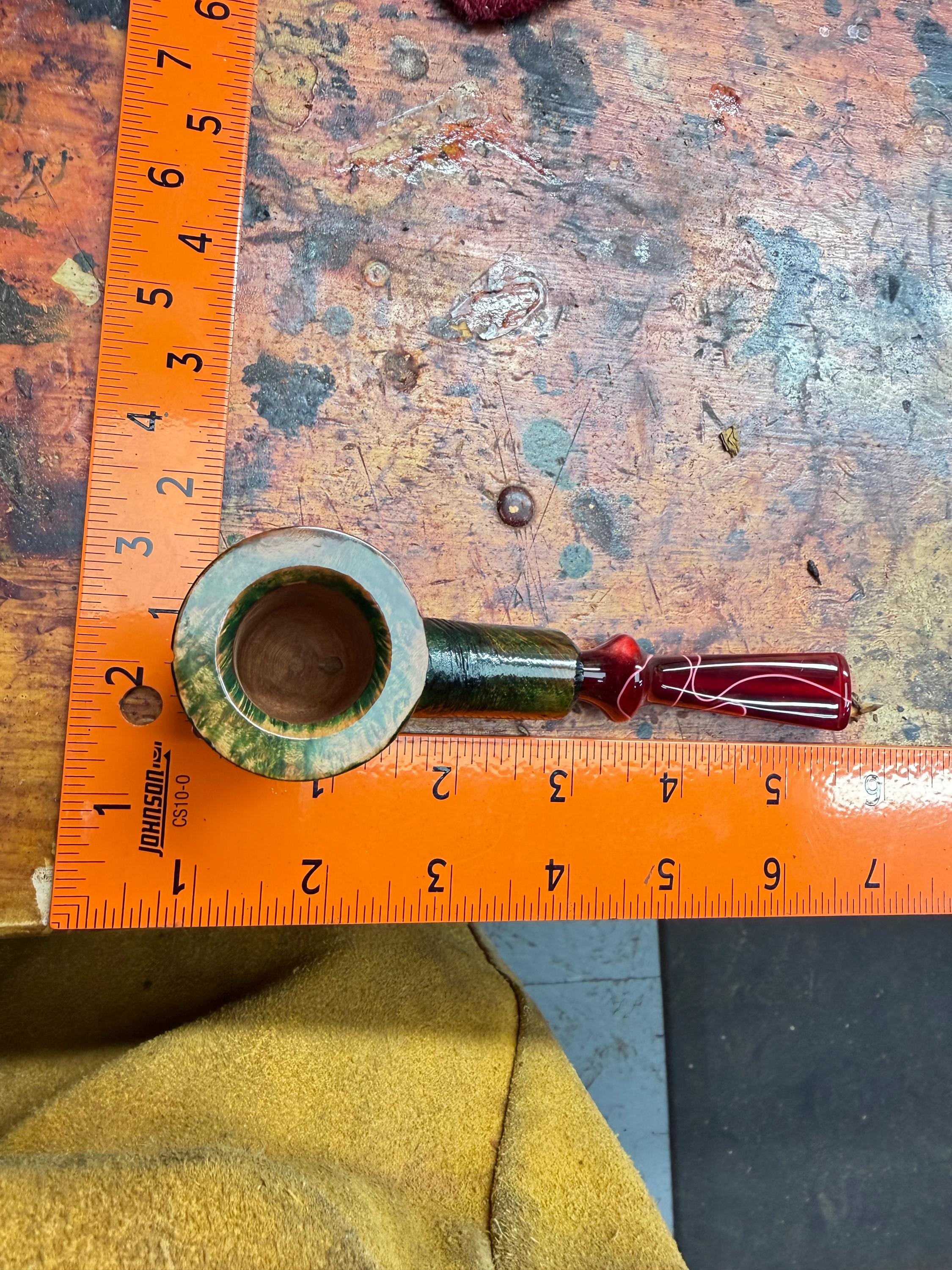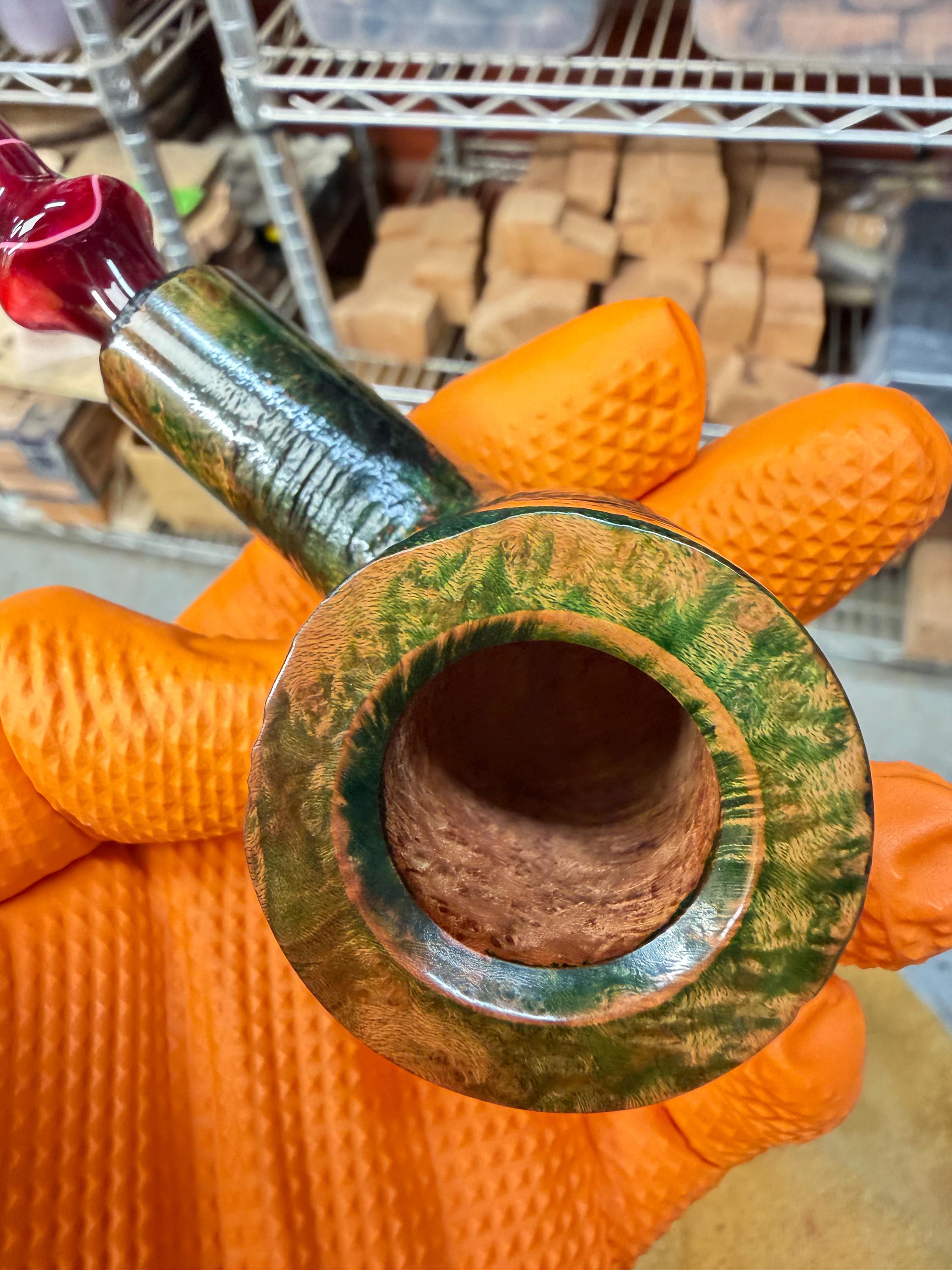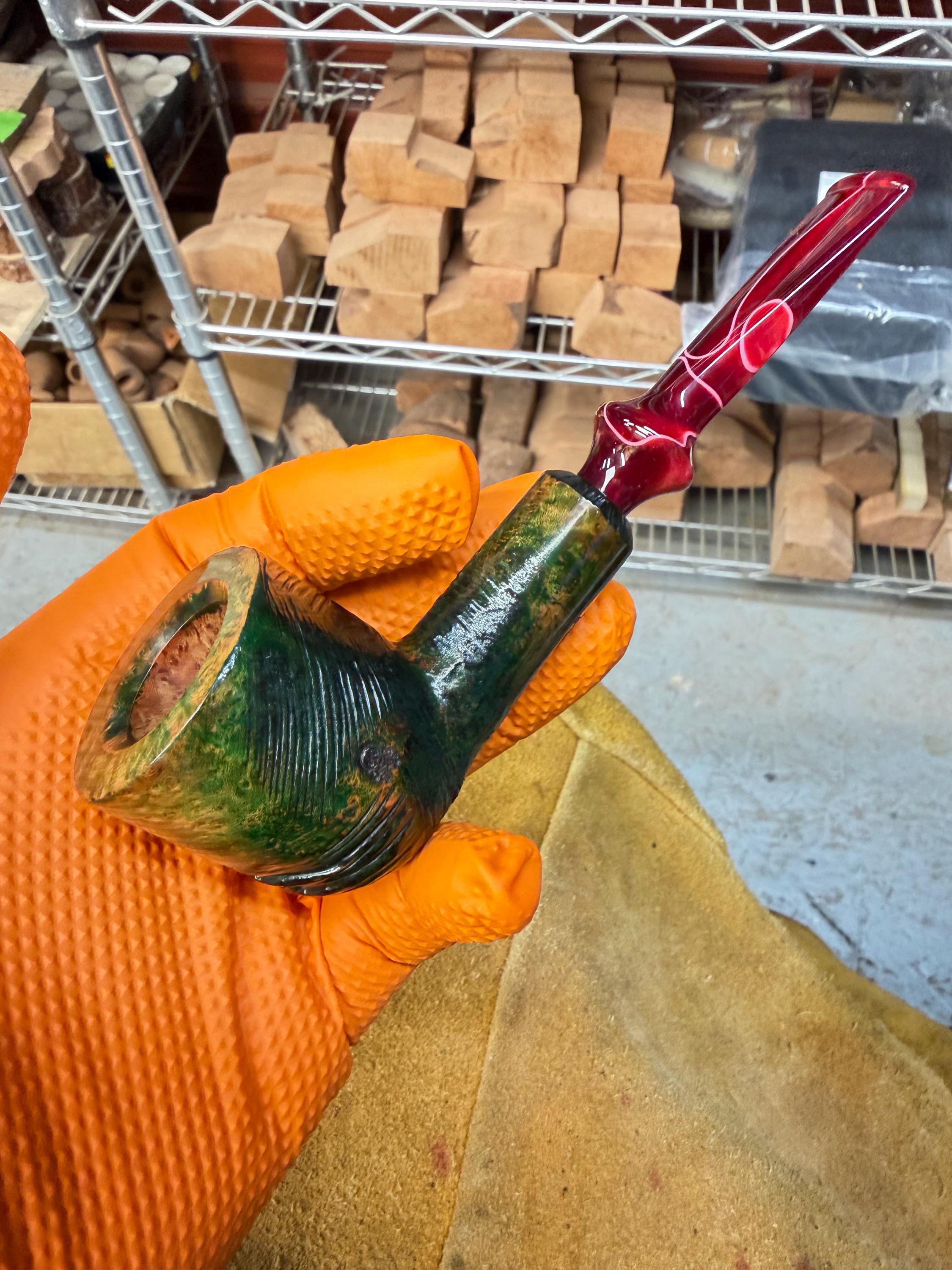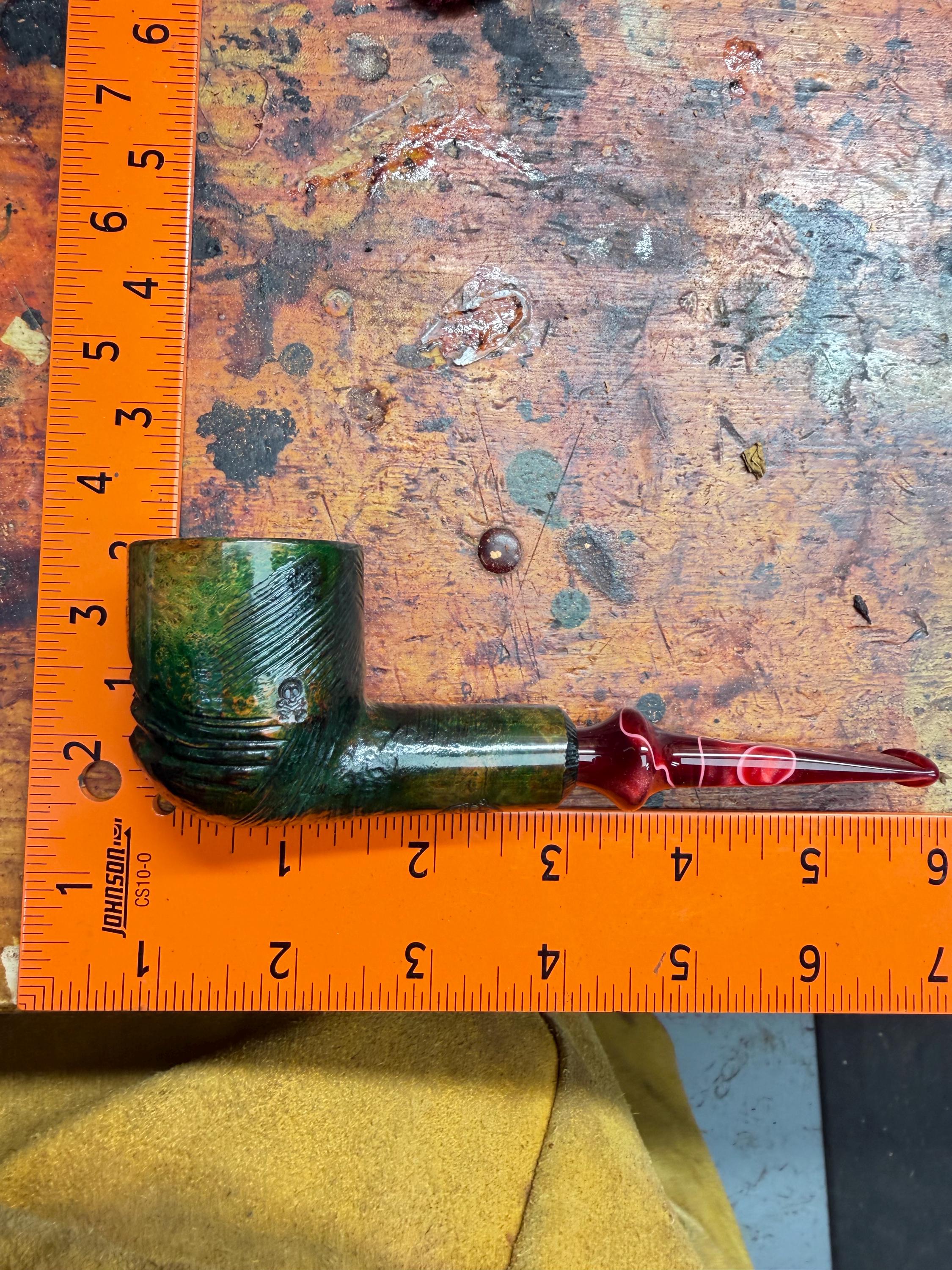 This is a handmade briar pipe that has been meticulously carved and polished/ partially rusticated . Acrylic custom made stem. Non filtered. A very nice daily smoker. Christmas edition. Subtle green in rusticated areas and in wood grain