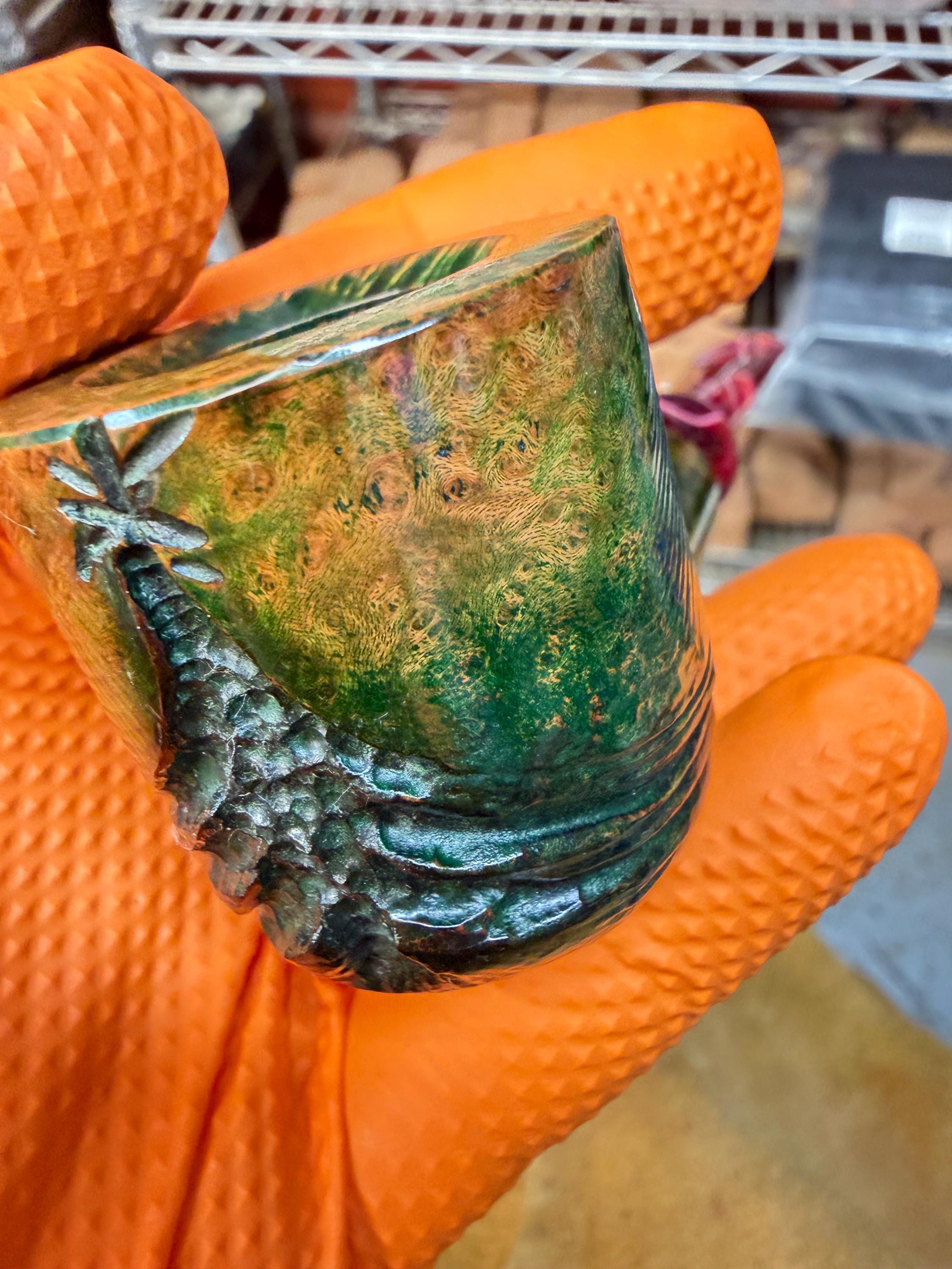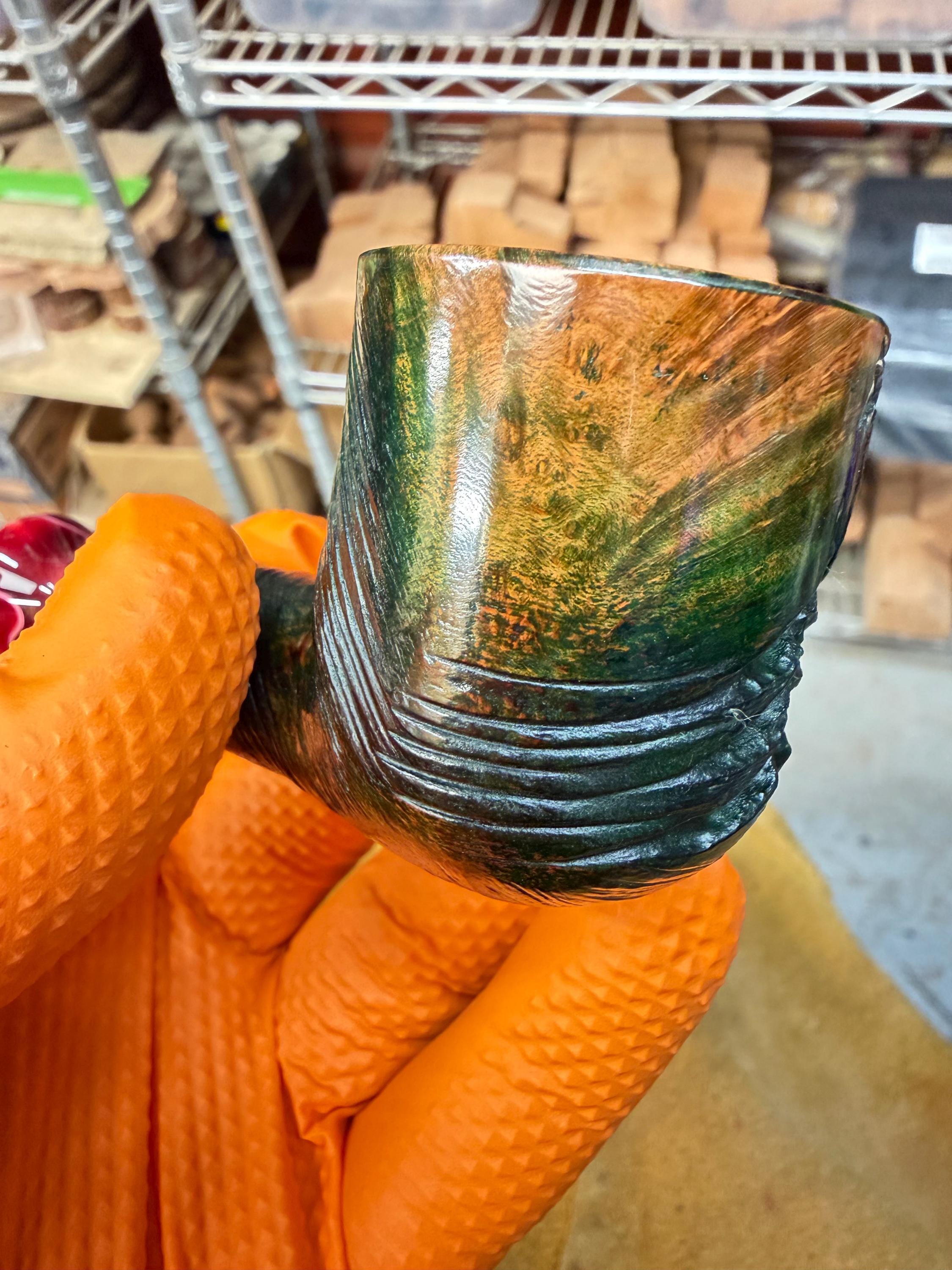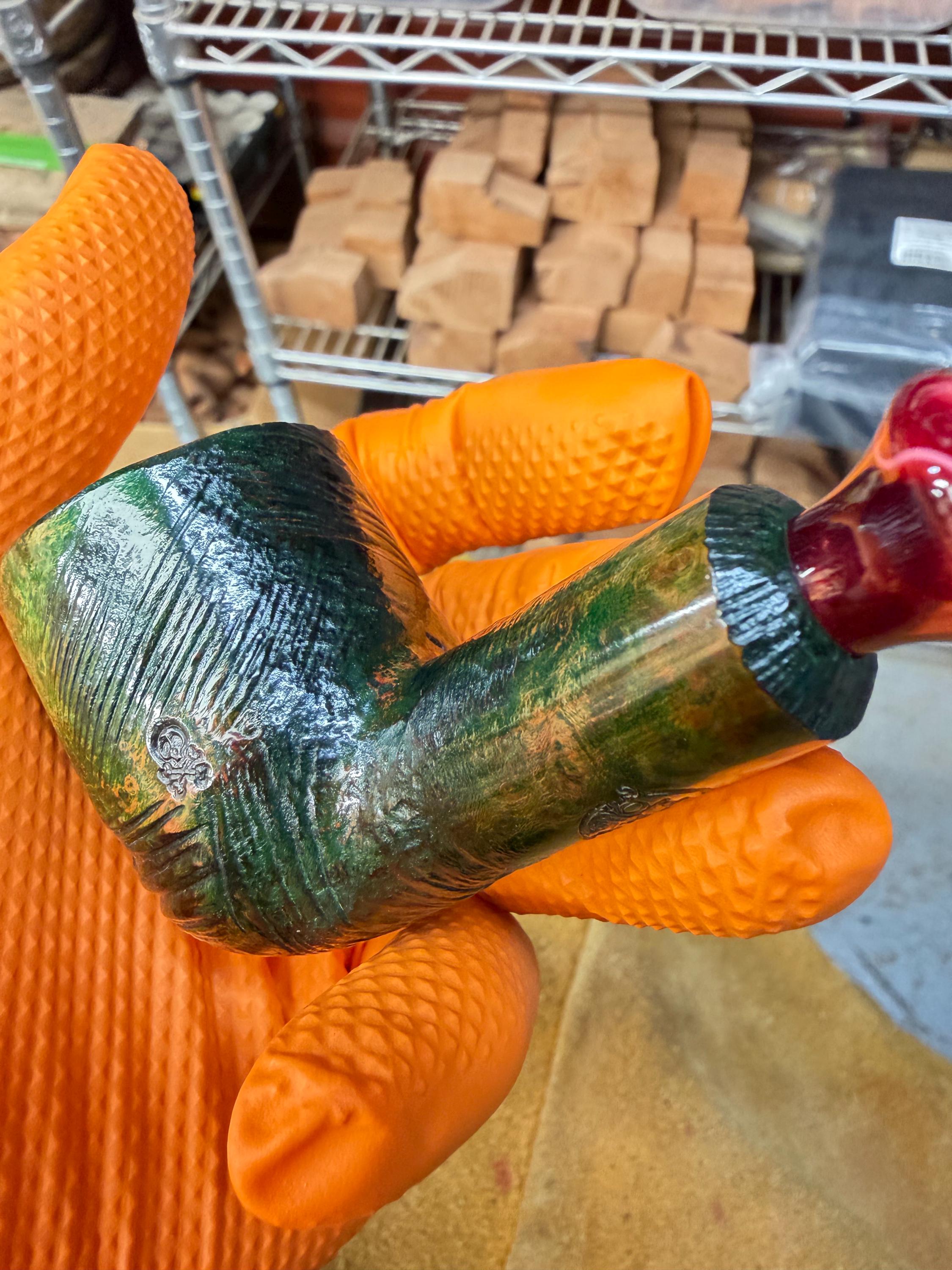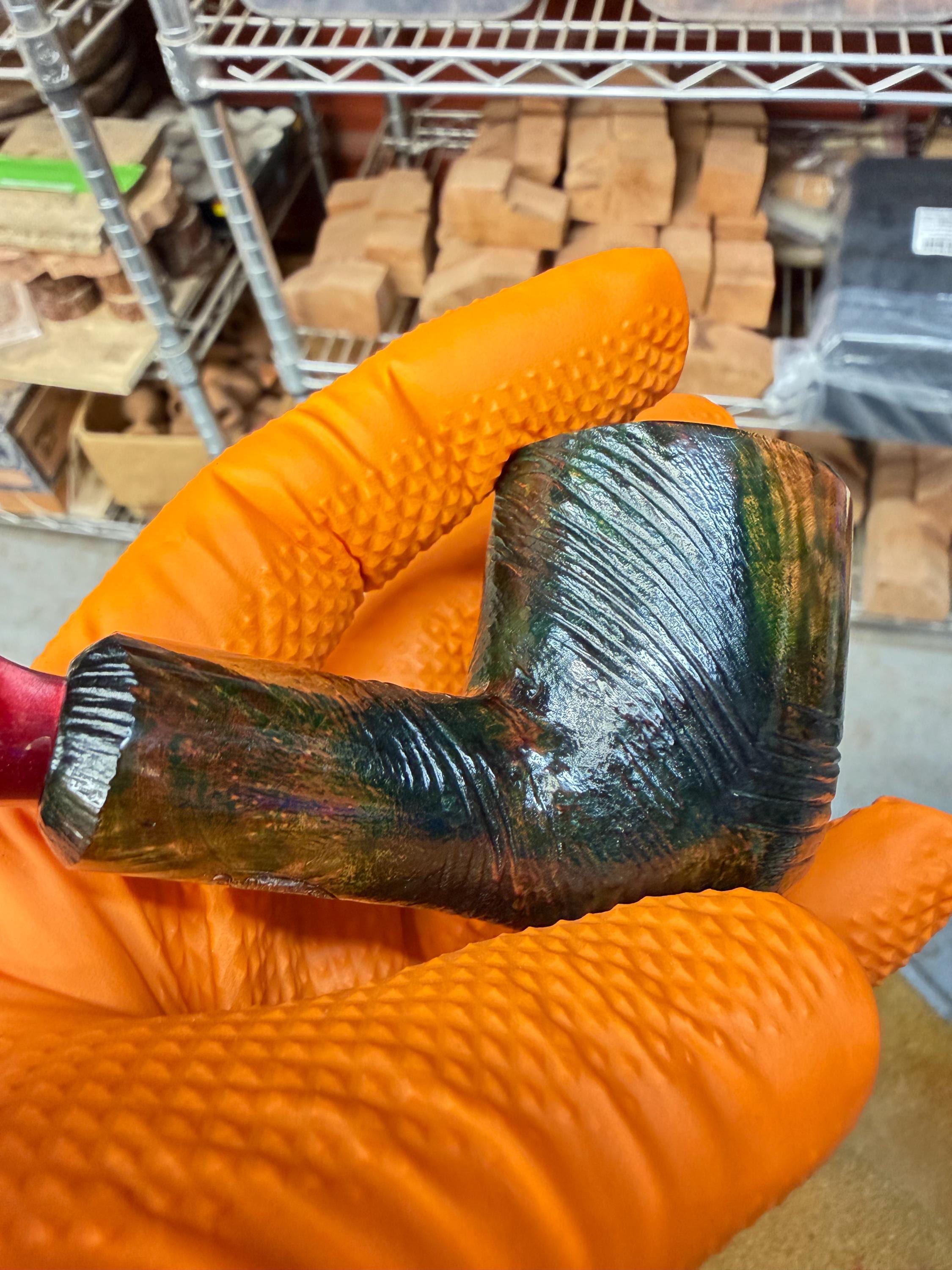 This is a handmade briar pipe that has been meticulously carved and polished/ partially rusticated . Acrylic custom made stem. Non filtered. A very nice daily smoker. Christmas edition. Subtle green in rusticated areas and in wood grain