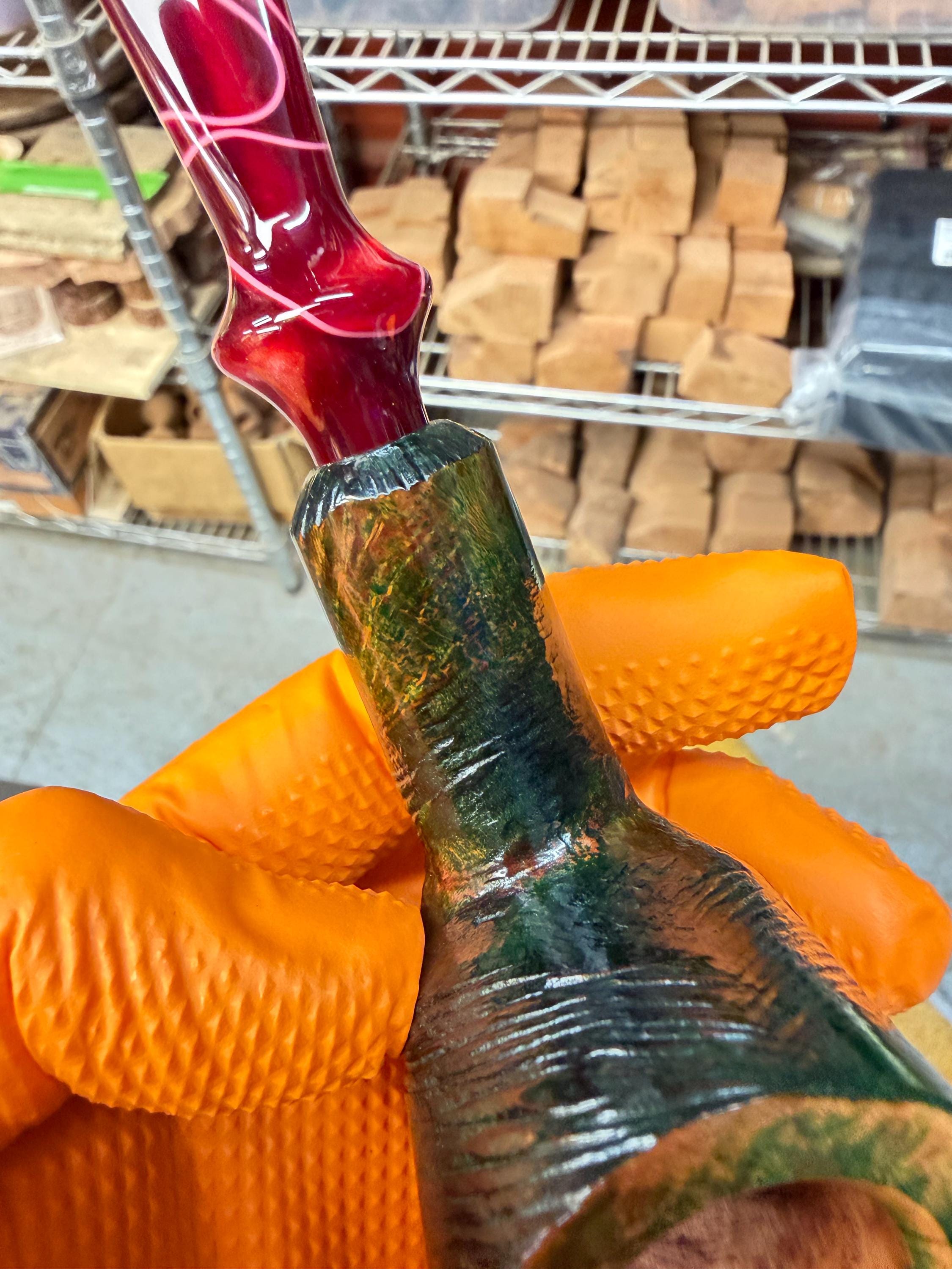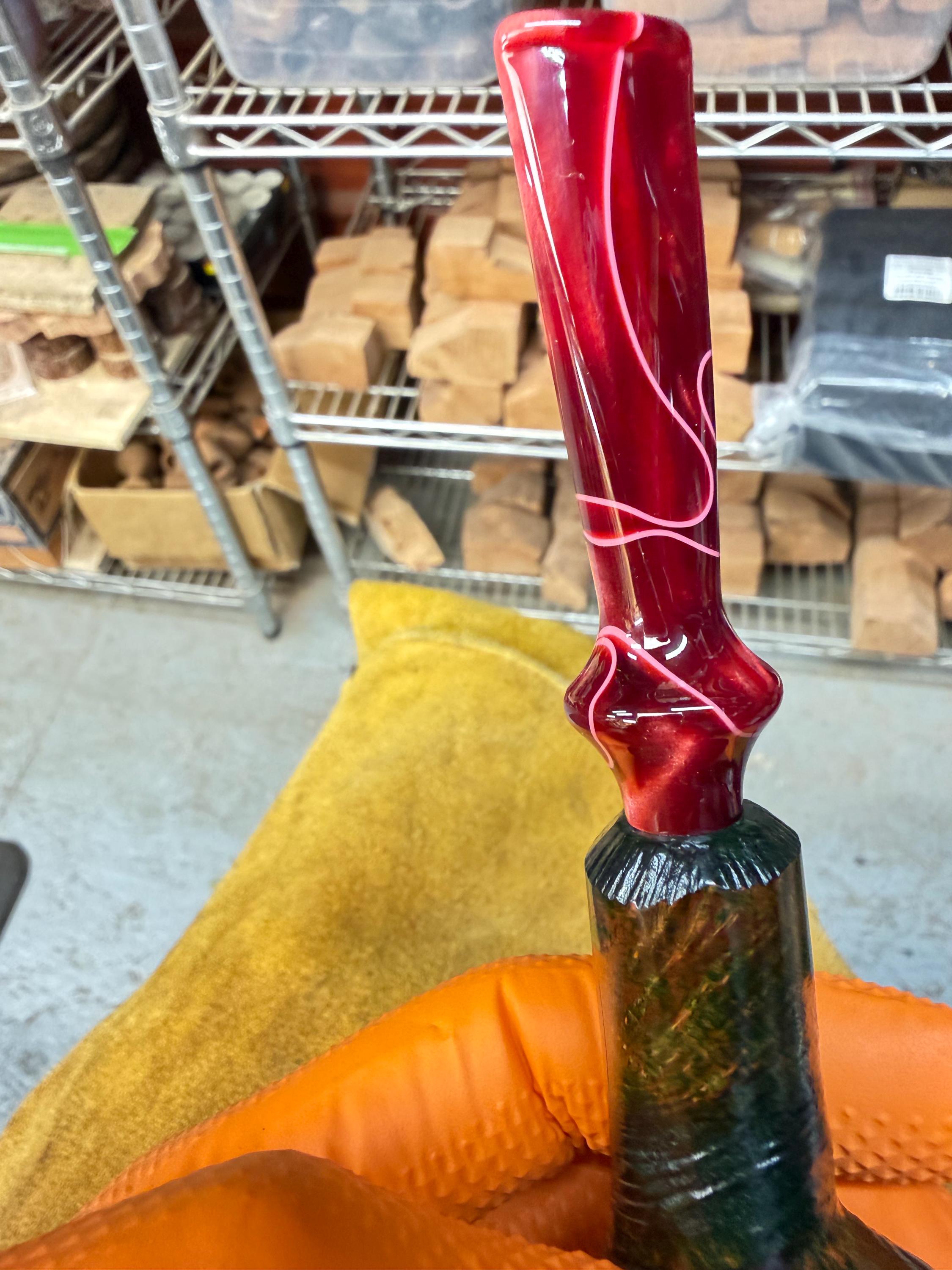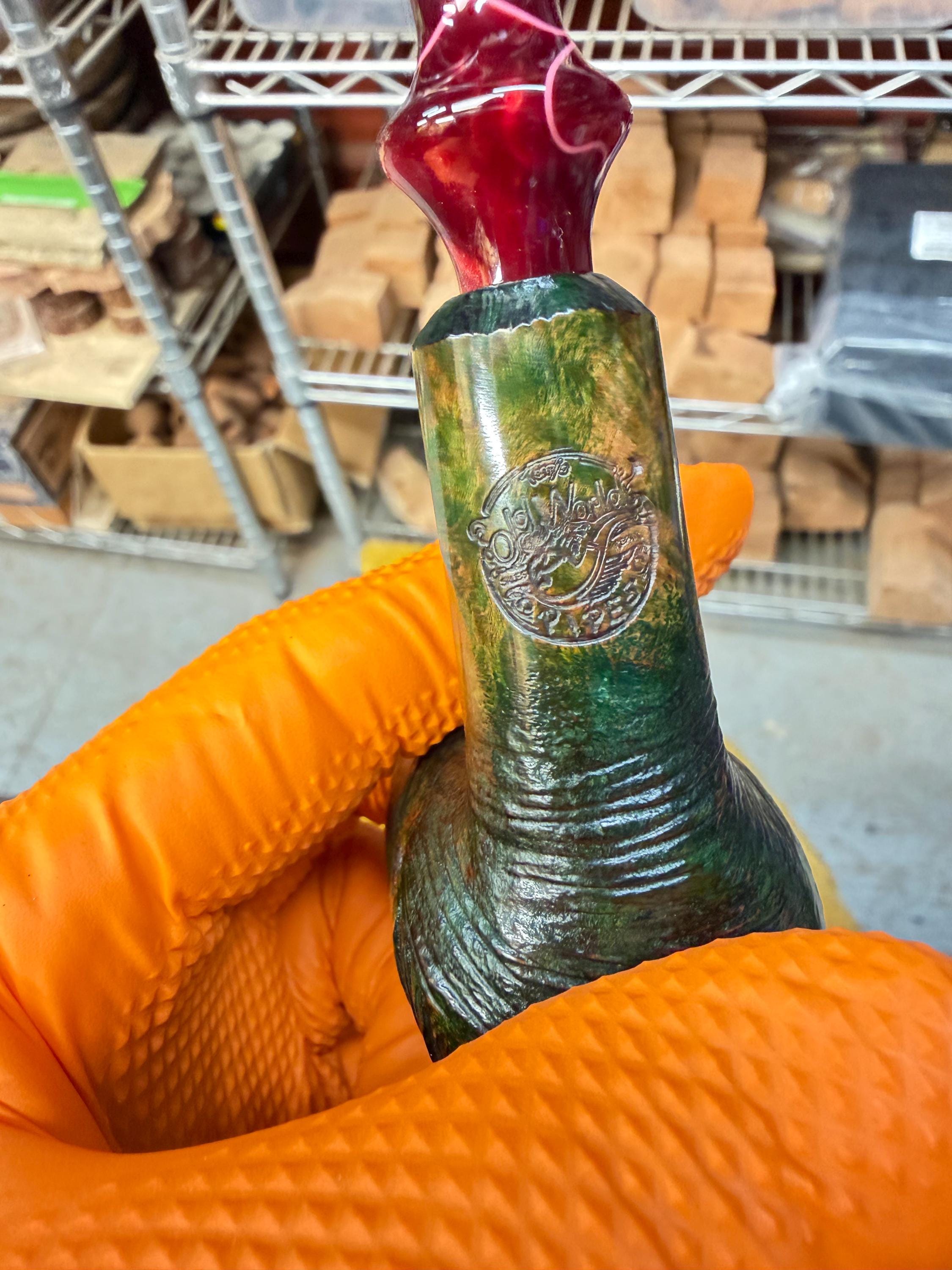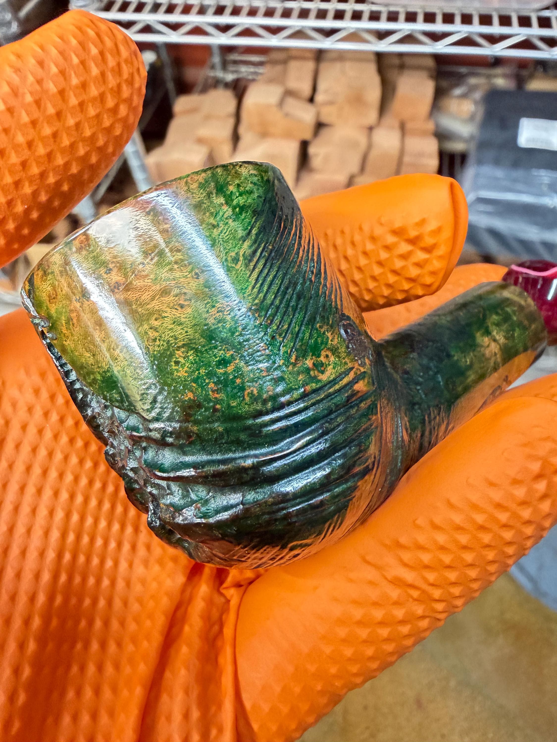 This is a handmade briar pipe that has been meticulously carved and polished/ partially rusticated . Acrylic custom made stem. Non filtered. A very nice daily smoker. Christmas edition. Subtle green in rusticated areas and in wood grain
