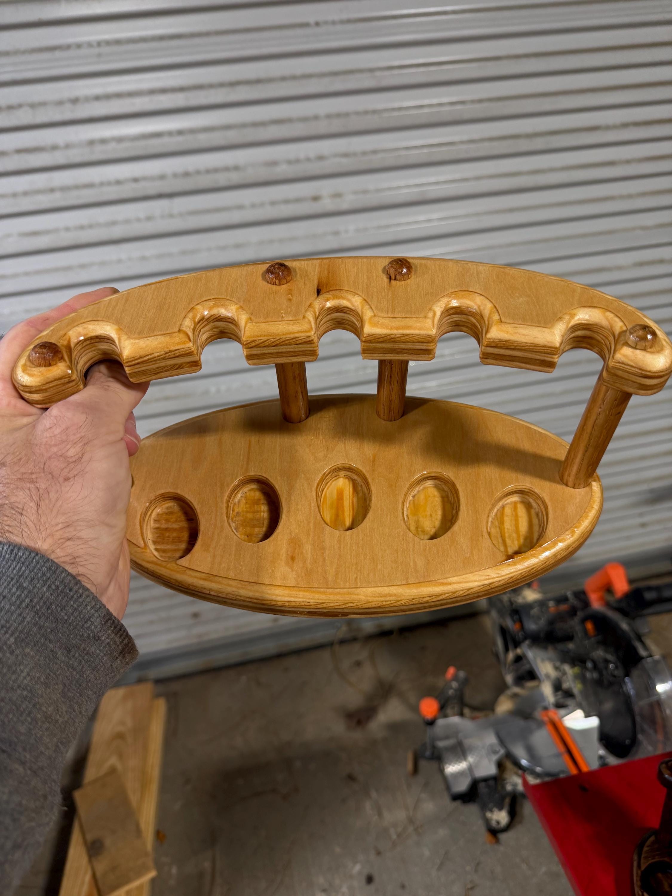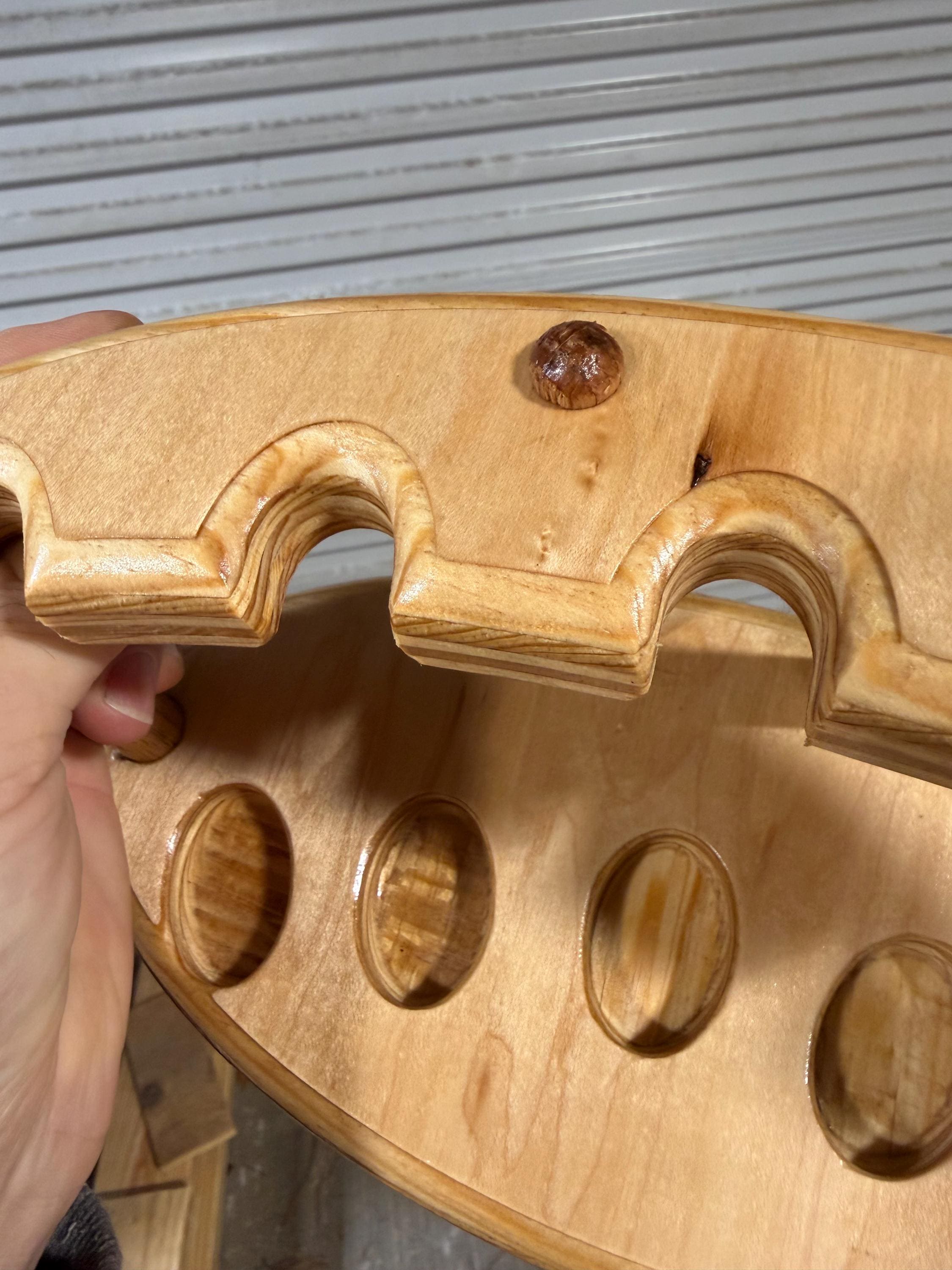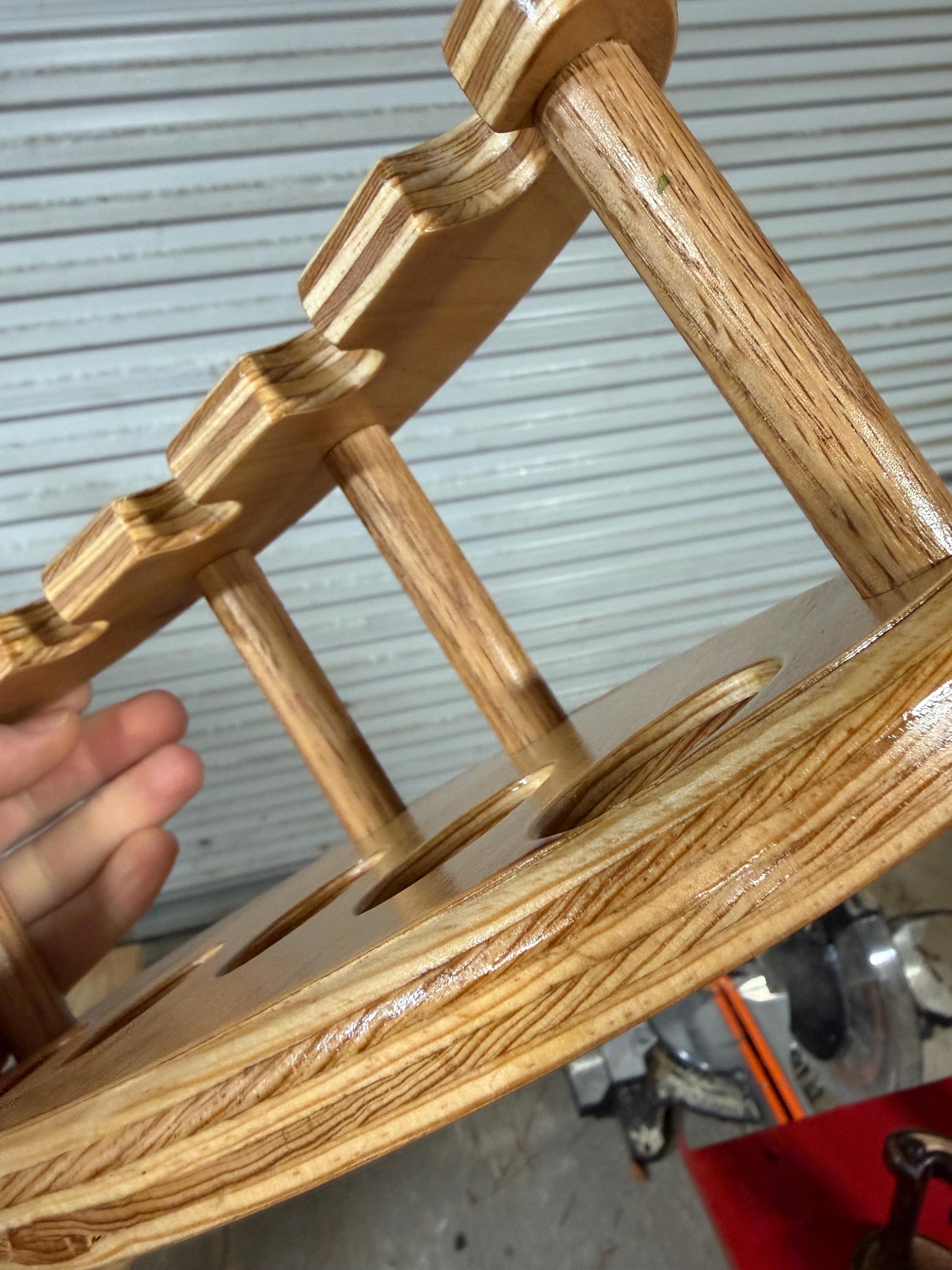 This is a handmade pipe stand for 5 pipes. Can fit wide stemmed pipes. Handmade by me here at the shop. Not a Chinese nock off. Made from Maple hardwood ply to keep costs down. Very heavily built and durable. Measurements are 6x11 on the base and 5” tall. Down supports are 5/8” oak.