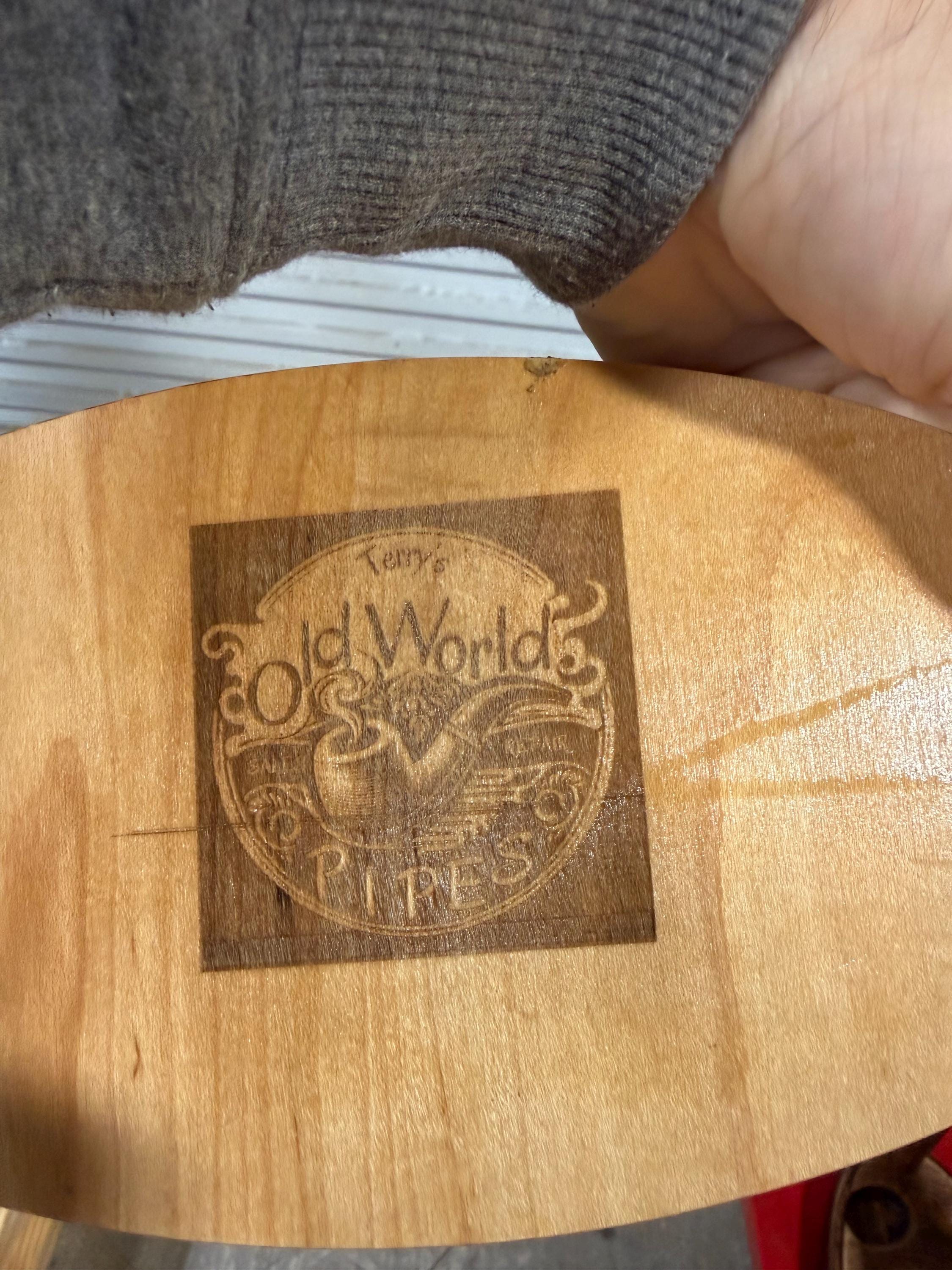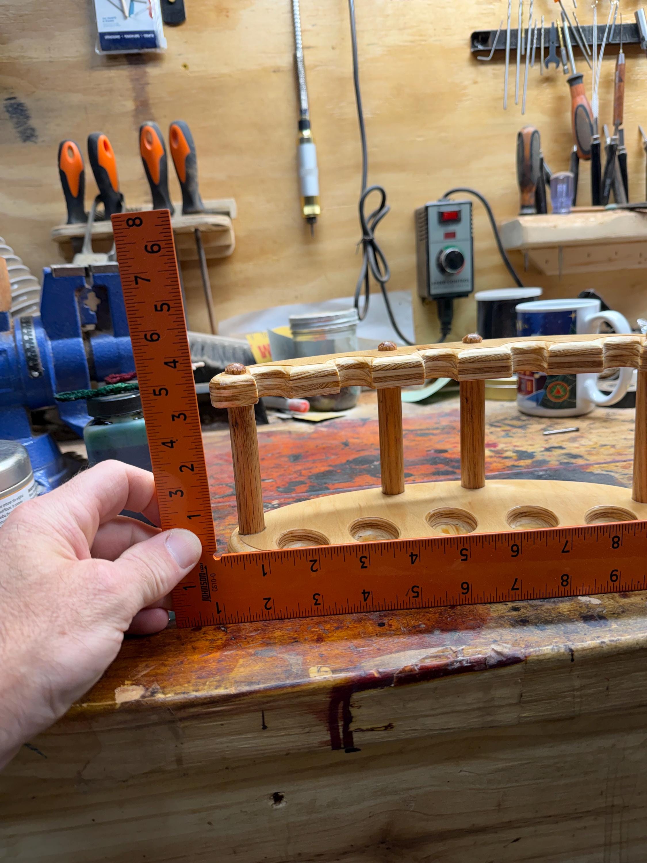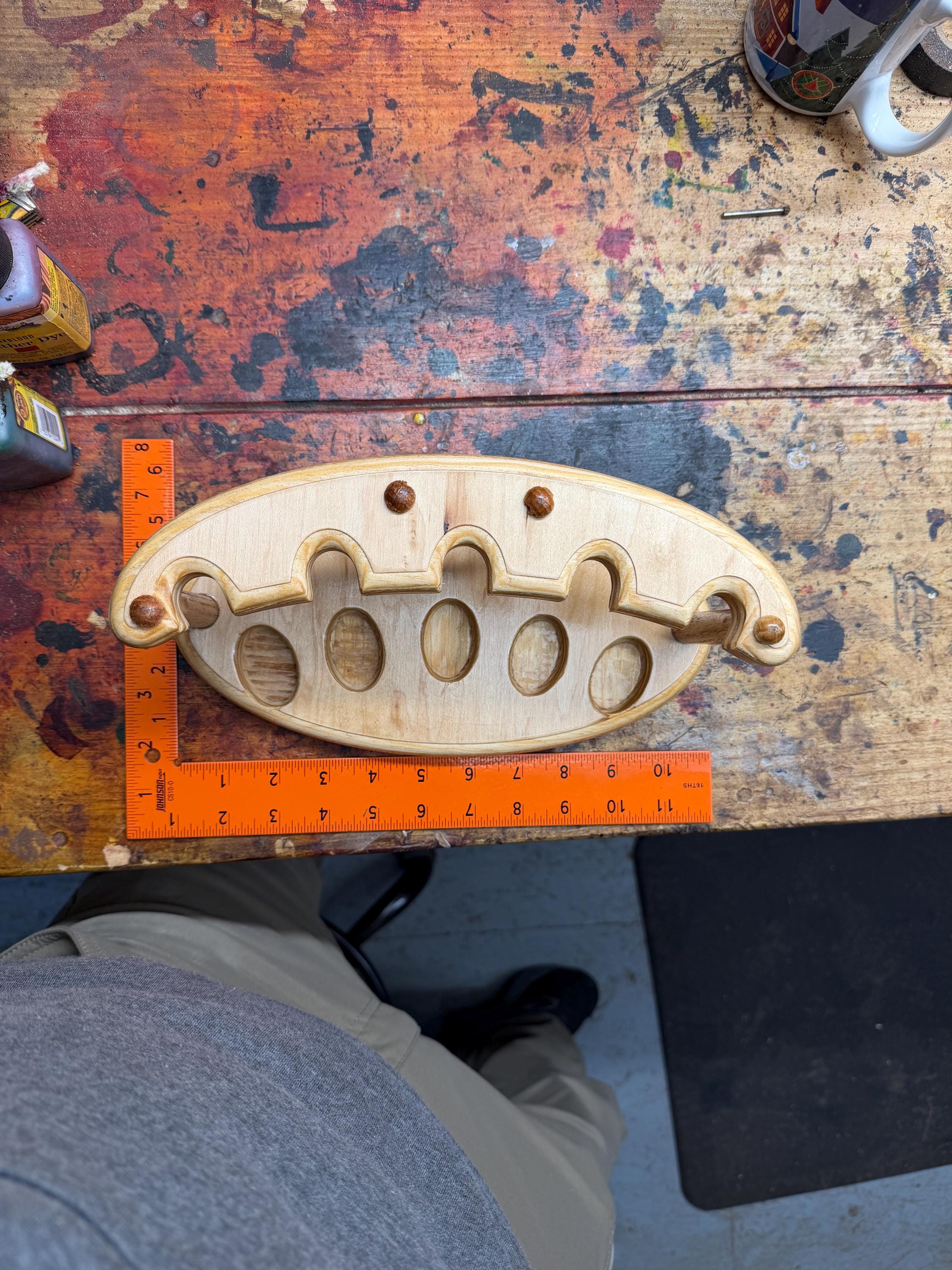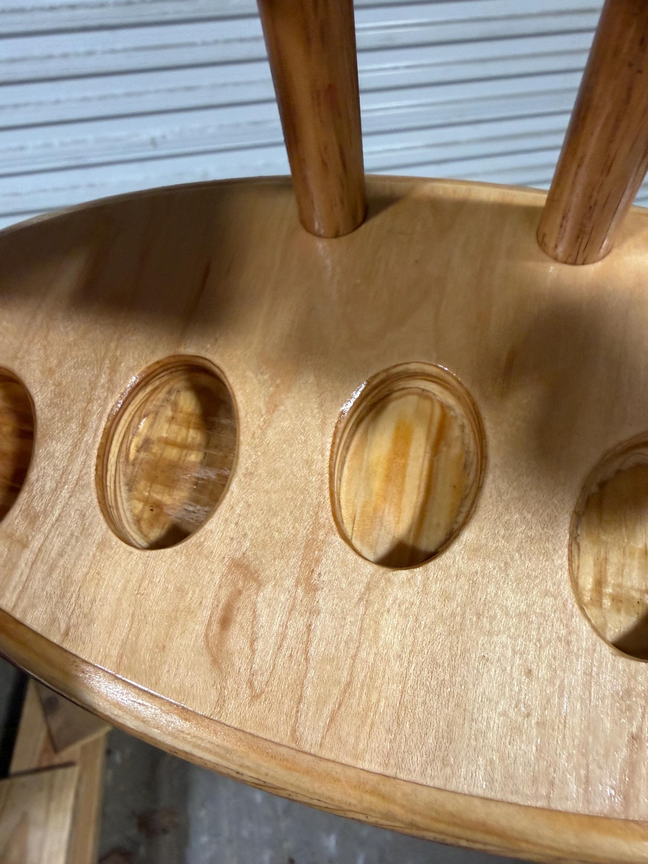 This is a handmade pipe stand for 5 pipes. Can fit wide stemmed pipes. Handmade by me here at the shop. Not a Chinese nock off. Made from Maple hardwood ply to keep costs down. Very heavily built and durable. Measurements are 6x11 on the base and 5” tall. Down supports are 5/8” oak.
