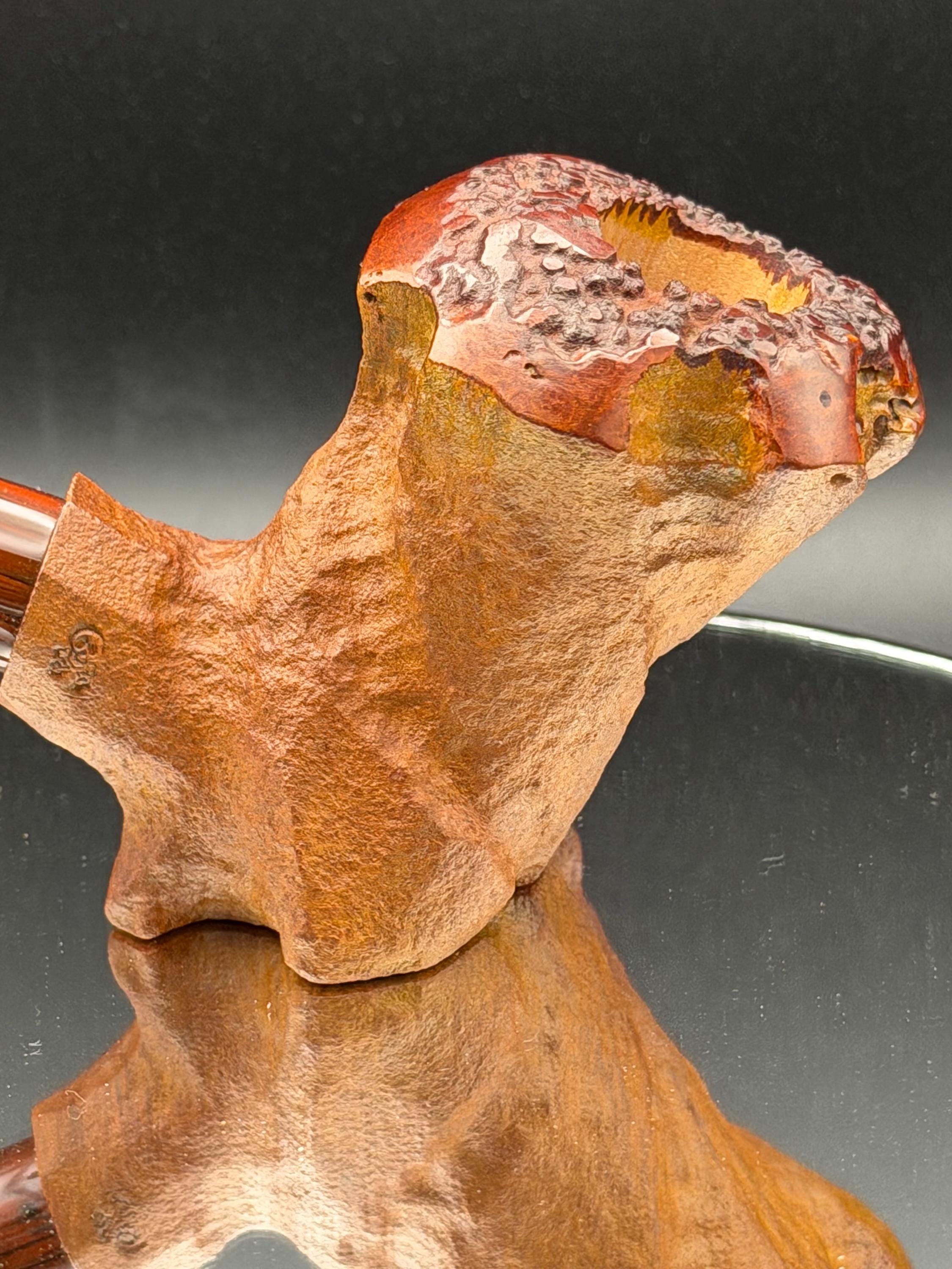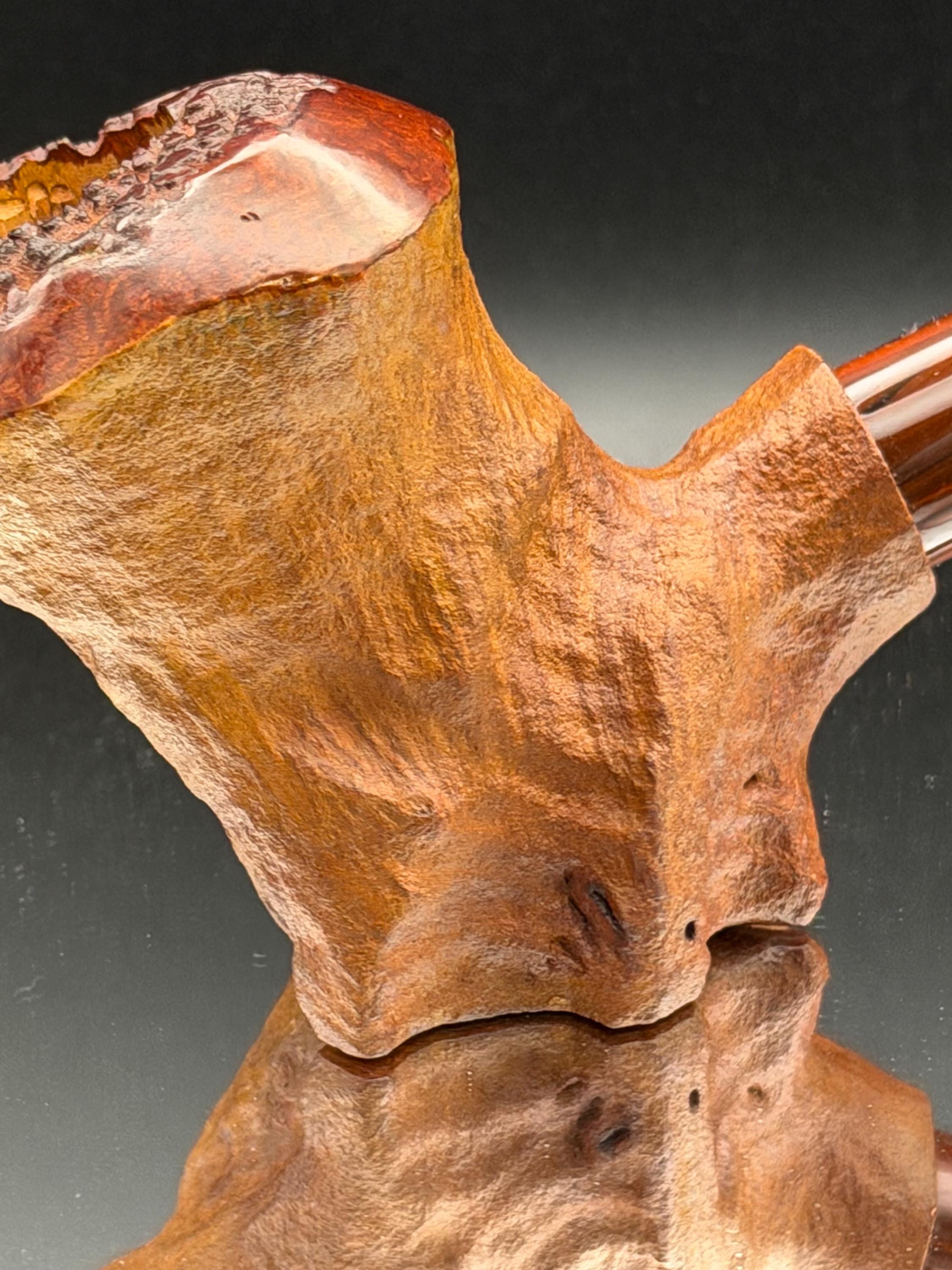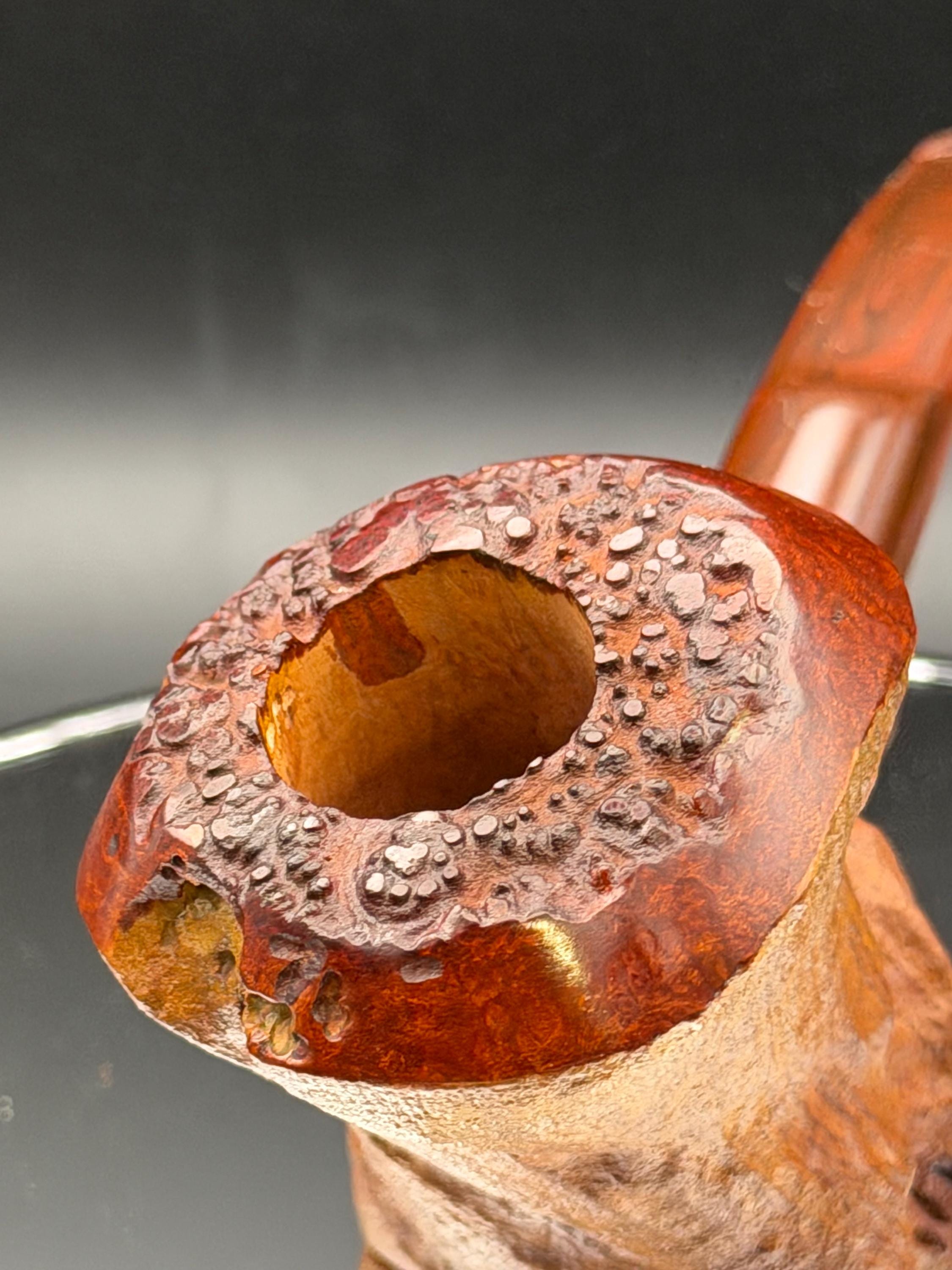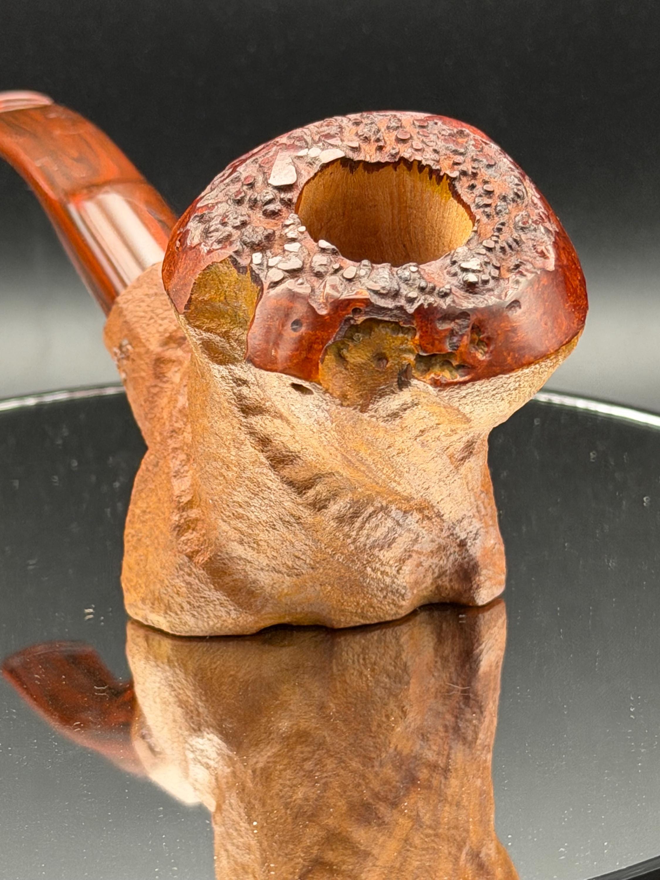 This is a handmade briar pipe that has been freehand carved ,sandblasted , and polished/ partially rusticated . Acrylic custom made stem. Non filtered. A very nice daily smoker.Larger pipe with a 7/8 x 2 3/4 bowl for a long smoke with 1/4” sidewalls at the thinnest point so the pipe will never get hot. Sealed with natural hard carnuba wax.
