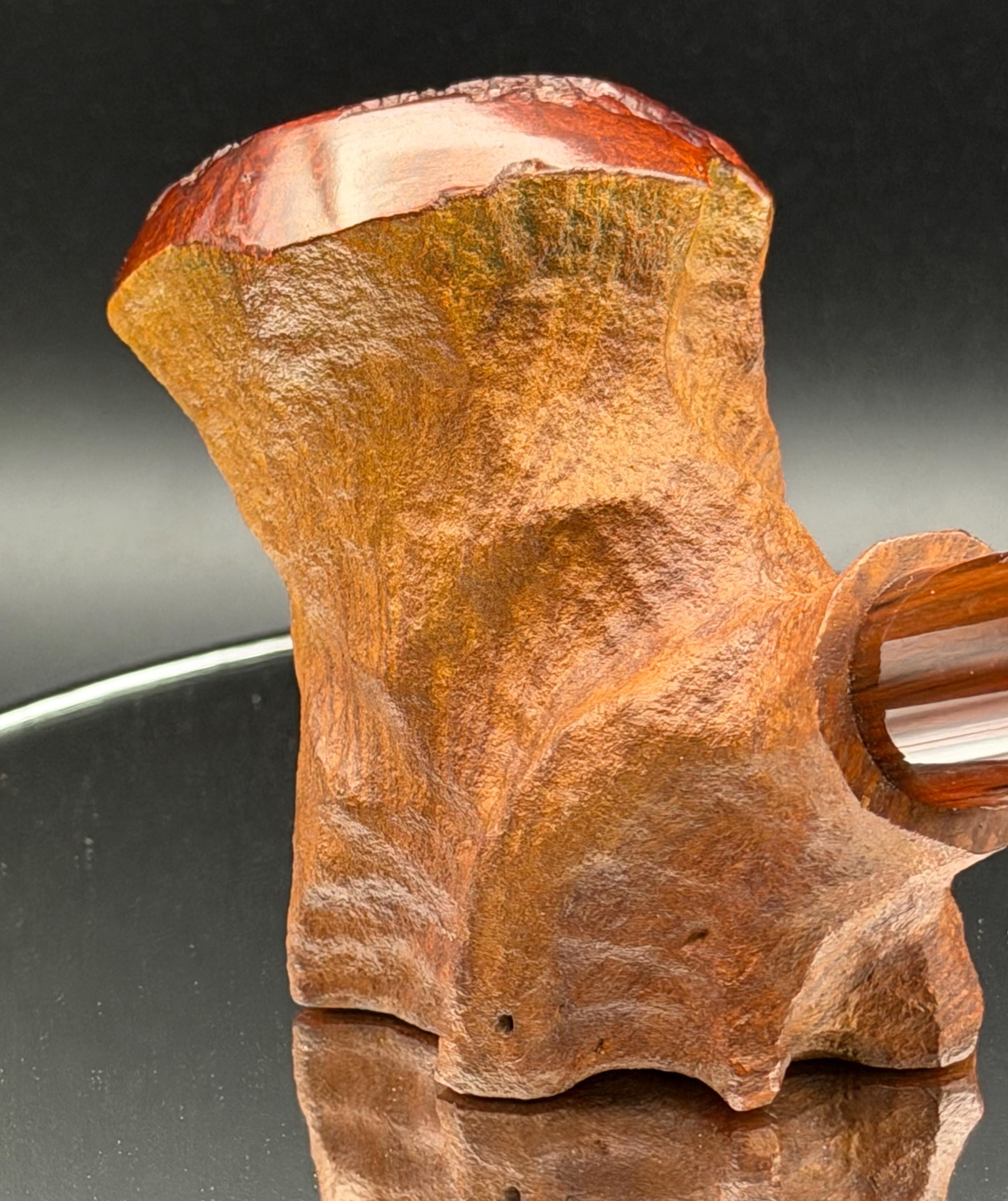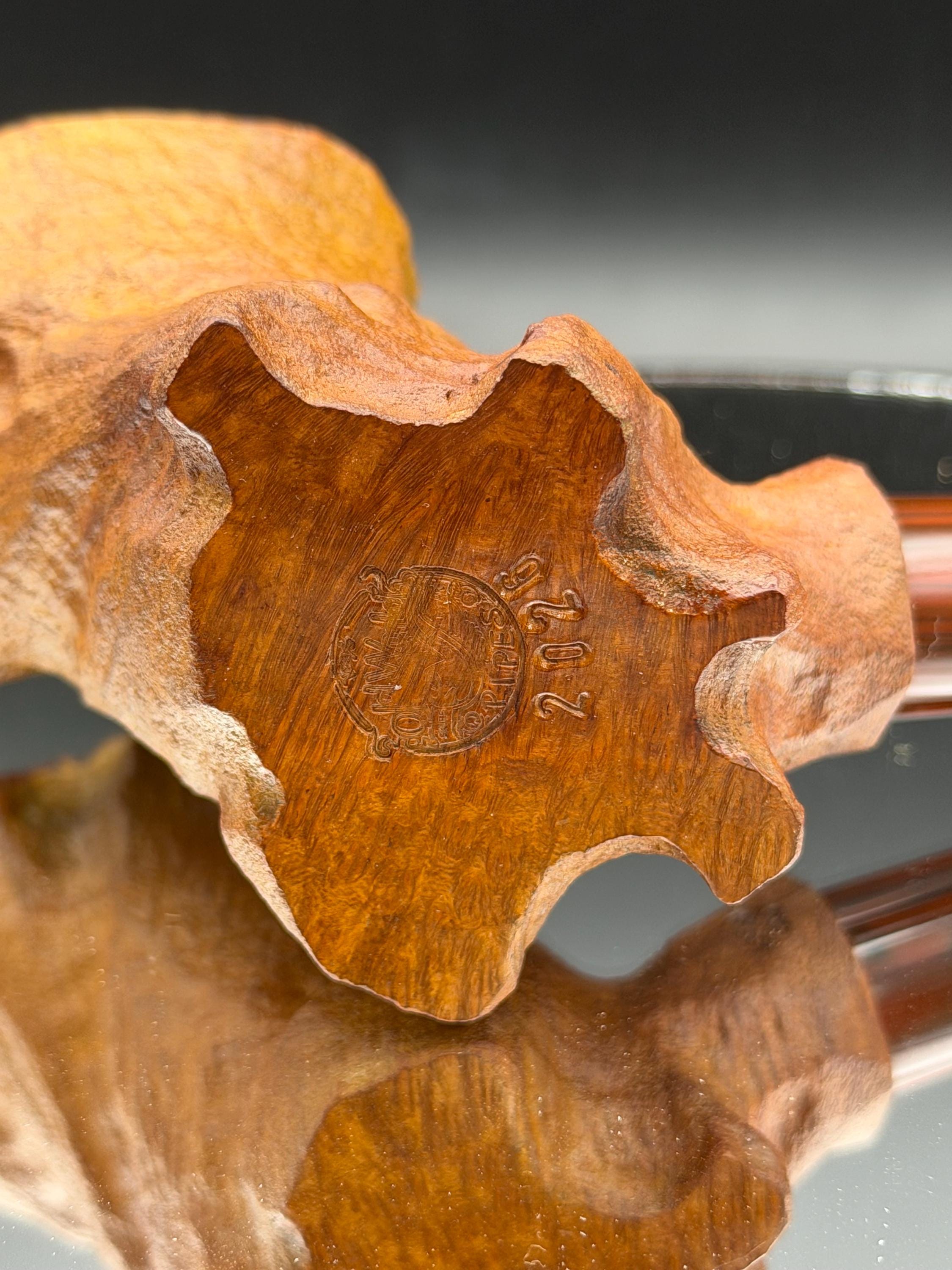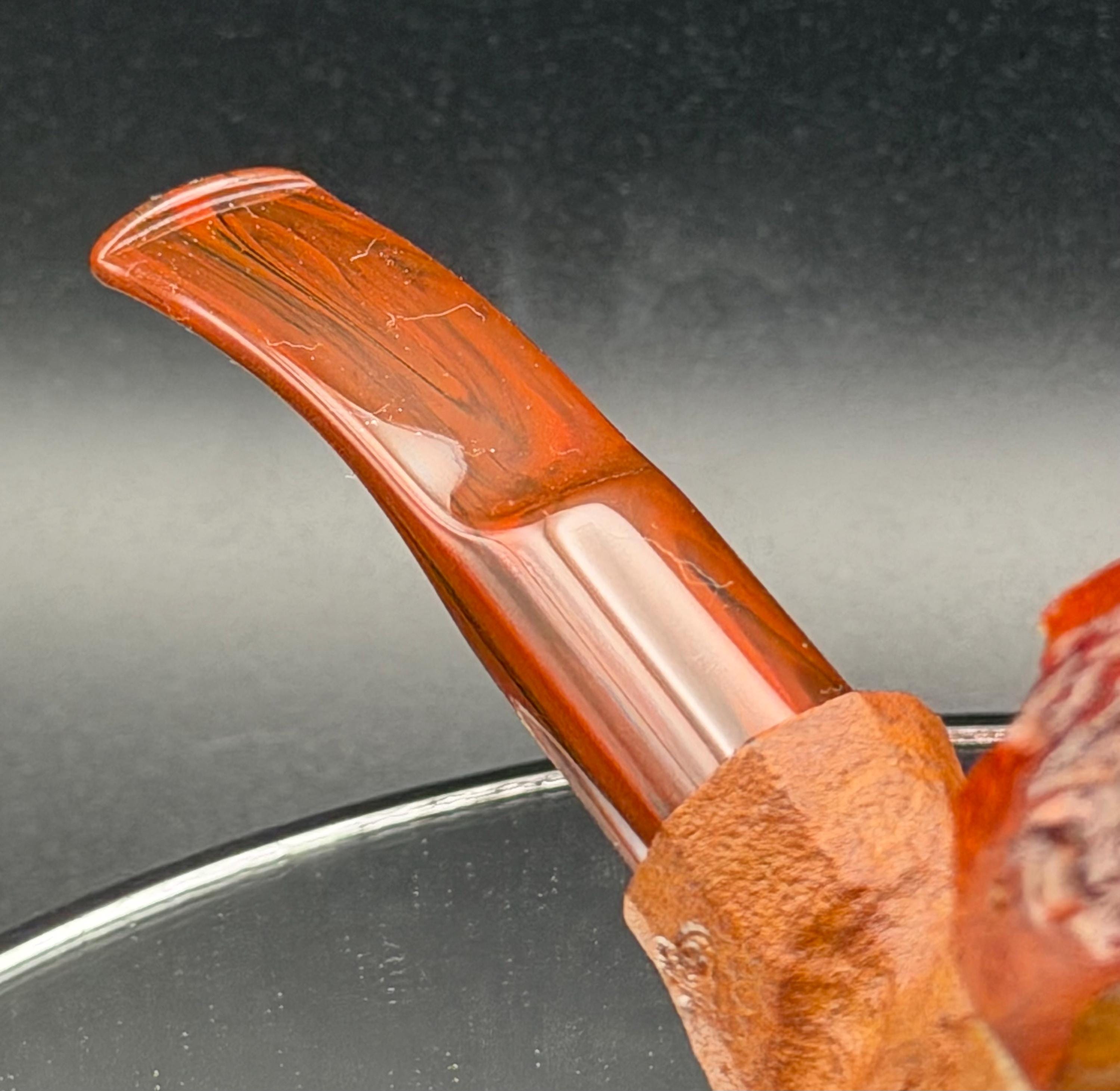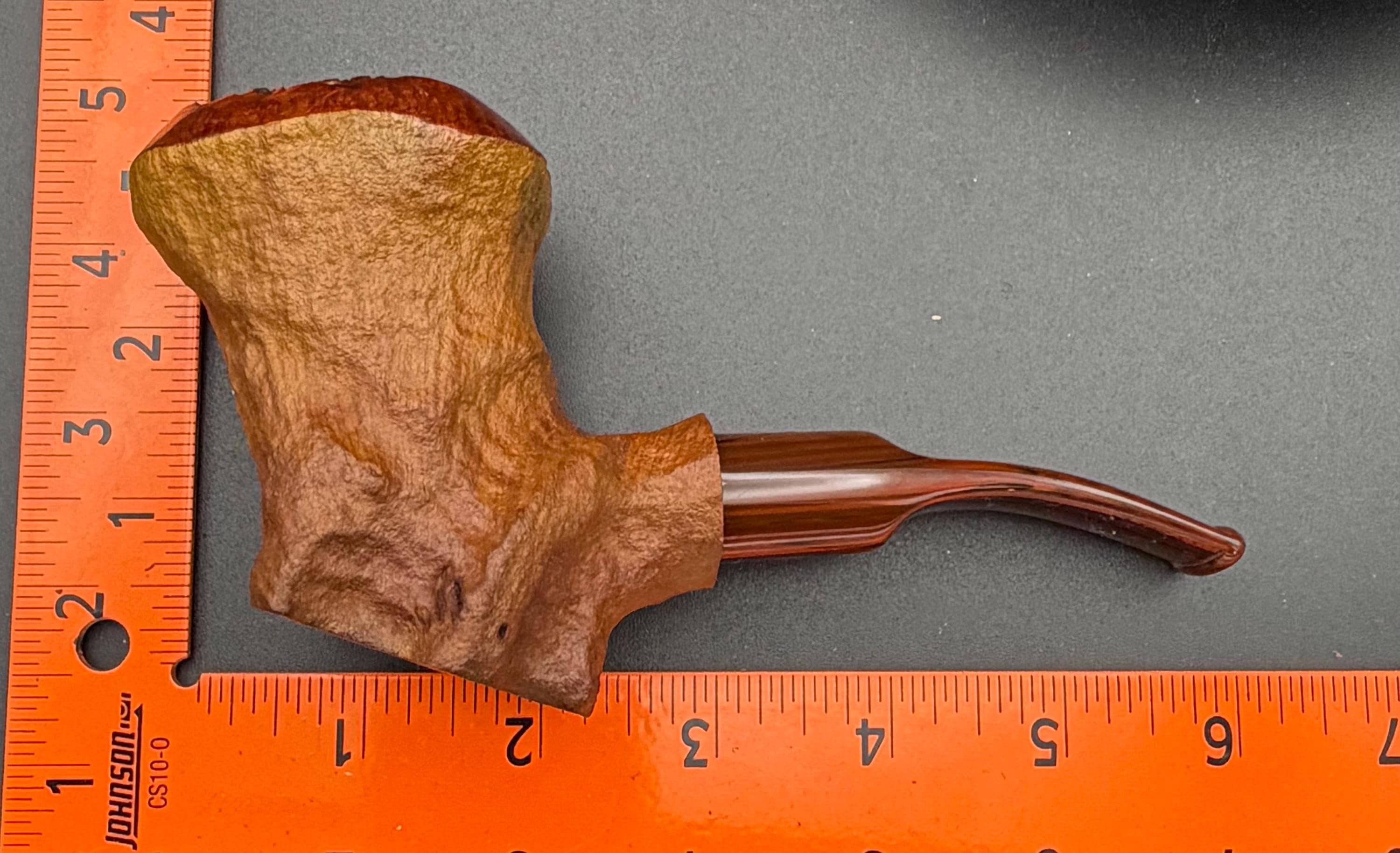 This is a handmade briar pipe that has been freehand carved ,sandblasted , and polished/ partially rusticated . Acrylic custom made stem. Non filtered. A very nice daily smoker.Larger pipe with a 7/8 x 2 3/4 bowl for a long smoke with 1/4” sidewalls at the thinnest point so the pipe will never get hot. Sealed with natural hard carnuba wax.