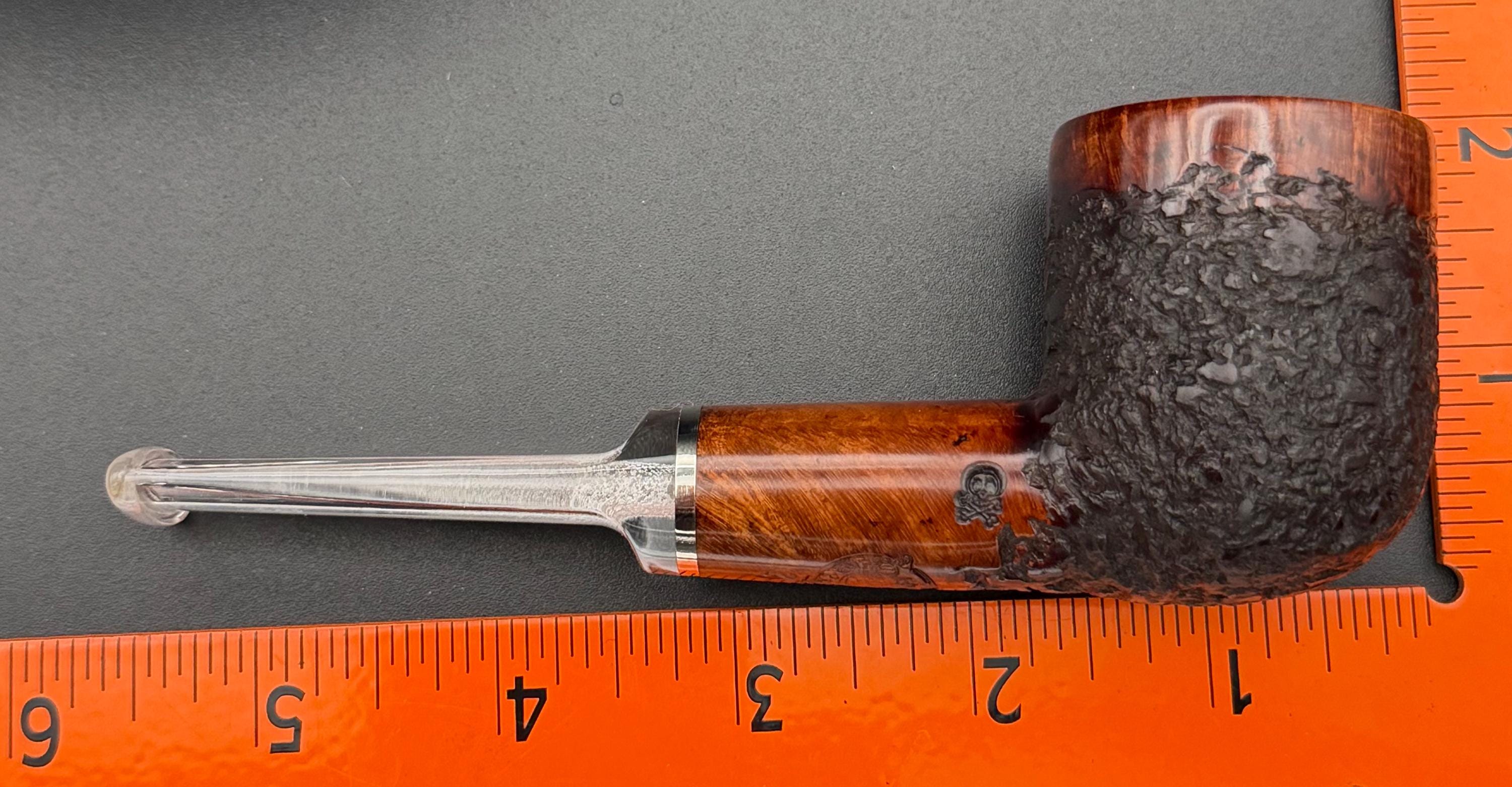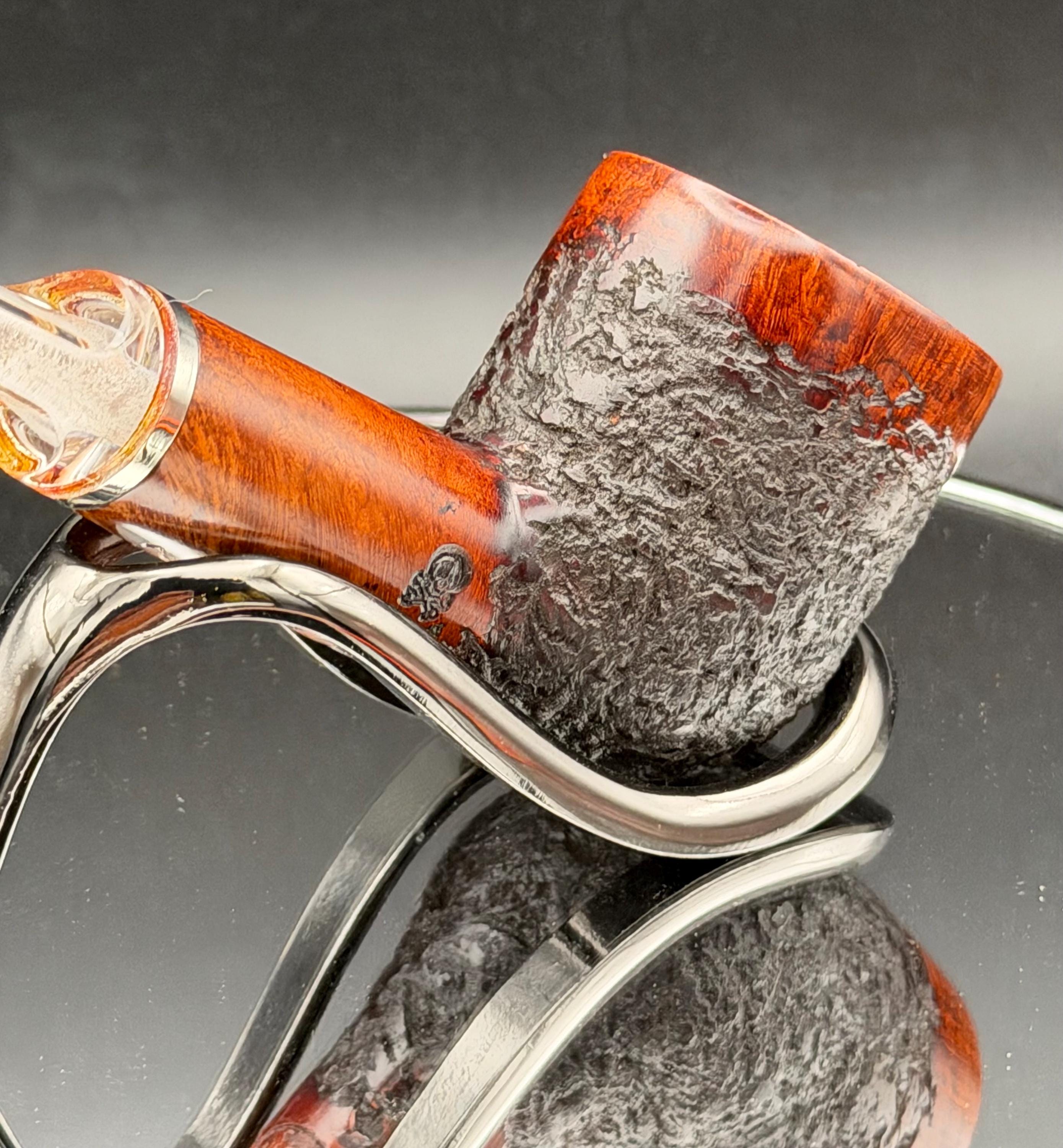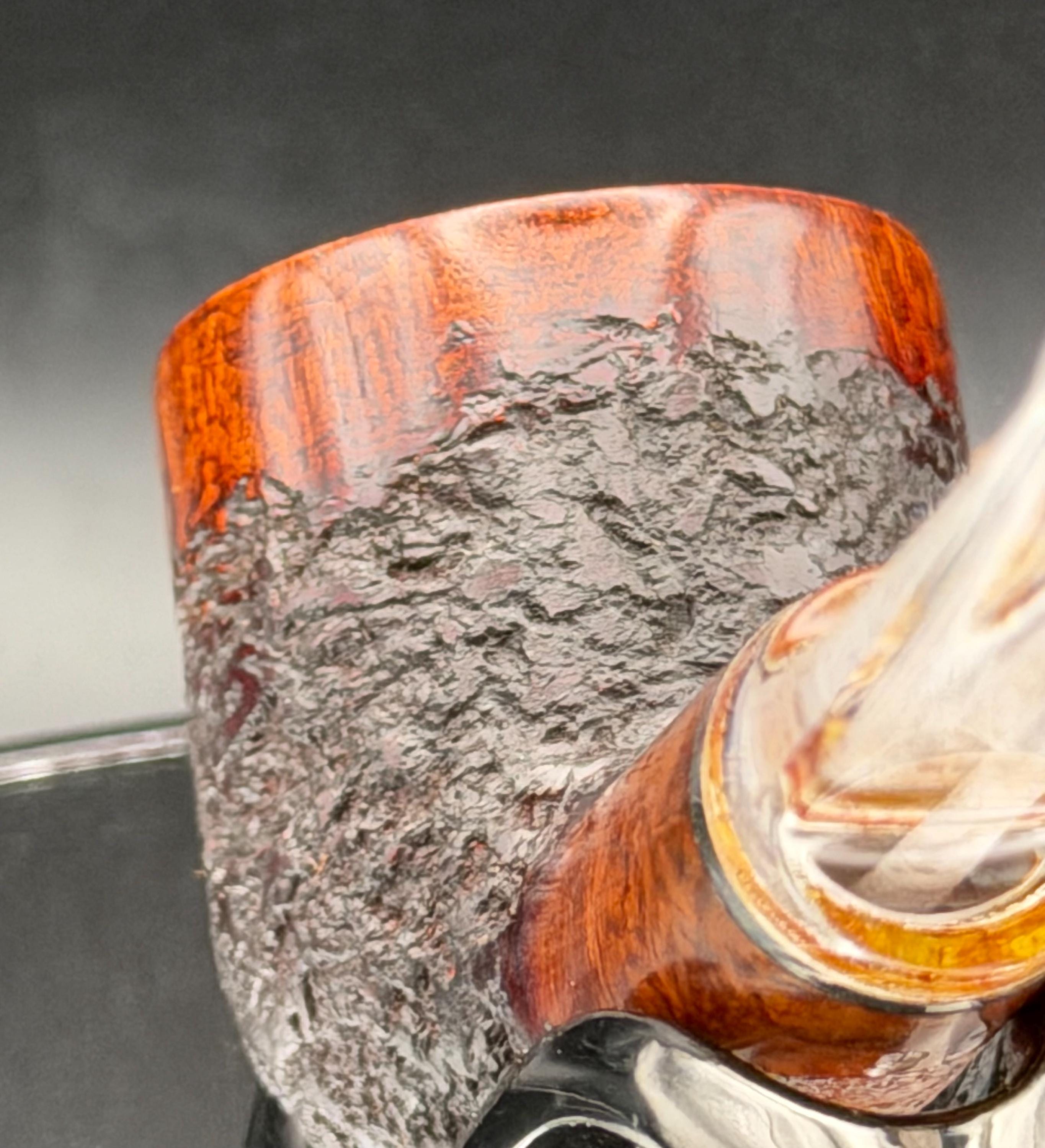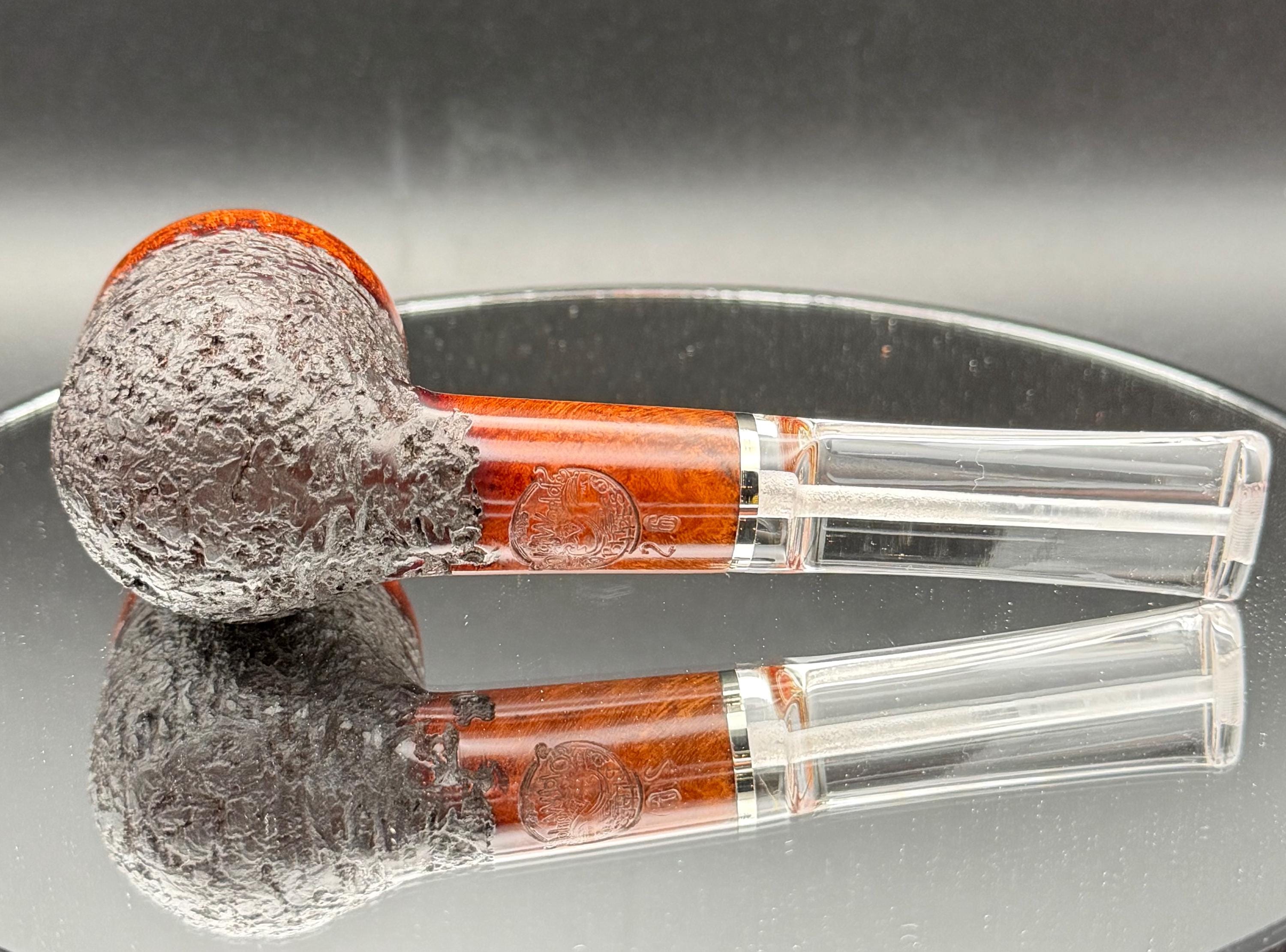 This is a handmade rustic mohogany colored briar pipe that has been meticulously carved and polished . A clear acrylic stem was formed and polished to finish it off with a nice polished aluminum spacer . Non filtered. A very nice daily smoker.