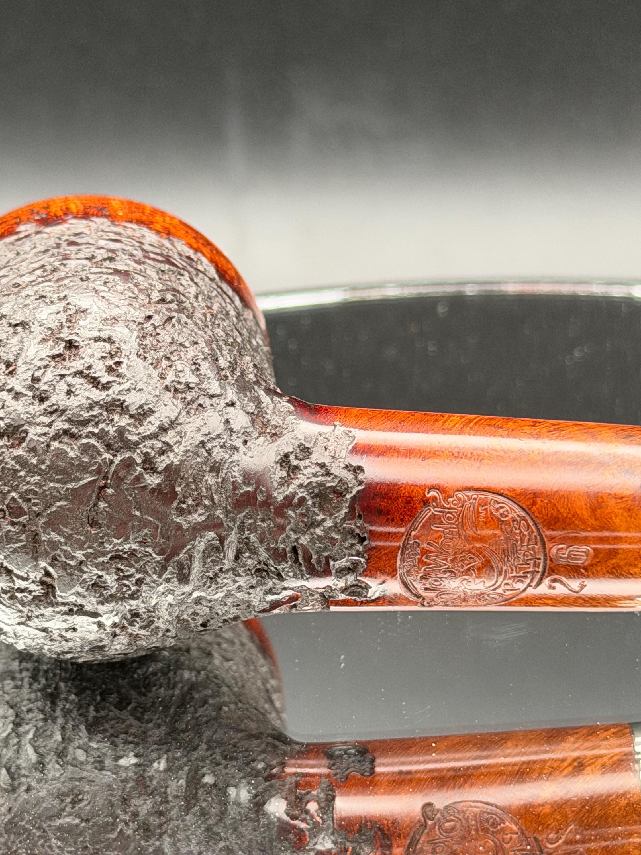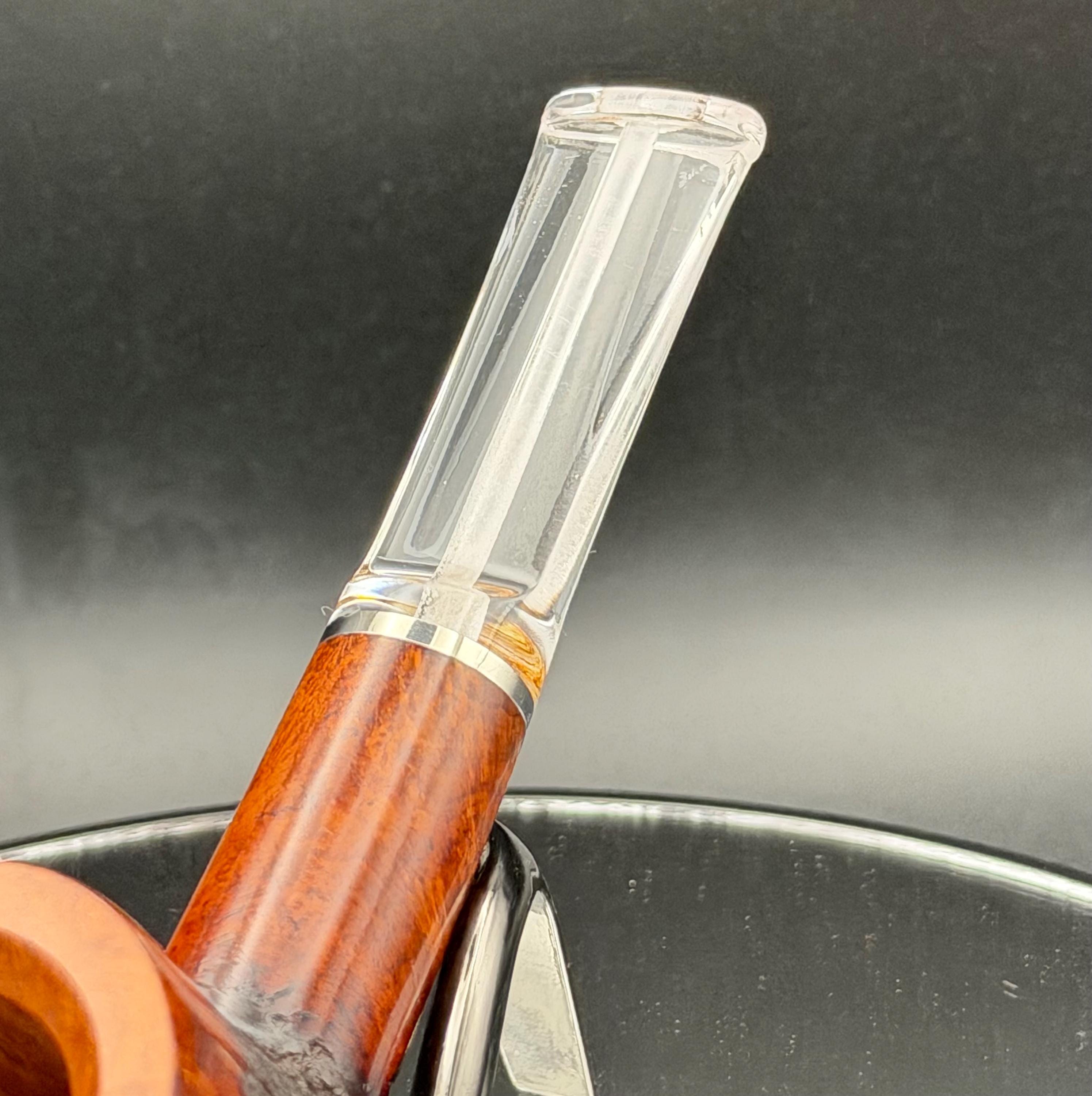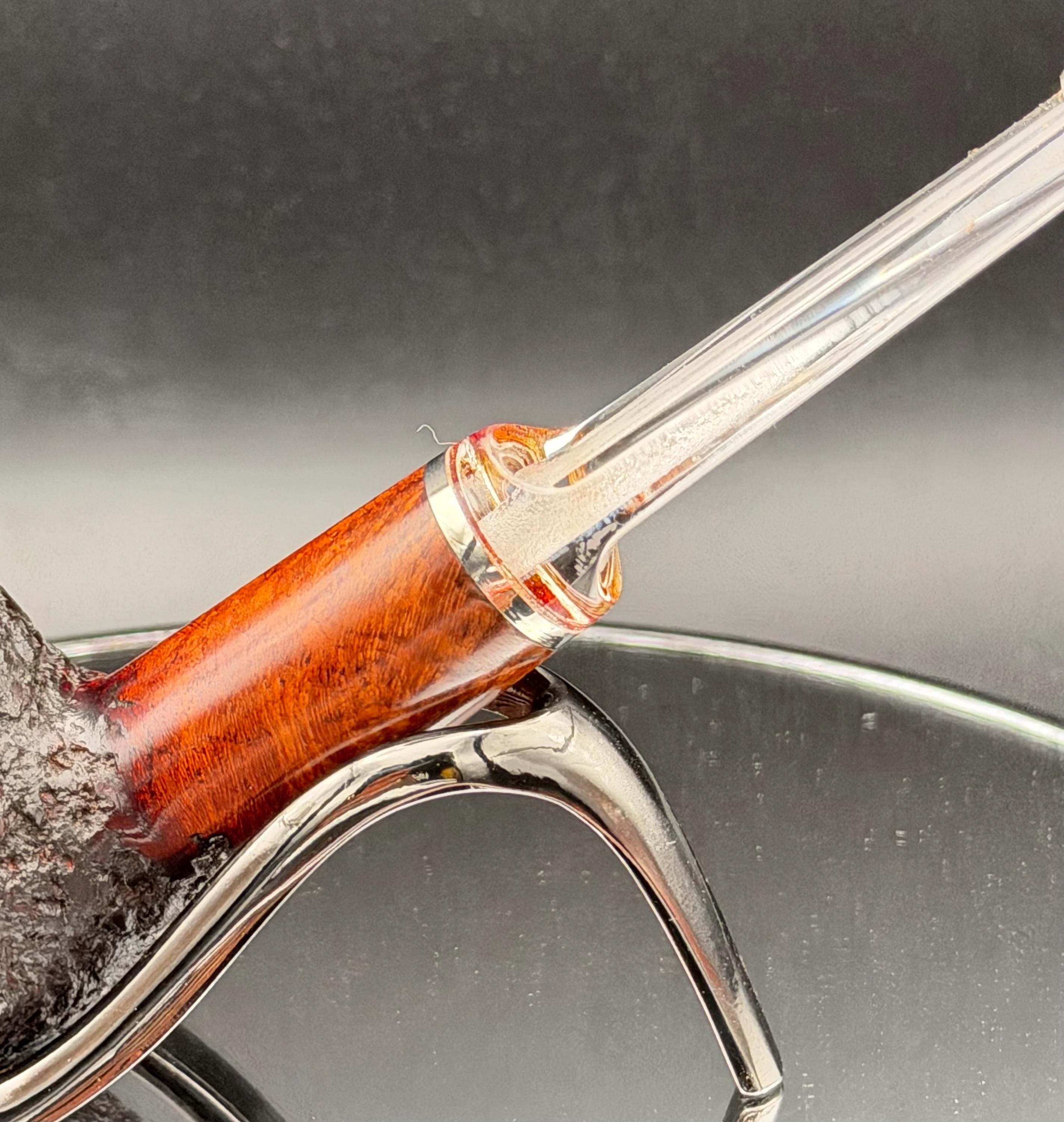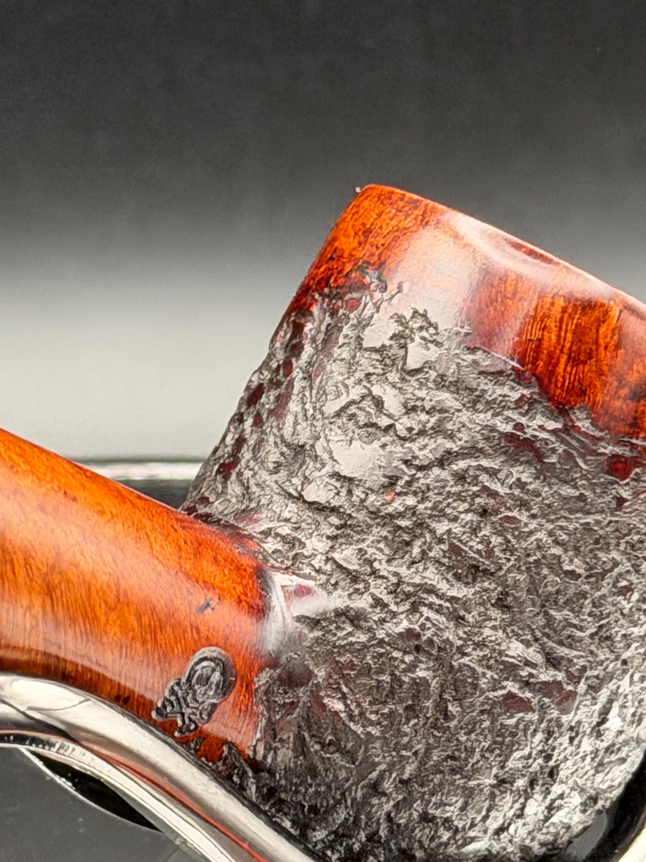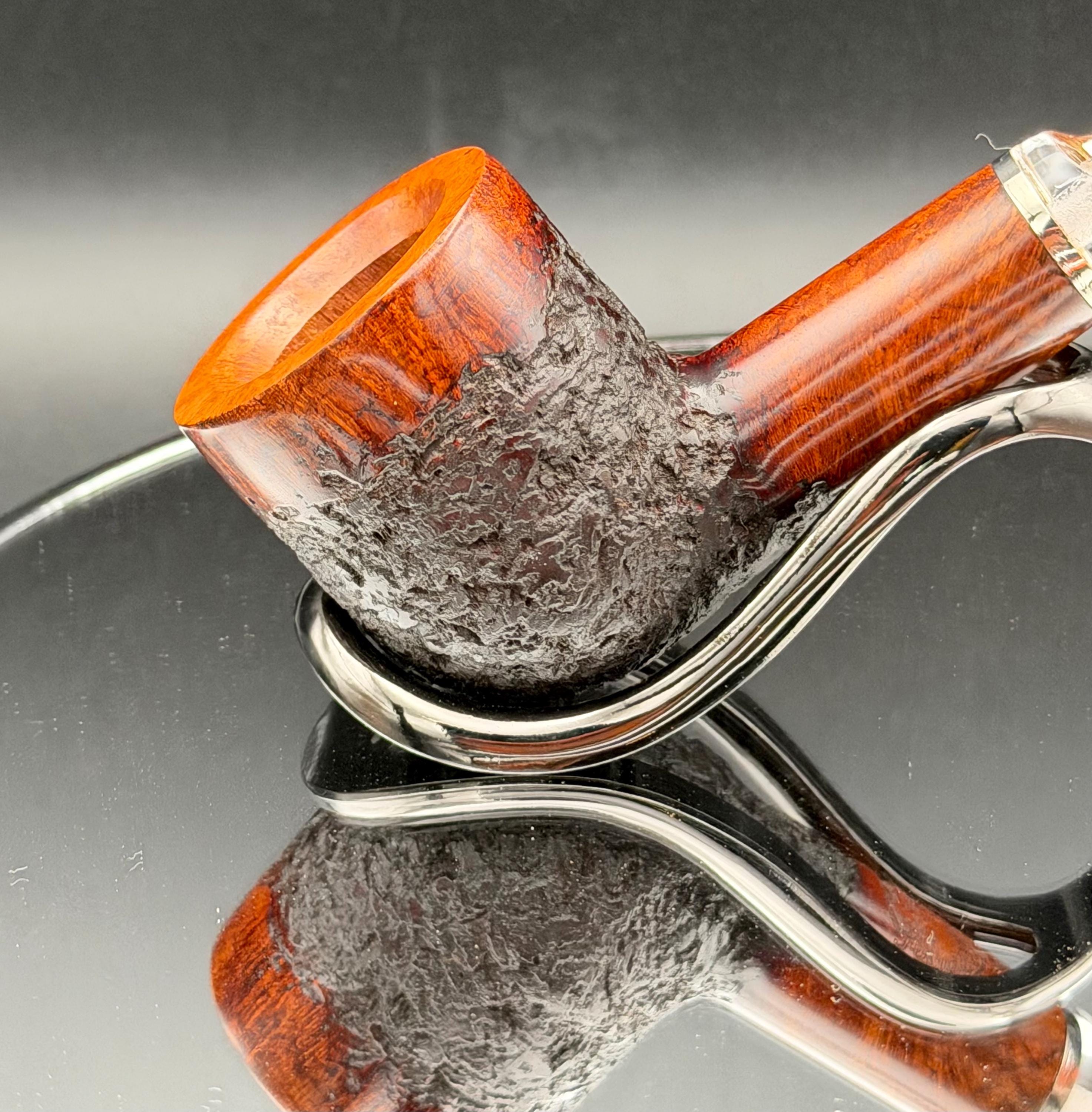 This is a handmade rustic mohogany colored briar pipe that has been meticulously carved and polished . A clear acrylic stem was formed and polished to finish it off with a nice polished aluminum spacer . Non filtered. A very nice daily smoker.