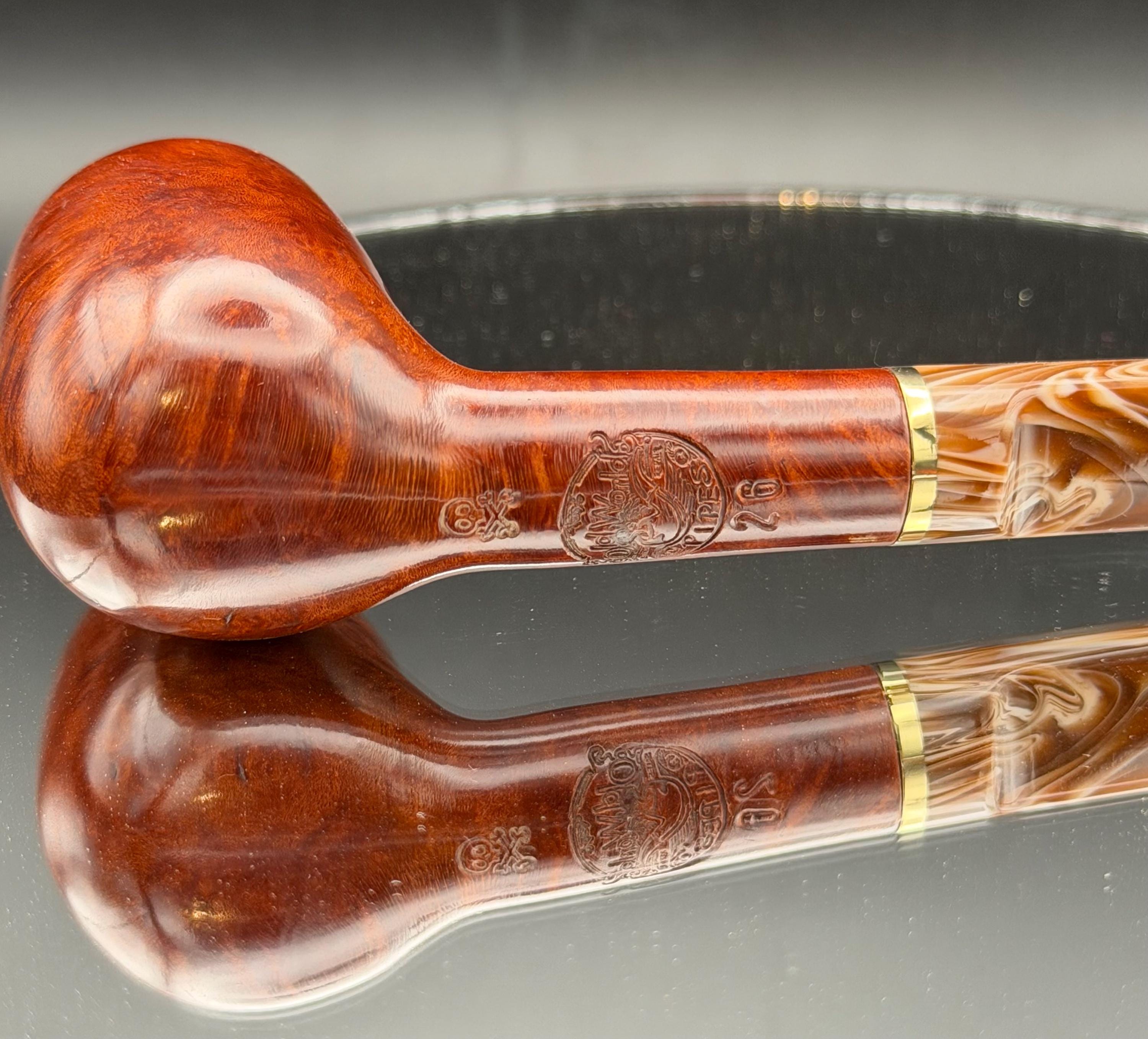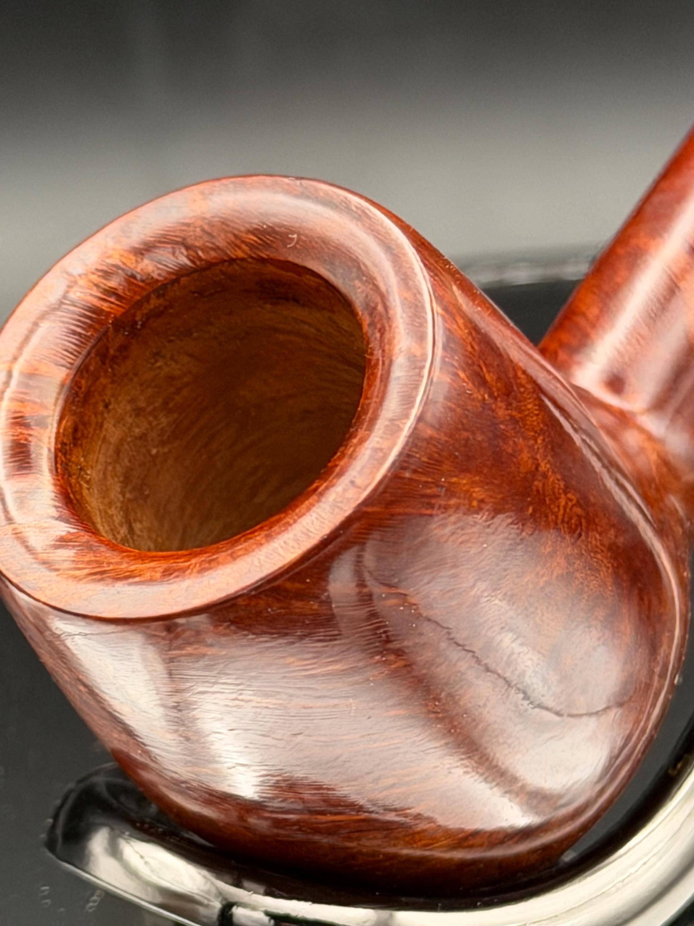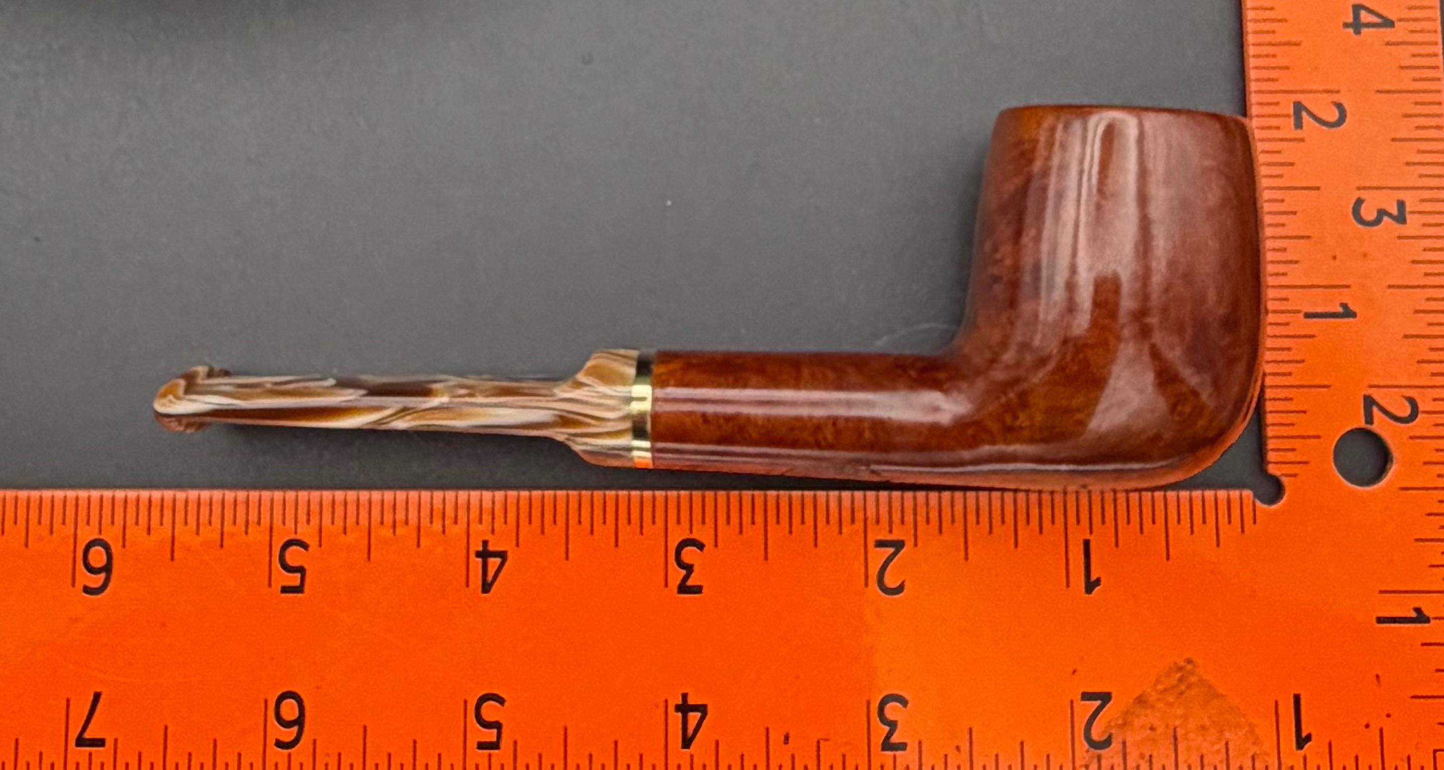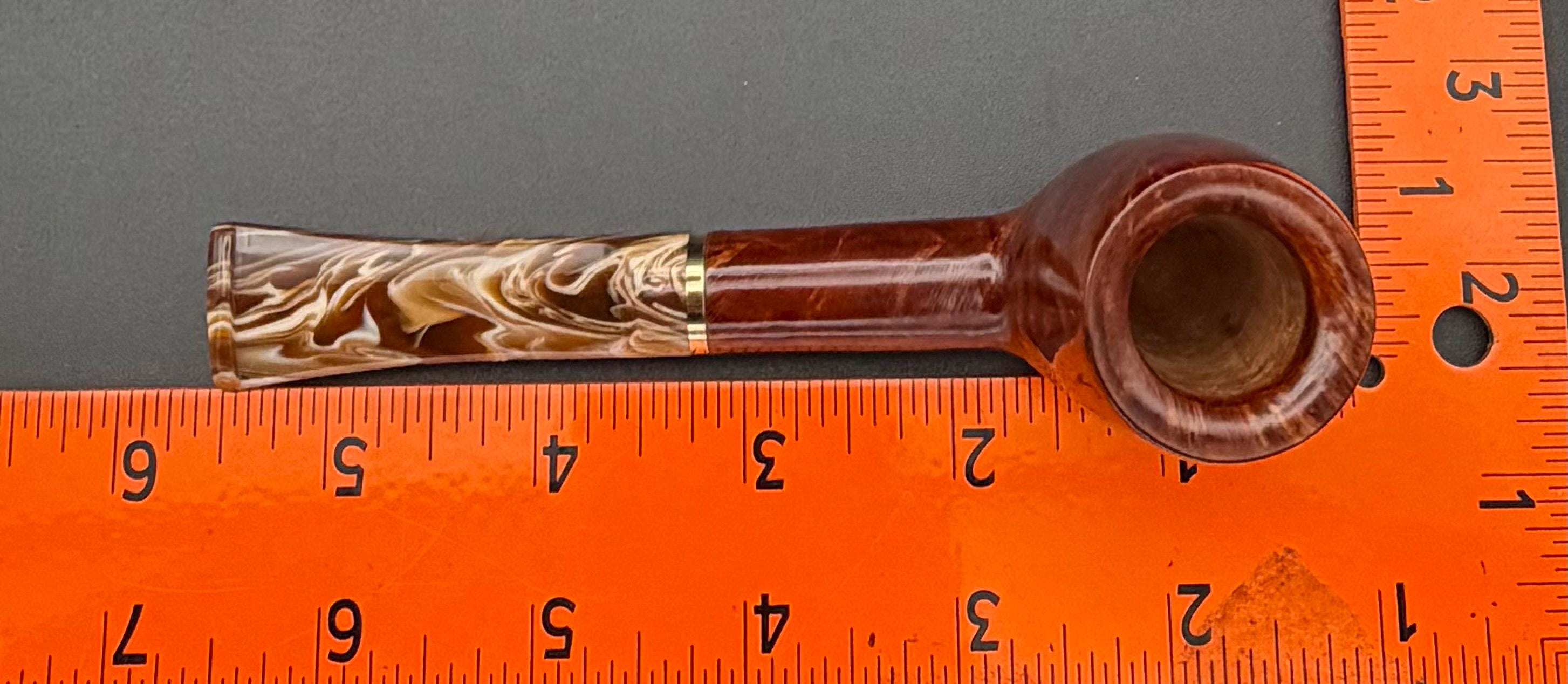 This is a handmade rustic and mahogany colored briar pipe that has been meticulously carved and polished . An acrylic stem was formed and brass ring was machined and polished to finish it off. Non filtered. A very nice daily smoker.