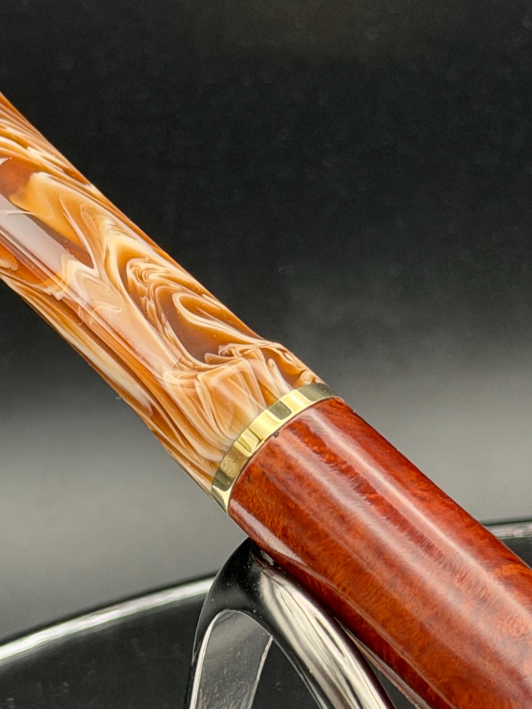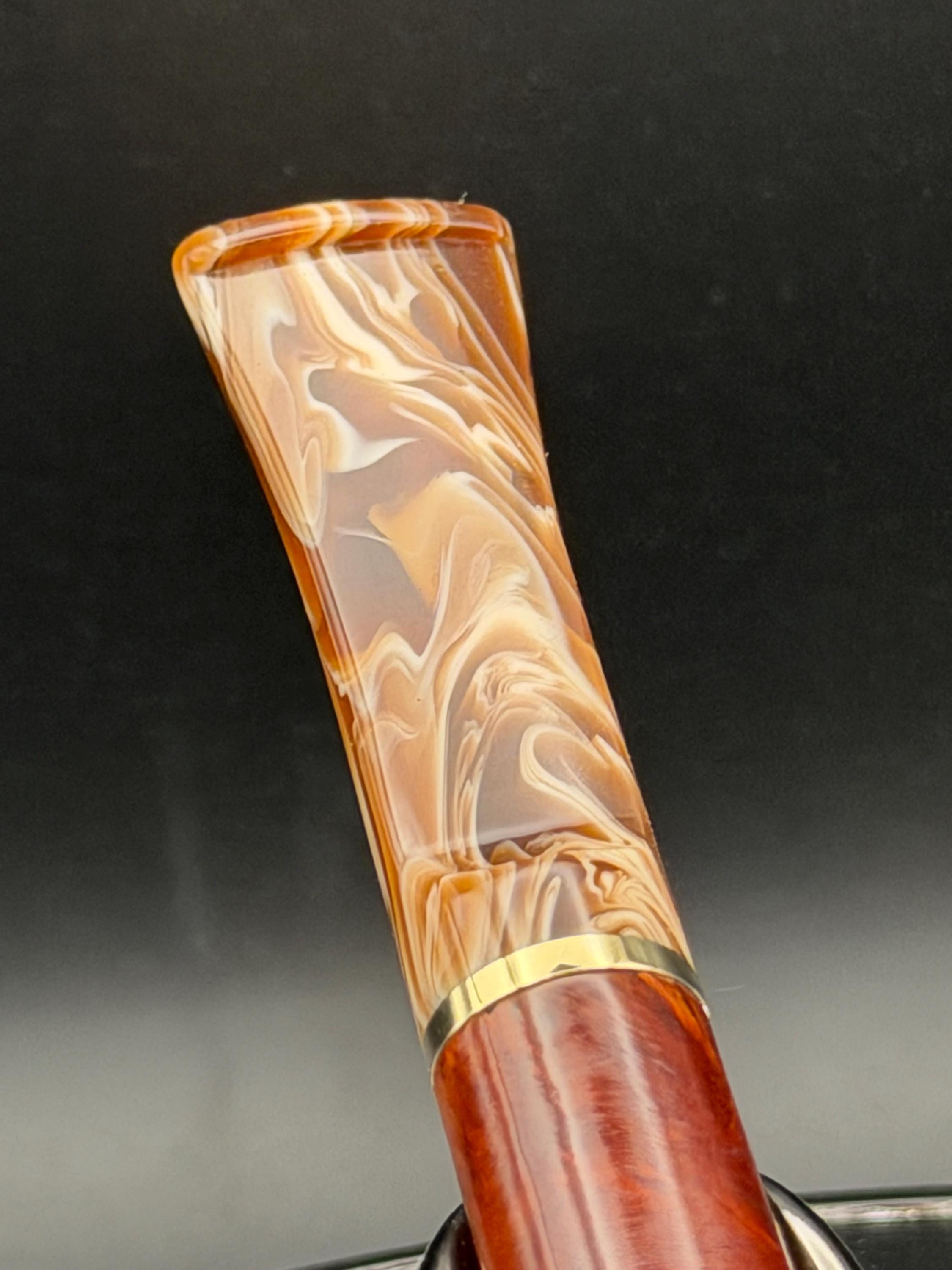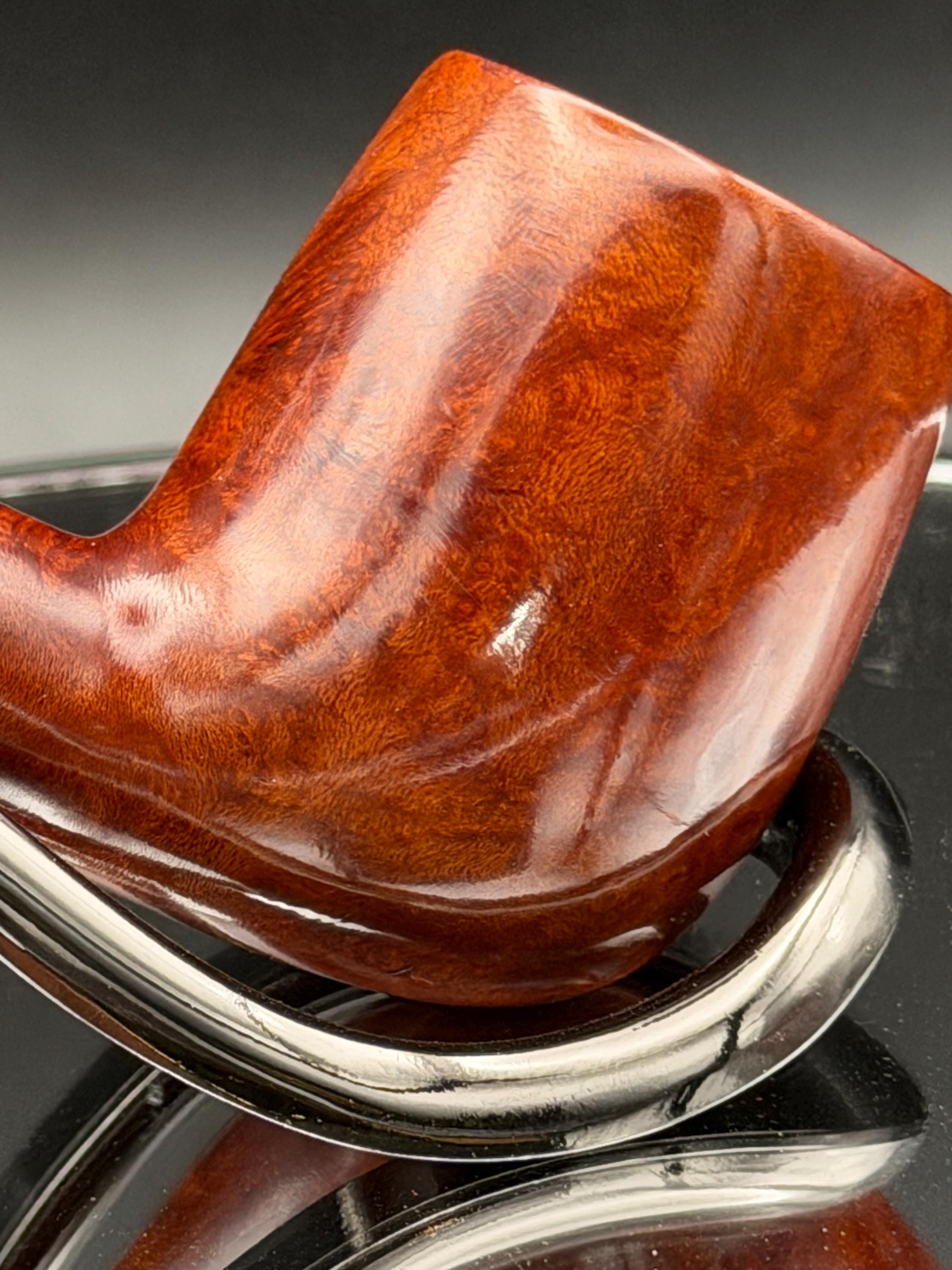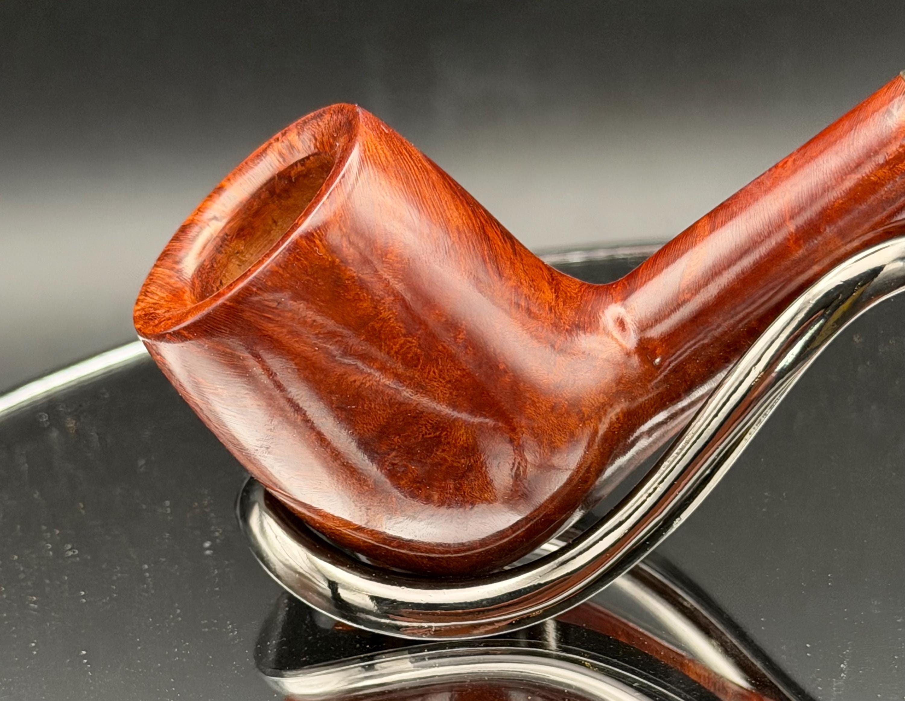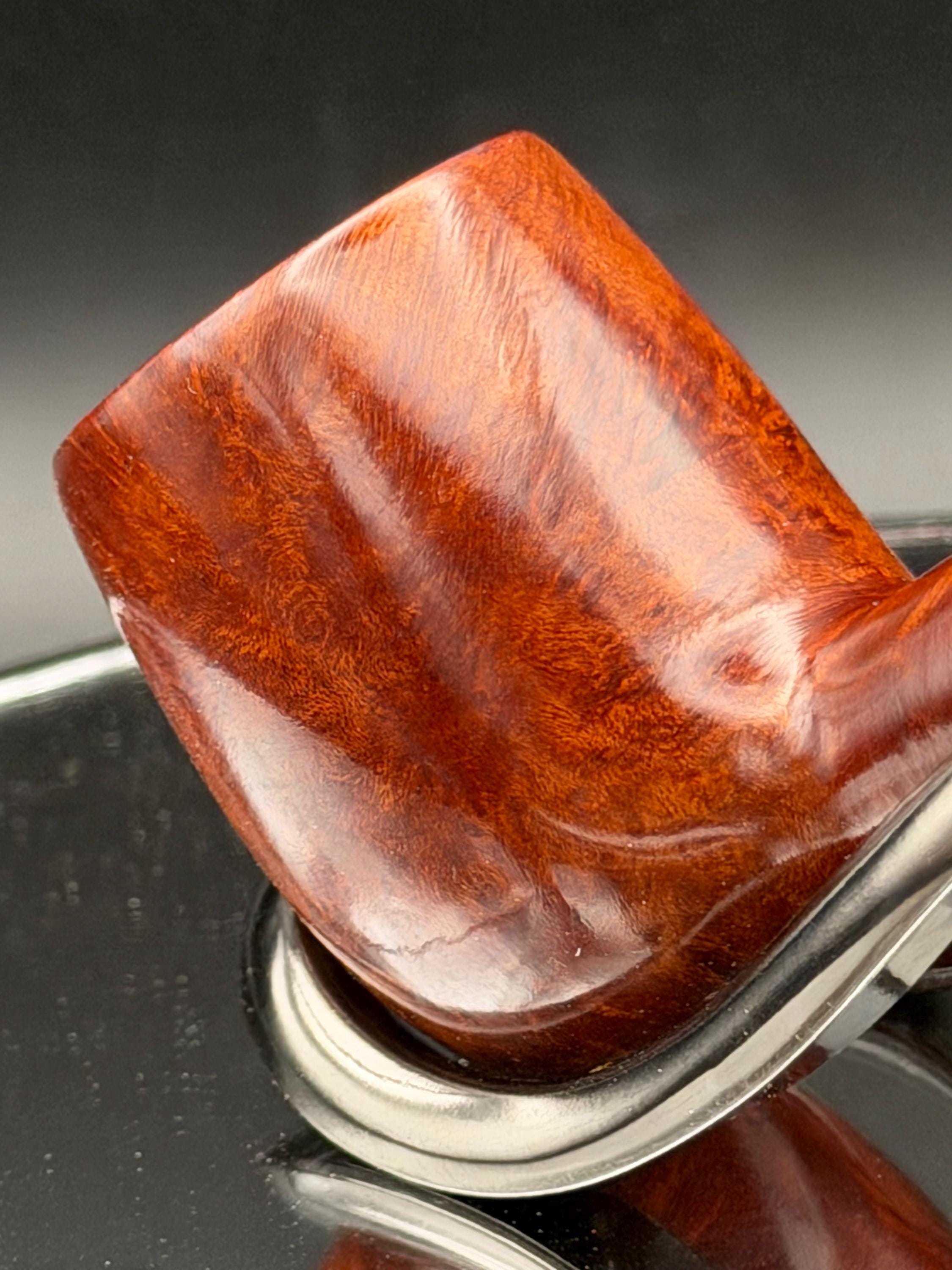 This is a handmade rustic and mahogany colored briar pipe that has been meticulously carved and polished . An acrylic stem was formed and brass ring was machined and polished to finish it off. Non filtered. A very nice daily smoker.