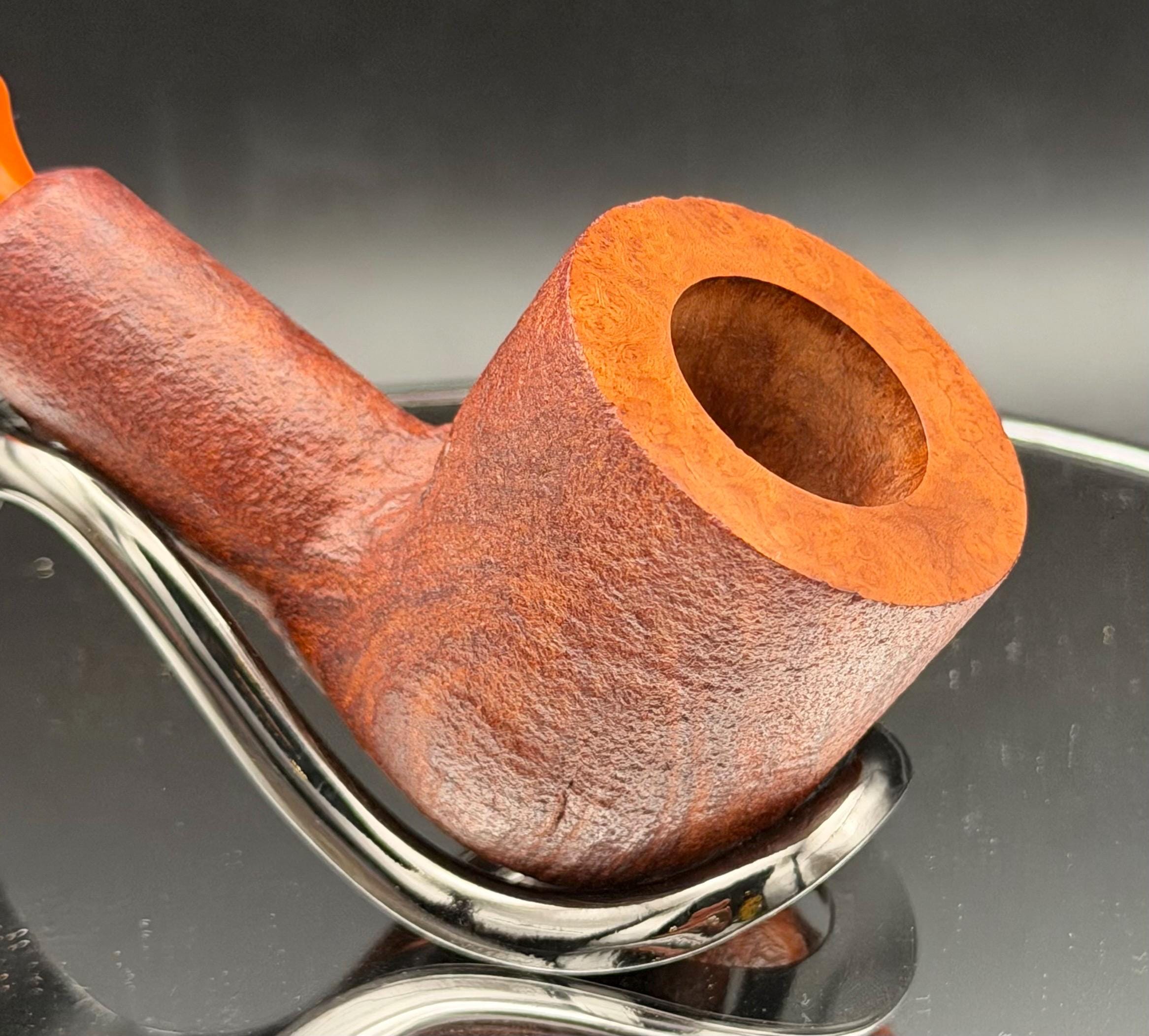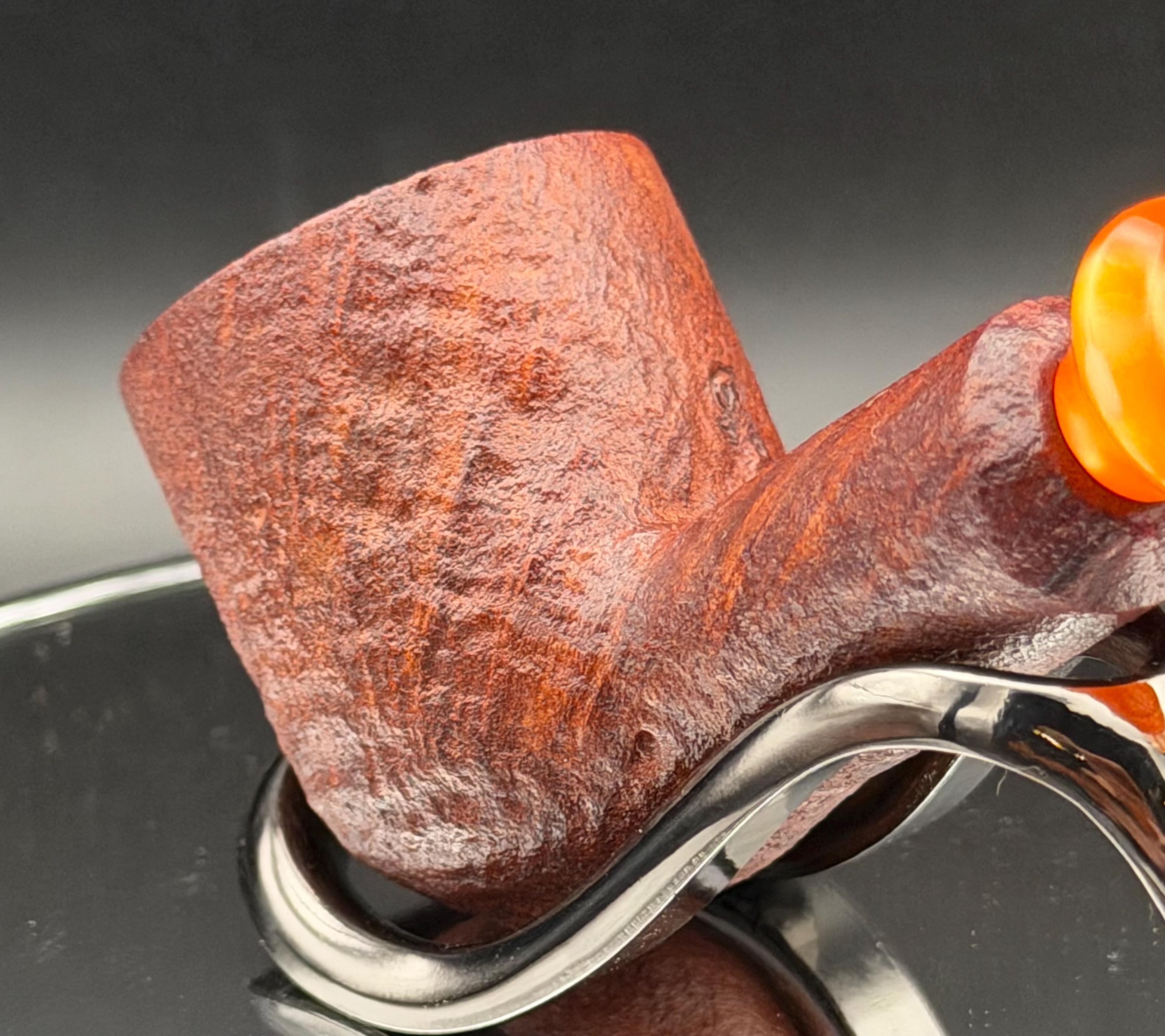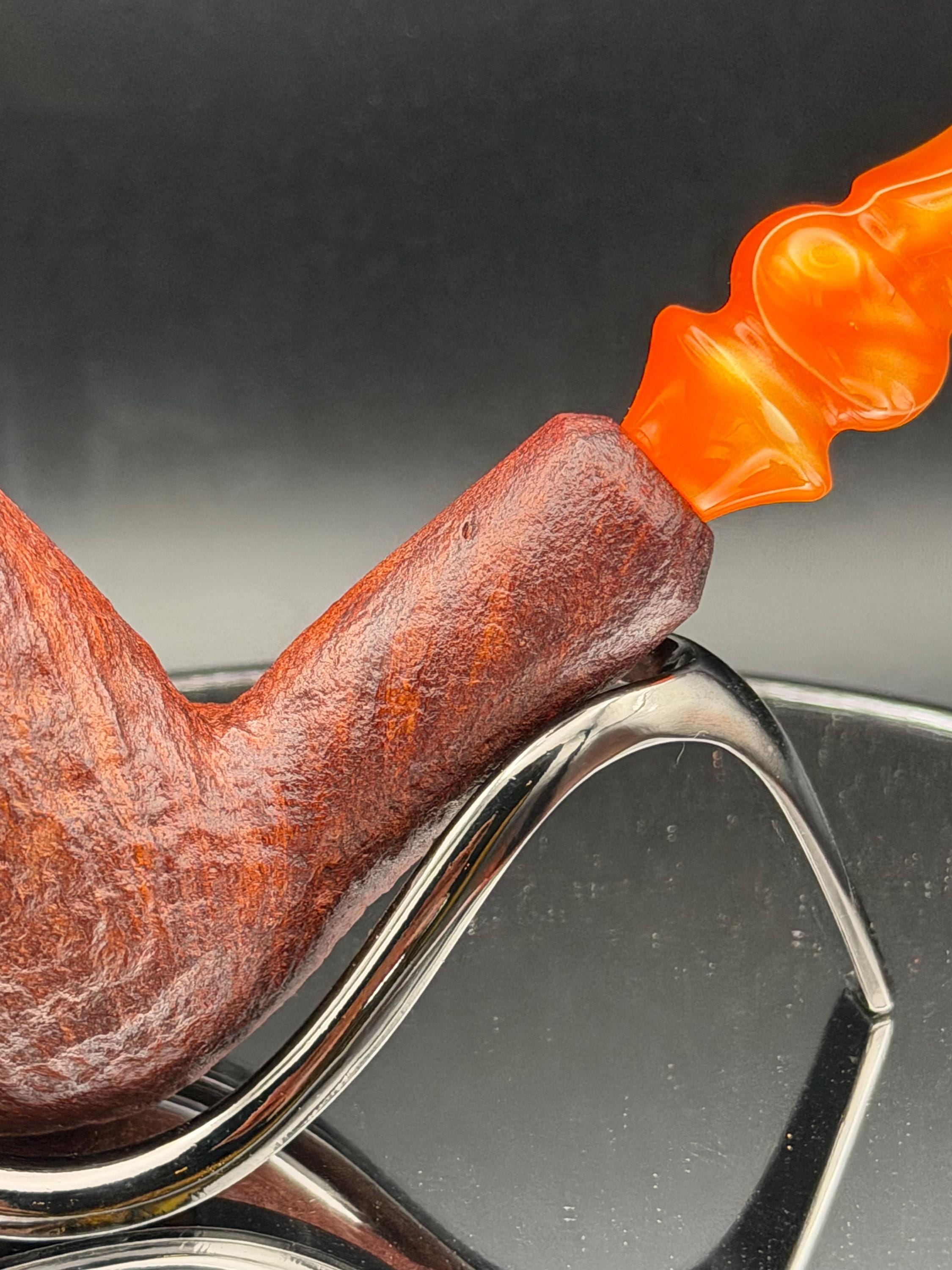 This is a handmade briar pipe that has been meticulously carved sandblasted and polished. An acrylic custom made stem. This one is non filtered. A very nice daily smoker.