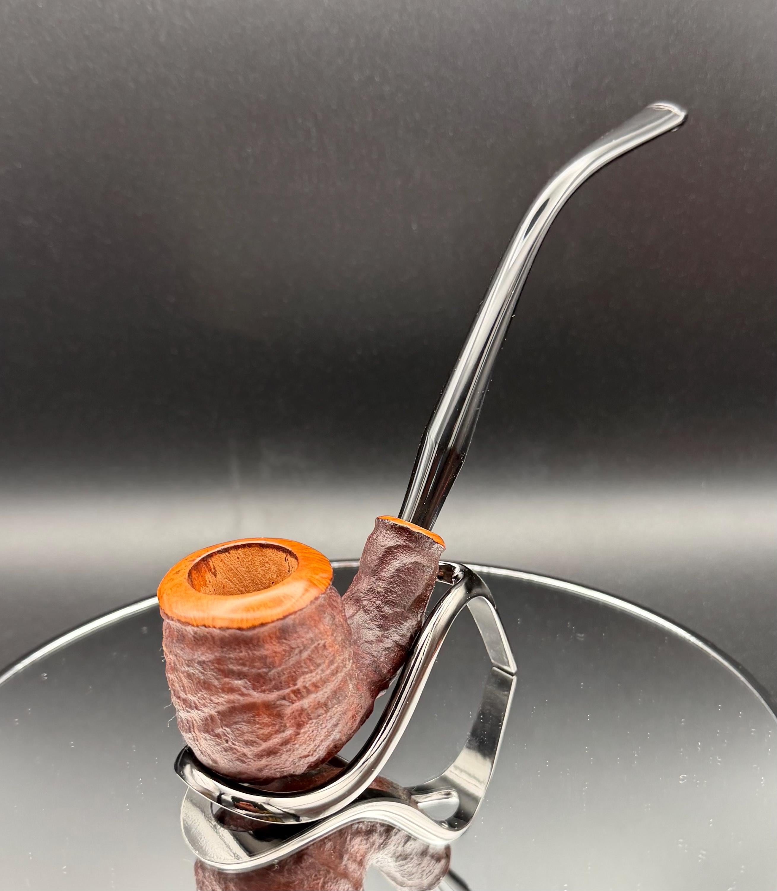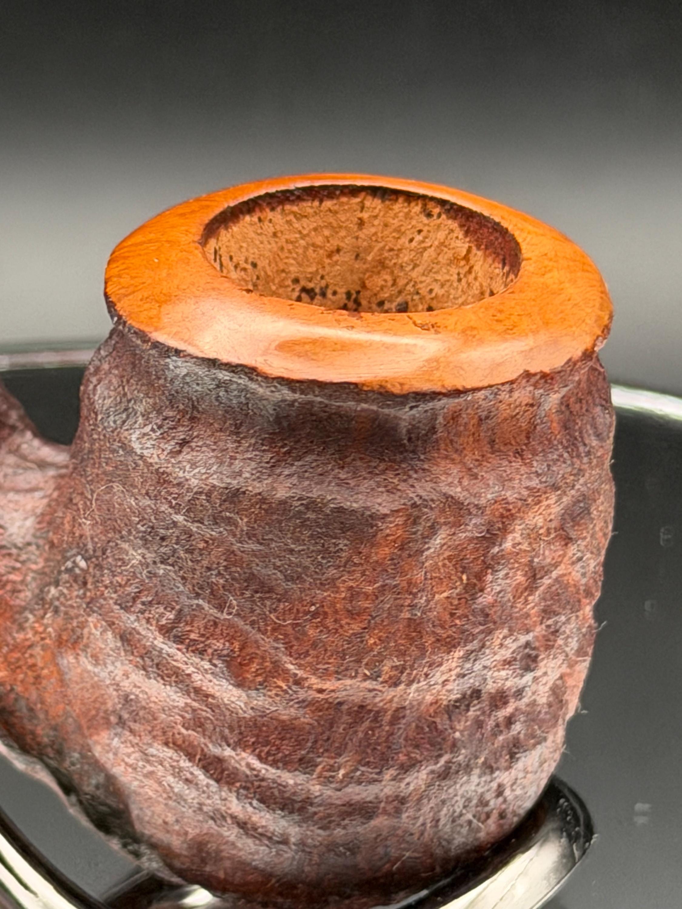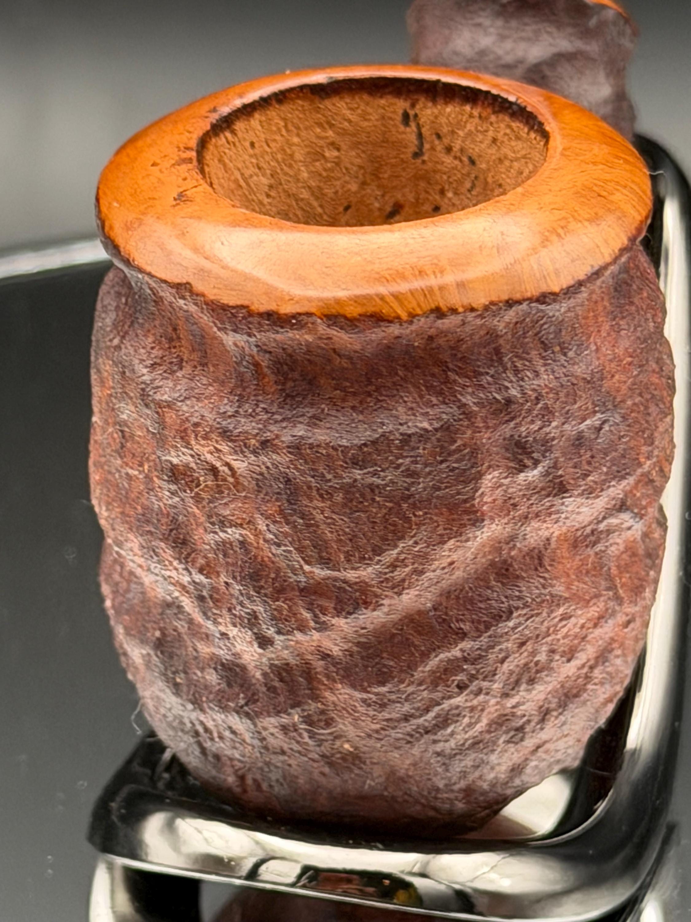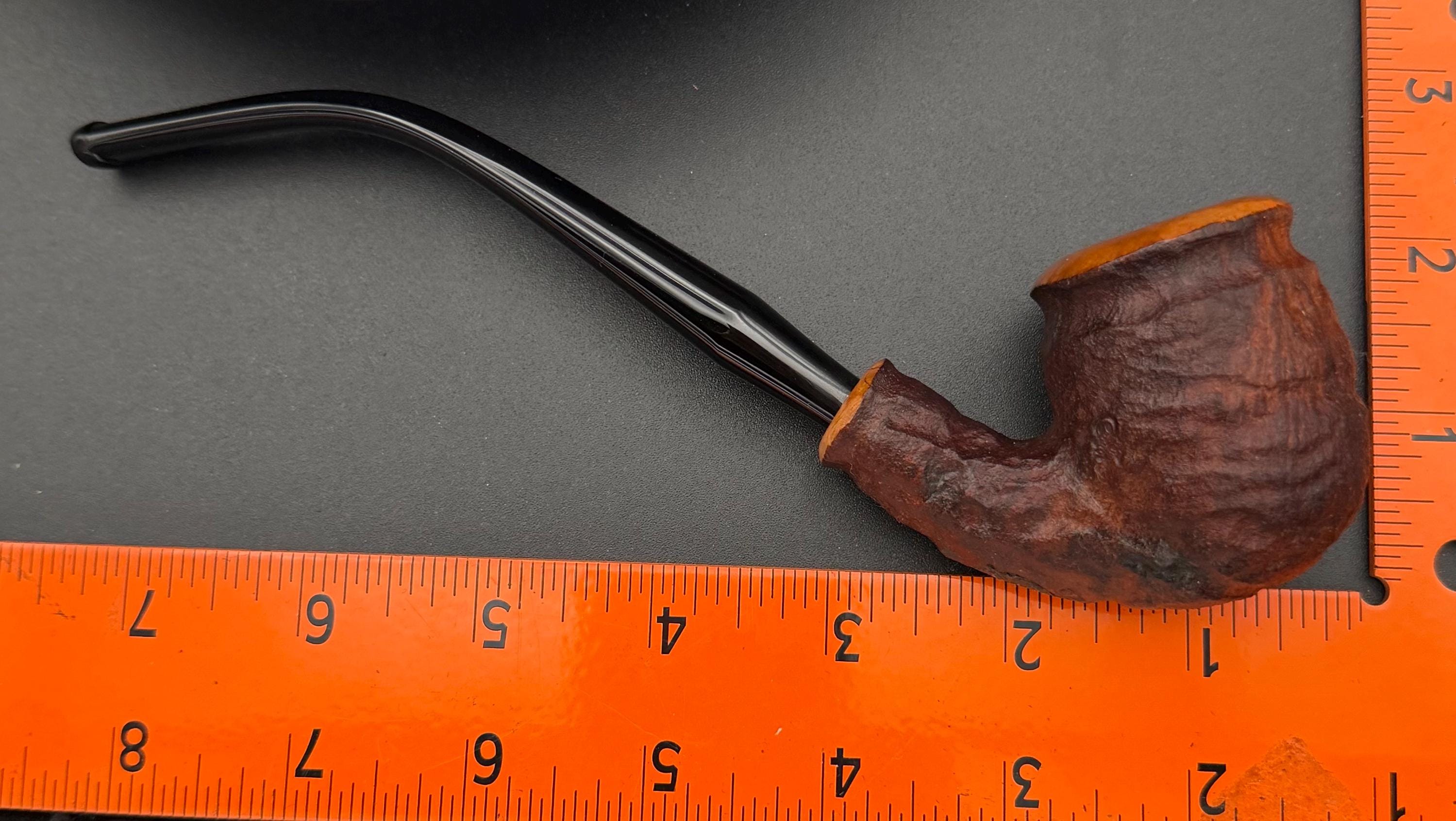 This is a handmade rustic dark brown colored briar pipe that has been meticulously carved and polished . A vulcanite stem was formed and polished to finish it off. Non filtered. A very nice daily smoker.