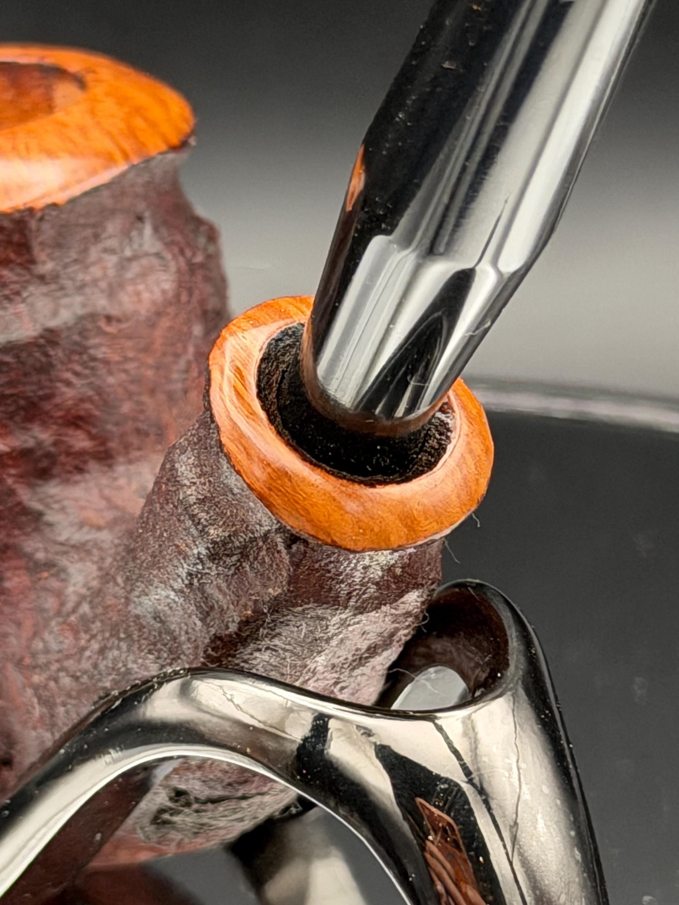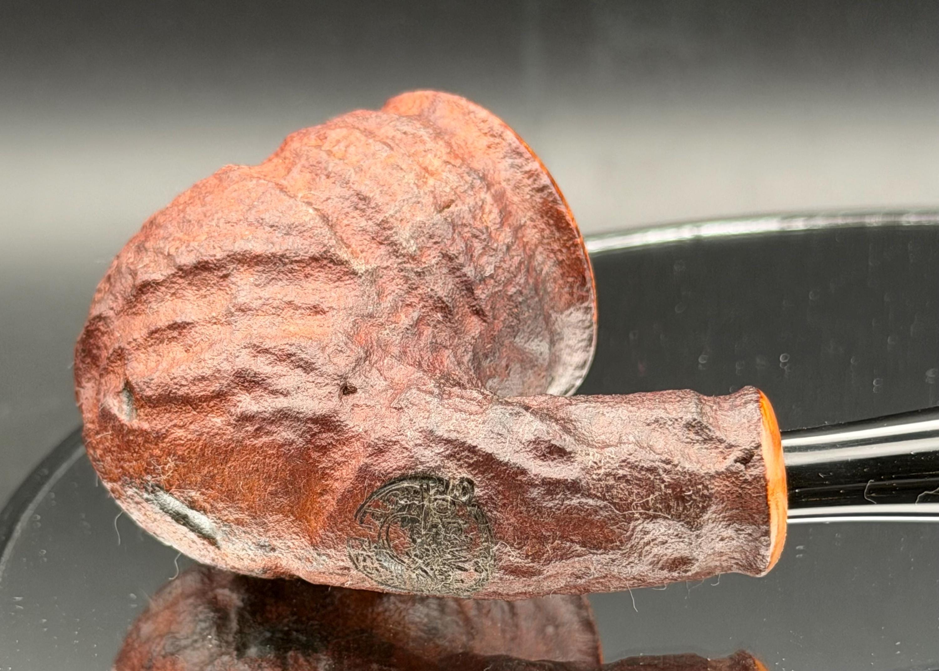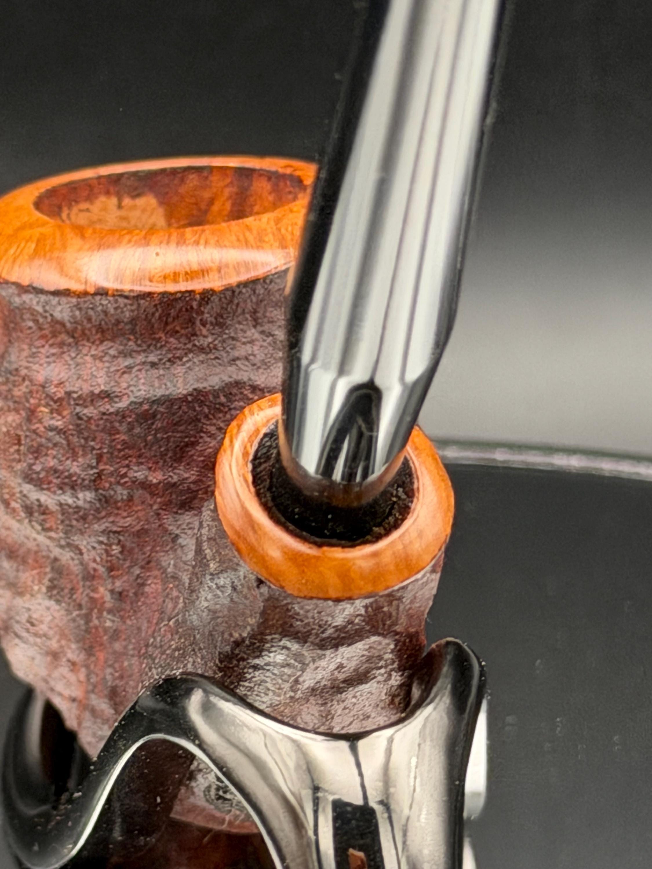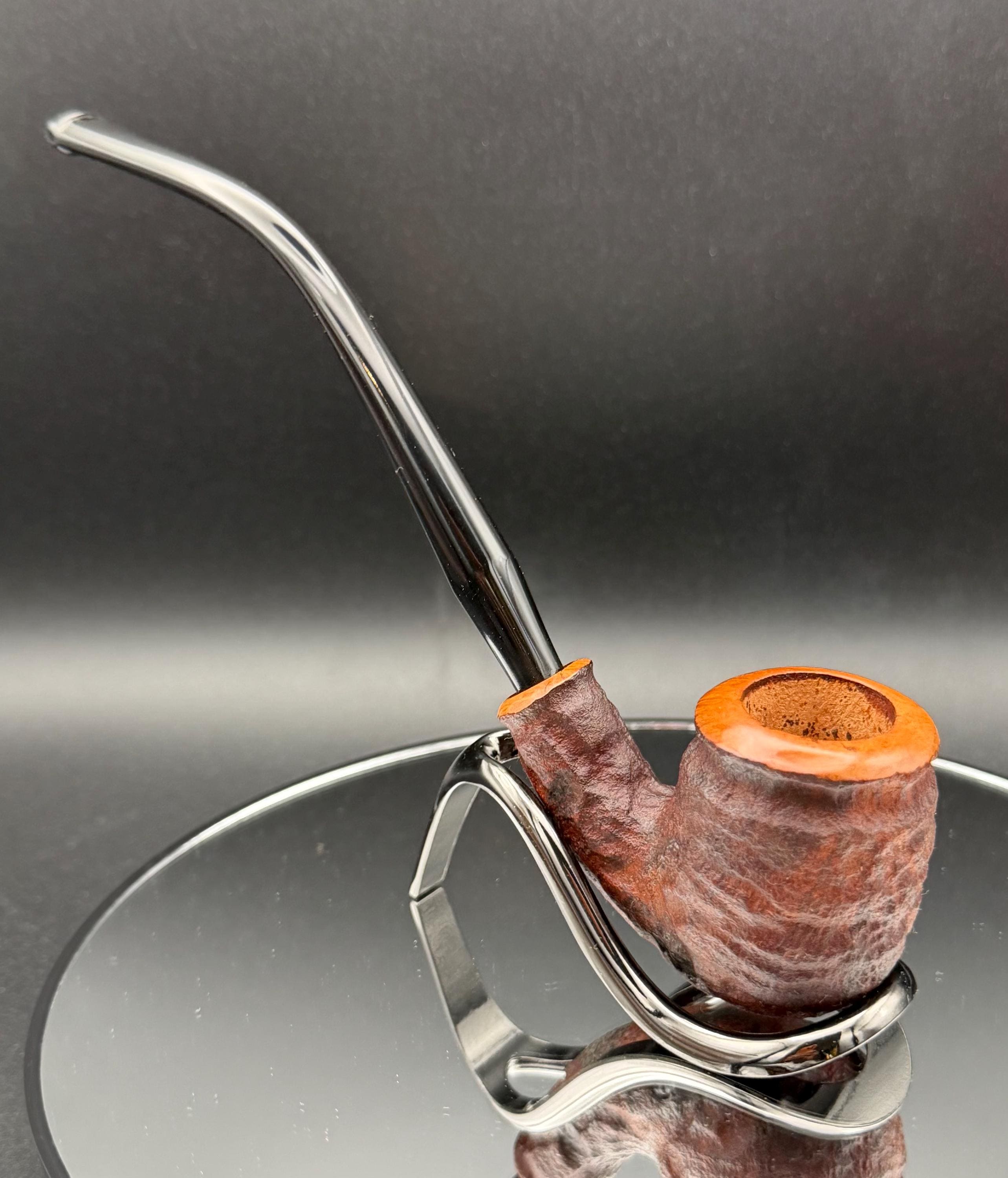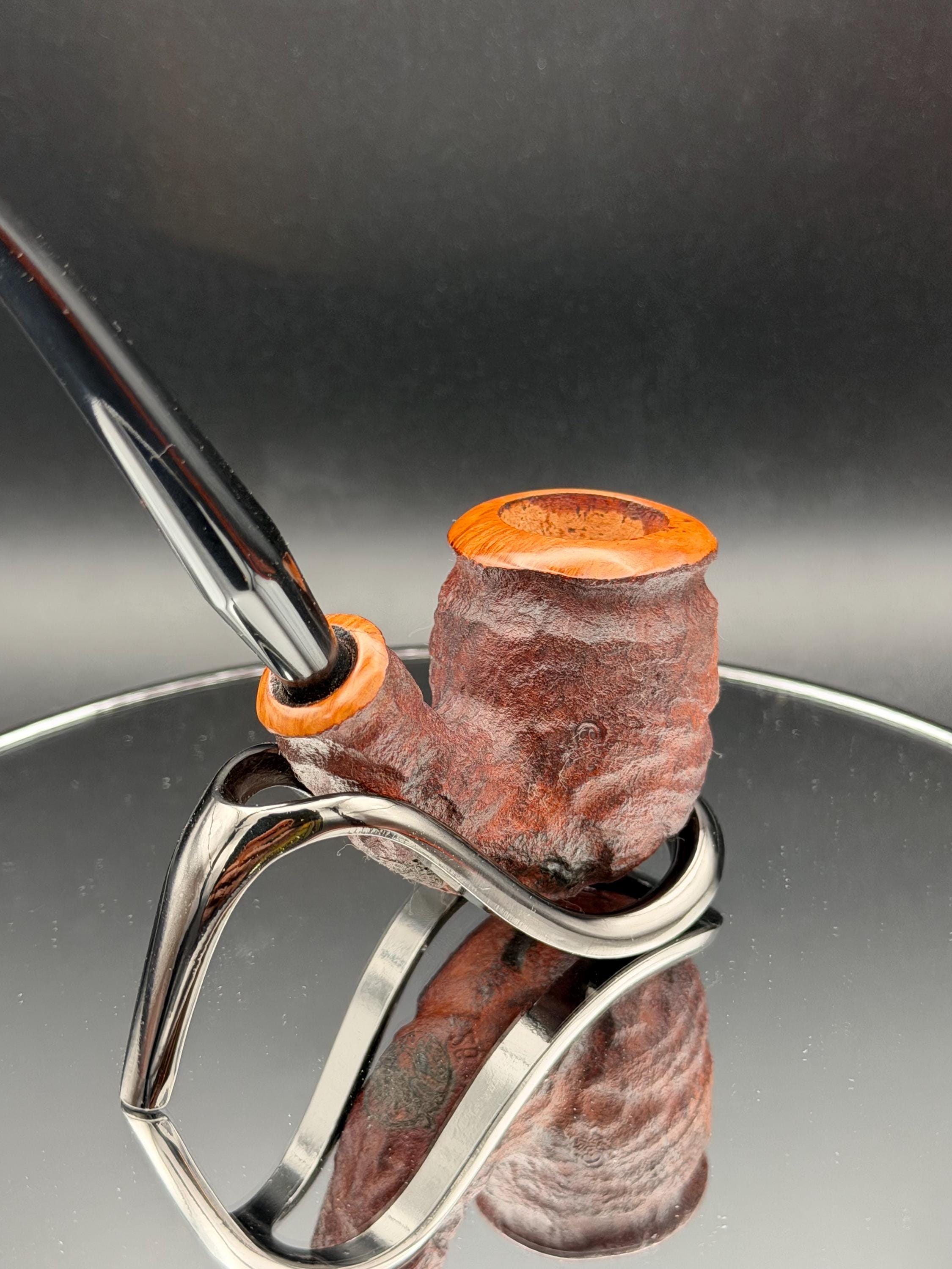 This is a handmade rustic dark brown colored briar pipe that has been meticulously carved and polished . A vulcanite stem was formed and polished to finish it off. Non filtered. A very nice daily smoker.