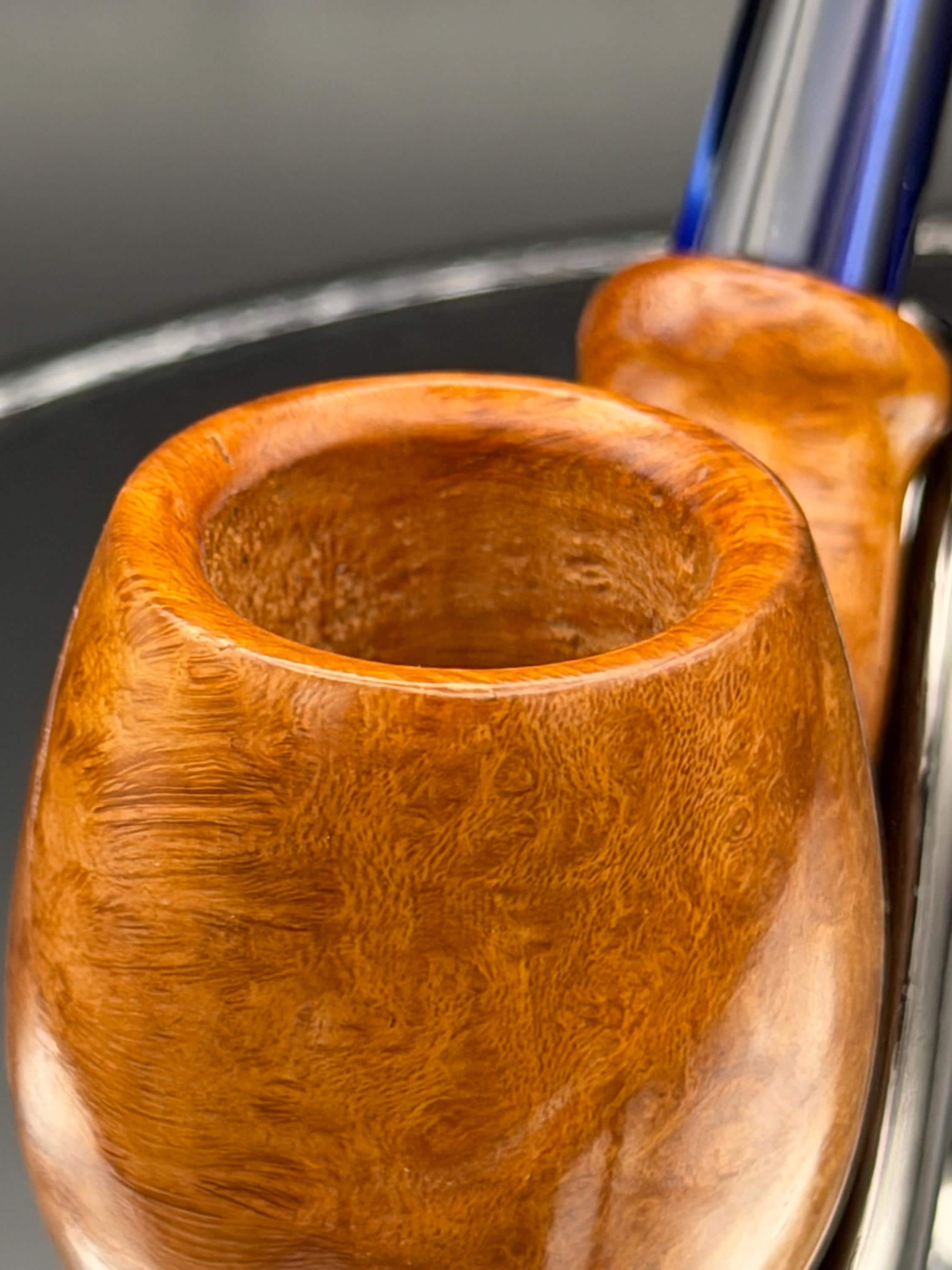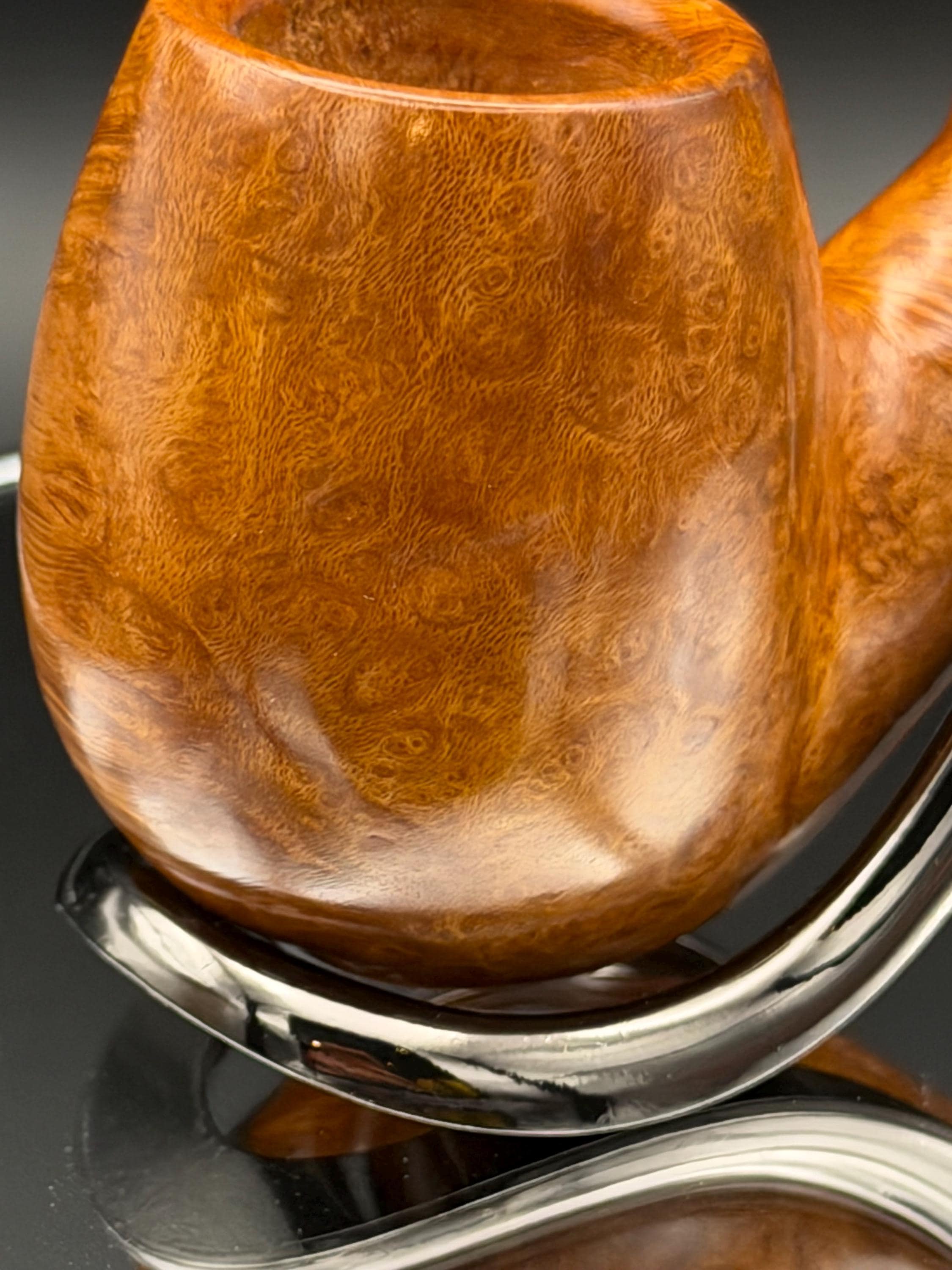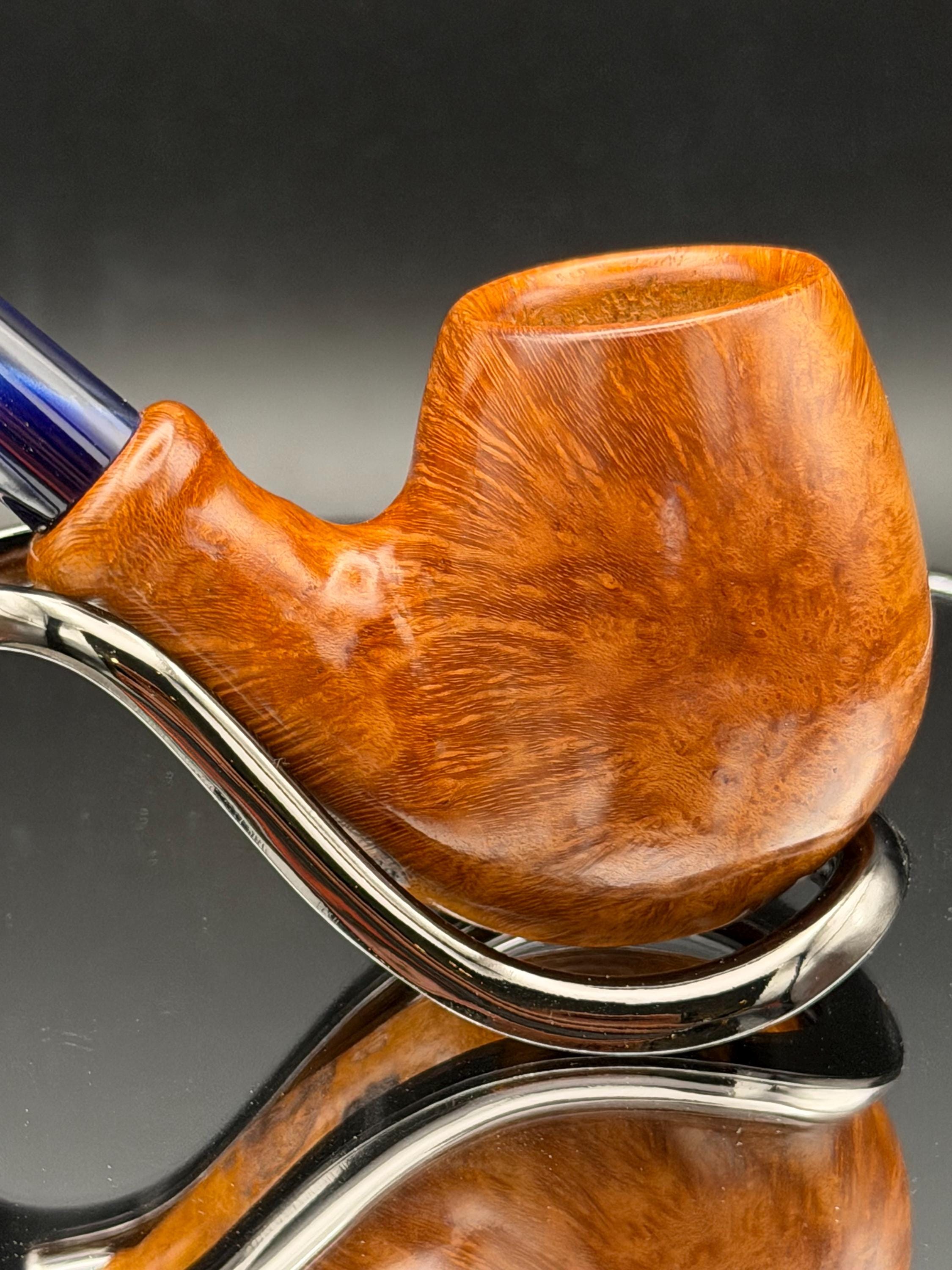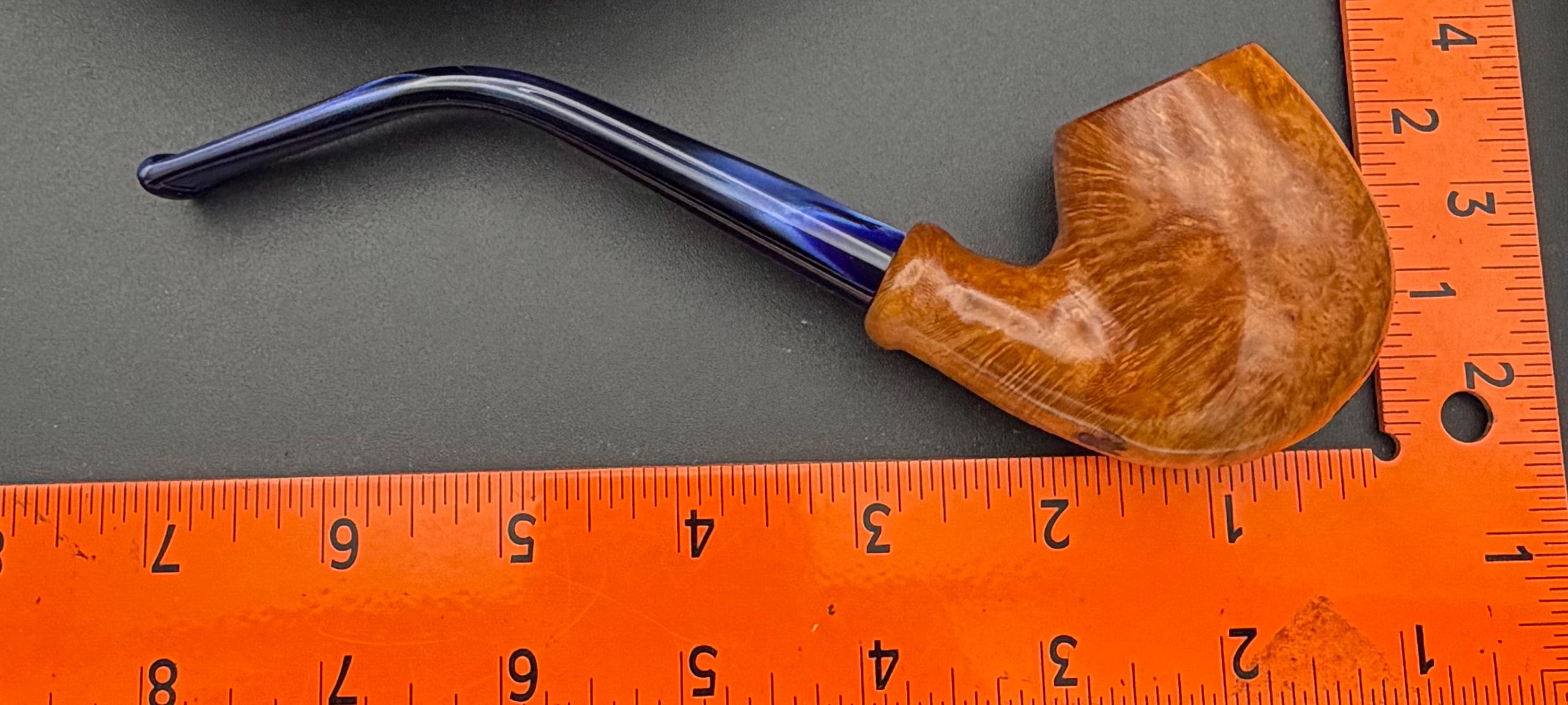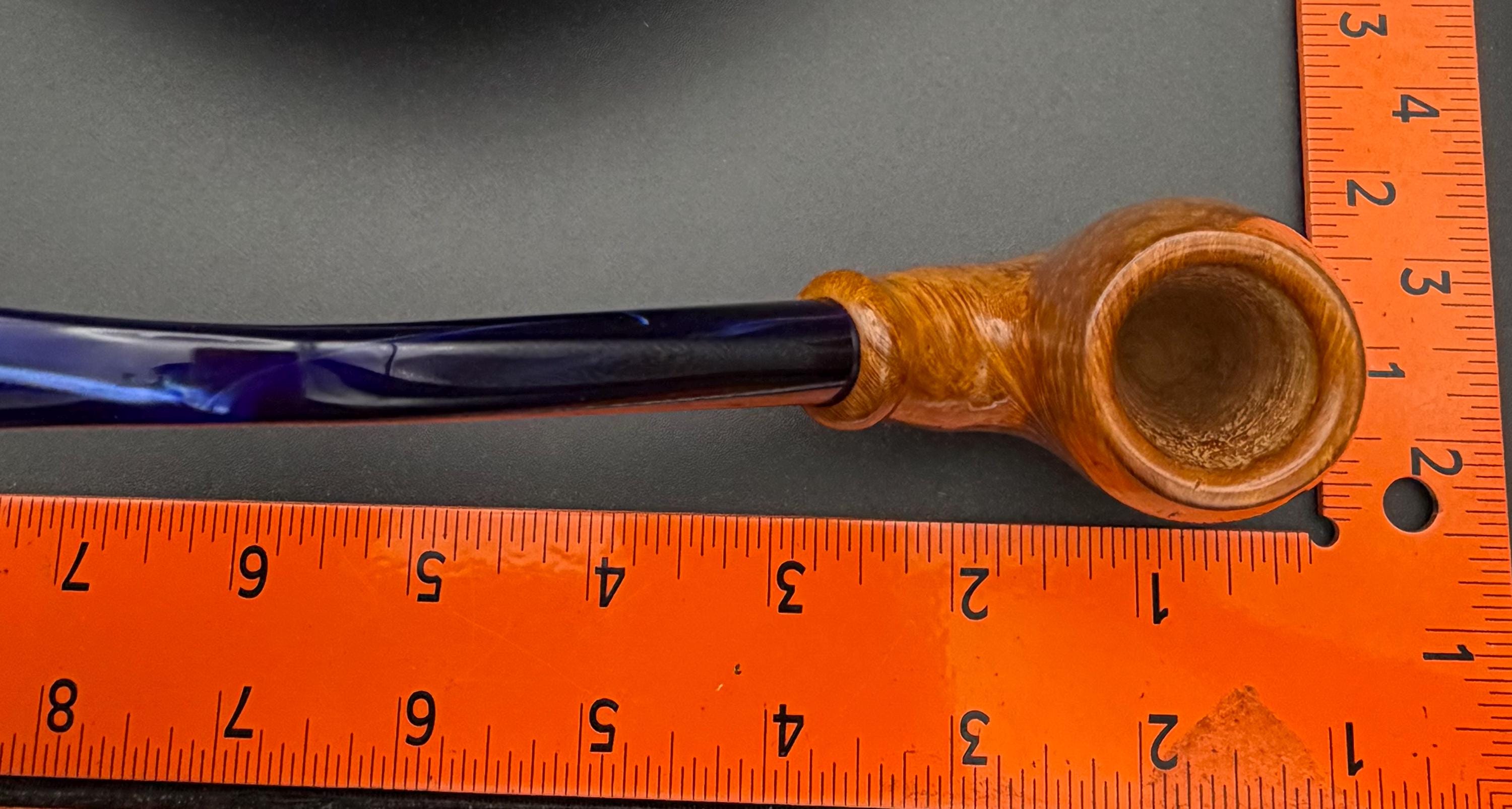 This is a handmade briar pipe that has been carved and sanded by hand . A beautiful acrylic custom made stem was made for it. Non filtered. A very nice daily smoker. medium size and has a little length to it. 7/8x1 3/4 bowl