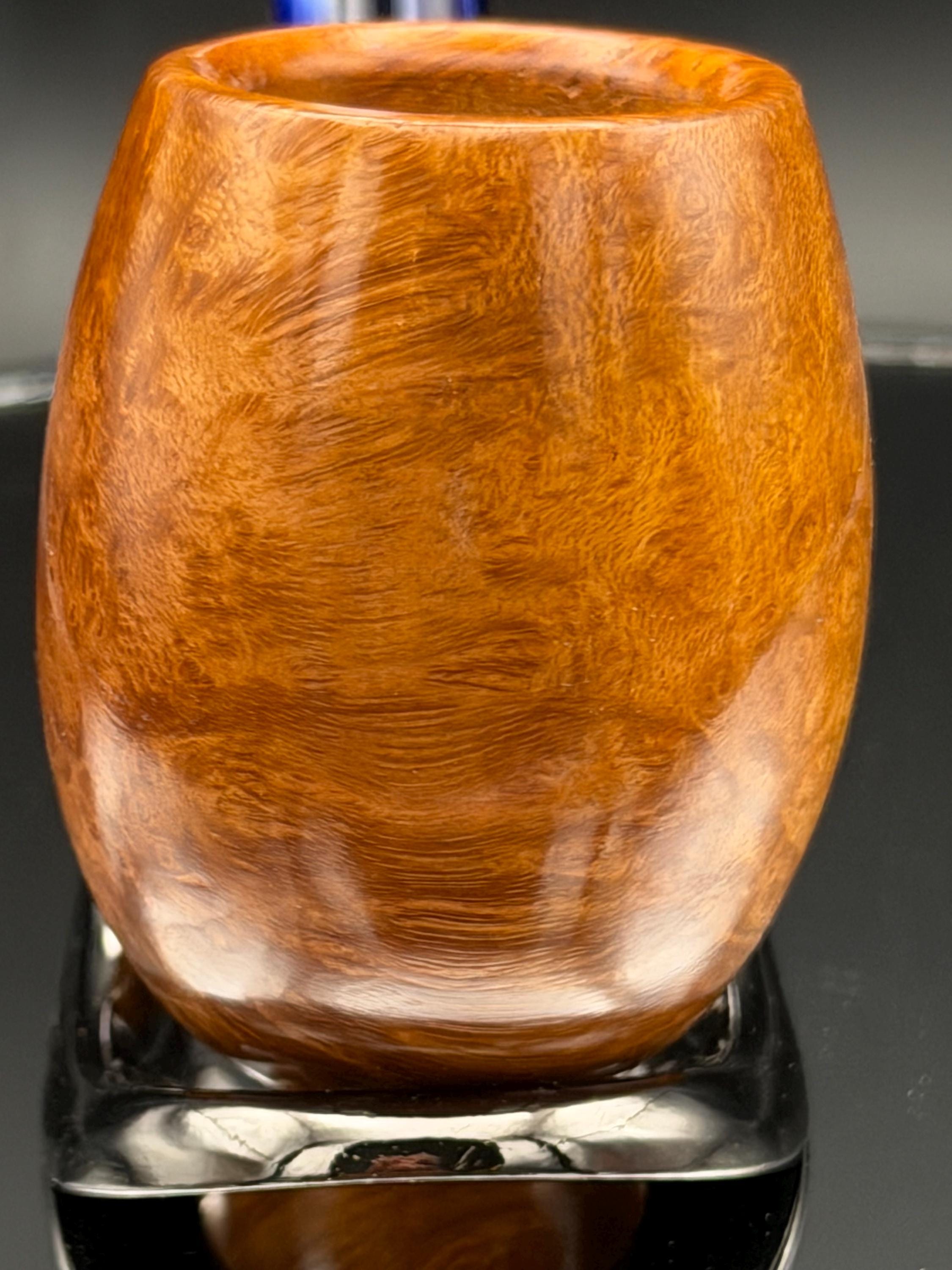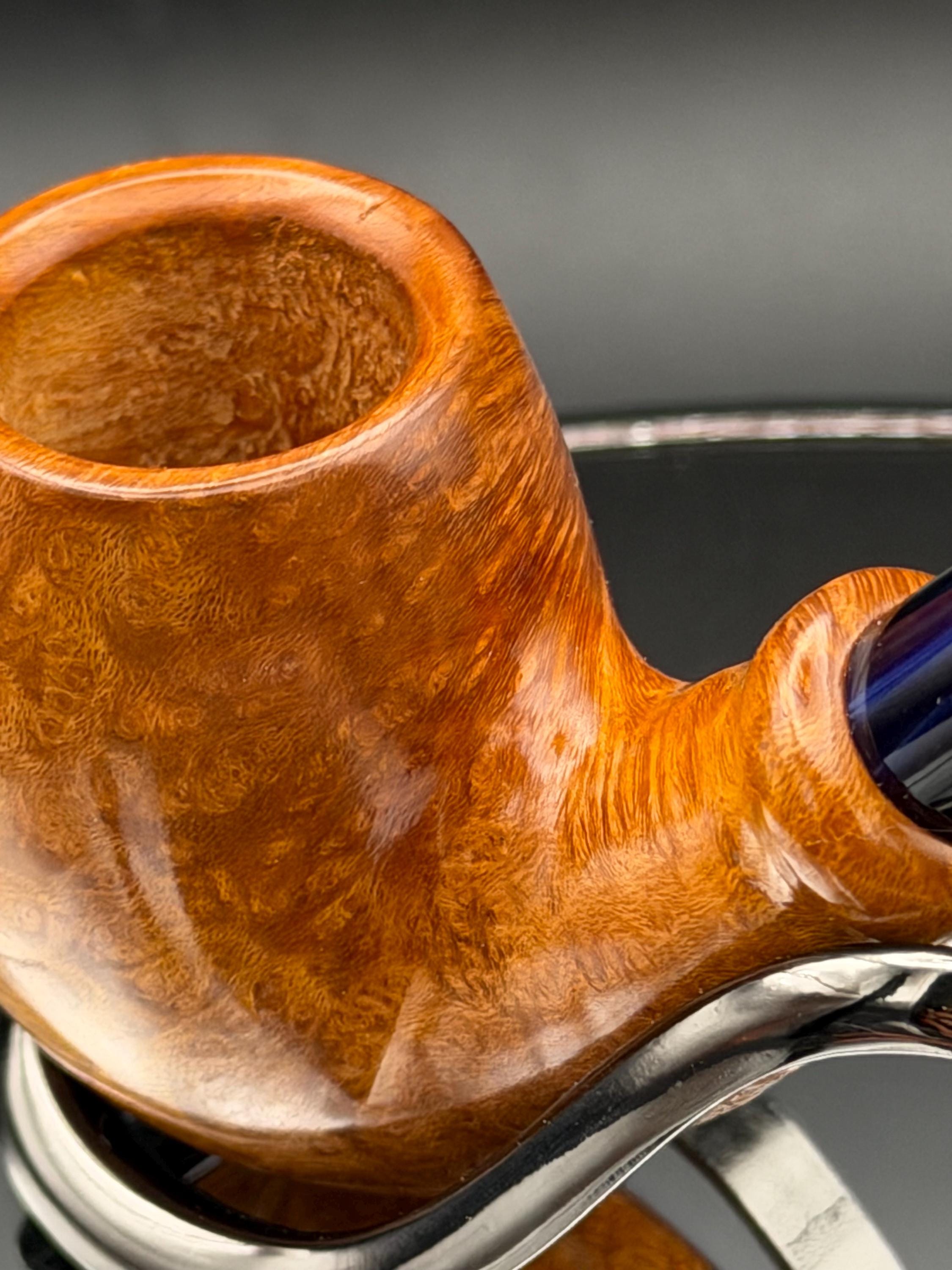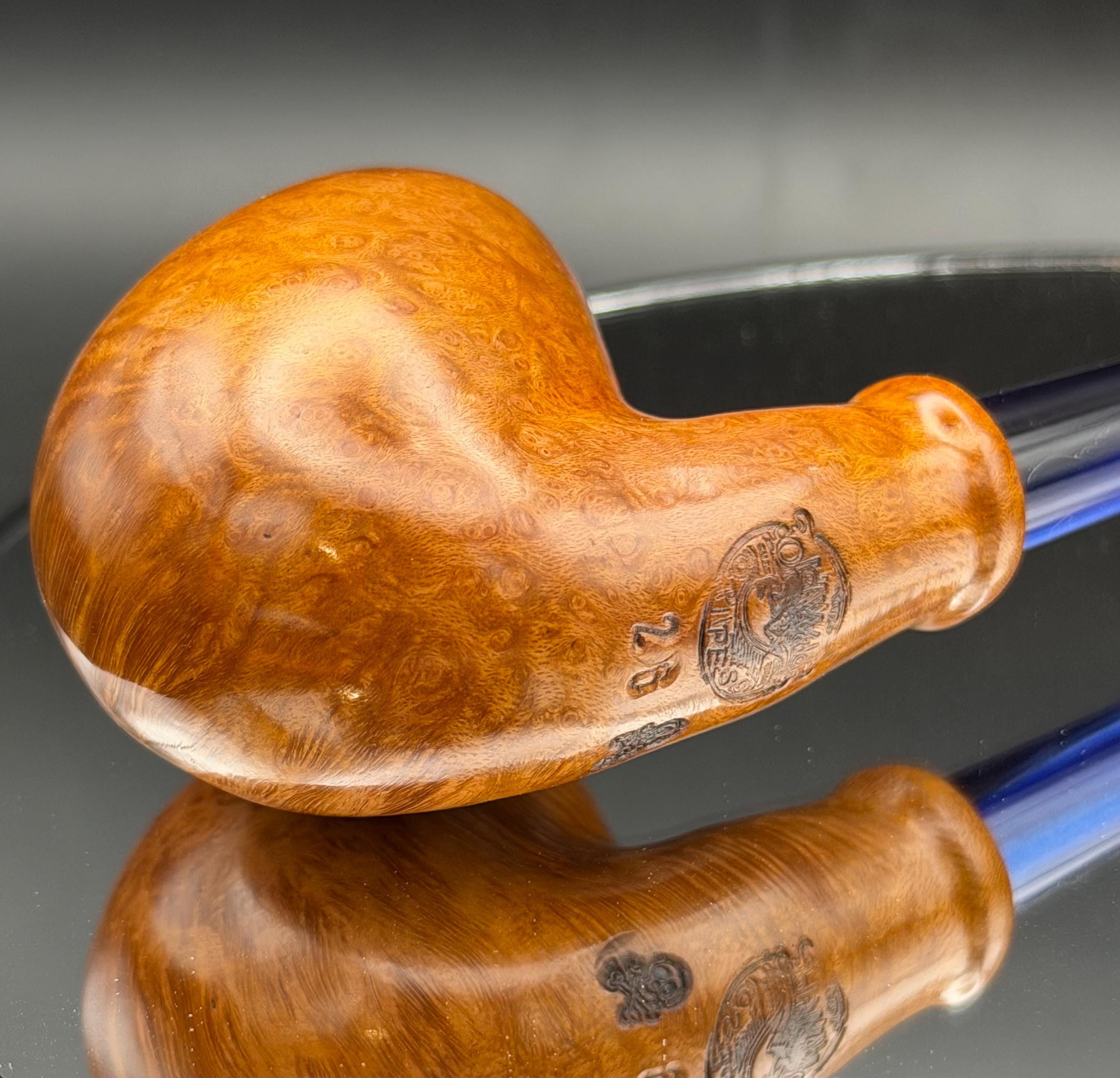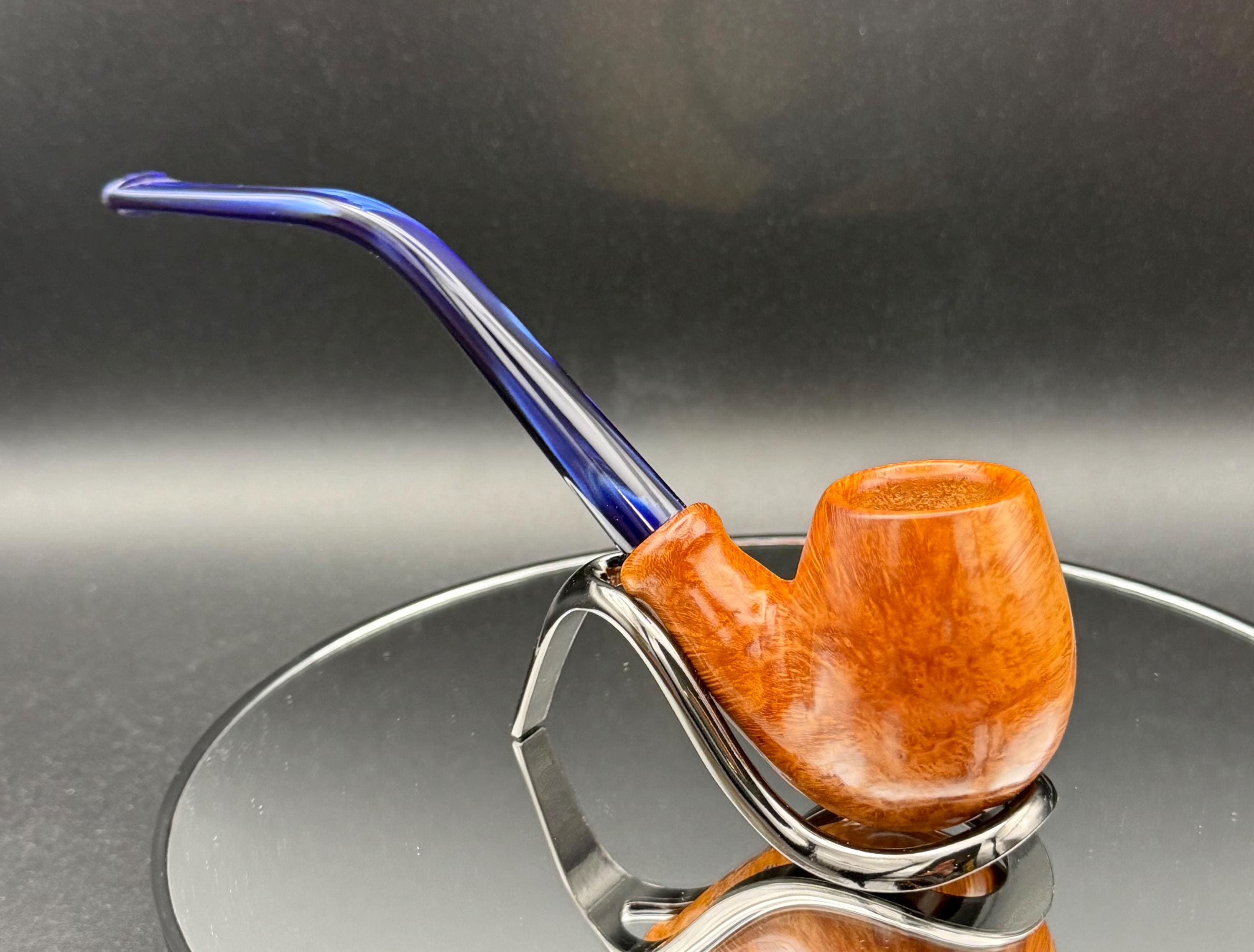 This is a handmade briar pipe that has been carved and sanded by hand . A beautiful acrylic custom made stem was made for it. Non filtered. A very nice daily smoker. medium size and has a little length to it. 7/8x1 3/4 bowl